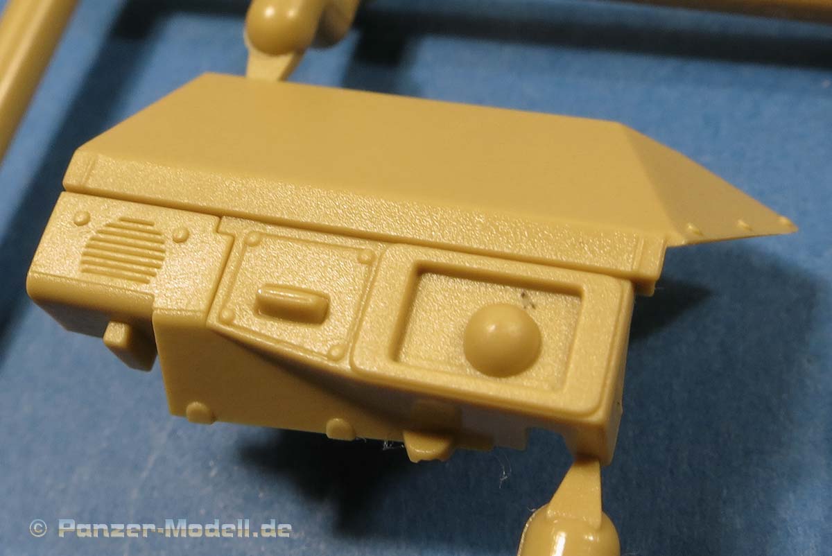 Der Turm setzt den guten Eindruck weiter fort. Dieser setzt sich mehrteilig aus mehreren Teilen zusammen. Auch hier wieder feine Gravuren und Details. Die Optiken des Frühwarnsystems werden von innen mit klaren Plastikteilen dargestellt. Das bringt eine Menge Realismus. Auch die anderen Optiken wie vom Kommandanten, MUSS und der Waffenoptik sind mit klaren Plastikteilen versehen. Die Waffenoptik bleibt höhenbeweglich und kann zudem mit offener und geschlossener Abdeckung gebaut werden.