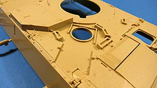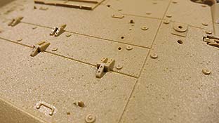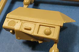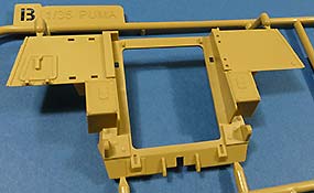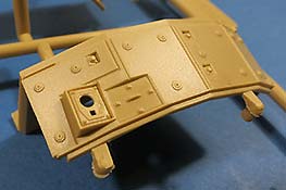 Die Heckplatte der Wanne ist in einem Stück mit diversen Anbauteilen. Die große Heckklappe ist korrekt mit dem großen Panzersichtblock versehen und kann sogar offen gebaut werden. Wer allerdings nicht selber eine Inneneinrichtung bauen will oder eine ausfüllende Figur in die Öffnung stellt, wird in die leere Wanne sehen.