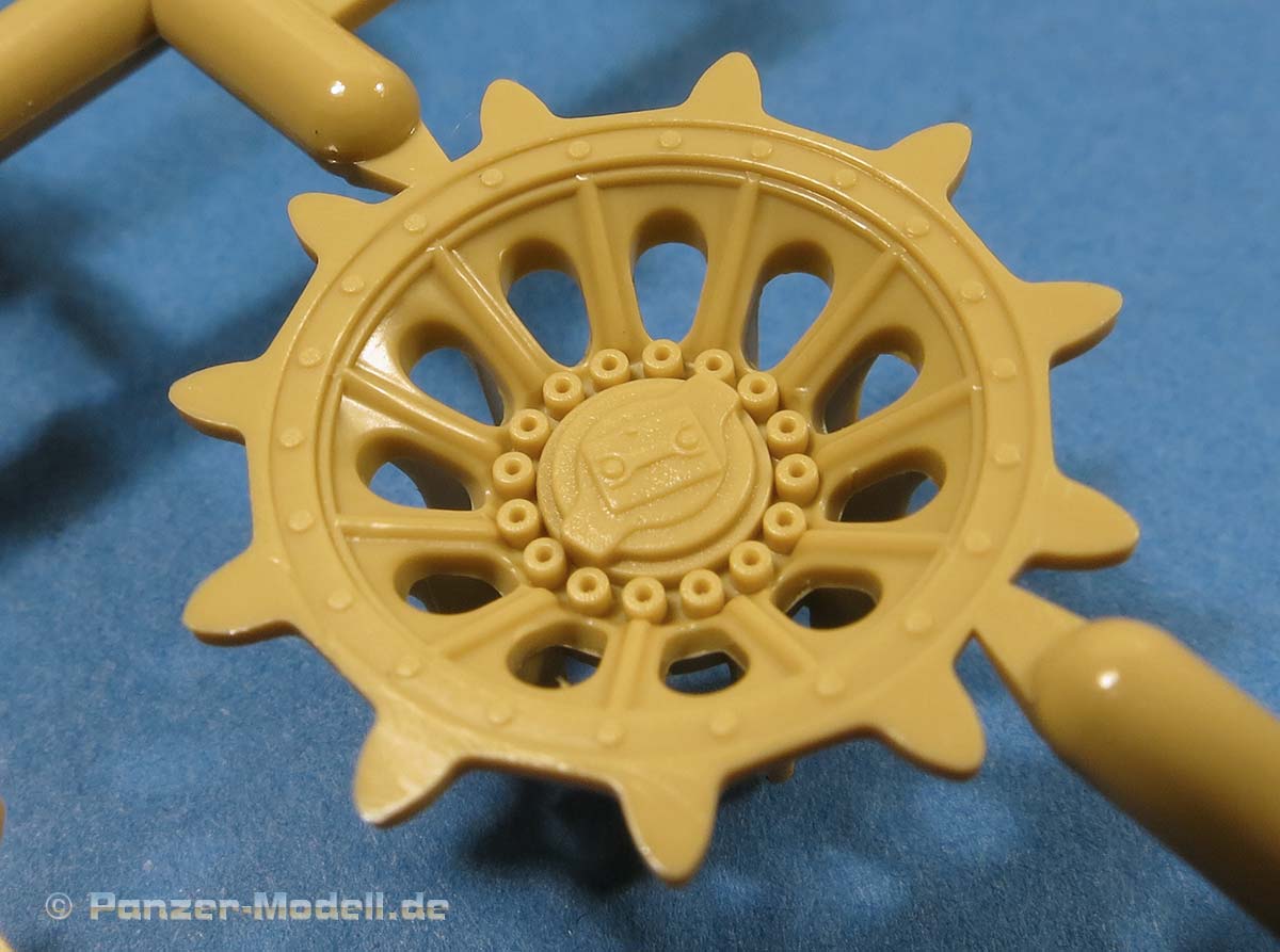 Die Oberwanne ist eine wahre Augenweide - einteilig und bereits mit vielen schönen Details versehen, allen voran der oben bereits erwöhnten, sehr feinen, realistischen Antirutschbeschichtung. Dazu versenkte Gravuren, Nieten- und Schraubenköpfe, Scharniere und viele weitere Details. Die Luken in der Oberwanne sind alle offen und können nach Wunsch theoretisch auch mit offenen Lukendeckeln gebaut werden, dies ist aber gerade im hinteren Bereich weniger sinnvoll, da keine Inneneinrichtung enthalten ist und man ggf. ins Leere schaut - bei dem Preis erwarte ich allerdings auch keine Inneneinrichtung.