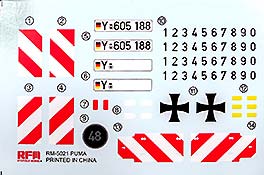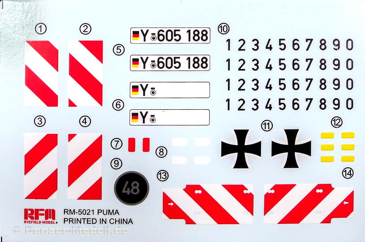 Der sauber gedruckte Decalbogen enthält in der Hauptsache allgemeine Markierungen wie die eisernen kreuze, MLC Schild, die Warntafeln, Nummernschilder (auch ein Set frei zusammenstellbar) aber keien Einheitenmarkierungen.