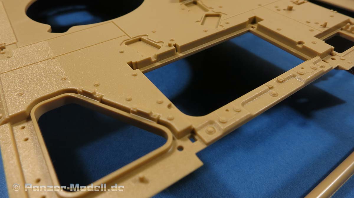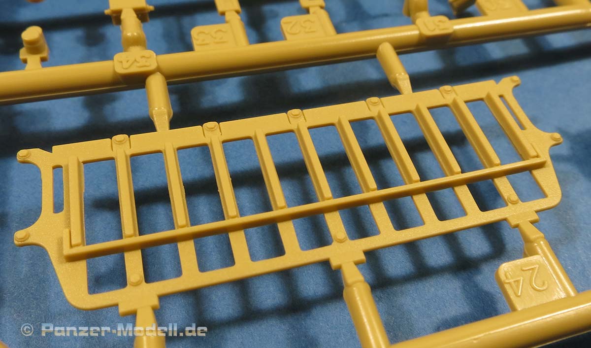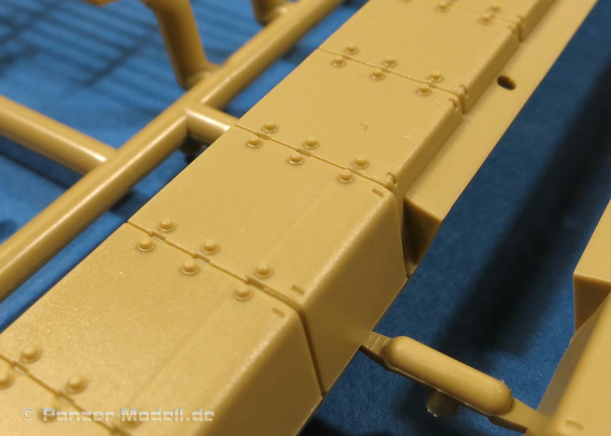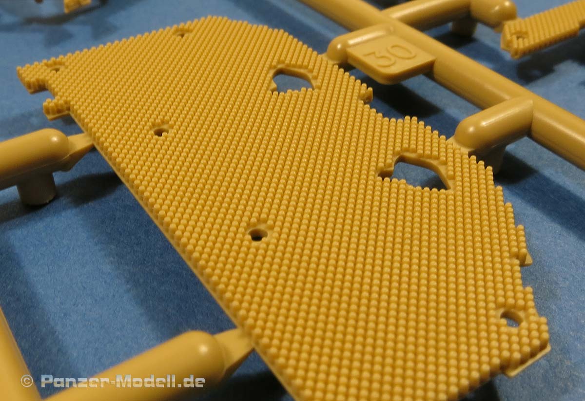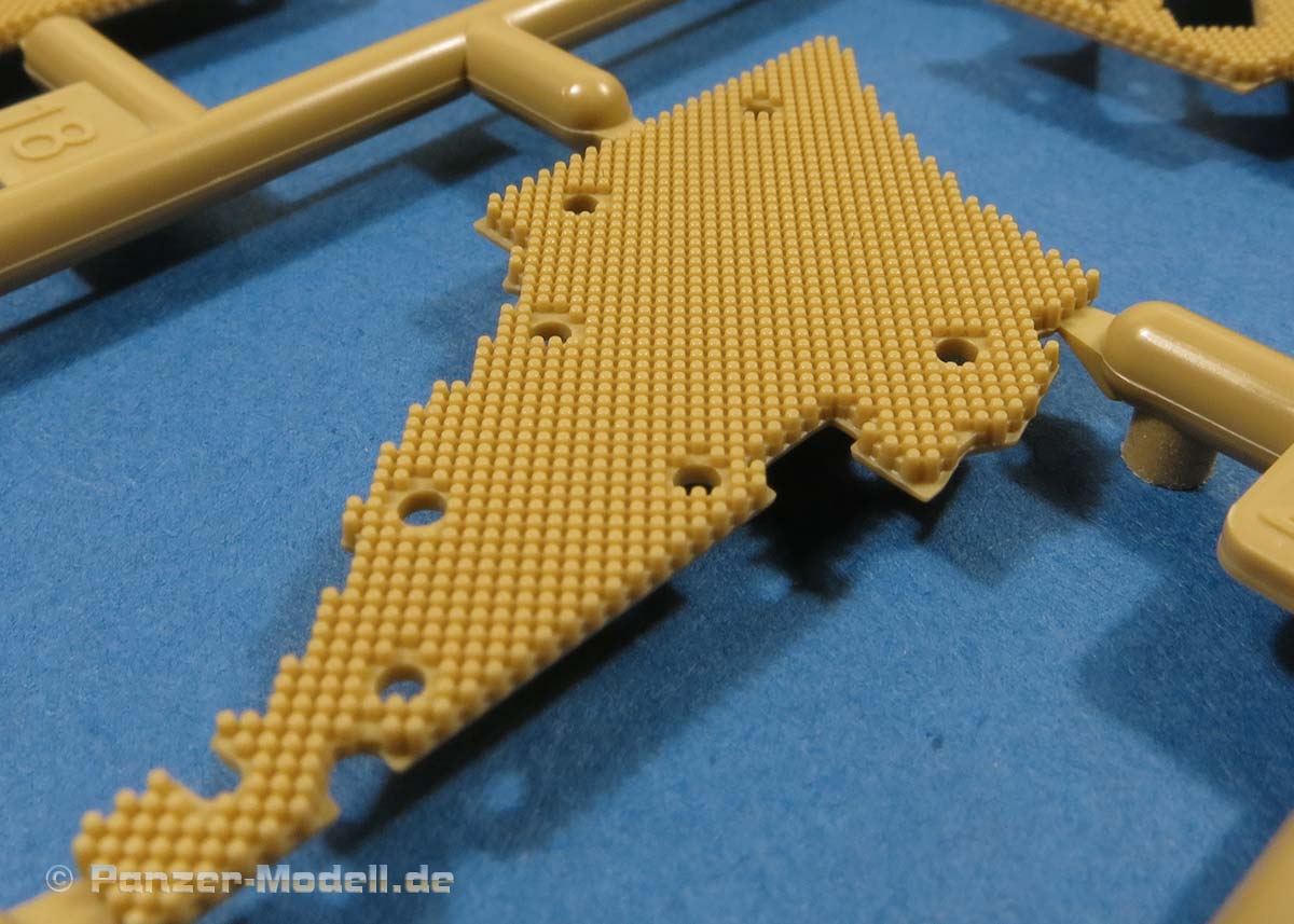 Die Seitenelemente sind gleich inklusive der Zusatzpanzerung gespritzt und setzen sich aus wenigen großen Teilen zusammen. Auch hier sehr feine und tolle Details, inklusive feiner Nieten und der Antirutschbeschichtung oben auf der Zusatzpanzerung. Auch die Gitterpanzerung am unteren Ende der Seiten ist in einem Teil und dafür bemerkenswert gut und detailliert gespritzt.