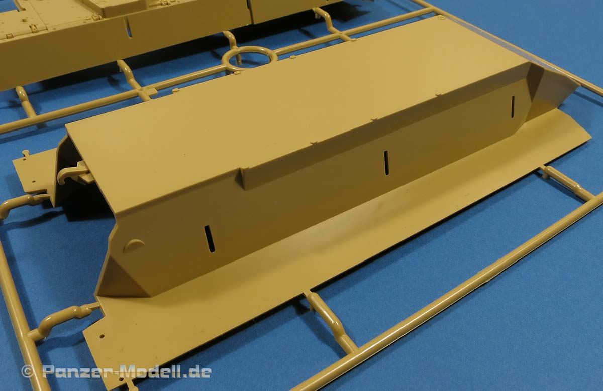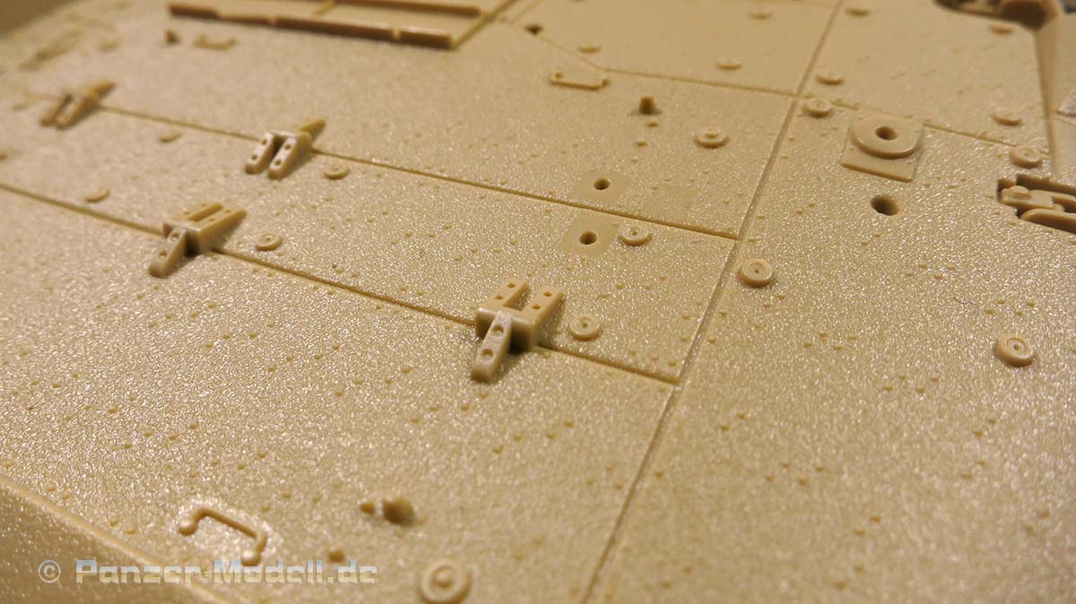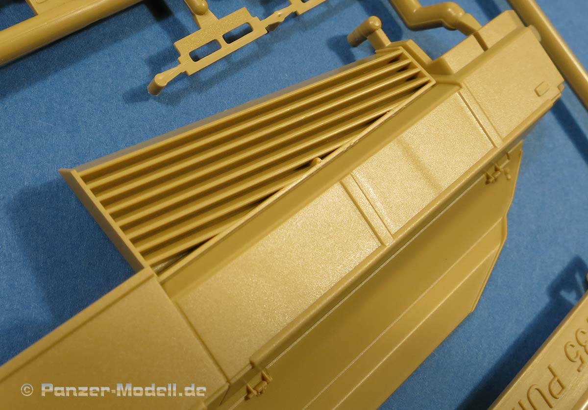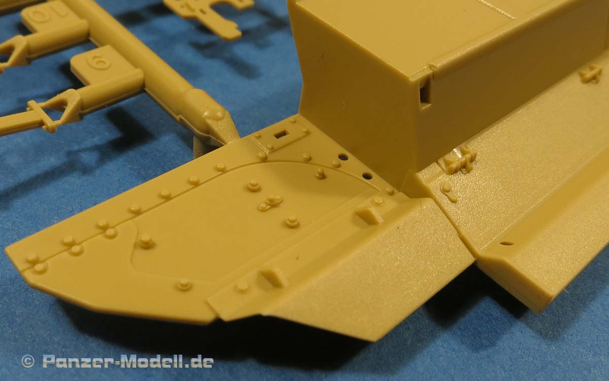 Die Seitenelemente sind gleich inklusive der Zusatzpanzerung gespritzt und setzen sich aus wenigen großen Teilen zusammen. Auch hier sehr feine und tolle Details, inklusive feiner Nieten und der Antirutschbeschichtung oben auf der Zusatzpanzerung. Auch die Gitterpanzerung am unteren Ende der Seiten ist in einem Teil und dafür bemerkenswert gut und detailliert gespritzt.