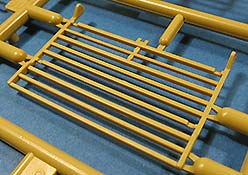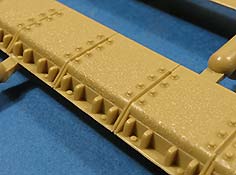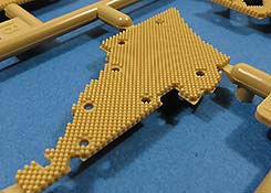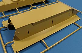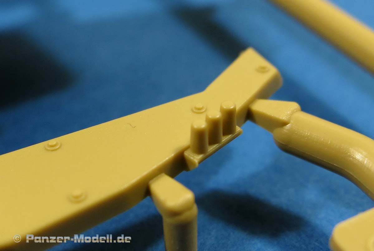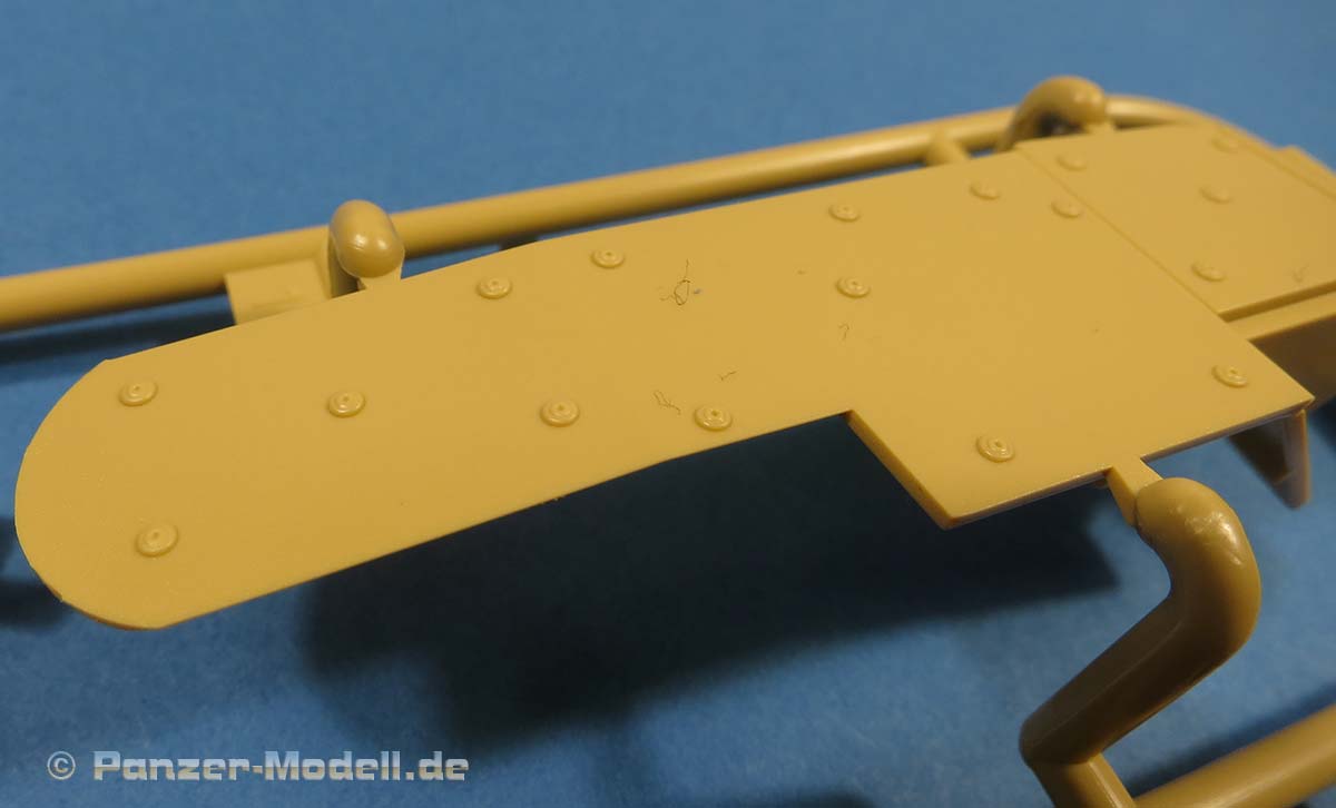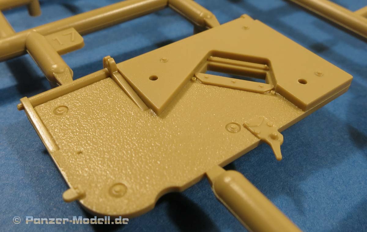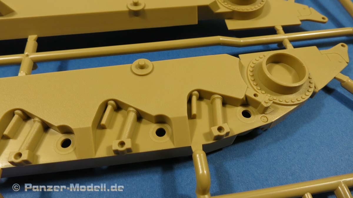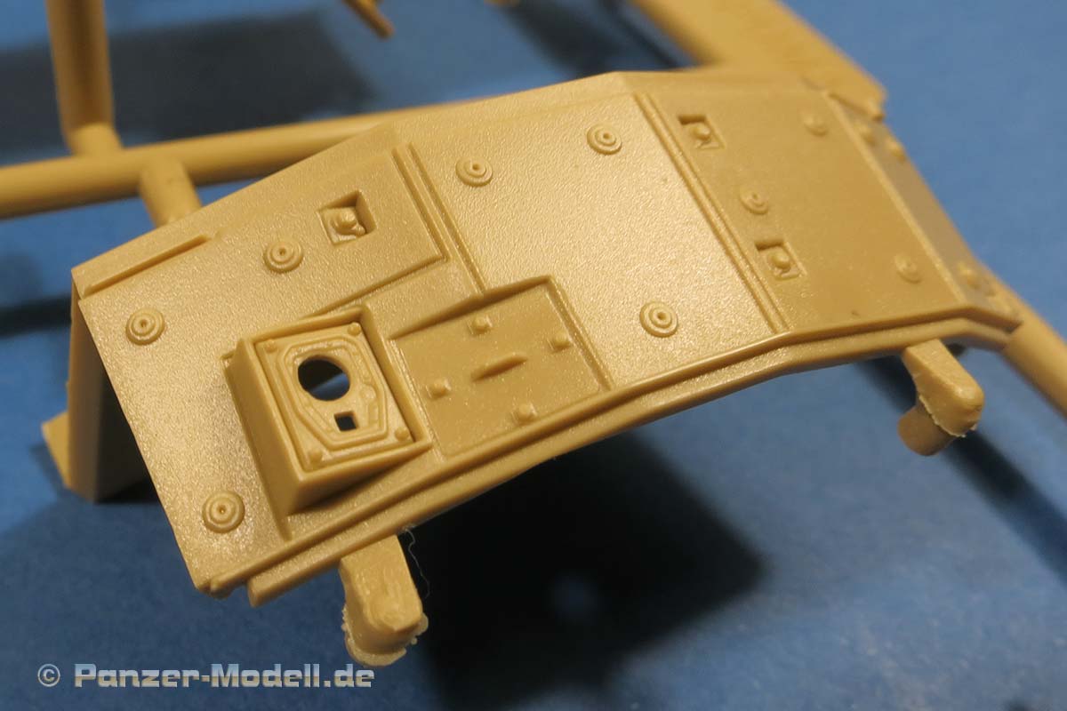 Die Seitenelemente sind gleich inklusive der Zusatzpanzerung gespritzt und setzen sich aus wenigen großen Teilen zusammen. Auch hier sehr feine und tolle Details, inklusive feiner Nieten und der Antirutschbeschichtung oben auf der Zusatzpanzerung. Auch die Gitterpanzerung am unteren Ende der Seiten ist in einem Teil und dafür bemerkenswert gut und detailliert gespritzt.