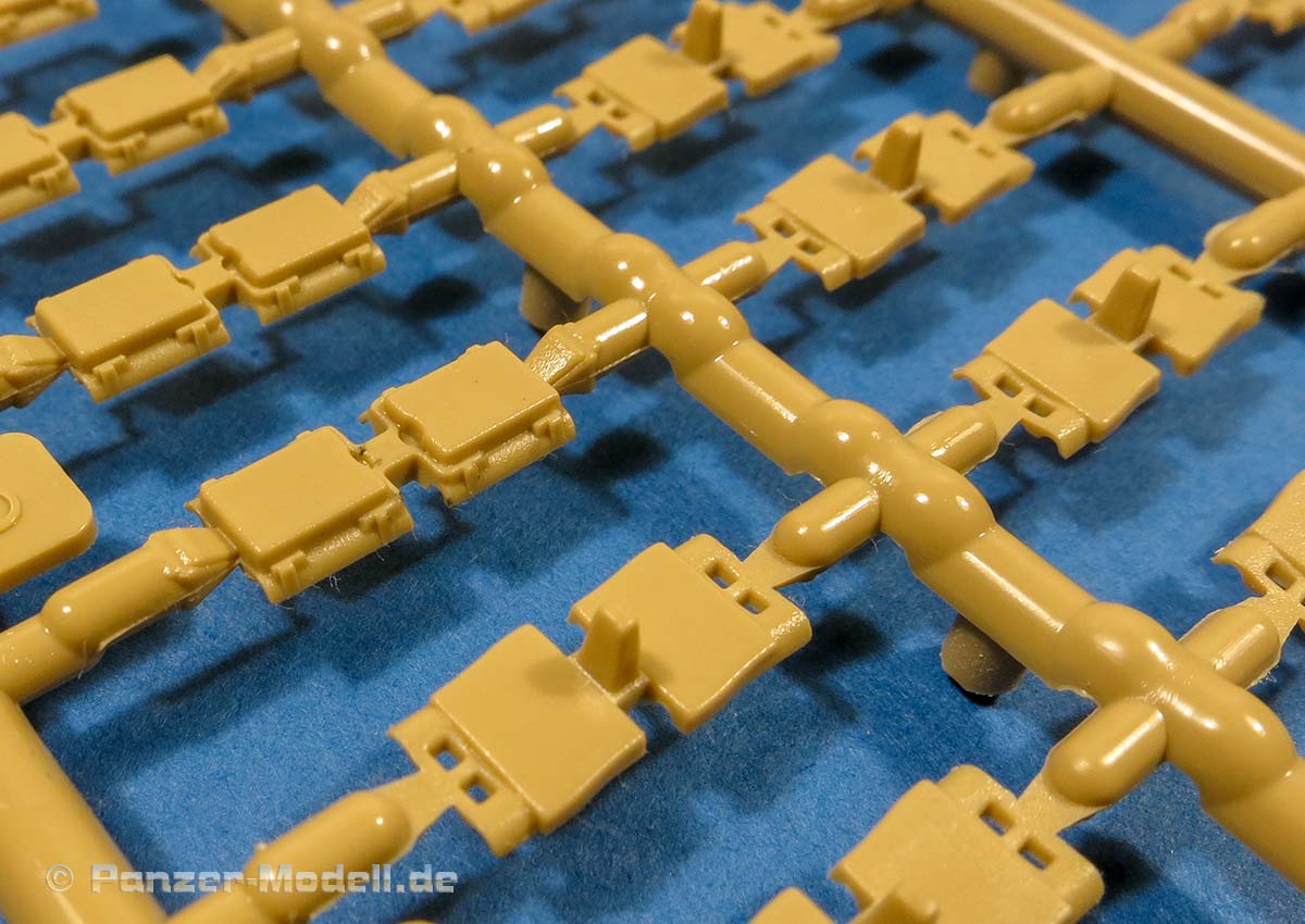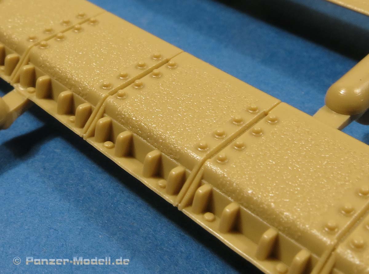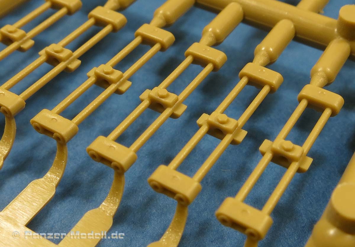 Die Kette setzt sich dabei aus einem Ober- und Unterteil des Kettenkörpers zusammen, zwischen die die ebenfalls einzeln enthaltenen Doppelbolzen eingelegt werden, die an beiden Enden bereits die Endverbinden angegossen haben. Auch hier sehr sauber und fein detailliert.