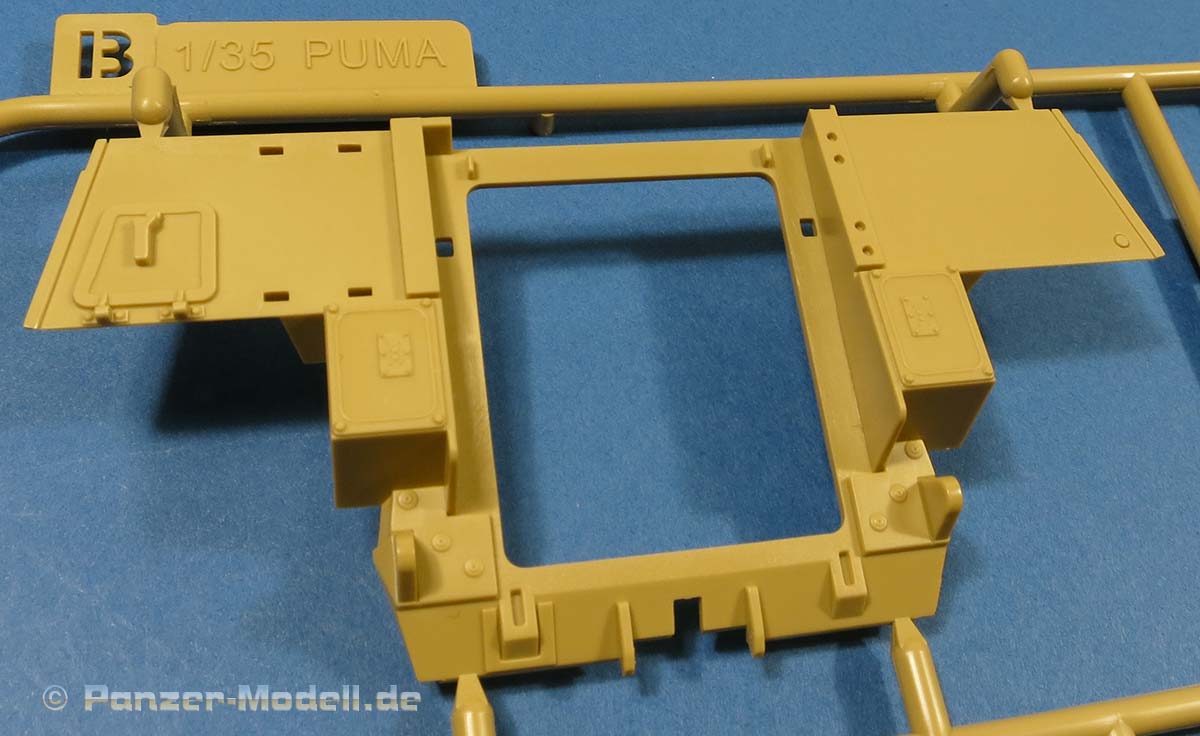 Was aber wieder richtig gut gemacht ist und eines der Hauptmerkmale der Serienversion des Puma ist, ist der Tausch der massiben Panzerelemente am Heck gegen Gitterpanzerung - und diese ist in Plastik in einzelnen Elementen gespritzt. Herrlich! Eine extreme Erleichterung zum bau für die Modellbauer und optisch absolut noch ausreichend dünn gespritzt.