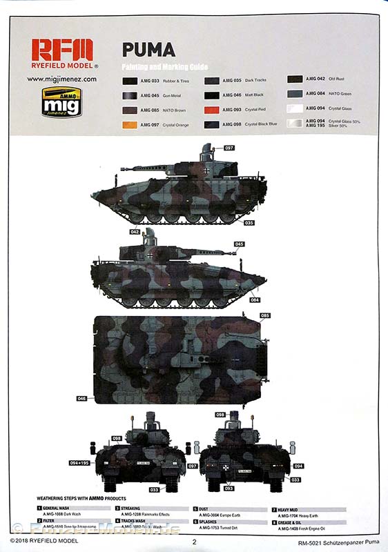 In der Anleitung findet sich auch farbig gedruckte Fünfseitenansicht, die in der Hauptsache die Vorlage für den Flecktarnplan und die Aufbringung der allgemeinen Decals ist. Für eine Zuordnung zu Einheuten muss der Modellbauer dann selber tätig werden, aber das ist heutzutage ja einfach. Die Farbangaben beziehen sich auf Amig Farben