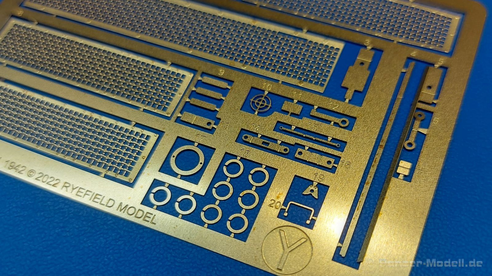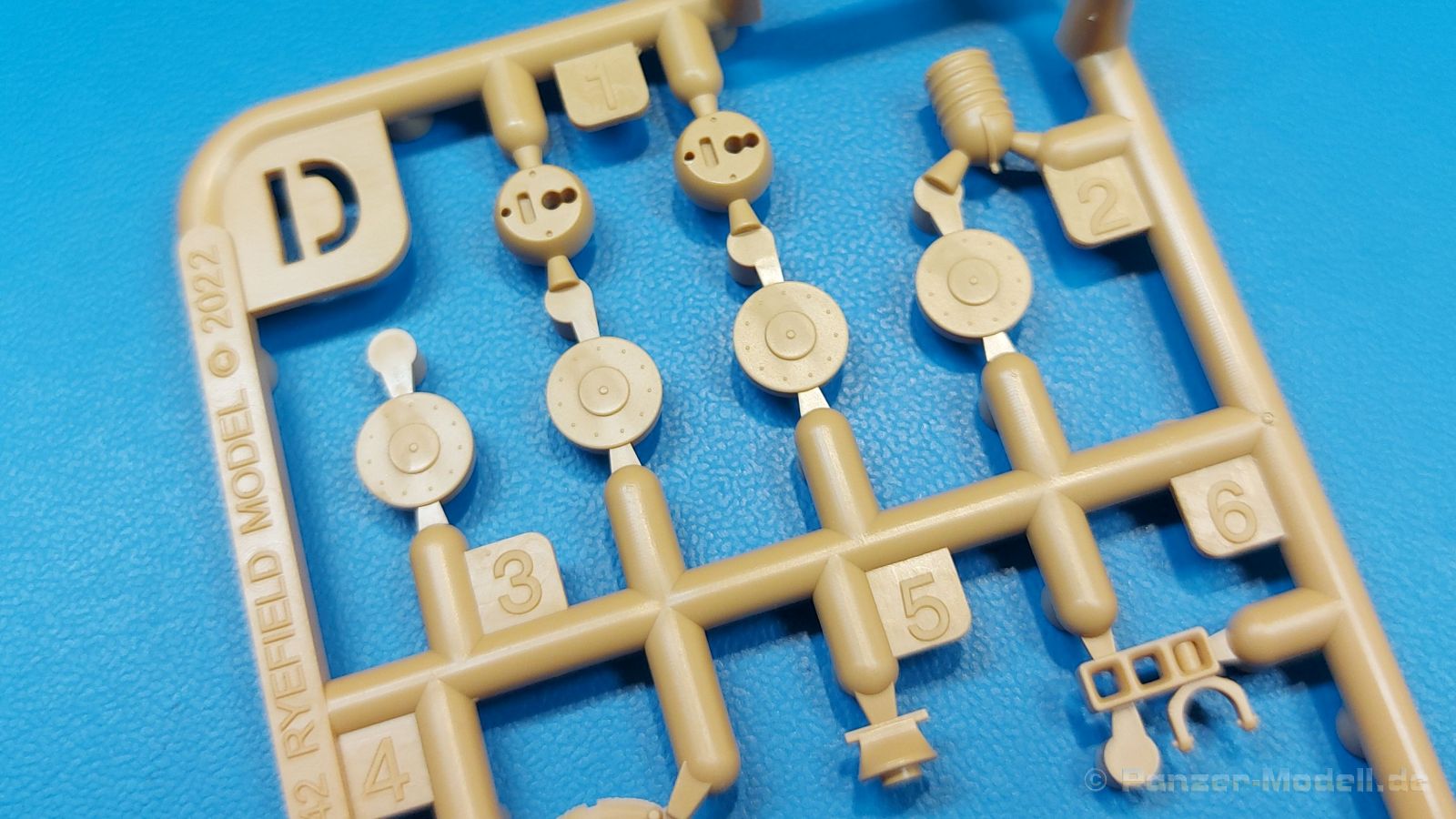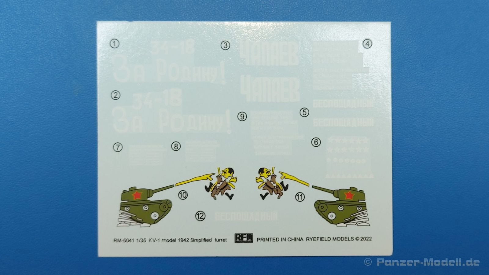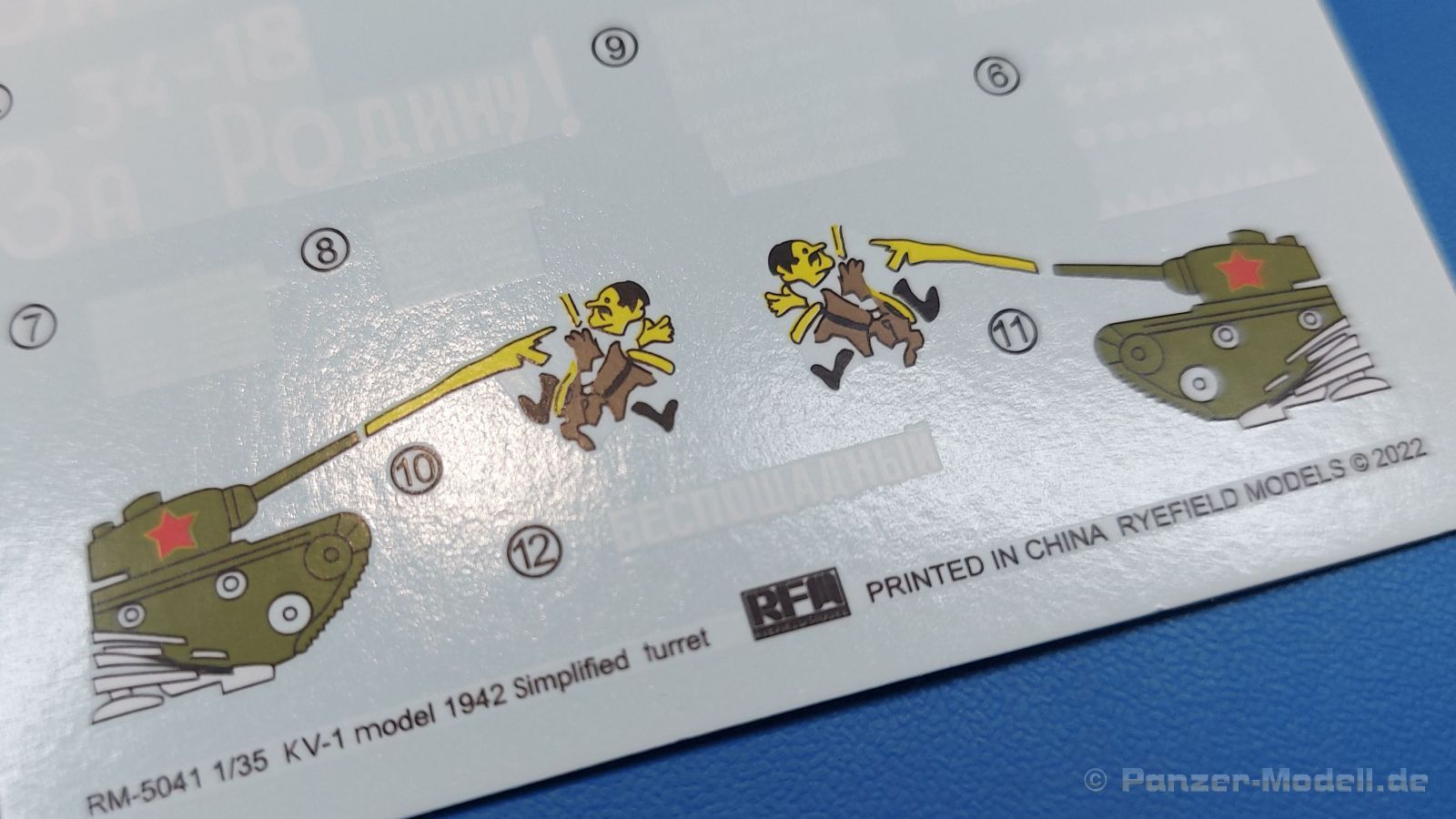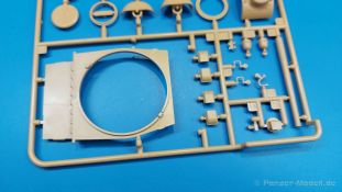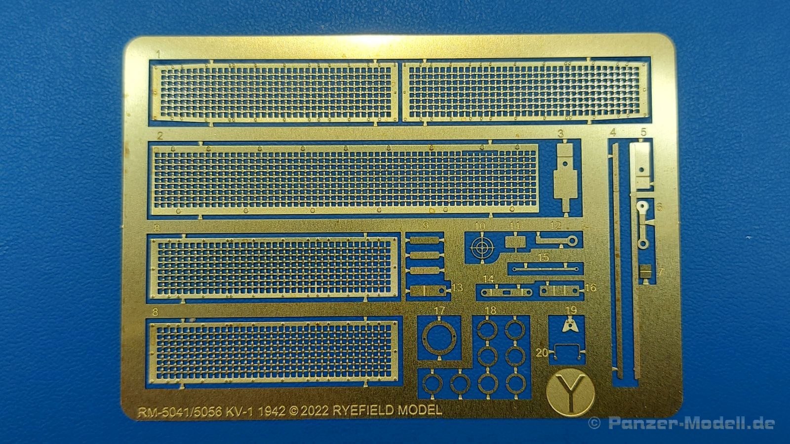 Der KV-1 (in deutscher Literatur auch oft KW-1 genannt) war ein sowjetischer, schwerer Panzer, bekannt durch seine dicke Panzerung und eine 76,2 mm Kanone. Er wurde parallel zum SMK entwickelt, der allerdings zwei Türme hatte. Elemente des SMK wurden in den KV-1 übernommen. Sowohl der SMK als auch der KV-1 wurden an der Front in Finnland erprobt. Darauf basierend entschied man sich für den KV-1. Es gab etliche Varianten, um erkannte Schwächen auszugleichen und den Kampfwert zu steigern. Der 5-Mann Besatzung standen eine 76,2 mm Kanone und 3 MG zum Kampf zur Verfügung. Bei einem Gewicht von über 43 Tonnen konnte der 404 kW (550 PS) Motor das Gefährt bis auf ca. 30 km/h beschleunigen. Mit seiner Panzerung von 35-90 mm stellte er für die damaligen deutschen Panzer eine echte Herausforderung dar und konnte auf übliche Kampfentfernung wirksam nur mit einen 8,8cm Flak bekämpft werden. Da er aber den aufkommenden Panthern und Tigern nicht mehr gewachsen war, wurde er nach und nach ab 1943 durch IS-1/IS-2 Panzer abgelöst. Der Bausatz: Rye Field Models wagt sich nun auch an den KV-1. Es gibt schon einige gute Modelle dieses Typs, aber schauen wir mal, ob man da eine Steigerung reinbringen konnte. Der weiße Stülpdeckelkarton ist 380 x 240 x 70 mm groß und zeigt an der einen Seite zwei farbige Seitenrisse mit unterschiedlichen Markierungen. An der anderen Seite sind Bauvarianten (mit offenen oder geschlossenen Luken, unterschiedliche Stützrollen etc.) und eine Darstellung der Drehstabfederung zu sehen. Das Deckelbild zeigt in groß den farbenfroheren Seitenriss des Panzers. Der Karton enthält sechs sandgelbe Spritzlinge, einen Klarsichtspritzling, einen schwarzen Vinylspritzling, ein Tütchen mit 22 silbergrauen Spritzlingen zu je 9 Kettengliedern, ein weiteres Tütchen mit 11 silbergrauen Spritzlingen mit Kettenbolzen, eine Fotoätzteil-Platine (PE), einen Bindfaden, ein kleines Decalblatt und die Bauanleitung. Die Spritzlinge sind einwandfrei, die Teile ohne Versatz oder Sinkstellen. Details sind scharf und gut herausgearbeitet. Es gibt einige sichtbare Auswerferspuren, aber sie befinden sich auf Innen- und Unterseiten von Teilen und können größtenteils ignoriert werden. Nur manche hervorstehende Auswerfermarken stören und müssen auf alle Fälle entfernt werden. Auch der Klarsichtspritzling ist sehr sauber ausgespritzt und kristallklar. Die Unterwanne setzt sich aus Bodenplatte, den Seitenwänden, sowie Heckwand und Bugplatten zusammen und weisen bereits angegossene, gute Details wie Verschraubungen und Wartungsdeckel auf. Grad an den Seitenwänden und dem Heck hat man dem Plastik eine gute, sogar fühlbare Walzstruktur mitgegeben. Saubere Ansatzkanten und Passstifte werden dabei helfen, die Wannenteile verzugsfrei zusammen zu bauen. Die Abschleppaugen vorn und hinten gibt es in zwei Varianten zur Wahl, mit einer runden und einer rombusförmigen Bodenplatte. Die dazugehörigen Schäkel haben innen gerundete Stifte, so dass man sie, ohne zu kleben auf die Augen aufklipsen kann. Vorn wird noch eine zusätzliche Panzerplatte aufgeklebt, bevor man die Schäkel anbringt, da die Platte über die volle Breite geht und die Löcher für die Augen beinhaltet. Die Das einzige Rücklicht besteht aus einem Klarsichtteil. Es bekommt noch einen Ring aus PE. Das Luftleitblech am Heck besteht aus dünnem Plastik, das dazugehörige Zuluftgitter aus fein strukturiertem PE. Schwingarme mit den Drehstäben werden einzeln eingesteckt. Jeweils der vorderste und hinterste Schwingarm haben angegossene Passnasen und werden fest eingebaut. Die anderen Schwingarme können ihrer Natur folgen und schwingend eingebaut werden, um die Federung zu simulieren, bzw. bei Einbau des Modells in ein unebenes Diorama die eingefederten Laufrollen darzustellen. Für die Schwingarmnaben gibt es alternative Deckel. Sechs Anschlagdämpfer pro Seite mit ihren Verschraubungen und Stützwinkeln sehen toll aus und liegen als Einzelteile bei. Die Laufrollen machen einen hervorragenden Eindruck mit Details auf beiden Seiten. In die Laufrollen werden Vinylmuffen eingelegt. So steckt man die Räder nur auf die Schwingarme und sie bleiben dadurch beweglich. Wie die Anschlagdämpfer werden die Stützrollenböcke einzeln angeklebt. An den Wannenseiten sind die sechs Schraubenlöcher dargestellt. Sollte man sich für einen beschädigten KV entschließen, kann man z.B. einen Stützrollenbock einfach weglassen und braucht nicht mal bohren. Bei den Stützrollen kann man zwischen gelochten und ungelochten Rollen wählen. Hier wird die Beweglichkeit über einen Bolzen erreicht, der mit dem Stützrollenbock verklebt wird und auf dem die Stützrolle rotieren kann. Sowohl Leitrollen als auch Antriebsräder sind mit Durchbrüchen, Verschraubungen und Stützwinkeln gut gelungen. Auch hier kommen für die Drehbarkeit Vinylmuffen zum Einsatz. Der Schmutzabstreifer, der beim Original den Dreck zwischen den Antriebszahnkränzen entfernt, besteht aus einem gut gelungenen Teil. Die Kettenspanner sind mehrteilig ausgeführt und werden beweglich angebaut, so dass man die Kettenspannung einstellen kann und sie erst festklebt, wenn man die Spannung entsprechend eingestellt hat. Das Gewinde der Spannstange sieht sehr gut aus. Die Einzelgliederketten bestehen aus Gliedern mit und ohne Führungszahn, die wechselweise zusammengesetzt werden. Die Detailierung ist gut, wenn auch ohne Gussnummern. Für den Zusammenbau der Ketten gibt es eine Kettenlehre, auf der man 10 Glieder zusammensteckt und mit den Bolzen verbindet. Die Bolzen sind bereits zu zehnt am Gussast und können somit gleichzeitig eingeführt, verklebt und dann vom Gussast abgetrennt werden. Die Löcher in den Gliedern sind sehr sauber, so dass der Zusammenbau problemlos vonstattengehen sollte. Pro Seite benötigt man 88 Glieder. Man hat also noch einen Teil als Reserve zur Verfügung. Die Kettenbleche des KV bestehen aus je einem langen Teil mit Details auf beiden Seiten. An der Unterseite ist 