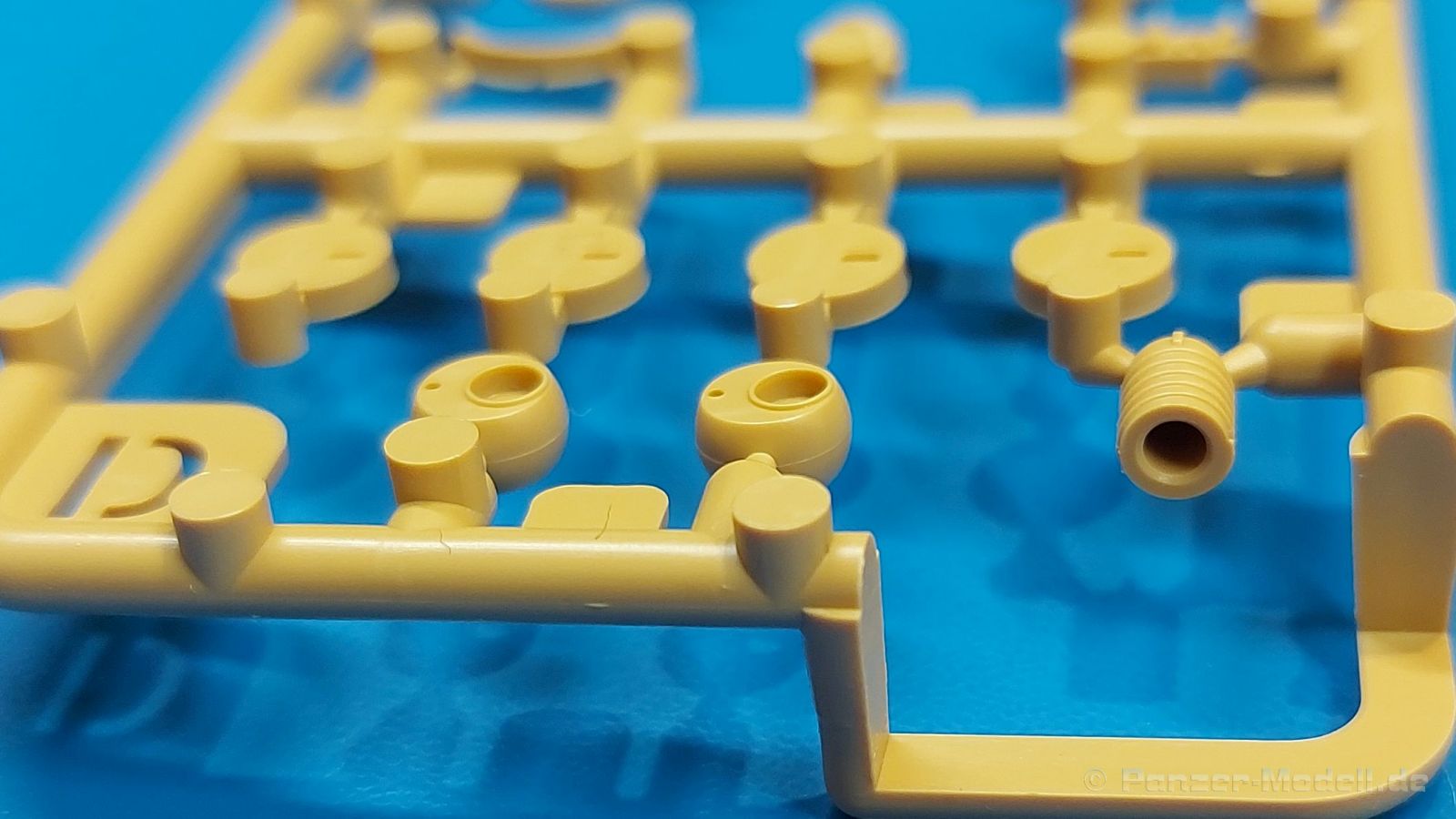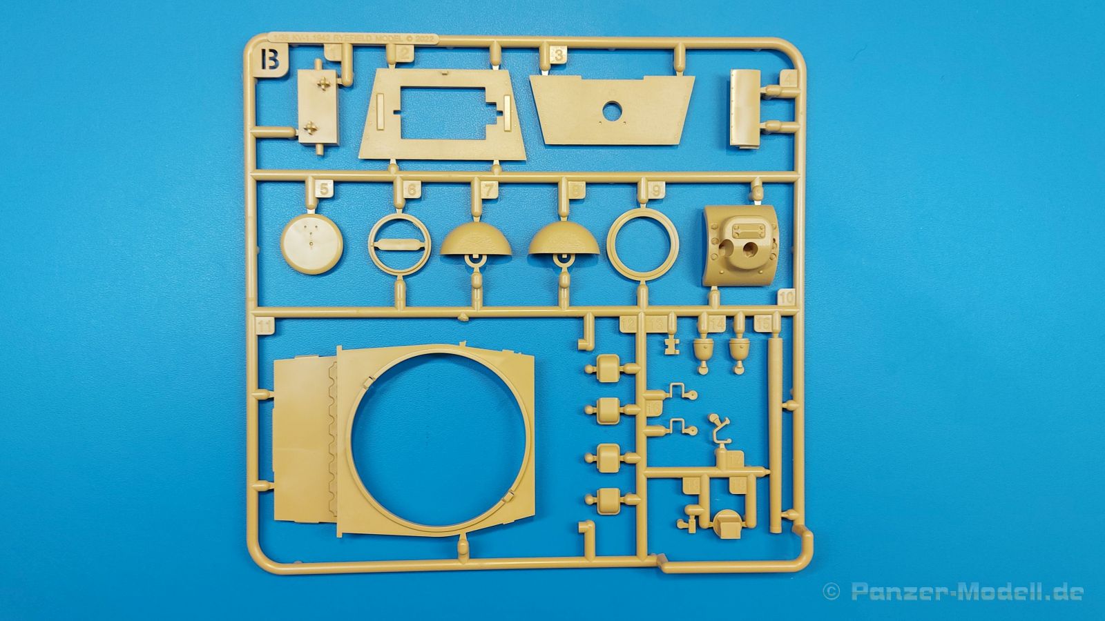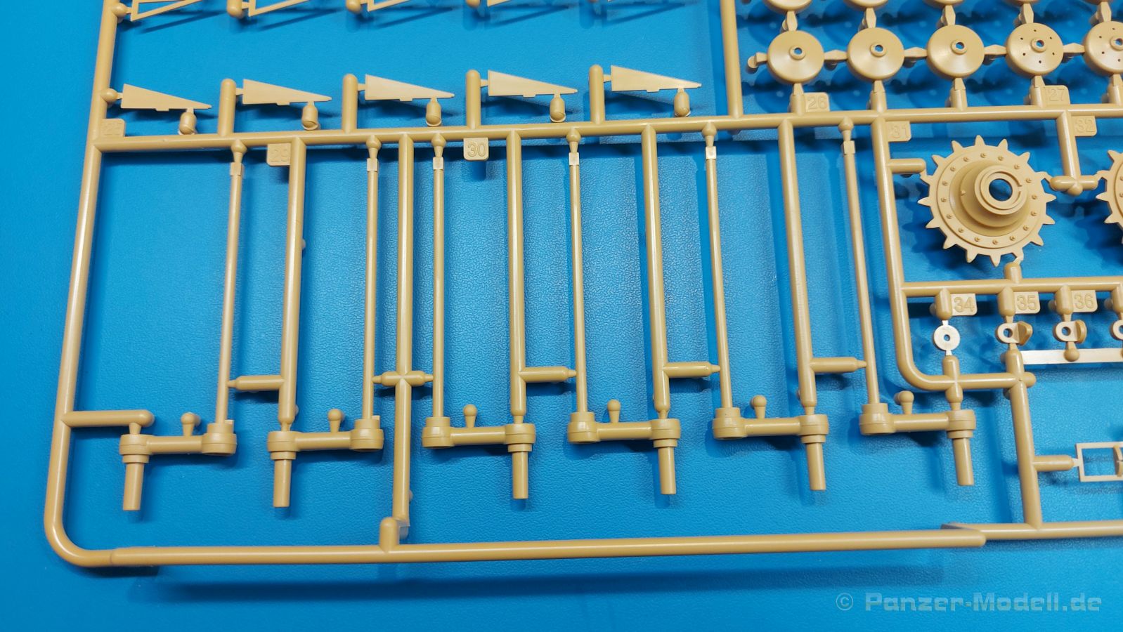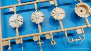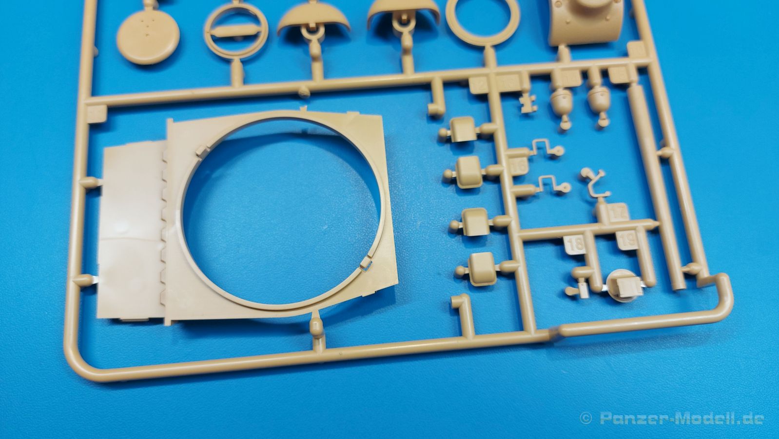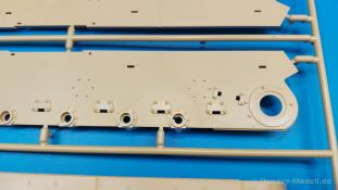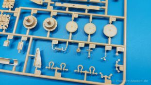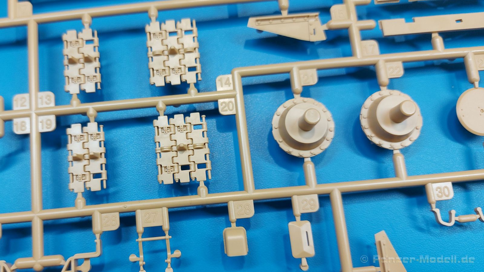 Der KV-1 (in deutscher Literatur auch oft KW-1 genannt) war ein sowjetischer, schwerer Panzer, bekannt durch seine dicke Panzerung und eine 76,2 mm Kanone. Er wurde parallel zum SMK entwickelt, der allerdings zwei Türme hatte. Elemente des SMK wurden in den KV-1 übernommen. Sowohl der SMK als auch der KV-1 wurden an der Front in Finnland erprobt. Darauf basierend entschied man sich für den KV-1. Es gab etliche Varianten, um erkannte Schwächen auszugleichen und den Kampfwert zu steigern. Der 5-Mann Besatzung standen eine 76,2 mm Kanone und 3 MG zum Kampf zur Verfügung. Bei einem Gewicht von über 43 Tonnen konnte der 404 kW (550 PS) Motor das Gefährt bis auf ca. 30 km/h beschleunigen. Mit seiner Panzerung von 35-90 mm stellte er für die damaligen deutschen Panzer eine echte Herausforderung dar und konnte auf übliche Kampfentfernung wirksam nur mit einen 8,8cm Flak bekämpft werden. Da er aber den aufkommenden Panthern und Tigern nicht mehr gewachsen war, wurde er nach und nach ab 1943 durch IS-1/IS-2 Panzer abgelöst. Der Bausatz: Rye Field Models wagt sich nun auch an den KV-1. Es gibt schon einige gute Modelle dieses Typs, aber schauen wir mal, ob man da eine Steigerung reinbringen konnte. Der weiße Stülpdeckelkarton ist 380 x 240 x 70 mm groß und zeigt an der einen Seite zwei farbige Seitenrisse mit unterschiedlichen Markierungen. An der anderen Seite sind Bauvarianten (mit offenen oder geschlossenen Luken, unterschiedliche Stützrollen etc.) und eine Darstellung der Drehstabfederung zu sehen. Das Deckelbild zeigt in groß den farbenfroheren Seitenriss des Panzers. Der Karton enthält sechs sandgelbe Spritzlinge, einen Klarsichtspritzling, einen schwarzen Vinylspritzling, ein Tütchen mit 22 silbergrauen Spritzlingen zu je 9 Kettengliedern, ein weiteres Tütchen mit 11 silbergrauen Spritzlingen mit Kettenbolzen, eine Fotoätzteil-Platine (PE), einen Bindfaden, ein kleines Decalblatt und die Bauanleitung. Die Spritzlinge sind einwandfrei, die Teile ohne Versatz oder Sinkstellen. Details sind scharf und gut herausgearbeitet. Es gibt einige sichtbare Auswerferspuren, aber sie befinden sich auf Innen- und Unterseiten von Teilen und können größtenteils ignoriert werden. Nur manche hervorstehende Auswerfermarken stören und müssen auf alle Fälle entfernt werden. Auch der Klarsichtspritzling ist sehr sauber ausgespritzt und kristallklar. Die Unterwanne setzt sich aus Bodenplatte, den Seitenwänden, sowie Heckwand und Bugplatten zusammen und weisen bereits angegossene, gute Details wie Verschraubungen und Wartungsdeckel auf. Grad an den Seitenwänden und dem Heck hat man dem Plastik eine gute, sogar fühlbare Walzstruktur mitgegeben. Saubere Ansatzkanten und Passstifte werden dabei helfen, die Wannenteile verzugsfrei zusammen zu bauen. Die Abschleppaugen vorn und hinten gibt es in zwei Varianten zur Wahl, mit einer runden und einer rombusförmigen Bodenplatte. Die dazugehörigen Schäkel haben innen gerundete Stifte, so dass man sie, ohne zu kleben auf die Augen aufklipsen kann. Vorn wird noch eine zusätzliche Panzerplatte aufgeklebt, bevor man die Schäkel anbringt, da die Platte über die volle Breite geht und die Löcher für die Augen beinhaltet. Die Das einzige Rücklicht besteht aus einem Klarsichtteil. Es bekommt noch einen Ring aus PE. Das Luftleitblech am Heck besteht aus dünnem Plastik, das dazugehörige Zuluftgitter aus fein strukturiertem PE. Schwingarme mit den Drehstäben werden einzeln eingesteckt. Jeweils der vorderste und hinterste Schwingarm haben angegossene Passnasen und werden fest eingebaut. Die anderen Schwingarme können ihrer Natur folgen und schwingend eingebaut werden, um die Federung zu simulieren, bzw. bei Einbau des Modells in ein unebenes Diorama die eingefederten Laufrollen darzustellen. Für die Schwingarmnaben gibt es alternative Deckel. Sechs Anschlagdämpfer pro Seite mit ihren Verschraubungen und Stützwinkeln sehen toll aus und liegen als Einzelteile bei. Die Laufrollen machen einen hervorragenden Eindruck mit Details auf beiden Seiten. In die Laufrollen werden Vinylmuffen eingelegt. So steckt man die Räder nur auf die Schwingarme und sie bleiben dadurch beweglich. Wie die Anschlagdämpfer werden die Stützrollenböcke einzeln angeklebt. An den Wannenseiten sind die sechs Schraubenlöcher dargestellt. Sollte man sich für einen beschädigten KV entschließen, kann man z.B. einen Stützrollenbock einfach weglassen und braucht nicht mal bohren. Bei den Stützrollen kann man zwischen gelochten und ungelochten Rollen wählen. Hier wird die Beweglichkeit über einen Bolzen erreicht, der mit dem Stützrollenbock verklebt wird und auf dem die Stützrolle rotieren kann. Sowohl Leitrollen als auch Antriebsräder sind mit Durchbrüchen, Verschraubungen und Stützwinkeln gut gelungen. Auch hier kommen für die Drehbarkeit Vinylmuffen zum Einsatz. Der Schmutzabstreifer, der beim Original den Dreck zwischen den Antriebszahnkränzen entfernt, besteht aus einem gut gelungenen Teil. Die Kettenspanner sind mehrteilig ausgeführt und werden beweglich angebaut, so dass man die Kettenspannung einstellen kann und sie erst festklebt, wenn man die Spannung entsprechend eingestellt hat. Das Gewinde der Spannstange sieht sehr gut aus. Die Einzelgliederketten bestehen aus Gliedern mit und ohne Führungszahn, die wechselweise zusammengesetzt werden. Die Detailierung ist gut, wenn auch ohne Gussnummern. Für den Zusammenbau der Ketten gibt es eine Kettenlehre, auf der man 10 Glieder zusammensteckt und mit den Bolzen verbindet. Die Bolzen sind bereits zu zehnt am Gussast und können somit gleichzeitig eingeführt, verklebt und dann vom Gussast abgetrennt werden. Die Löcher in den Gliedern sind sehr sauber, so dass der Zusammenbau problemlos vonstattengehen sollte. Pro Seite benötigt man 88 Glieder. Man hat also noch einen Teil als Reserve zur Verfügung. Die Kettenbleche des KV bestehen aus je einem langen Teil mit Details auf beiden Seiten. An der Unterseite ist 