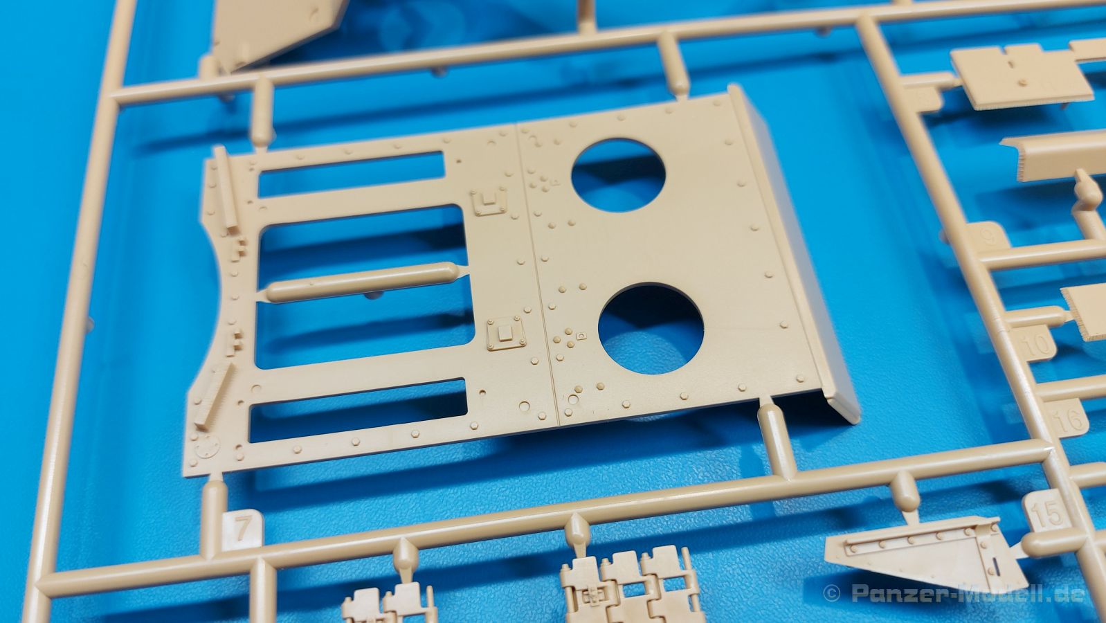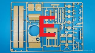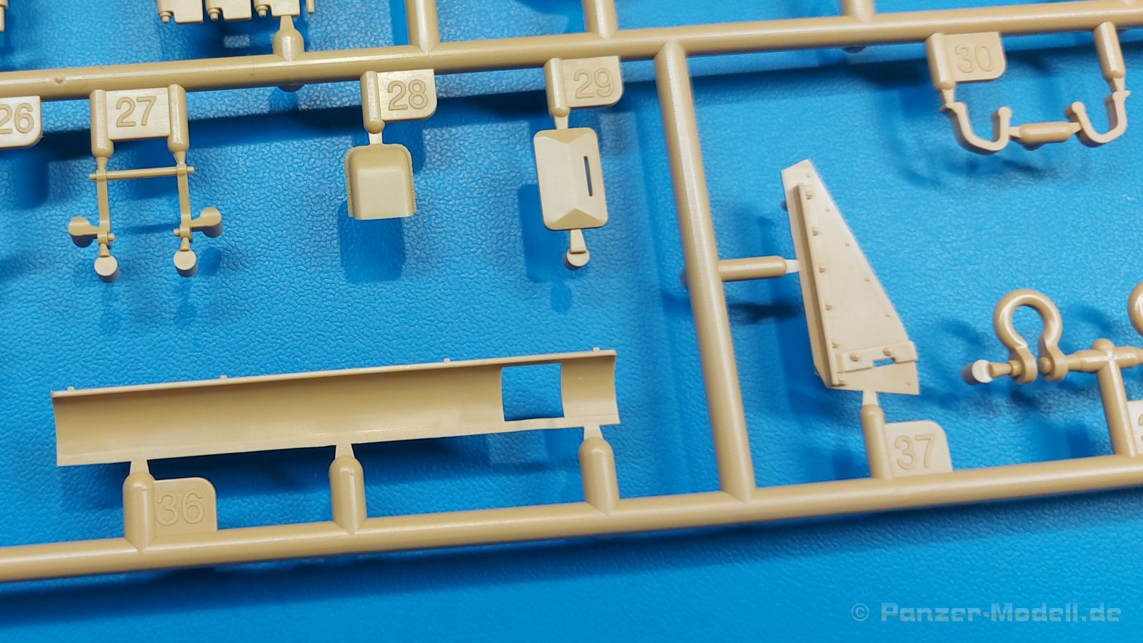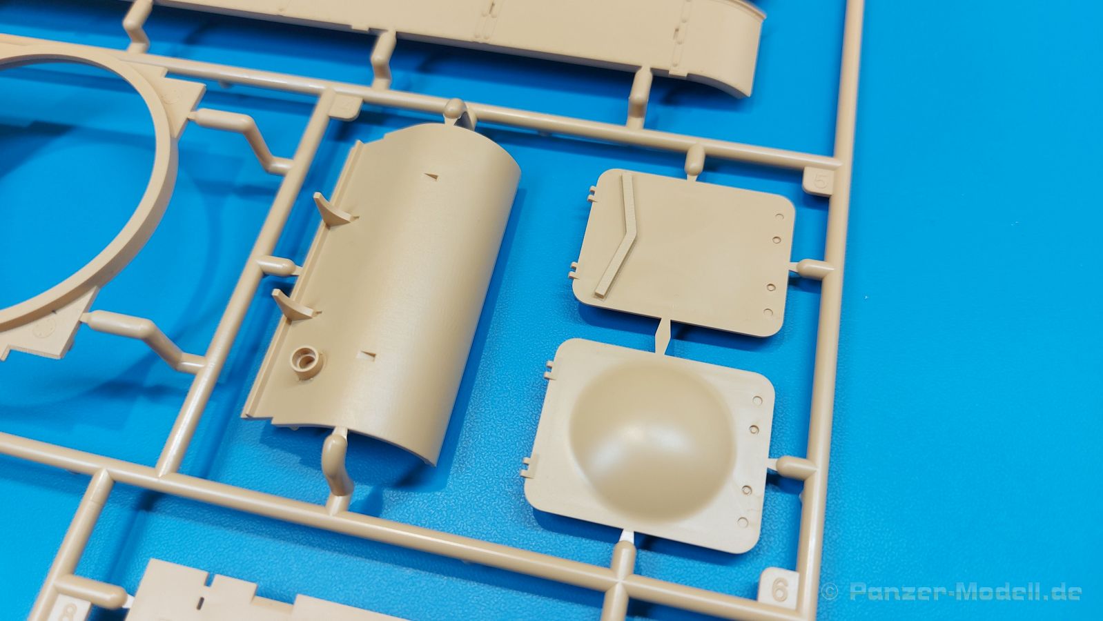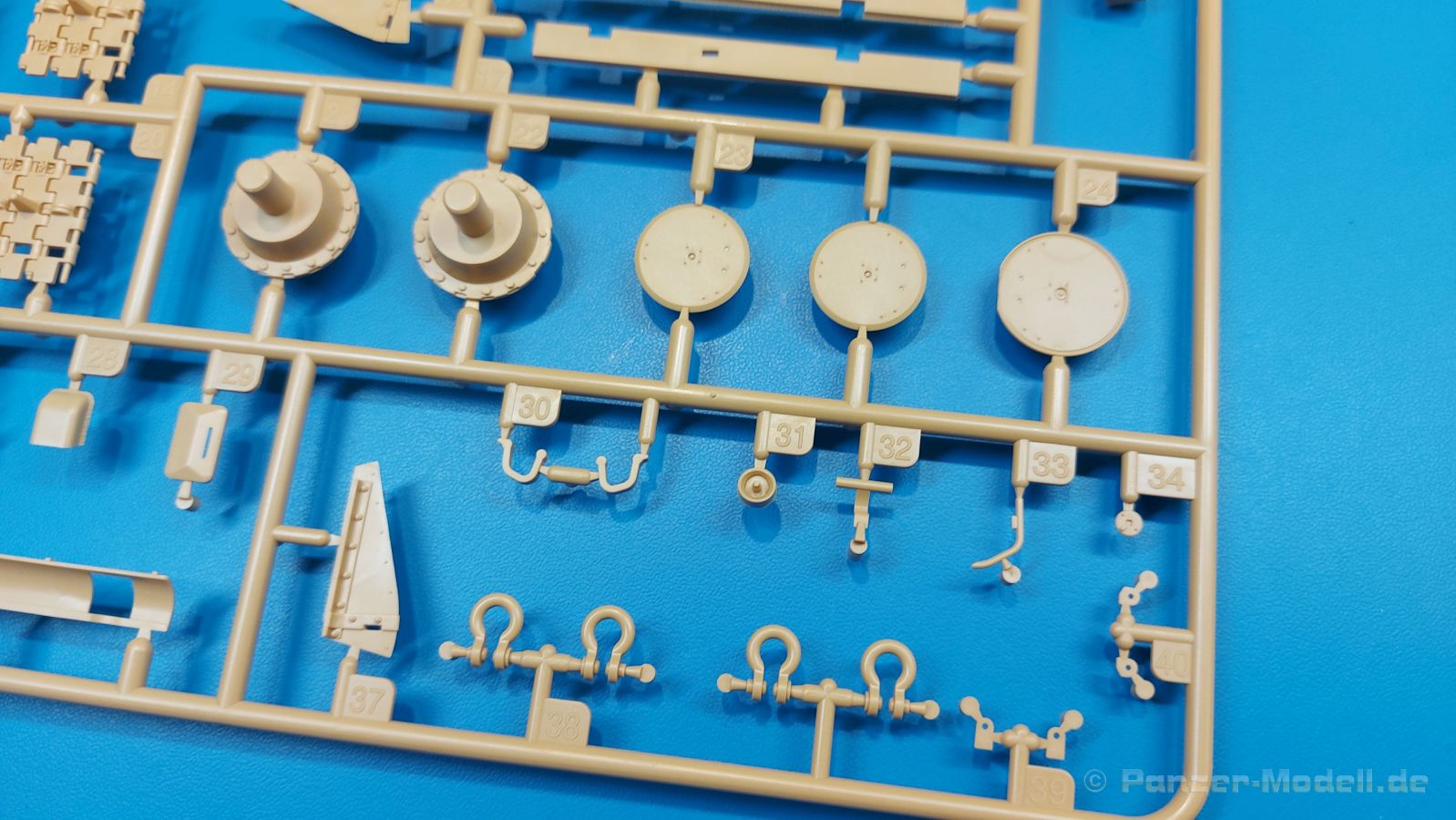 Der KV-1 (in deutscher Literatur auch oft KW-1 genannt) war ein sowjetischer, schwerer Panzer, bekannt durch seine dicke Panzerung und eine 76,2 mm Kanone. Er wurde parallel zum SMK entwickelt, der allerdings zwei Türme hatte. Elemente des SMK wurden in den KV-1 übernommen. Sowohl der SMK als auch der KV-1 wurden an der Front in Finnland erprobt. Darauf basierend entschied man sich für den KV-1. Es gab etliche Varianten, um erkannte Schwächen auszugleichen und den Kampfwert zu steigern. Der 5-Mann Besatzung standen eine 76,2 mm Kanone und 3 MG zum Kampf zur Verfügung. Bei einem Gewicht von über 43 Tonnen konnte der 404 kW (550 PS) Motor das Gefährt bis auf ca. 30 km/h beschleunigen. Mit seiner Panzerung von 35-90 mm stellte er für die damaligen deutschen Panzer eine echte Herausforderung dar und konnte auf übliche Kampfentfernung wirksam nur mit einen 8,8cm Flak bekämpft werden. Da er aber den aufkommenden Panthern und Tigern nicht mehr gewachsen war, wurde er nach und nach ab 1943 durch IS-1/IS-2 Panzer abgelöst. Der Bausatz: Rye Field Models wagt sich nun auch an den KV-1. Es gibt schon einige gute Modelle dieses Typs, aber schauen wir mal, ob man da eine Steigerung reinbringen konnte. Der weiße Stülpdeckelkarton ist 380 x 240 x 70 mm groß und zeigt an der einen Seite zwei farbige Seitenrisse mit unterschiedlichen Markierungen. An der anderen Seite sind Bauvarianten (mit offenen oder geschlossenen Luken, unterschiedliche Stützrollen etc.) und eine Darstellung der Drehstabfederung zu sehen. Das Deckelbild zeigt in groß den farbenfroheren Seitenriss des Panzers. Der Karton enthält sechs sandgelbe Spritzlinge, einen Klarsichtspritzling, einen schwarzen Vinylspritzling, ein Tütchen mit 22 silbergrauen Spritzlingen zu je 9 Kettengliedern, ein weiteres Tütchen mit 11 silbergrauen Spritzlingen mit Kettenbolzen, eine Fotoätzteil-Platine (PE), einen Bindfaden, ein kleines Decalblatt und die Bauanleitung. Die Spritzlinge sind einwandfrei, die Teile ohne Versatz oder Sinkstellen. Details sind scharf und gut herausgearbeitet. Es gibt einige sichtbare Auswerferspuren, aber sie befinden sich auf Innen- und Unterseiten von Teilen und können größtenteils ignoriert werden. Nur manche hervorstehende Auswerfermarken stören und müssen auf alle Fälle entfernt werden. Auch der Klarsichtspritzling ist sehr sauber ausgespritzt und kristallklar. Die Unterwanne setzt sich aus Bodenplatte, den Seitenwänden, sowie Heckwand und Bugplatten zusammen und weisen bereits angegossene, gute Details wie Verschraubungen und Wartungsdeckel auf. Grad an den Seitenwänden und dem Heck hat man dem Plastik eine gute, sogar fühlbare Walzstruktur mitgegeben. Saubere Ansatzkanten und Passstifte werden dabei helfen, die Wannenteile verzugsfrei zusammen zu bauen. Die Abschleppaugen vorn und hinten gibt es in zwei Varianten zur Wahl, mit einer runden und einer rombusförmigen Bodenplatte. Die dazugehörigen Schäkel haben innen gerundete Stifte, so dass man sie, ohne zu kleben auf die Augen aufklipsen kann. Vorn wird noch eine zusätzliche Panzerplatte aufgeklebt, bevor man die Schäkel anbringt, da die Platte über die volle Breite geht und die Löcher für die Augen beinhaltet. Die Das einzige Rücklicht besteht aus einem Klarsichtteil. Es bekommt noch einen Ring aus PE. Das Luftleitblech am Heck besteht aus dünnem Plastik, das dazugehörige Zuluftgitter aus fein strukturiertem PE. Schwingarme mit den Drehstäben werden einzeln eingesteckt. Jeweils der vorderste und hinterste Schwingarm haben angegossene Passnasen und werden fest eingebaut. Die anderen Schwingarme können ihrer Natur folgen und schwingend eingebaut werden, um die Federung zu simulieren, bzw. bei Einbau des Modells in ein unebenes Diorama die eingefederten Laufrollen darzustellen. Für die Schwingarmnaben gibt es alternative Deckel. Sechs Anschlagdämpfer pro Seite mit ihren Verschraubungen und Stützwinkeln sehen toll aus und liegen als Einzelteile bei. Die Laufrollen machen einen hervorragenden Eindruck mit Details auf beiden Seiten. In die Laufrollen werden Vinylmuffen eingelegt. So steckt man die Räder nur auf die Schwingarme und sie bleiben dadurch beweglich. Wie die Anschlagdämpfer werden die Stützrollenböcke einzeln angeklebt. An den Wannenseiten sind die sechs Schraubenlöcher dargestellt. Sollte man sich für einen beschädigten KV entschließen, kann man z.B. einen Stützrollenbock einfach weglassen und braucht nicht mal bohren. Bei den Stützrollen kann man zwischen gelochten und ungelochten Rollen wählen. Hier wird die Beweglichkeit über einen Bolzen erreicht, der mit dem Stützrollenbock verklebt wird und auf dem die Stützrolle rotieren kann. Sowohl Leitrollen als auch Antriebsräder sind mit Durchbrüchen, Verschraubungen und Stützwinkeln gut gelungen. Auch hier kommen für die Drehbarkeit Vinylmuffen zum Einsatz. Der Schmutzabstreifer, der beim Original den Dreck zwischen den Antriebszahnkränzen entfernt, besteht aus einem gut gelungenen Teil. Die Kettenspanner sind mehrteilig ausgeführt und werden beweglich angebaut, so dass man die Kettenspannung einstellen kann und sie erst festklebt, wenn man die Spannung entsprechend eingestellt hat. Das Gewinde der Spannstange sieht sehr gut aus. Die Einzelgliederketten bestehen aus Gliedern mit und ohne Führungszahn, die wechselweise zusammengesetzt werden. Die Detailierung ist gut, wenn auch ohne Gussnummern. Für den Zusammenbau der Ketten gibt es eine Kettenlehre, auf der man 10 Glieder zusammensteckt und mit den Bolzen verbindet. Die Bolzen sind bereits zu zehnt am Gussast und können somit gleichzeitig eingeführt, verklebt und dann vom Gussast abgetrennt werden. Die Löcher in den Gliedern sind sehr sauber, so dass der Zusammenbau problemlos vonstattengehen sollte. Pro Seite benötigt man 88 Glieder. Man hat also noch einen Teil als Reserve zur Verfügung. Die Kettenbleche des KV bestehen aus je einem langen Teil mit Details auf beiden Seiten. An der Unterseite ist 