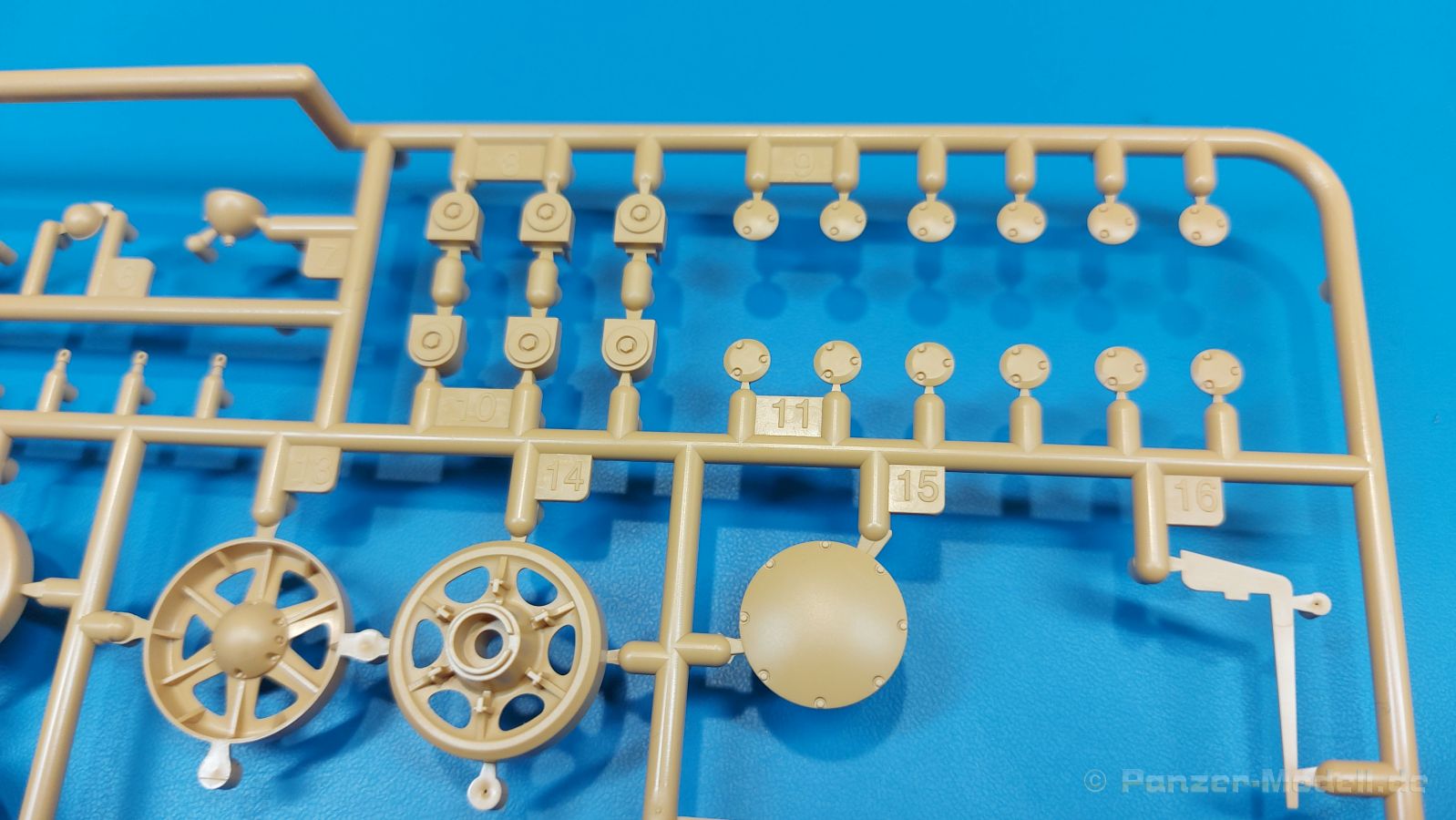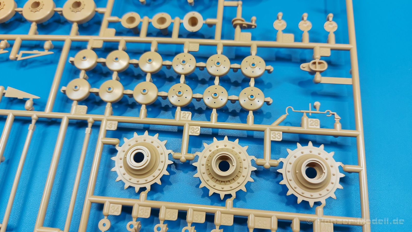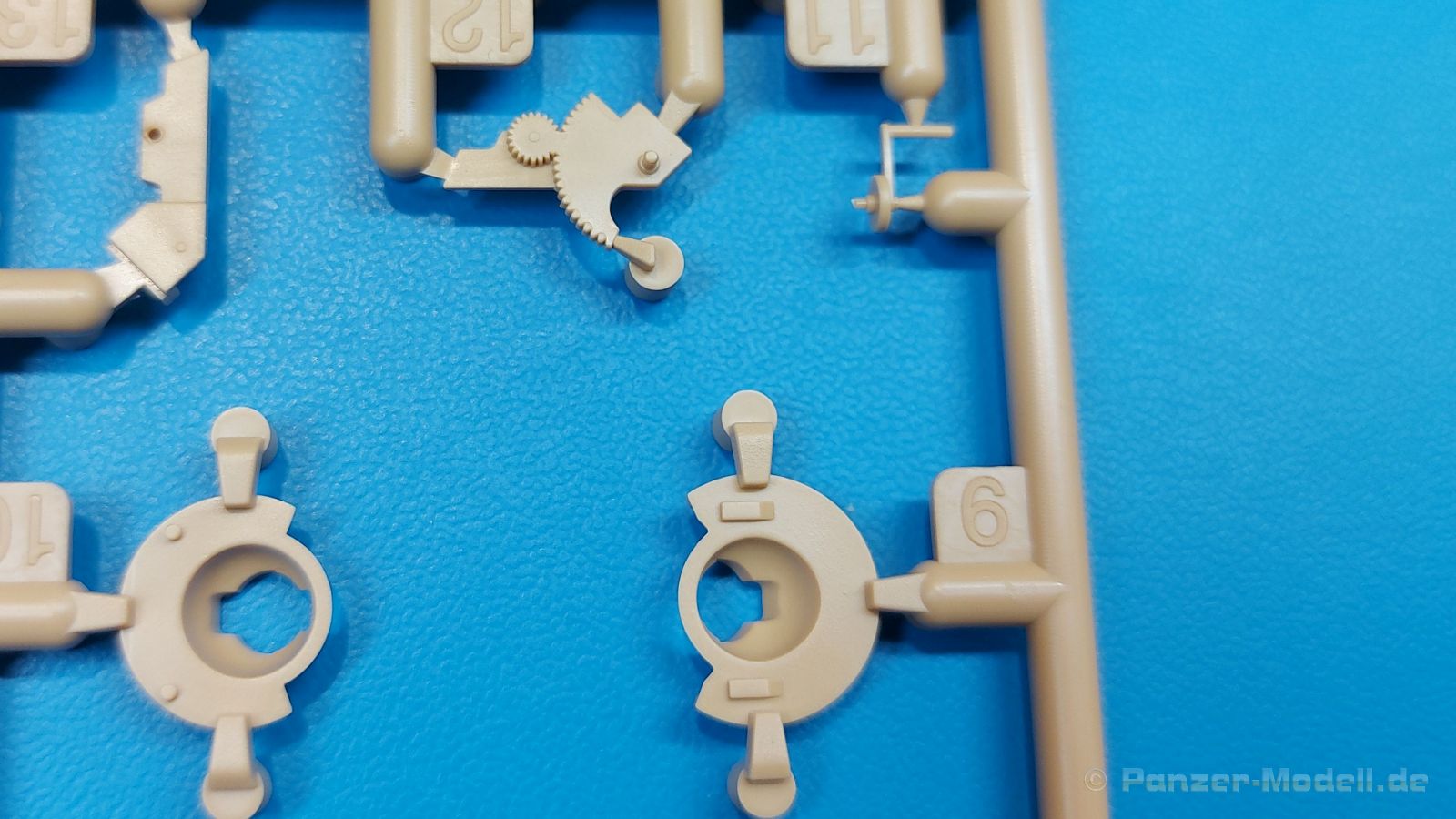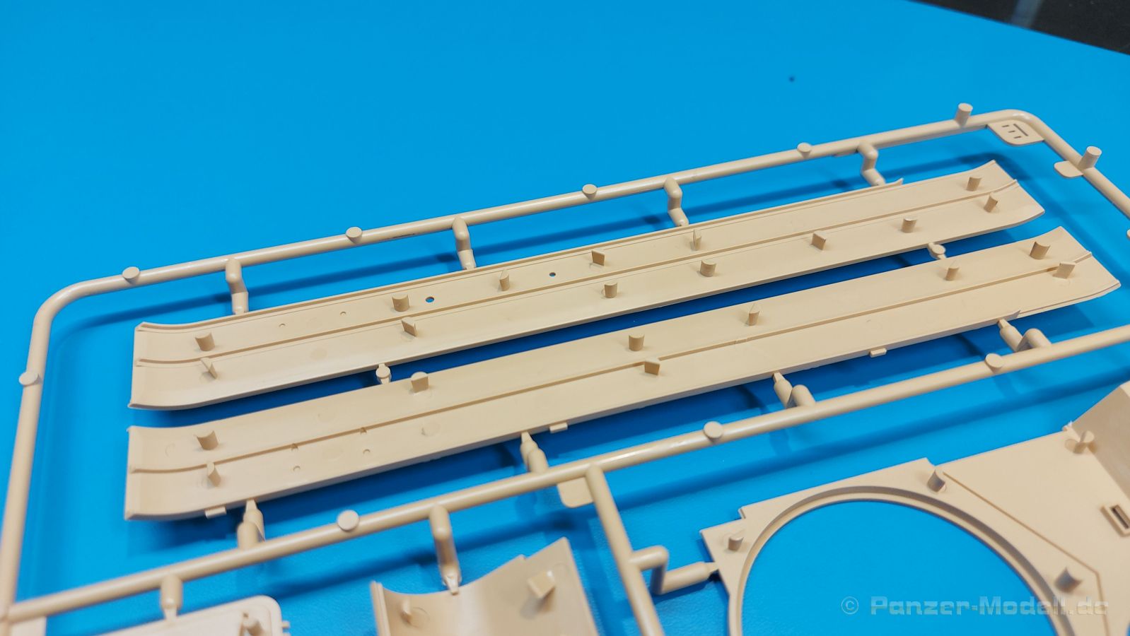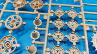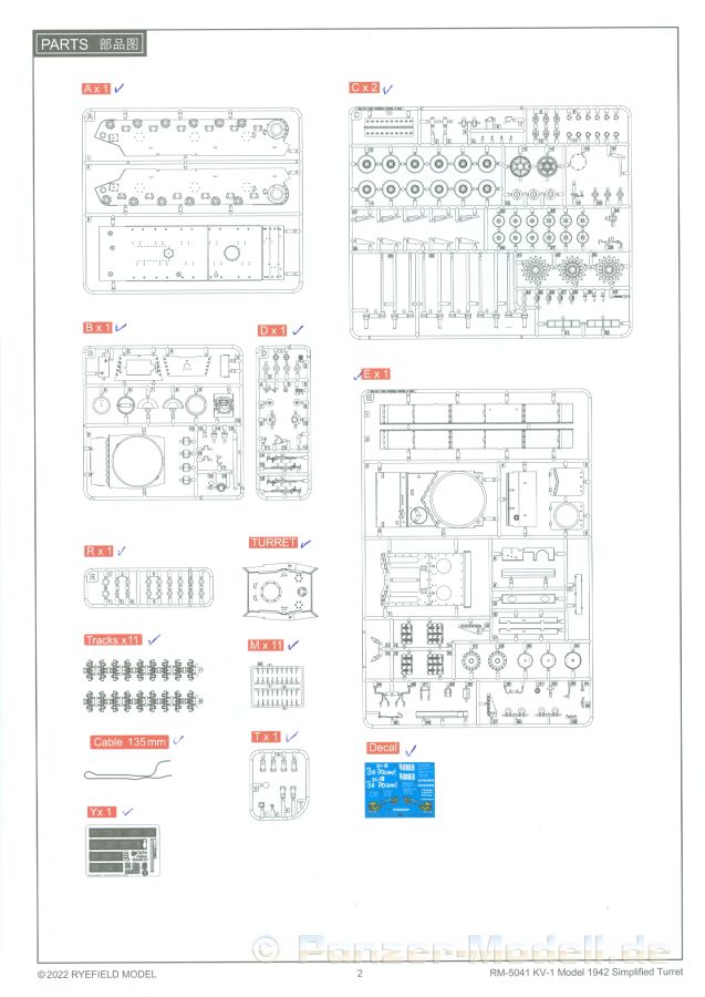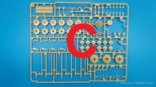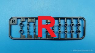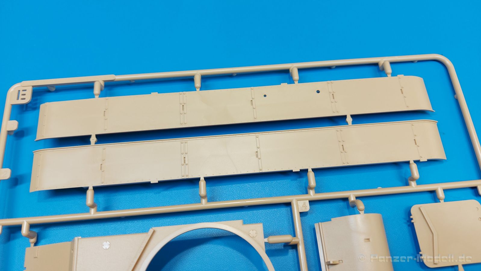 Der KV-1 (in deutscher Literatur auch oft KW-1 genannt) war ein sowjetischer, schwerer Panzer, bekannt durch seine dicke Panzerung und eine 76,2 mm Kanone. Er wurde parallel zum SMK entwickelt, der allerdings zwei Türme hatte. Elemente des SMK wurden in den KV-1 übernommen. Sowohl der SMK als auch der KV-1 wurden an der Front in Finnland erprobt. Darauf basierend entschied man sich für den KV-1. Es gab etliche Varianten, um erkannte Schwächen auszugleichen und den Kampfwert zu steigern. Der 5-Mann Besatzung standen eine 76,2 mm Kanone und 3 MG zum Kampf zur Verfügung. Bei einem Gewicht von über 43 Tonnen konnte der 404 kW (550 PS) Motor das Gefährt bis auf ca. 30 km/h beschleunigen. Mit seiner Panzerung von 35-90 mm stellte er für die damaligen deutschen Panzer eine echte Herausforderung dar und konnte auf übliche Kampfentfernung wirksam nur mit einen 8,8cm Flak bekämpft werden. Da er aber den aufkommenden Panthern und Tigern nicht mehr gewachsen war, wurde er nach und nach ab 1943 durch IS-1/IS-2 Panzer abgelöst. Der Bausatz: Rye Field Models wagt sich nun auch an den KV-1. Es gibt schon einige gute Modelle dieses Typs, aber schauen wir mal, ob man da eine Steigerung reinbringen konnte. Der weiße Stülpdeckelkarton ist 380 x 240 x 70 mm groß und zeigt an der einen Seite zwei farbige Seitenrisse mit unterschiedlichen Markierungen. An der anderen Seite sind Bauvarianten (mit offenen oder geschlossenen Luken, unterschiedliche Stützrollen etc.) und eine Darstellung der Drehstabfederung zu sehen. Das Deckelbild zeigt in groß den farbenfroheren Seitenriss des Panzers. Der Karton enthält sechs sandgelbe Spritzlinge, einen Klarsichtspritzling, einen schwarzen Vinylspritzling, ein Tütchen mit 22 silbergrauen Spritzlingen zu je 9 Kettengliedern, ein weiteres Tütchen mit 11 silbergrauen Spritzlingen mit Kettenbolzen, eine Fotoätzteil-Platine (PE), einen Bindfaden, ein kleines Decalblatt und die Bauanleitung. Die Spritzlinge sind einwandfrei, die Teile ohne Versatz oder Sinkstellen. Details sind scharf und gut herausgearbeitet. Es gibt einige sichtbare Auswerferspuren, aber sie befinden sich auf Innen- und Unterseiten von Teilen und können größtenteils ignoriert werden. Nur manche hervorstehende Auswerfermarken stören und müssen auf alle Fälle entfernt werden. Auch der Klarsichtspritzling ist sehr sauber ausgespritzt und kristallklar. Die Unterwanne setzt sich aus Bodenplatte, den Seitenwänden, sowie Heckwand und Bugplatten zusammen und weisen bereits angegossene, gute Details wie Verschraubungen und Wartungsdeckel auf. Grad an den Seitenwänden und dem Heck hat man dem Plastik eine gute, sogar fühlbare Walzstruktur mitgegeben. Saubere Ansatzkanten und Passstifte werden dabei helfen, die Wannenteile verzugsfrei zusammen zu bauen. Die Abschleppaugen vorn und hinten gibt es in zwei Varianten zur Wahl, mit einer runden und einer rombusförmigen Bodenplatte. Die dazugehörigen Schäkel haben innen gerundete Stifte, so dass man sie, ohne zu kleben auf die Augen aufklipsen kann. Vorn wird noch eine zusätzliche Panzerplatte aufgeklebt, bevor man die Schäkel anbringt, da die Platte über die volle Breite geht und die Löcher für die Augen beinhaltet. Die Das einzige Rücklicht besteht aus einem Klarsichtteil. Es bekommt noch einen Ring aus PE. Das Luftleitblech am Heck besteht aus dünnem Plastik, das dazugehörige Zuluftgitter aus fein strukturiertem PE. Schwingarme mit den Drehstäben werden einzeln eingesteckt. Jeweils der vorderste und hinterste Schwingarm haben angegossene Passnasen und werden fest eingebaut. Die anderen Schwingarme können ihrer Natur folgen und schwingend eingebaut werden, um die Federung zu simulieren, bzw. bei Einbau des Modells in ein unebenes Diorama die eingefederten Laufrollen darzustellen. Für die Schwingarmnaben gibt es alternative Deckel. Sechs Anschlagdämpfer pro Seite mit ihren Verschraubungen und Stützwinkeln sehen toll aus und liegen als Einzelteile bei. Die Laufrollen machen einen hervorragenden Eindruck mit Details auf beiden Seiten. In die Laufrollen werden Vinylmuffen eingelegt. So steckt man die Räder nur auf die Schwingarme und sie bleiben dadurch beweglich. Wie die Anschlagdämpfer werden die Stützrollenböcke einzeln angeklebt. An den Wannenseiten sind die sechs Schraubenlöcher dargestellt. Sollte man sich für einen beschädigten KV entschließen, kann man z.B. einen Stützrollenbock einfach weglassen und braucht nicht mal bohren. Bei den Stützrollen kann man zwischen gelochten und ungelochten Rollen wählen. Hier wird die Beweglichkeit über einen Bolzen erreicht, der mit dem Stützrollenbock verklebt wird und auf dem die Stützrolle rotieren kann. Sowohl Leitrollen als auch Antriebsräder sind mit Durchbrüchen, Verschraubungen und Stützwinkeln gut gelungen. Auch hier kommen für die Drehbarkeit Vinylmuffen zum Einsatz. Der Schmutzabstreifer, der beim Original den Dreck zwischen den Antriebszahnkränzen entfernt, besteht aus einem gut gelungenen Teil. Die Kettenspanner sind mehrteilig ausgeführt und werden beweglich angebaut, so dass man die Kettenspannung einstellen kann und sie erst festklebt, wenn man die Spannung entsprechend eingestellt hat. Das Gewinde der Spannstange sieht sehr gut aus. Die Einzelgliederketten bestehen aus Gliedern mit und ohne Führungszahn, die wechselweise zusammengesetzt werden. Die Detailierung ist gut, wenn auch ohne Gussnummern. Für den Zusammenbau der Ketten gibt es eine Kettenlehre, auf der man 10 Glieder zusammensteckt und mit den Bolzen verbindet. Die Bolzen sind bereits zu zehnt am Gussast und können somit gleichzeitig eingeführt, verklebt und dann vom Gussast abgetrennt werden. Die Löcher in den Gliedern sind sehr sauber, so dass der Zusammenbau problemlos vonstattengehen sollte. Pro Seite benötigt man 88 Glieder. Man hat also noch einen Teil als Reserve zur Verfügung. Die Kettenbleche des KV bestehen aus je einem langen Teil mit Details auf beiden Seiten. An der Unterseite ist 