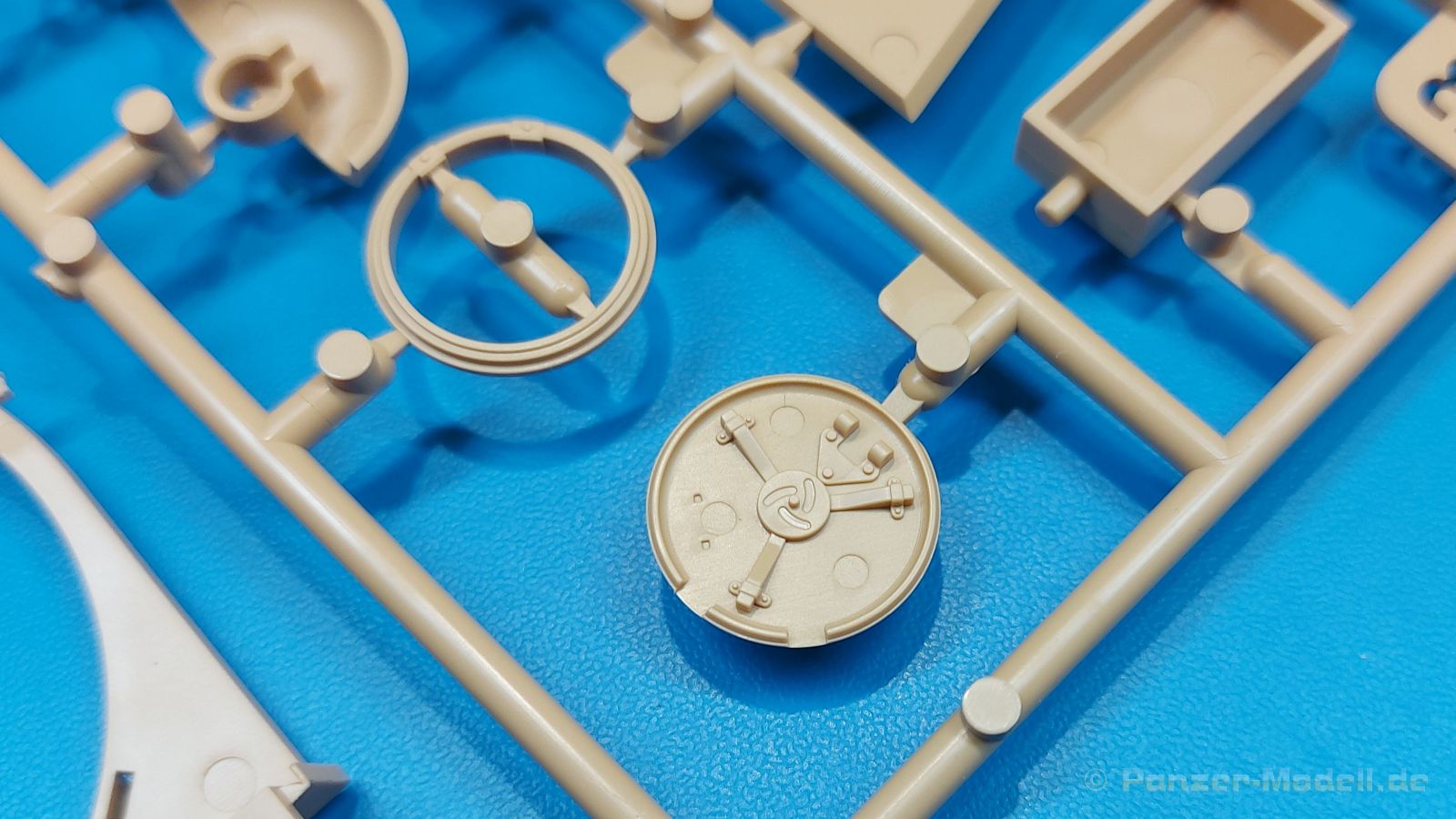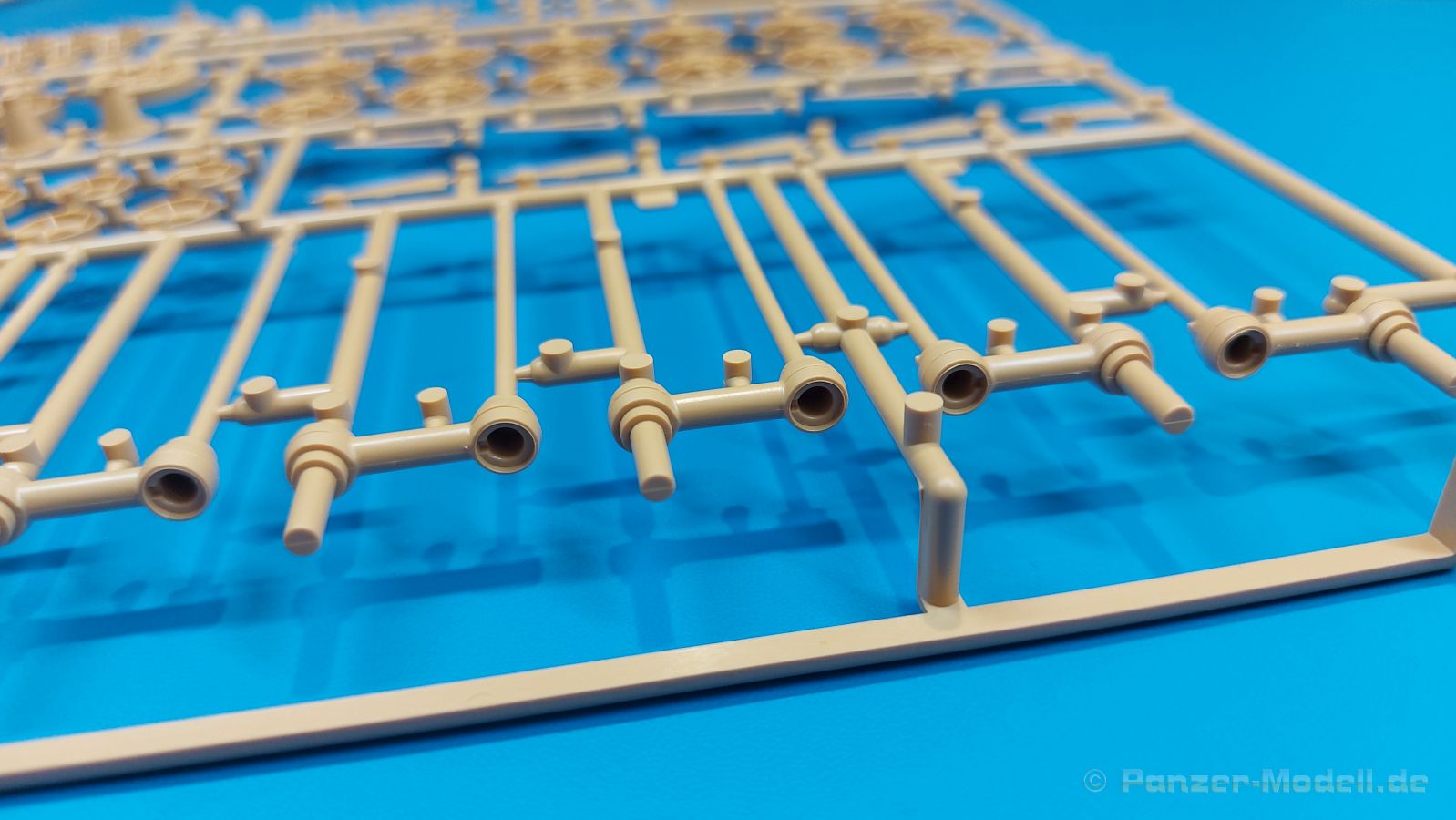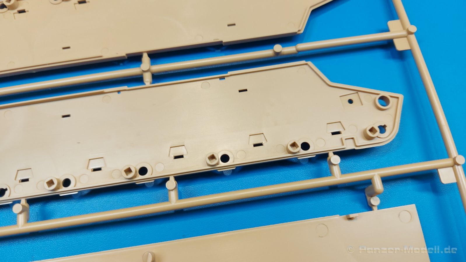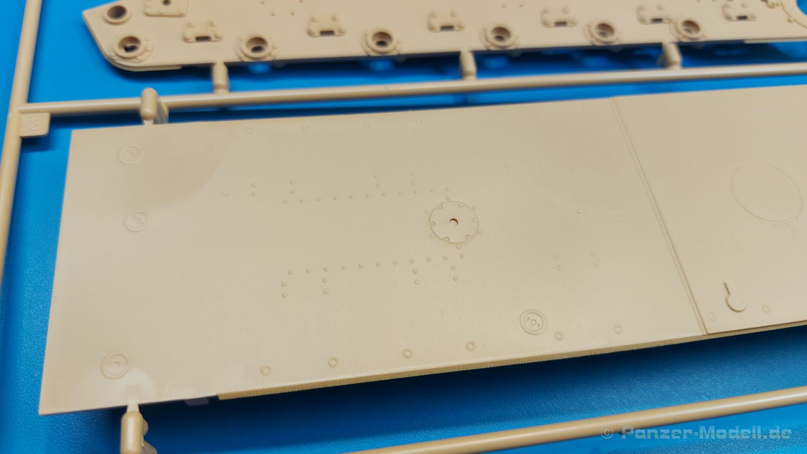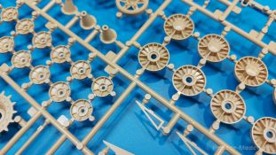 Der KV-1 (in deutscher Literatur auch oft KW-1 genannt) war ein sowjetischer, schwerer Panzer, bekannt durch seine dicke Panzerung und eine 76,2 mm Kanone. Er wurde parallel zum SMK entwickelt, der allerdings zwei Türme hatte. Elemente des SMK wurden in den KV-1 übernommen. Sowohl der SMK als auch der KV-1 wurden an der Front in Finnland erprobt. Darauf basierend entschied man sich für den KV-1. Es gab etliche Varianten, um erkannte Schwächen auszugleichen und den Kampfwert zu steigern. Der 5-Mann Besatzung standen eine 76,2 mm Kanone und 3 MG zum Kampf zur Verfügung. Bei einem Gewicht von über 43 Tonnen konnte der 404 kW (550 PS) Motor das Gefährt bis auf ca. 30 km/h beschleunigen. Mit seiner Panzerung von 35-90 mm stellte er für die damaligen deutschen Panzer eine echte Herausforderung dar und konnte auf übliche Kampfentfernung wirksam nur mit einen 8,8cm Flak bekämpft werden. Da er aber den aufkommenden Panthern und Tigern nicht mehr gewachsen war, wurde er nach und nach ab 1943 durch IS-1/IS-2 Panzer abgelöst. Der Bausatz: Rye Field Models wagt sich nun auch an den KV-1. Es gibt schon einige gute Modelle dieses Typs, aber schauen wir mal, ob man da eine Steigerung reinbringen konnte. Der weiße Stülpdeckelkarton ist 380 x 240 x 70 mm groß und zeigt an der einen Seite zwei farbige Seitenrisse mit unterschiedlichen Markierungen. An der anderen Seite sind Bauvarianten (mit offenen oder geschlossenen Luken, unterschiedliche Stützrollen etc.) und eine Darstellung der Drehstabfederung zu sehen. Das Deckelbild zeigt in groß den farbenfroheren Seitenriss des Panzers. Der Karton enthält sechs sandgelbe Spritzlinge, einen Klarsichtspritzling, einen schwarzen Vinylspritzling, ein Tütchen mit 22 silbergrauen Spritzlingen zu je 9 Kettengliedern, ein weiteres Tütchen mit 11 silbergrauen Spritzlingen mit Kettenbolzen, eine Fotoätzteil-Platine (PE), einen Bindfaden, ein kleines Decalblatt und die Bauanleitung. Die Spritzlinge sind einwandfrei, die Teile ohne Versatz oder Sinkstellen. Details sind scharf und gut herausgearbeitet. Es gibt einige sichtbare Auswerferspuren, aber sie befinden sich auf Innen- und Unterseiten von Teilen und können größtenteils ignoriert werden. Nur manche hervorstehende Auswerfermarken stören und müssen auf alle Fälle entfernt werden. Auch der Klarsichtspritzling ist sehr sauber ausgespritzt und kristallklar. Die Unterwanne setzt sich aus Bodenplatte, den Seitenwänden, sowie Heckwand und Bugplatten zusammen und weisen bereits angegossene, gute Details wie Verschraubungen und Wartungsdeckel auf. Grad an den Seitenwänden und dem Heck hat man dem Plastik eine gute, sogar fühlbare Walzstruktur mitgegeben. Saubere Ansatzkanten und Passstifte werden dabei helfen, die Wannenteile verzugsfrei zusammen zu bauen. Die Abschleppaugen vorn und hinten gibt es in zwei Varianten zur Wahl, mit einer runden und einer rombusförmigen Bodenplatte. Die dazugehörigen Schäkel haben innen gerundete Stifte, so dass man sie, ohne zu kleben auf die Augen aufklipsen kann. Vorn wird noch eine zusätzliche Panzerplatte aufgeklebt, bevor man die Schäkel anbringt, da die Platte über die volle Breite geht und die Löcher für die Augen beinhaltet. Die Das einzige Rücklicht besteht aus einem Klarsichtteil. Es bekommt noch einen Ring aus PE. Das Luftleitblech am Heck besteht aus dünnem Plastik, das dazugehörige Zuluftgitter aus fein strukturiertem PE. Schwingarme mit den Drehstäben werden einzeln eingesteckt. Jeweils der vorderste und hinterste Schwingarm haben angegossene Passnasen und werden fest eingebaut. Die anderen Schwingarme können ihrer Natur folgen und schwingend eingebaut werden, um die Federung zu simulieren, bzw. bei Einbau des Modells in ein unebenes Diorama die eingefederten Laufrollen darzustellen. Für die Schwingarmnaben gibt es alternative Deckel. Sechs Anschlagdämpfer pro Seite mit ihren Verschraubungen und Stützwinkeln sehen toll aus und liegen als Einzelteile bei. Die Laufrollen machen einen hervorragenden Eindruck mit Details auf beiden Seiten. In die Laufrollen werden Vinylmuffen eingelegt. So steckt man die Räder nur auf die Schwingarme und sie bleiben dadurch beweglich. Wie die Anschlagdämpfer werden die Stützrollenböcke einzeln angeklebt. An den Wannenseiten sind die sechs Schraubenlöcher dargestellt. Sollte man sich für einen beschädigten KV entschließen, kann man z.B. einen Stützrollenbock einfach weglassen und braucht nicht mal bohren. Bei den Stützrollen kann man zwischen gelochten und ungelochten Rollen wählen. Hier wird die Beweglichkeit über einen Bolzen erreicht, der mit dem Stützrollenbock verklebt wird und auf dem die Stützrolle rotieren kann. Sowohl Leitrollen als auch Antriebsräder sind mit Durchbrüchen, Verschraubungen und Stützwinkeln gut gelungen. Auch hier kommen für die Drehbarkeit Vinylmuffen zum Einsatz. Der Schmutzabstreifer, der beim Original den Dreck zwischen den Antriebszahnkränzen entfernt, besteht aus einem gut gelungenen Teil. Die Kettenspanner sind mehrteilig ausgeführt und werden beweglich angebaut, so dass man die Kettenspannung einstellen kann und sie erst festklebt, wenn man die Spannung entsprechend eingestellt hat. Das Gewinde der Spannstange sieht sehr gut aus. Die Einzelgliederketten bestehen aus Gliedern mit und ohne Führungszahn, die wechselweise zusammengesetzt werden. Die Detailierung ist gut, wenn auch ohne Gussnummern. Für den Zusammenbau der Ketten gibt es eine Kettenlehre, auf der man 10 Glieder zusammensteckt und mit den Bolzen verbindet. Die Bolzen sind bereits zu zehnt am Gussast und können somit gleichzeitig eingeführt, verklebt und dann vom Gussast abgetrennt werden. Die Löcher in den Gliedern sind sehr sauber, so dass der Zusammenbau problemlos vonstattengehen sollte. Pro Seite benötigt man 88 Glieder. Man hat also noch einen Teil als Reserve zur Verfügung. Die Kettenbleche des KV bestehen aus je einem langen Teil mit Details auf beiden Seiten. An der Unterseite ist 