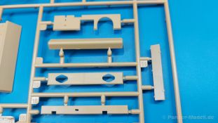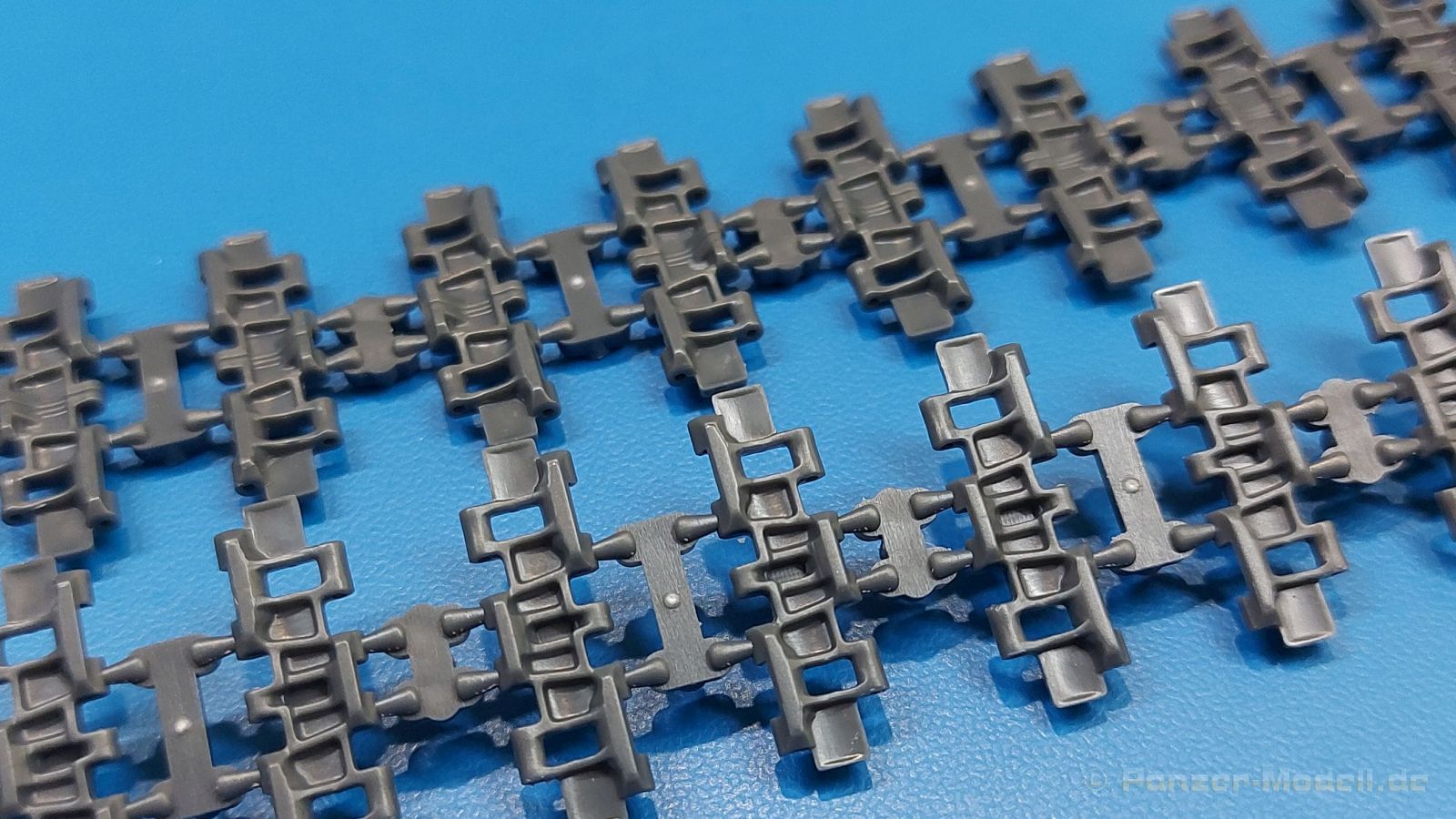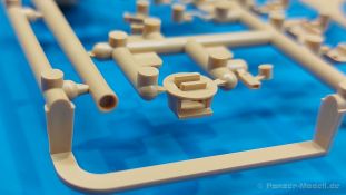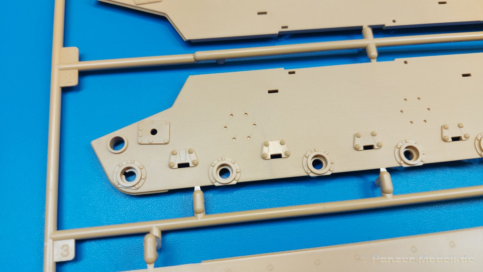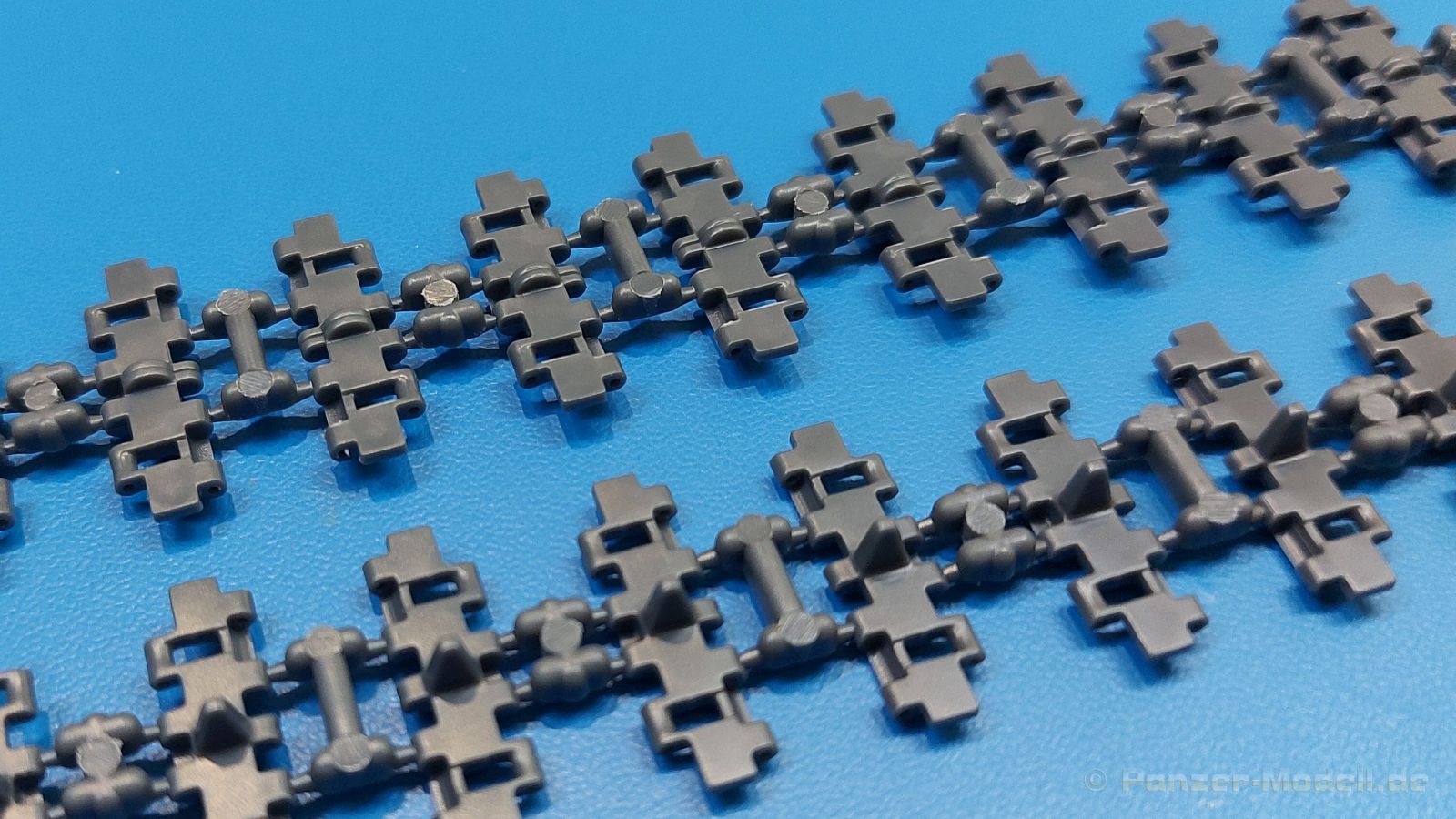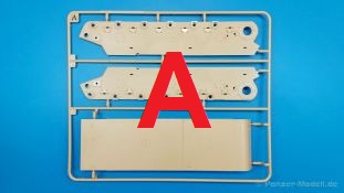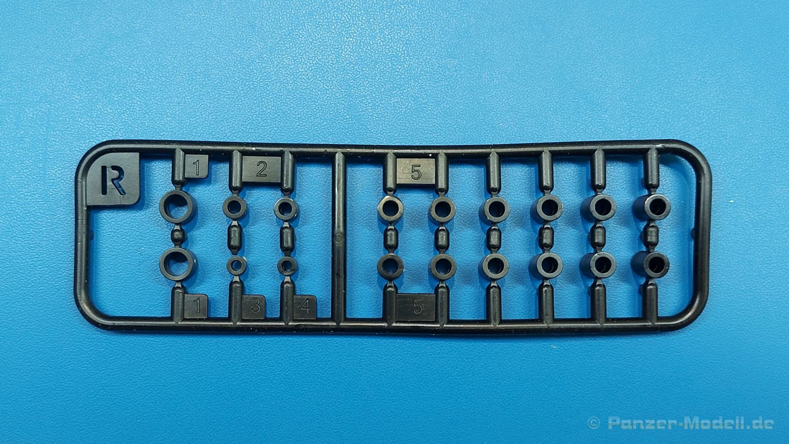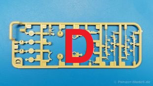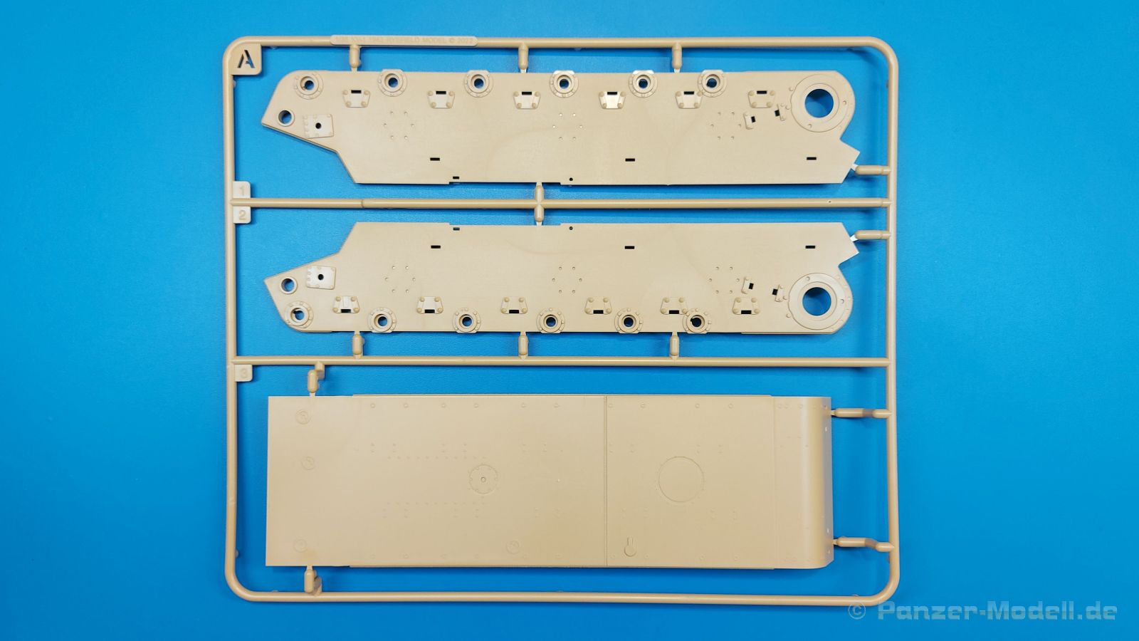 Der KV-1 (in deutscher Literatur auch oft KW-1 genannt) war ein sowjetischer, schwerer Panzer, bekannt durch seine dicke Panzerung und eine 76,2 mm Kanone. Er wurde parallel zum SMK entwickelt, der allerdings zwei Türme hatte. Elemente des SMK wurden in den KV-1 übernommen. Sowohl der SMK als auch der KV-1 wurden an der Front in Finnland erprobt. Darauf basierend entschied man sich für den KV-1. Es gab etliche Varianten, um erkannte Schwächen auszugleichen und den Kampfwert zu steigern. Der 5-Mann Besatzung standen eine 76,2 mm Kanone und 3 MG zum Kampf zur Verfügung. Bei einem Gewicht von über 43 Tonnen konnte der 404 kW (550 PS) Motor das Gefährt bis auf ca. 30 km/h beschleunigen. Mit seiner Panzerung von 35-90 mm stellte er für die damaligen deutschen Panzer eine echte Herausforderung dar und konnte auf übliche Kampfentfernung wirksam nur mit einen 8,8cm Flak bekämpft werden. Da er aber den aufkommenden Panthern und Tigern nicht mehr gewachsen war, wurde er nach und nach ab 1943 durch IS-1/IS-2 Panzer abgelöst. Der Bausatz: Rye Field Models wagt sich nun auch an den KV-1. Es gibt schon einige gute Modelle dieses Typs, aber schauen wir mal, ob man da eine Steigerung reinbringen konnte. Der weiße Stülpdeckelkarton ist 380 x 240 x 70 mm groß und zeigt an der einen Seite zwei farbige Seitenrisse mit unterschiedlichen Markierungen. An der anderen Seite sind Bauvarianten (mit offenen oder geschlossenen Luken, unterschiedliche Stützrollen etc.) und eine Darstellung der Drehstabfederung zu sehen. Das Deckelbild zeigt in groß den farbenfroheren Seitenriss des Panzers. Der Karton enthält sechs sandgelbe Spritzlinge, einen Klarsichtspritzling, einen schwarzen Vinylspritzling, ein Tütchen mit 22 silbergrauen Spritzlingen zu je 9 Kettengliedern, ein weiteres Tütchen mit 11 silbergrauen Spritzlingen mit Kettenbolzen, eine Fotoätzteil-Platine (PE), einen Bindfaden, ein kleines Decalblatt und die Bauanleitung. Die Spritzlinge sind einwandfrei, die Teile ohne Versatz oder Sinkstellen. Details sind scharf und gut herausgearbeitet. Es gibt einige sichtbare Auswerferspuren, aber sie befinden sich auf Innen- und Unterseiten von Teilen und können größtenteils ignoriert werden. Nur manche hervorstehende Auswerfermarken stören und müssen auf alle Fälle entfernt werden. Auch der Klarsichtspritzling ist sehr sauber ausgespritzt und kristallklar. Die Unterwanne setzt sich aus Bodenplatte, den Seitenwänden, sowie Heckwand und Bugplatten zusammen und weisen bereits angegossene, gute Details wie Verschraubungen und Wartungsdeckel auf. Grad an den Seitenwänden und dem Heck hat man dem Plastik eine gute, sogar fühlbare Walzstruktur mitgegeben. Saubere Ansatzkanten und Passstifte werden dabei helfen, die Wannenteile verzugsfrei zusammen zu bauen. Die Abschleppaugen vorn und hinten gibt es in zwei Varianten zur Wahl, mit einer runden und einer rombusförmigen Bodenplatte. Die dazugehörigen Schäkel haben innen gerundete Stifte, so dass man sie, ohne zu kleben auf die Augen aufklipsen kann. Vorn wird noch eine zusätzliche Panzerplatte aufgeklebt, bevor man die Schäkel anbringt, da die Platte über die volle Breite geht und die Löcher für die Augen beinhaltet. Die Das einzige Rücklicht besteht aus einem Klarsichtteil. Es bekommt noch einen Ring aus PE. Das Luftleitblech am Heck besteht aus dünnem Plastik, das dazugehörige Zuluftgitter aus fein strukturiertem PE. Schwingarme mit den Drehstäben werden einzeln eingesteckt. Jeweils der vorderste und hinterste Schwingarm haben angegossene Passnasen und werden fest eingebaut. Die anderen Schwingarme können ihrer Natur folgen und schwingend eingebaut werden, um die Federung zu simulieren, bzw. bei Einbau des Modells in ein unebenes Diorama die eingefederten Laufrollen darzustellen. Für die Schwingarmnaben gibt es alternative Deckel. Sechs Anschlagdämpfer pro Seite mit ihren Verschraubungen und Stützwinkeln sehen toll aus und liegen als Einzelteile bei. Die Laufrollen machen einen hervorragenden Eindruck mit Details auf beiden Seiten. In die Laufrollen werden Vinylmuffen eingelegt. So steckt man die Räder nur auf die Schwingarme und sie bleiben dadurch beweglich. Wie die Anschlagdämpfer werden die Stützrollenböcke einzeln angeklebt. An den Wannenseiten sind die sechs Schraubenlöcher dargestellt. Sollte man sich für einen beschädigten KV entschließen, kann man z.B. einen Stützrollenbock einfach weglassen und braucht nicht mal bohren. Bei den Stützrollen kann man zwischen gelochten und ungelochten Rollen wählen. Hier wird die Beweglichkeit über einen Bolzen erreicht, der mit dem Stützrollenbock verklebt wird und auf dem die Stützrolle rotieren kann. Sowohl Leitrollen als auch Antriebsräder sind mit Durchbrüchen, Verschraubungen und Stützwinkeln gut gelungen. Auch hier kommen für die Drehbarkeit Vinylmuffen zum Einsatz. Der Schmutzabstreifer, der beim Original den Dreck zwischen den Antriebszahnkränzen entfernt, besteht aus einem gut gelungenen Teil. Die Kettenspanner sind mehrteilig ausgeführt und werden beweglich angebaut, so dass man die Kettenspannung einstellen kann und sie erst festklebt, wenn man die Spannung entsprechend eingestellt hat. Das Gewinde der Spannstange sieht sehr gut aus. Die Einzelgliederketten bestehen aus Gliedern mit und ohne Führungszahn, die wechselweise zusammengesetzt werden. Die Detailierung ist gut, wenn auch ohne Gussnummern. Für den Zusammenbau der Ketten gibt es eine Kettenlehre, auf der man 10 Glieder zusammensteckt und mit den Bolzen verbindet. Die Bolzen sind bereits zu zehnt am Gussast und können somit gleichzeitig eingeführt, verklebt und dann vom Gussast abgetrennt werden. Die Löcher in den Gliedern sind sehr sauber, so dass der Zusammenbau problemlos vonstattengehen sollte. Pro Seite benötigt man 88 Glieder. Man hat also noch einen Teil als Reserve zur Verfügung. Die Kettenbleche des KV bestehen aus je einem langen Teil mit Details auf beiden Seiten. An der Unterseite ist 