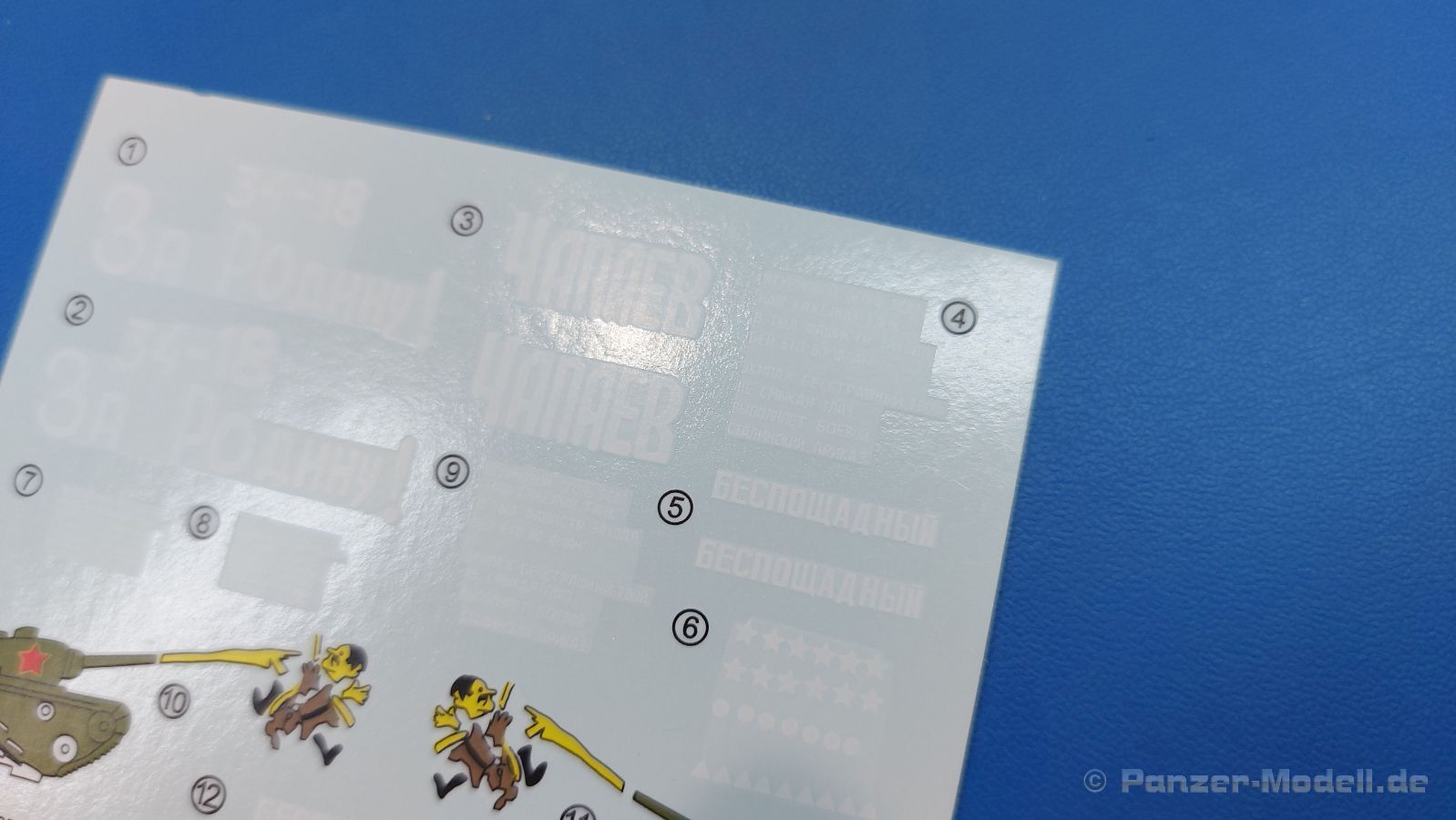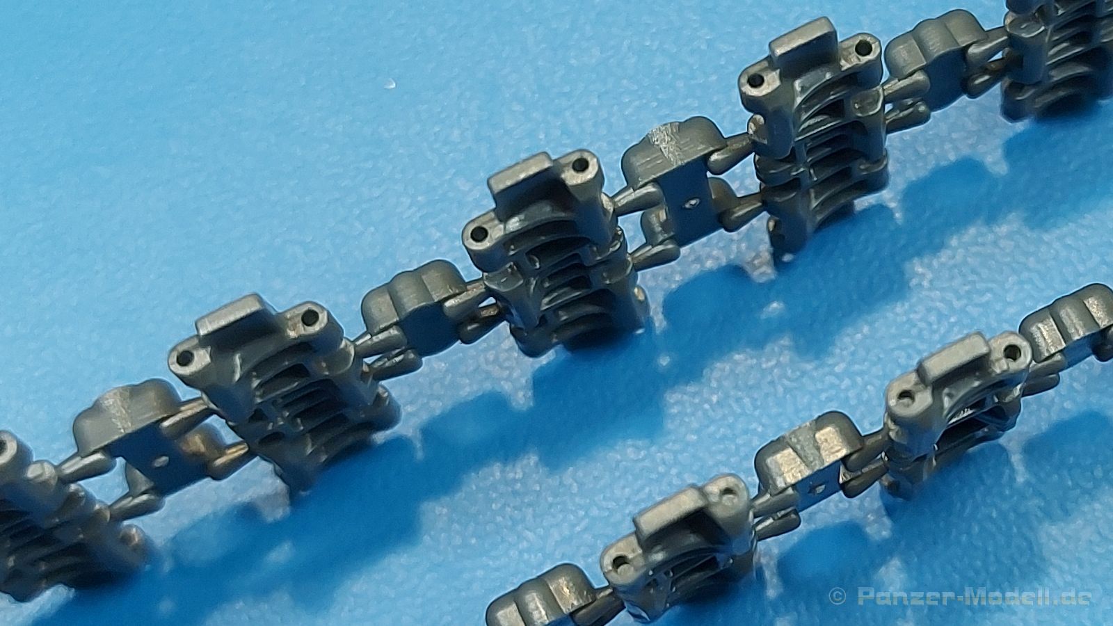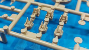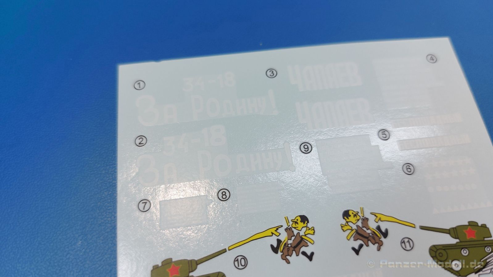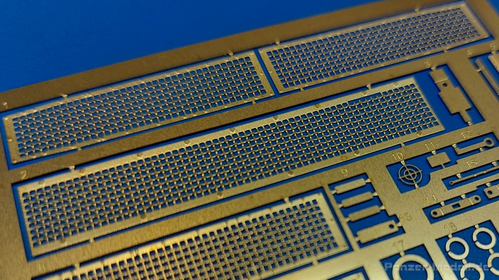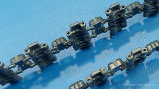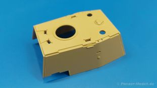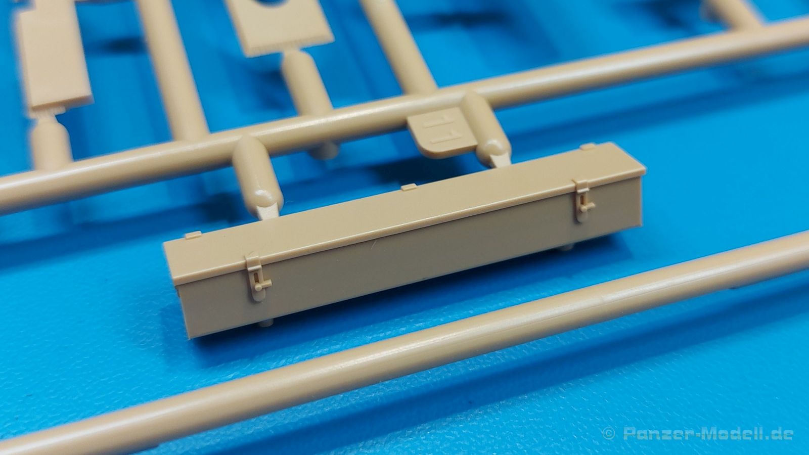 Der KV-1 (in deutscher Literatur auch oft KW-1 genannt) war ein sowjetischer, schwerer Panzer, bekannt durch seine dicke Panzerung und eine 76,2 mm Kanone. Er wurde parallel zum SMK entwickelt, der allerdings zwei Türme hatte. Elemente des SMK wurden in den KV-1 übernommen. Sowohl der SMK als auch der KV-1 wurden an der Front in Finnland erprobt. Darauf basierend entschied man sich für den KV-1. Es gab etliche Varianten, um erkannte Schwächen auszugleichen und den Kampfwert zu steigern. Der 5-Mann Besatzung standen eine 76,2 mm Kanone und 3 MG zum Kampf zur Verfügung. Bei einem Gewicht von über 43 Tonnen konnte der 404 kW (550 PS) Motor das Gefährt bis auf ca. 30 km/h beschleunigen. Mit seiner Panzerung von 35-90 mm stellte er für die damaligen deutschen Panzer eine echte Herausforderung dar und konnte auf übliche Kampfentfernung wirksam nur mit einen 8,8cm Flak bekämpft werden. Da er aber den aufkommenden Panthern und Tigern nicht mehr gewachsen war, wurde er nach und nach ab 1943 durch IS-1/IS-2 Panzer abgelöst. Der Bausatz: Rye Field Models wagt sich nun auch an den KV-1. Es gibt schon einige gute Modelle dieses Typs, aber schauen wir mal, ob man da eine Steigerung reinbringen konnte. Der weiße Stülpdeckelkarton ist 380 x 240 x 70 mm groß und zeigt an der einen Seite zwei farbige Seitenrisse mit unterschiedlichen Markierungen. An der anderen Seite sind Bauvarianten (mit offenen oder geschlossenen Luken, unterschiedliche Stützrollen etc.) und eine Darstellung der Drehstabfederung zu sehen. Das Deckelbild zeigt in groß den farbenfroheren Seitenriss des Panzers. Der Karton enthält sechs sandgelbe Spritzlinge, einen Klarsichtspritzling, einen schwarzen Vinylspritzling, ein Tütchen mit 22 silbergrauen Spritzlingen zu je 9 Kettengliedern, ein weiteres Tütchen mit 11 silbergrauen Spritzlingen mit Kettenbolzen, eine Fotoätzteil-Platine (PE), einen Bindfaden, ein kleines Decalblatt und die Bauanleitung. Die Spritzlinge sind einwandfrei, die Teile ohne Versatz oder Sinkstellen. Details sind scharf und gut herausgearbeitet. Es gibt einige sichtbare Auswerferspuren, aber sie befinden sich auf Innen- und Unterseiten von Teilen und können größtenteils ignoriert werden. Nur manche hervorstehende Auswerfermarken stören und müssen auf alle Fälle entfernt werden. Auch der Klarsichtspritzling ist sehr sauber ausgespritzt und kristallklar. Die Unterwanne setzt sich aus Bodenplatte, den Seitenwänden, sowie Heckwand und Bugplatten zusammen und weisen bereits angegossene, gute Details wie Verschraubungen und Wartungsdeckel auf. Grad an den Seitenwänden und dem Heck hat man dem Plastik eine gute, sogar fühlbare Walzstruktur mitgegeben. Saubere Ansatzkanten und Passstifte werden dabei helfen, die Wannenteile verzugsfrei zusammen zu bauen. Die Abschleppaugen vorn und hinten gibt es in zwei Varianten zur Wahl, mit einer runden und einer rombusförmigen Bodenplatte. Die dazugehörigen Schäkel haben innen gerundete Stifte, so dass man sie, ohne zu kleben auf die Augen aufklipsen kann. Vorn wird noch eine zusätzliche Panzerplatte aufgeklebt, bevor man die Schäkel anbringt, da die Platte über die volle Breite geht und die Löcher für die Augen beinhaltet. Die Das einzige Rücklicht besteht aus einem Klarsichtteil. Es bekommt noch einen Ring aus PE. Das Luftleitblech am Heck besteht aus dünnem Plastik, das dazugehörige Zuluftgitter aus fein strukturiertem PE. Schwingarme mit den Drehstäben werden einzeln eingesteckt. Jeweils der vorderste und hinterste Schwingarm haben angegossene Passnasen und werden fest eingebaut. Die anderen Schwingarme können ihrer Natur folgen und schwingend eingebaut werden, um die Federung zu simulieren, bzw. bei Einbau des Modells in ein unebenes Diorama die eingefederten Laufrollen darzustellen. Für die Schwingarmnaben gibt es alternative Deckel. Sechs Anschlagdämpfer pro Seite mit ihren Verschraubungen und Stützwinkeln sehen toll aus und liegen als Einzelteile bei. Die Laufrollen machen einen hervorragenden Eindruck mit Details auf beiden Seiten. In die Laufrollen werden Vinylmuffen eingelegt. So steckt man die Räder nur auf die Schwingarme und sie bleiben dadurch beweglich. Wie die Anschlagdämpfer werden die Stützrollenböcke einzeln angeklebt. An den Wannenseiten sind die sechs Schraubenlöcher dargestellt. Sollte man sich für einen beschädigten KV entschließen, kann man z.B. einen Stützrollenbock einfach weglassen und braucht nicht mal bohren. Bei den Stützrollen kann man zwischen gelochten und ungelochten Rollen wählen. Hier wird die Beweglichkeit über einen Bolzen erreicht, der mit dem Stützrollenbock verklebt wird und auf dem die Stützrolle rotieren kann. Sowohl Leitrollen als auch Antriebsräder sind mit Durchbrüchen, Verschraubungen und Stützwinkeln gut gelungen. Auch hier kommen für die Drehbarkeit Vinylmuffen zum Einsatz. Der Schmutzabstreifer, der beim Original den Dreck zwischen den Antriebszahnkränzen entfernt, besteht aus einem gut gelungenen Teil. Die Kettenspanner sind mehrteilig ausgeführt und werden beweglich angebaut, so dass man die Kettenspannung einstellen kann und sie erst festklebt, wenn man die Spannung entsprechend eingestellt hat. Das Gewinde der Spannstange sieht sehr gut aus. Die Einzelgliederketten bestehen aus Gliedern mit und ohne Führungszahn, die wechselweise zusammengesetzt werden. Die Detailierung ist gut, wenn auch ohne Gussnummern. Für den Zusammenbau der Ketten gibt es eine Kettenlehre, auf der man 10 Glieder zusammensteckt und mit den Bolzen verbindet. Die Bolzen sind bereits zu zehnt am Gussast und können somit gleichzeitig eingeführt, verklebt und dann vom Gussast abgetrennt werden. Die Löcher in den Gliedern sind sehr sauber, so dass der Zusammenbau problemlos vonstattengehen sollte. Pro Seite benötigt man 88 Glieder. Man hat also noch einen Teil als Reserve zur Verfügung. Die Kettenbleche des KV bestehen aus je einem langen Teil mit Details auf beiden Seiten. An der Unterseite ist 