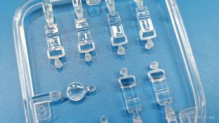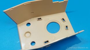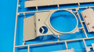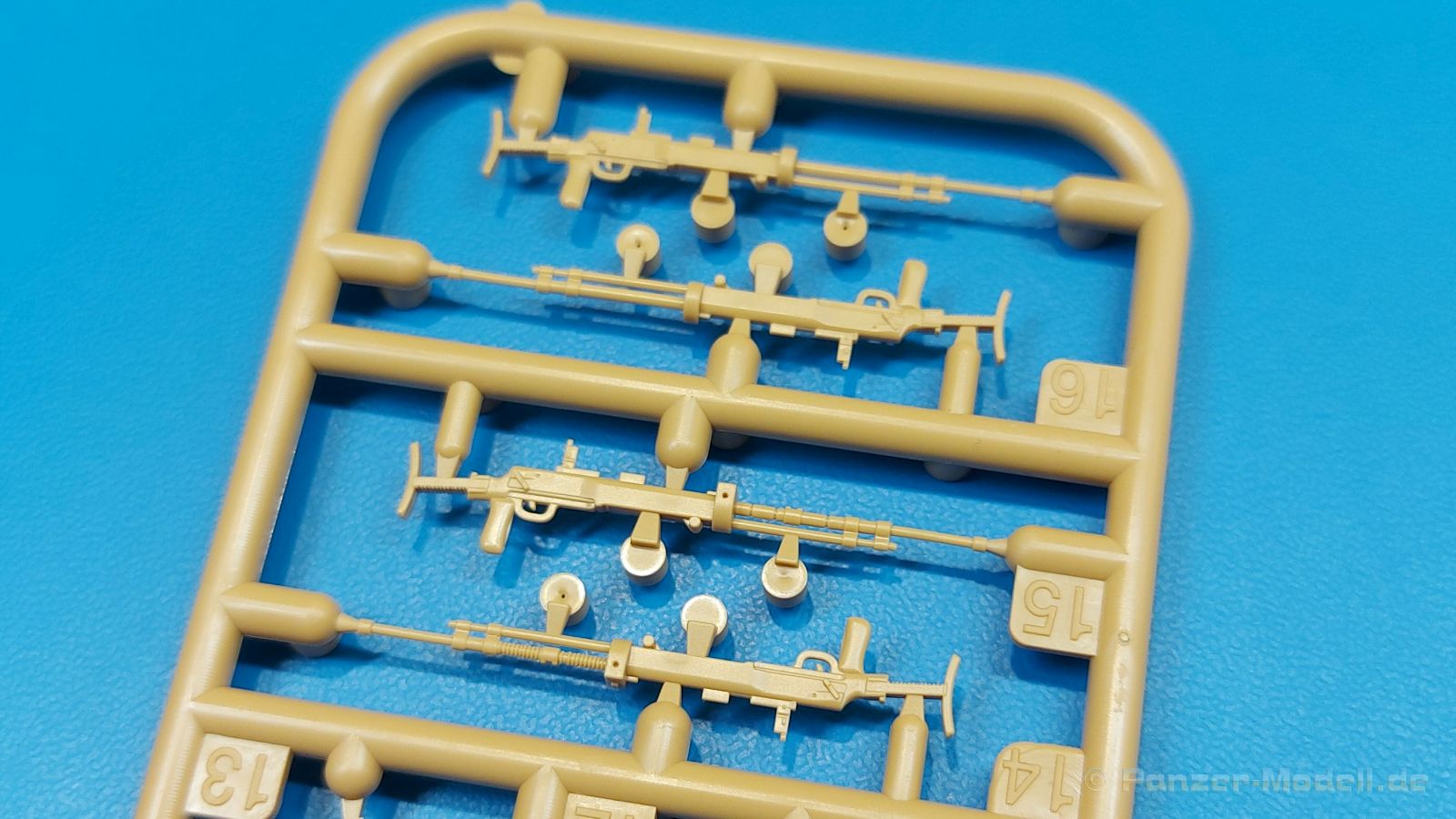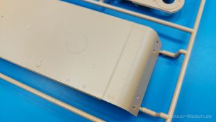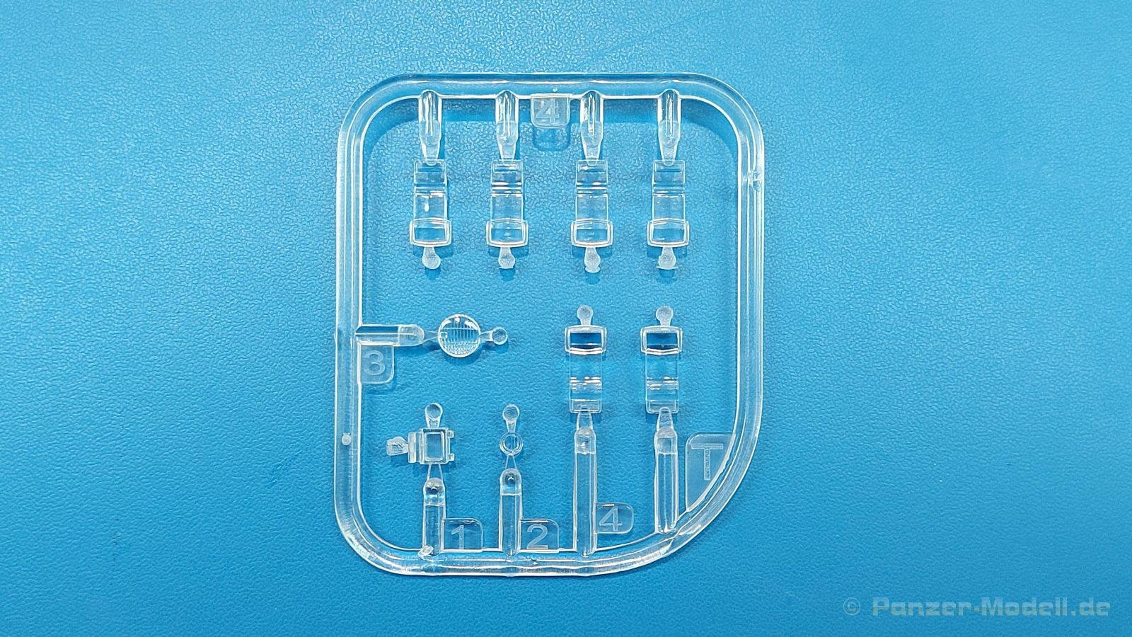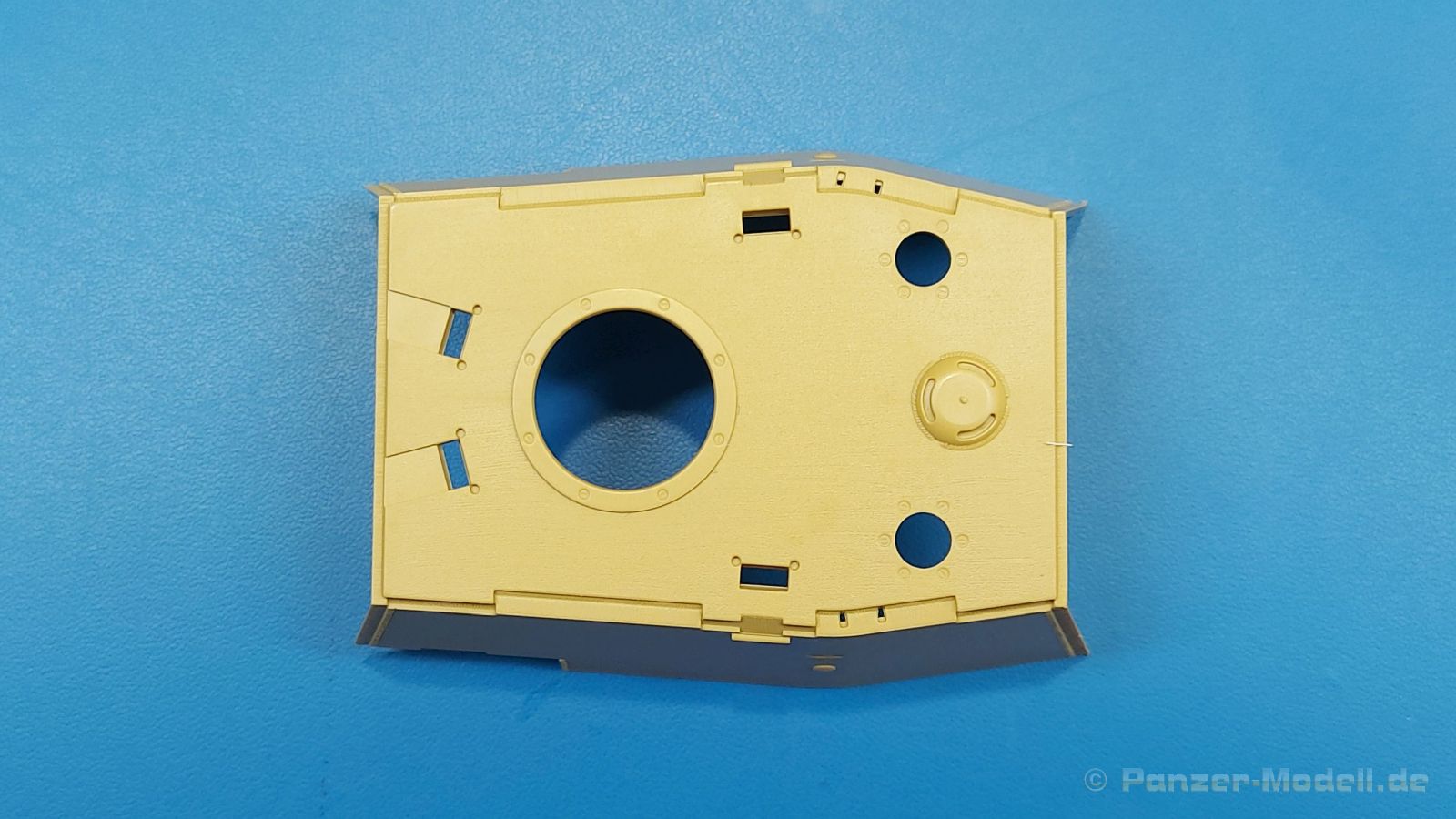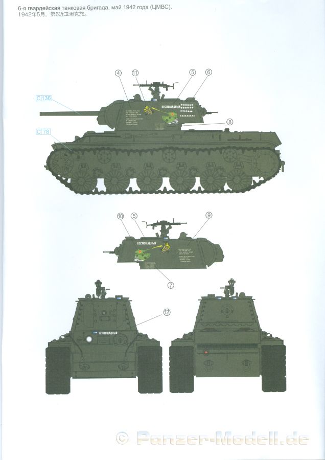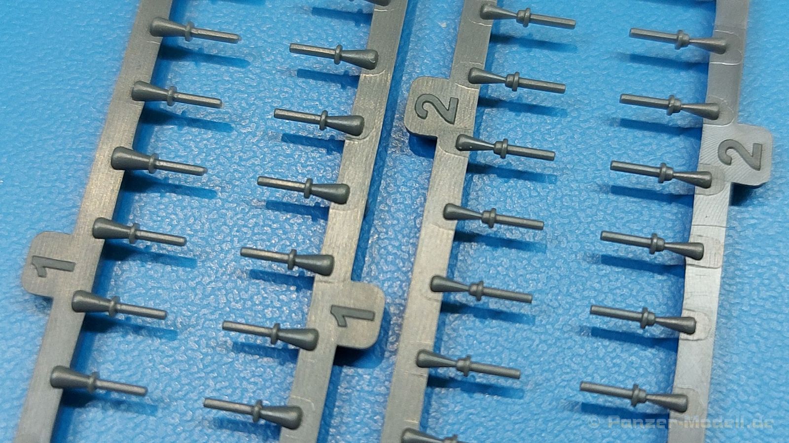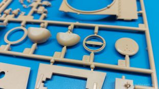 Der KV-1 (in deutscher Literatur auch oft KW-1 genannt) war ein sowjetischer, schwerer Panzer, bekannt durch seine dicke Panzerung und eine 76,2 mm Kanone. Er wurde parallel zum SMK entwickelt, der allerdings zwei Türme hatte. Elemente des SMK wurden in den KV-1 übernommen. Sowohl der SMK als auch der KV-1 wurden an der Front in Finnland erprobt. Darauf basierend entschied man sich für den KV-1. Es gab etliche Varianten, um erkannte Schwächen auszugleichen und den Kampfwert zu steigern. Der 5-Mann Besatzung standen eine 76,2 mm Kanone und 3 MG zum Kampf zur Verfügung. Bei einem Gewicht von über 43 Tonnen konnte der 404 kW (550 PS) Motor das Gefährt bis auf ca. 30 km/h beschleunigen. Mit seiner Panzerung von 35-90 mm stellte er für die damaligen deutschen Panzer eine echte Herausforderung dar und konnte auf übliche Kampfentfernung wirksam nur mit einen 8,8cm Flak bekämpft werden. Da er aber den aufkommenden Panthern und Tigern nicht mehr gewachsen war, wurde er nach und nach ab 1943 durch IS-1/IS-2 Panzer abgelöst. Der Bausatz: Rye Field Models wagt sich nun auch an den KV-1. Es gibt schon einige gute Modelle dieses Typs, aber schauen wir mal, ob man da eine Steigerung reinbringen konnte. Der weiße Stülpdeckelkarton ist 380 x 240 x 70 mm groß und zeigt an der einen Seite zwei farbige Seitenrisse mit unterschiedlichen Markierungen. An der anderen Seite sind Bauvarianten (mit offenen oder geschlossenen Luken, unterschiedliche Stützrollen etc.) und eine Darstellung der Drehstabfederung zu sehen. Das Deckelbild zeigt in groß den farbenfroheren Seitenriss des Panzers. Der Karton enthält sechs sandgelbe Spritzlinge, einen Klarsichtspritzling, einen schwarzen Vinylspritzling, ein Tütchen mit 22 silbergrauen Spritzlingen zu je 9 Kettengliedern, ein weiteres Tütchen mit 11 silbergrauen Spritzlingen mit Kettenbolzen, eine Fotoätzteil-Platine (PE), einen Bindfaden, ein kleines Decalblatt und die Bauanleitung. Die Spritzlinge sind einwandfrei, die Teile ohne Versatz oder Sinkstellen. Details sind scharf und gut herausgearbeitet. Es gibt einige sichtbare Auswerferspuren, aber sie befinden sich auf Innen- und Unterseiten von Teilen und können größtenteils ignoriert werden. Nur manche hervorstehende Auswerfermarken stören und müssen auf alle Fälle entfernt werden. Auch der Klarsichtspritzling ist sehr sauber ausgespritzt und kristallklar. Die Unterwanne setzt sich aus Bodenplatte, den Seitenwänden, sowie Heckwand und Bugplatten zusammen und weisen bereits angegossene, gute Details wie Verschraubungen und Wartungsdeckel auf. Grad an den Seitenwänden und dem Heck hat man dem Plastik eine gute, sogar fühlbare Walzstruktur mitgegeben. Saubere Ansatzkanten und Passstifte werden dabei helfen, die Wannenteile verzugsfrei zusammen zu bauen. Die Abschleppaugen vorn und hinten gibt es in zwei Varianten zur Wahl, mit einer runden und einer rombusförmigen Bodenplatte. Die dazugehörigen Schäkel haben innen gerundete Stifte, so dass man sie, ohne zu kleben auf die Augen aufklipsen kann. Vorn wird noch eine zusätzliche Panzerplatte aufgeklebt, bevor man die Schäkel anbringt, da die Platte über die volle Breite geht und die Löcher für die Augen beinhaltet. Die Das einzige Rücklicht besteht aus einem Klarsichtteil. Es bekommt noch einen Ring aus PE. Das Luftleitblech am Heck besteht aus dünnem Plastik, das dazugehörige Zuluftgitter aus fein strukturiertem PE. Schwingarme mit den Drehstäben werden einzeln eingesteckt. Jeweils der vorderste und hinterste Schwingarm haben angegossene Passnasen und werden fest eingebaut. Die anderen Schwingarme können ihrer Natur folgen und schwingend eingebaut werden, um die Federung zu simulieren, bzw. bei Einbau des Modells in ein unebenes Diorama die eingefederten Laufrollen darzustellen. Für die Schwingarmnaben gibt es alternative Deckel. Sechs Anschlagdämpfer pro Seite mit ihren Verschraubungen und Stützwinkeln sehen toll aus und liegen als Einzelteile bei. Die Laufrollen machen einen hervorragenden Eindruck mit Details auf beiden Seiten. In die Laufrollen werden Vinylmuffen eingelegt. So steckt man die Räder nur auf die Schwingarme und sie bleiben dadurch beweglich. Wie die Anschlagdämpfer werden die Stützrollenböcke einzeln angeklebt. An den Wannenseiten sind die sechs Schraubenlöcher dargestellt. Sollte man sich für einen beschädigten KV entschließen, kann man z.B. einen Stützrollenbock einfach weglassen und braucht nicht mal bohren. Bei den Stützrollen kann man zwischen gelochten und ungelochten Rollen wählen. Hier wird die Beweglichkeit über einen Bolzen erreicht, der mit dem Stützrollenbock verklebt wird und auf dem die Stützrolle rotieren kann. Sowohl Leitrollen als auch Antriebsräder sind mit Durchbrüchen, Verschraubungen und Stützwinkeln gut gelungen. Auch hier kommen für die Drehbarkeit Vinylmuffen zum Einsatz. Der Schmutzabstreifer, der beim Original den Dreck zwischen den Antriebszahnkränzen entfernt, besteht aus einem gut gelungenen Teil. Die Kettenspanner sind mehrteilig ausgeführt und werden beweglich angebaut, so dass man die Kettenspannung einstellen kann und sie erst festklebt, wenn man die Spannung entsprechend eingestellt hat. Das Gewinde der Spannstange sieht sehr gut aus. Die Einzelgliederketten bestehen aus Gliedern mit und ohne Führungszahn, die wechselweise zusammengesetzt werden. Die Detailierung ist gut, wenn auch ohne Gussnummern. Für den Zusammenbau der Ketten gibt es eine Kettenlehre, auf der man 10 Glieder zusammensteckt und mit den Bolzen verbindet. Die Bolzen sind bereits zu zehnt am Gussast und können somit gleichzeitig eingeführt, verklebt und dann vom Gussast abgetrennt werden. Die Löcher in den Gliedern sind sehr sauber, so dass der Zusammenbau problemlos vonstattengehen sollte. Pro Seite benötigt man 88 Glieder. Man hat also noch einen Teil als Reserve zur Verfügung. Die Kettenbleche des KV bestehen aus je einem langen Teil mit Details auf beiden Seiten. An der Unterseite ist 