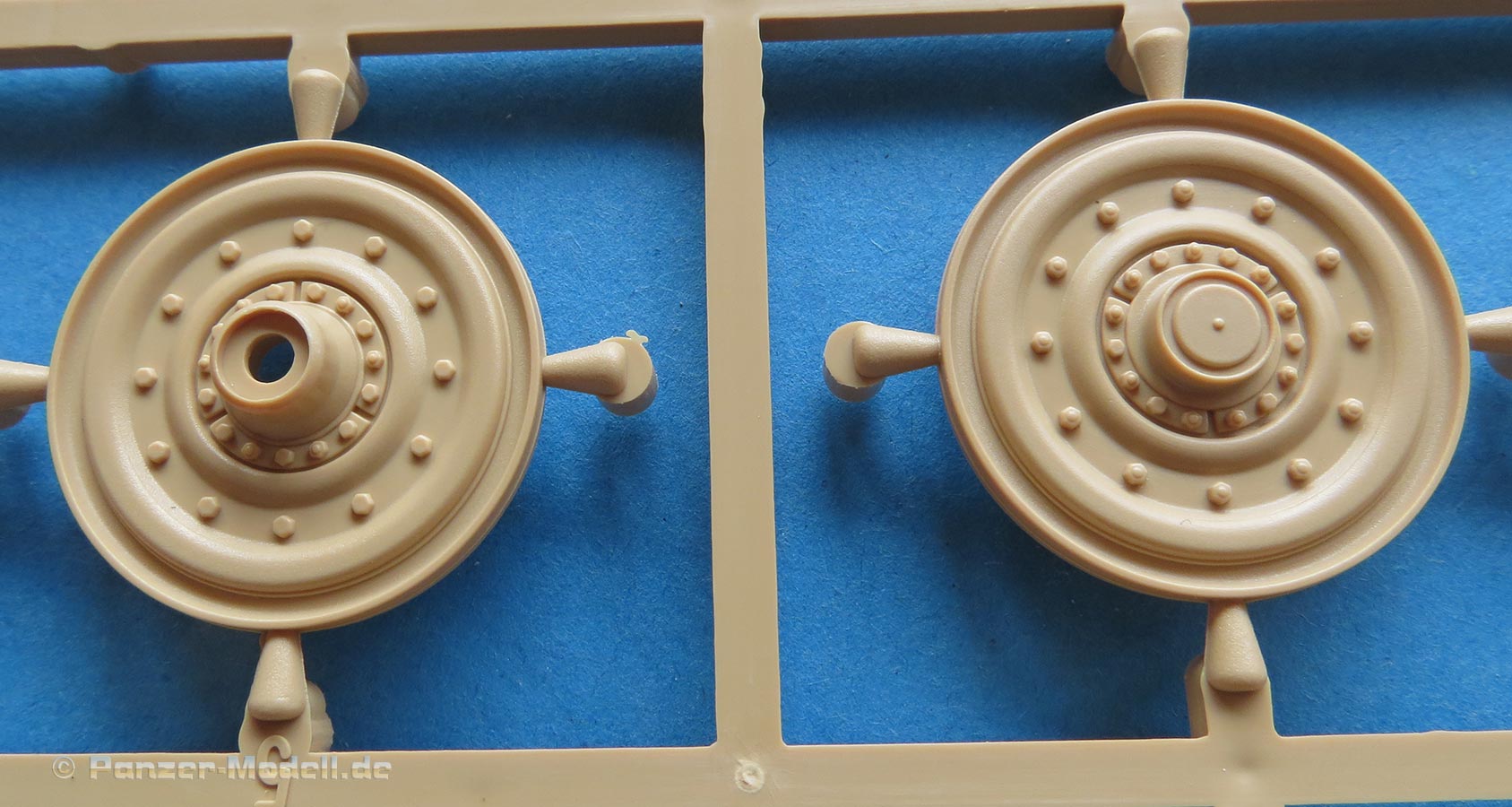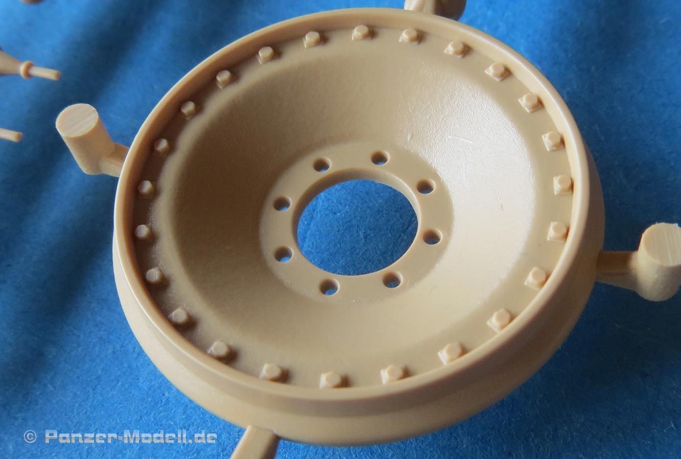 Was höchsterfreulich ist, ist dass RFM diesem Bausatz zwei Sets an Laufwerksrädern beigelegt hat, nämlich die "normalen" Panther Laufrollen und auch die Stahllaufrollen. Für beide Sets liegt ein eigenes Set an Drehstäben und Schwingarmen bei. Diese sind im Prinzip einteilig, der Anbau, bzw. das Verkleben des Endes in der Wanne ist ein bisschen suboptimal, da eine Menge Spiel vorhanden ist. De noch hat man so die Möglichkeit einer beweglichen Federung, was zusammen mit der beweglichen Einzelgliedkette durchaus Sinn macht.