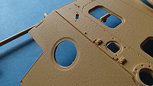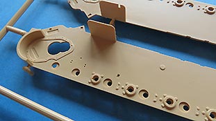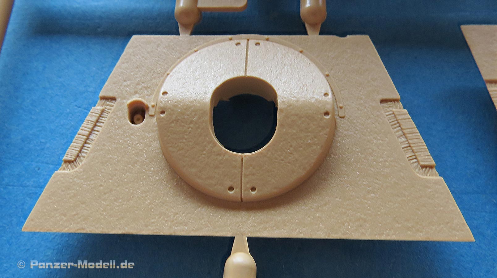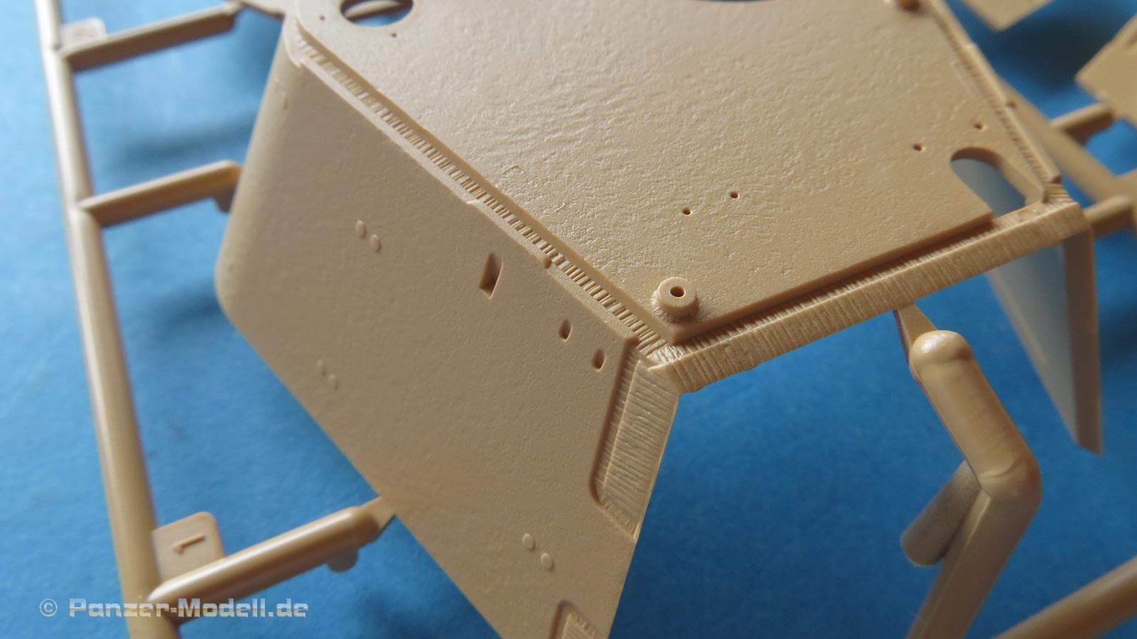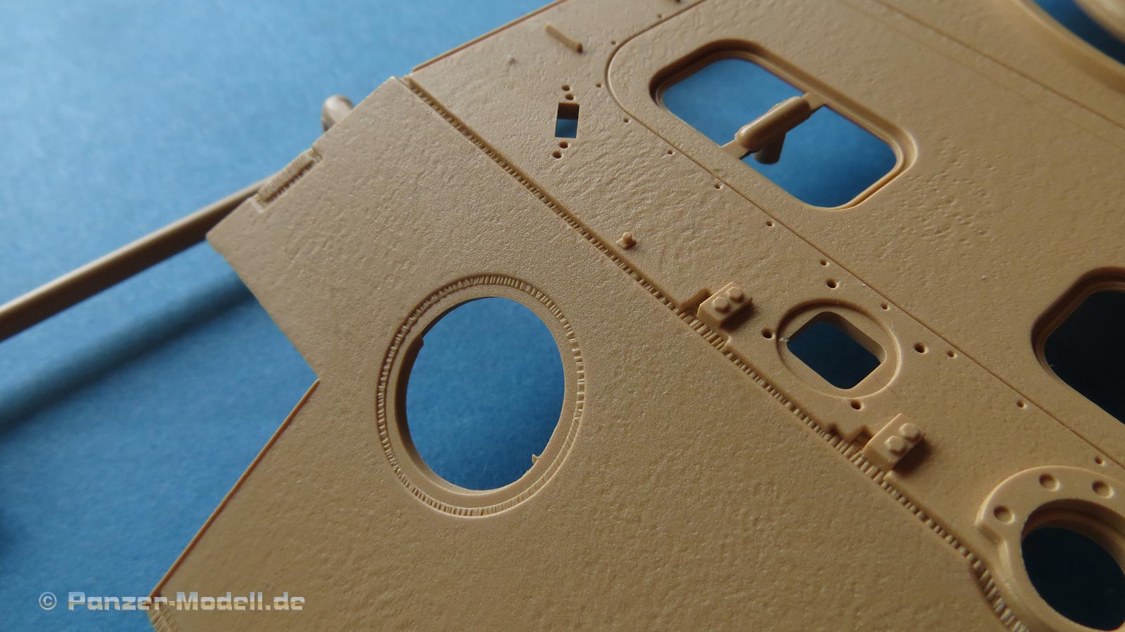 Die Oberwanne ist im Groben einteilig, wird aber natürlich mit reichlich Anbauteilen verfeinert. Gerade der besondere, neue Mechanismus der Fahrer- und Funkerluke ist hier mit enthalten und lässt sich funktionsfähig bauen. Die Struktur der Panzerplatten ist wirklich sehr gelungen - leicht rau, unregelmäßig und nicht zu übertrieben.