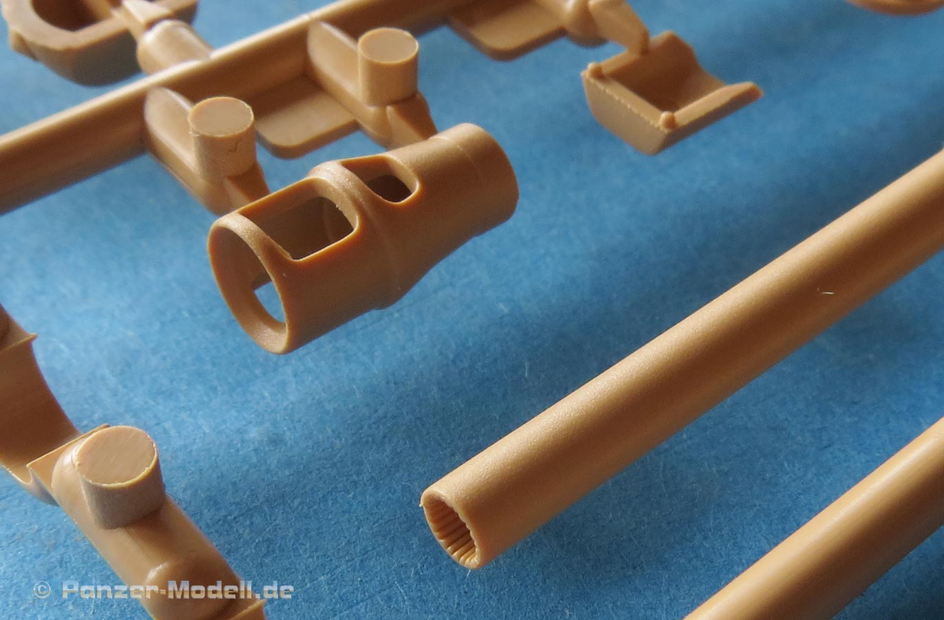 Auch am Turm erfreut RFM durch optionale Teile - zum einen liegt die korrekte Kanone der 7,5cm Kwk44 L/70 bei, die ohne Mündungsbremse genutzt wurde und zum anderen für die what-if Freunde hat man hier noch die projektierte 7,5cm L/100 mit Mündungsbremse bei. Die Mündung der Kwk44 ist hohl und sogar mit Feldern und Zügen versehen.