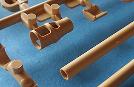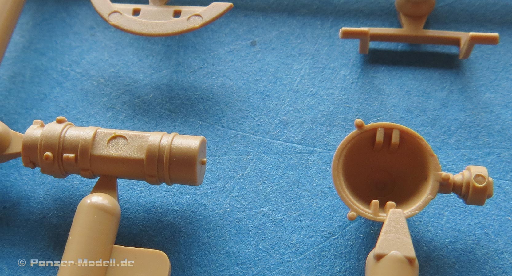 Für die Werkzeugausstattung liegen sehr schöne Werkzeuge mit angegossenen Halterungen, bzw. für ein paar von den größeren Halterungen liegen PE Teile bei. Für die Ersatzkettenhalterungen am Heck liegen feine PE Teile und Stifte aus Spritzguss bei.