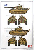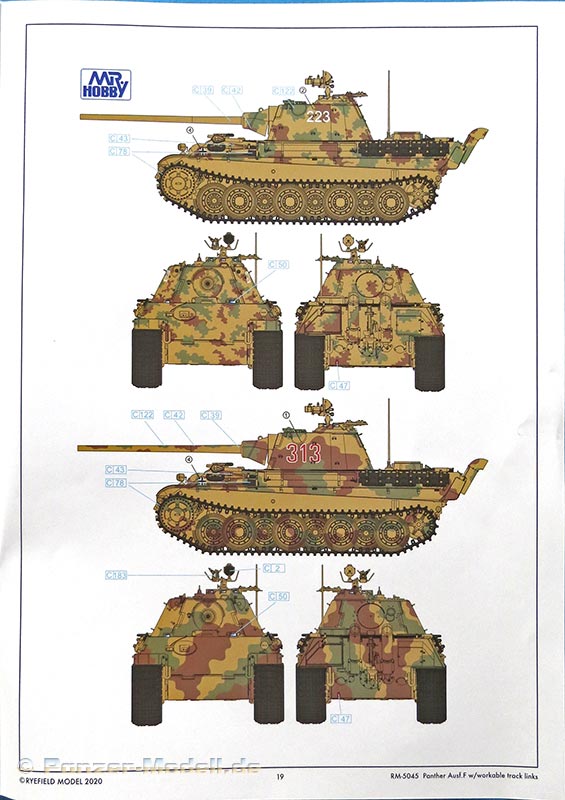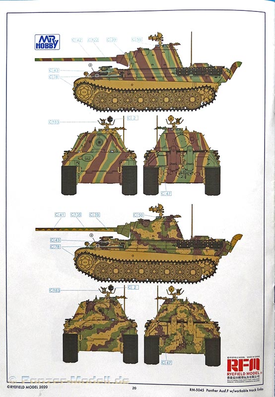 Am Ende der Bauanleitung sind 4 farbig gedruckte Farbprofile zur Bemalung und Markierung enthalten, die recht schöne und interessante Tarnschemen für den Panther F zeigen.