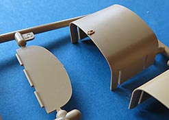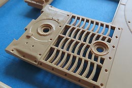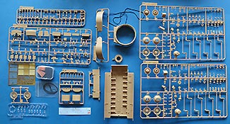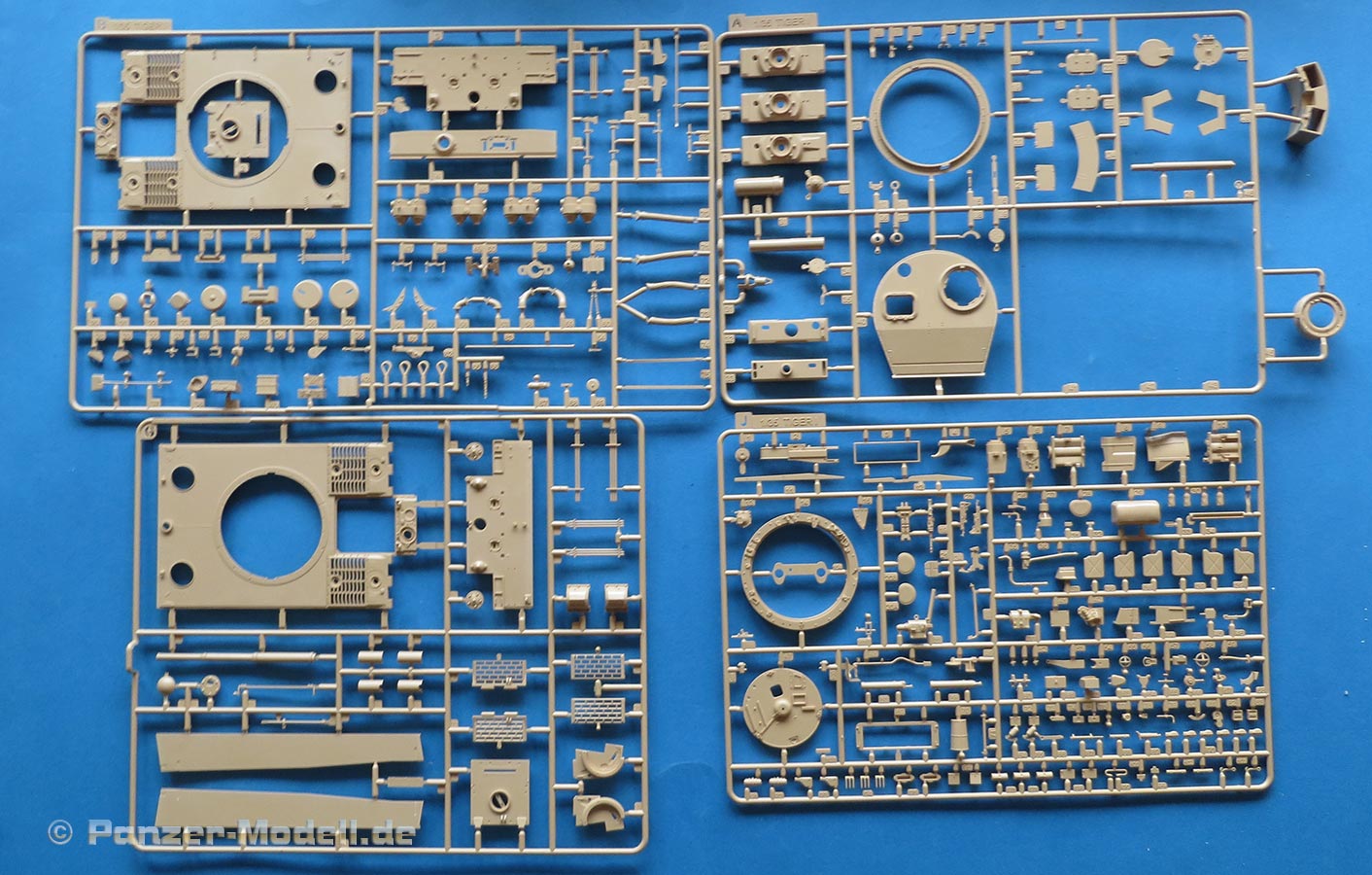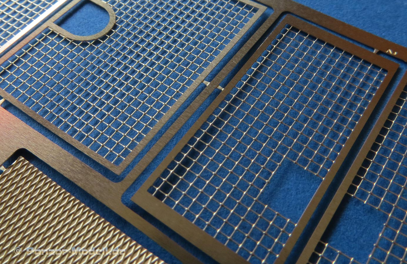 Die Abdeckplatte der Oberwanne ist einteilig, wird aber mit separaten Seitenteilen versehen und auf dem Motordeck sind die hinteren Lüfterlamellen klappbar gemacht. Für die Lüftergitter liegen extrem schöne, fein geätzte PE Gitter bei. Fahrer- und Funkerluke wie auch Motorluke können offen oder geschlossen angebaut werden obwohl dies bei der fehlenden Inneneinrichtung nicht unbedingt notwendig wäre.