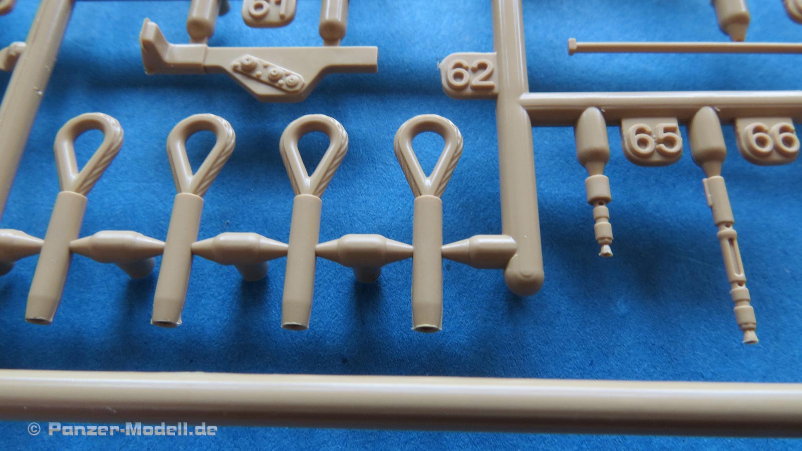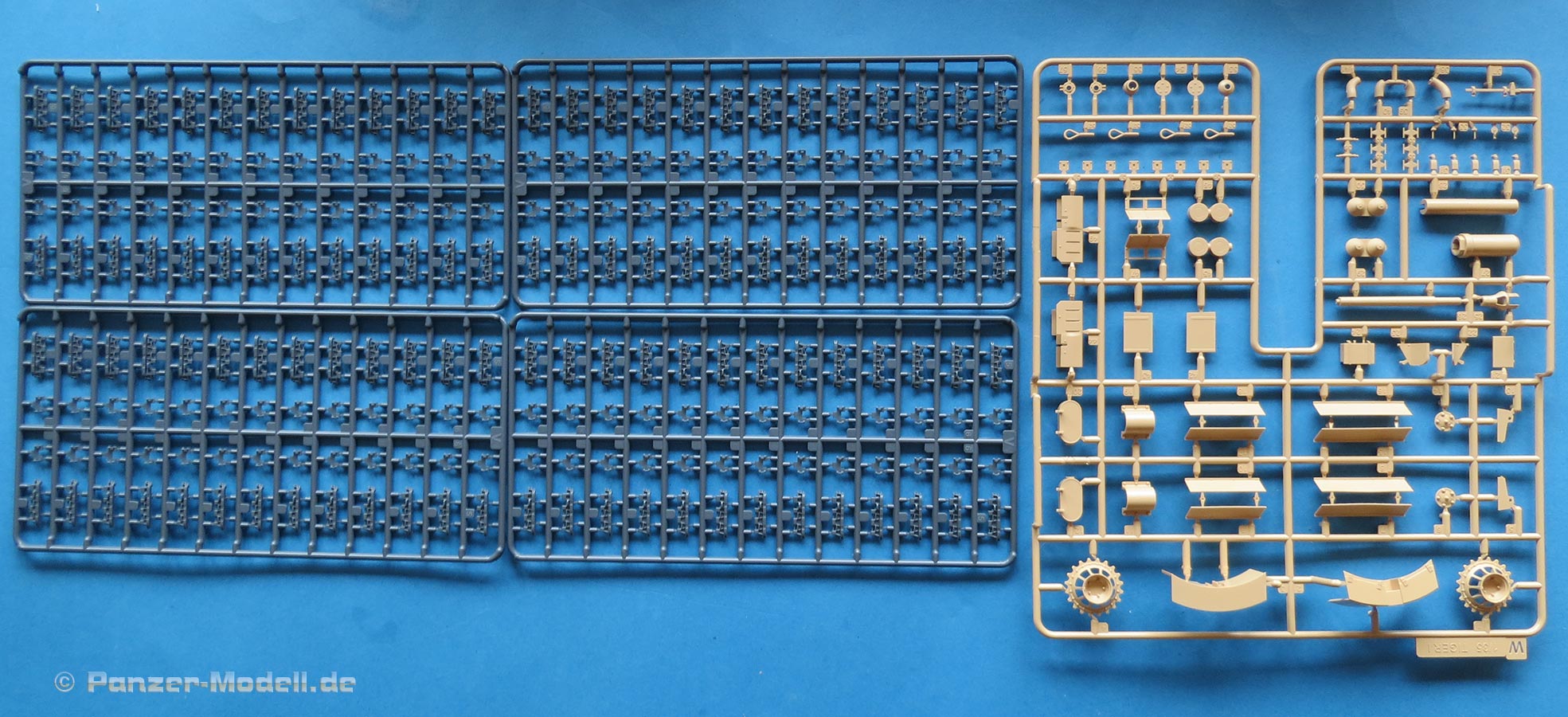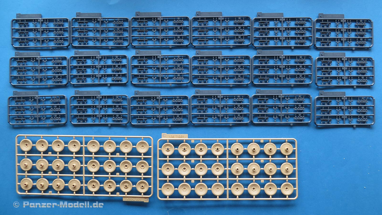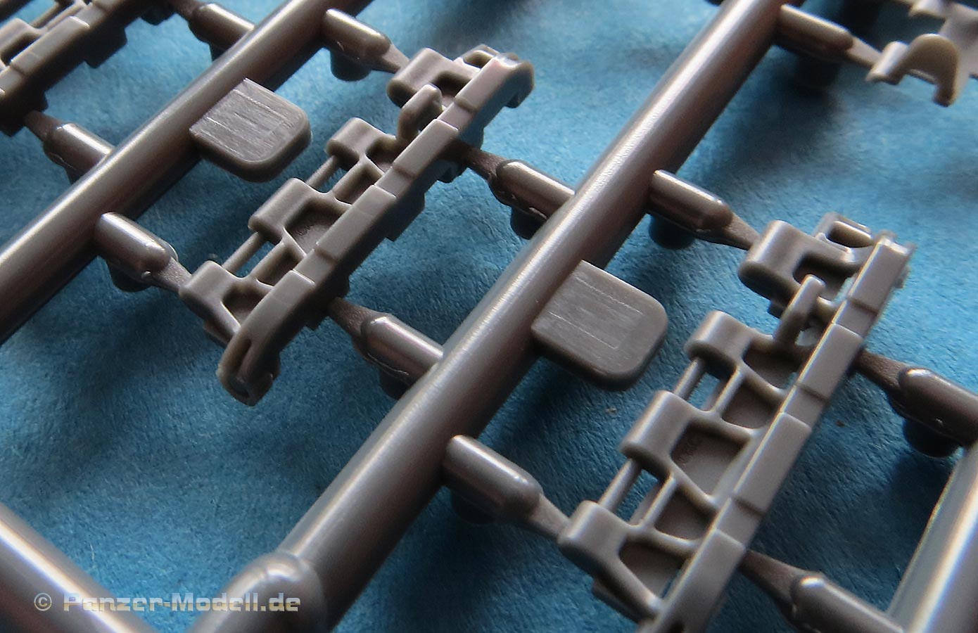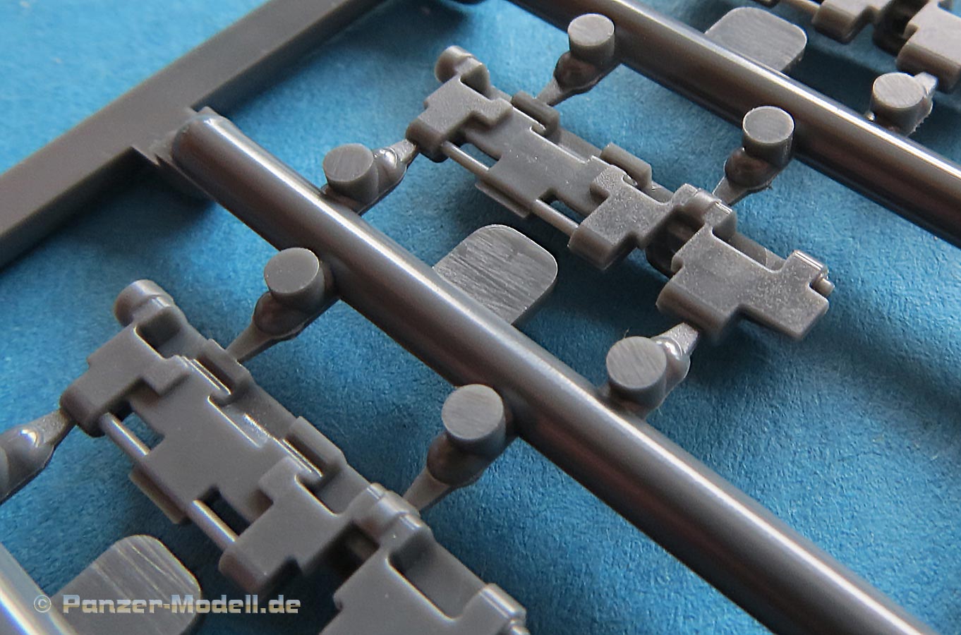 Die Unterwanne ist in einem Stück gemacht mit einzeln einsteckbaren Schwingarmen. Der Clou hierbei ist, dass sich diese mit dem angegossenen Nupsi schön sauber in einer Reihe einkleben lassen, aber wer eine bewegliche Federung haben möchte, knipst den Nupsi einfach ab und hat damit funktionierende Drehstäbe. Doch damit nicht genug, denn im Gegensatz zu anderen Herstellern, die zwar bewegliche Drehstäbe haben, dann aber zu verklebende Einzelgliedketten oder die ungeliiebten Vinyl/DS-Ketten beilegen, haben wir hier bei Rye Field bewegliche Einzelgliedketten. Die einzelnen Kettenglieder sind von hervorragender Qualität mit sauberem Guss, guten Details und keinerlei Auswerferstellen. Und vor allem haben wir hier korrekterweise zwei unterschiedliche Sets an Kettengliedern nämlich spiegelbildliche Ketten für rechts und links während die Tiger relativ schnell nur noch einen Kettentyp erhalten haben der dann auf einer Seite vorwärts und auf der anderen Seite rückwärts aufgezogen wurde.