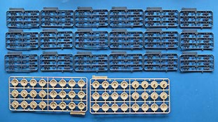 Hier finden wir 15 beige Spritzlinge, 22 graue Spritzlinge, dazu einen klaren Spritzling, die Unterwanne, die Kommandantenkuppel, eine PE Platine, Seilmaterial, 3D Druckteile und einen kleinen Decalbogen