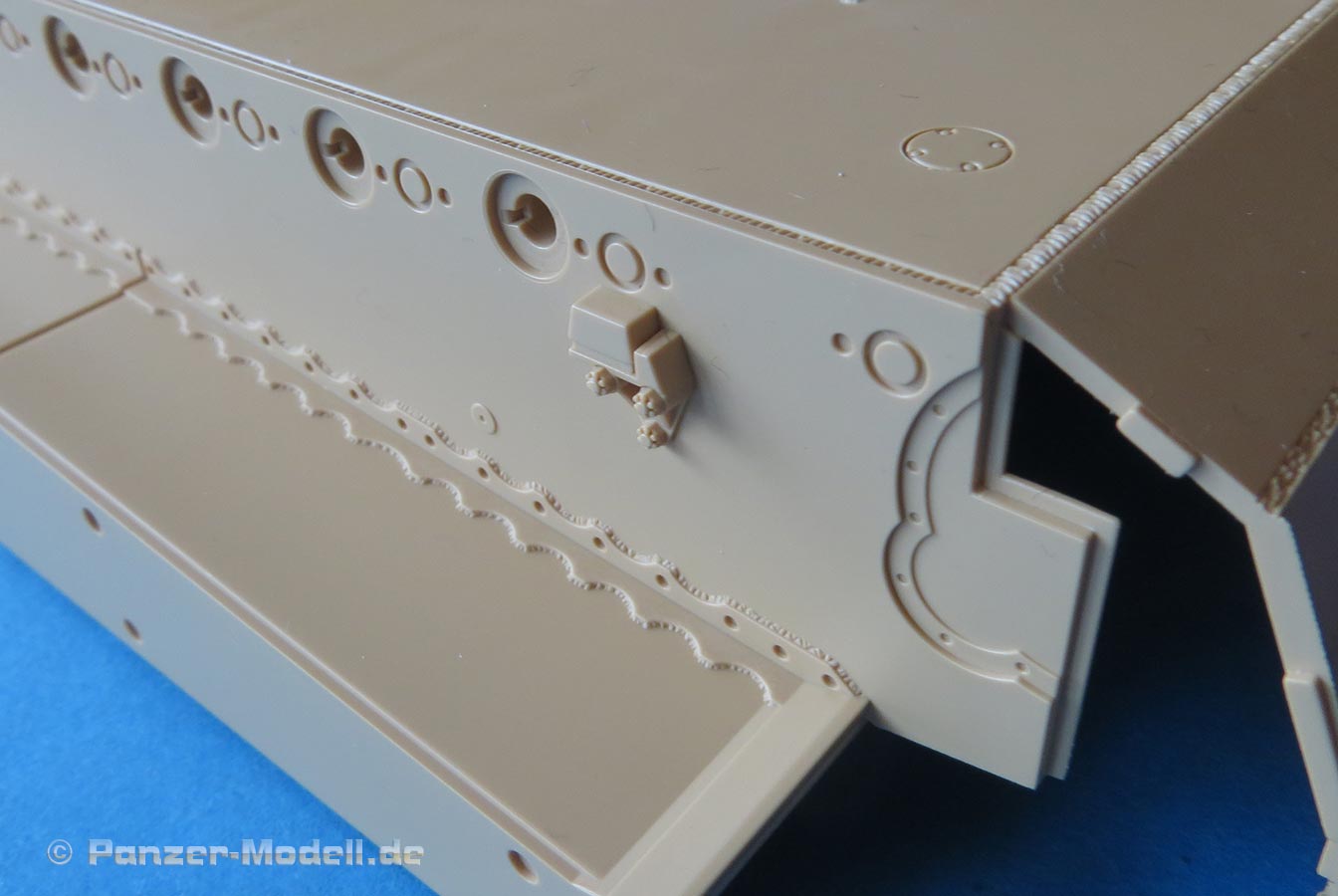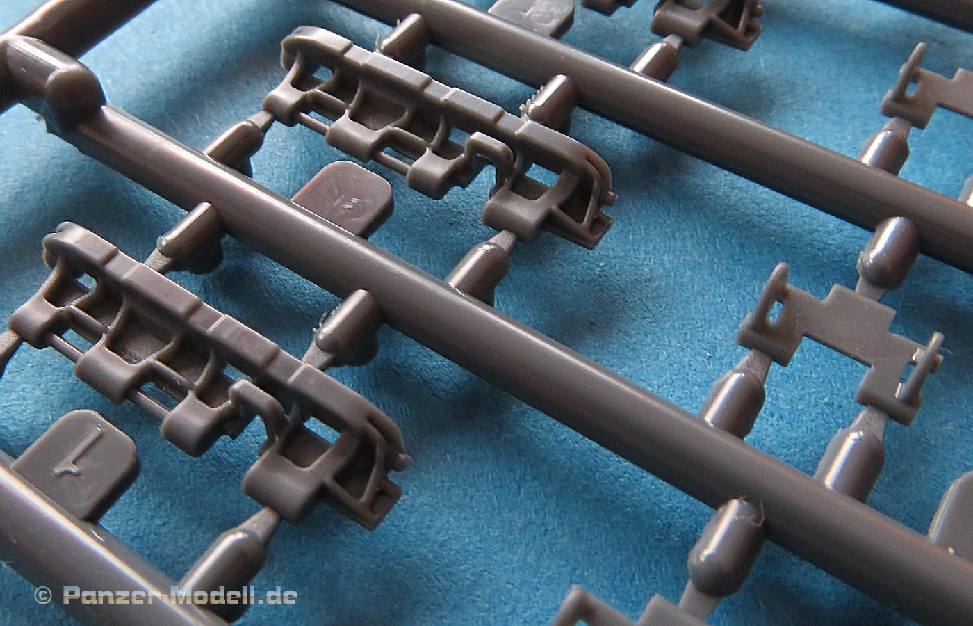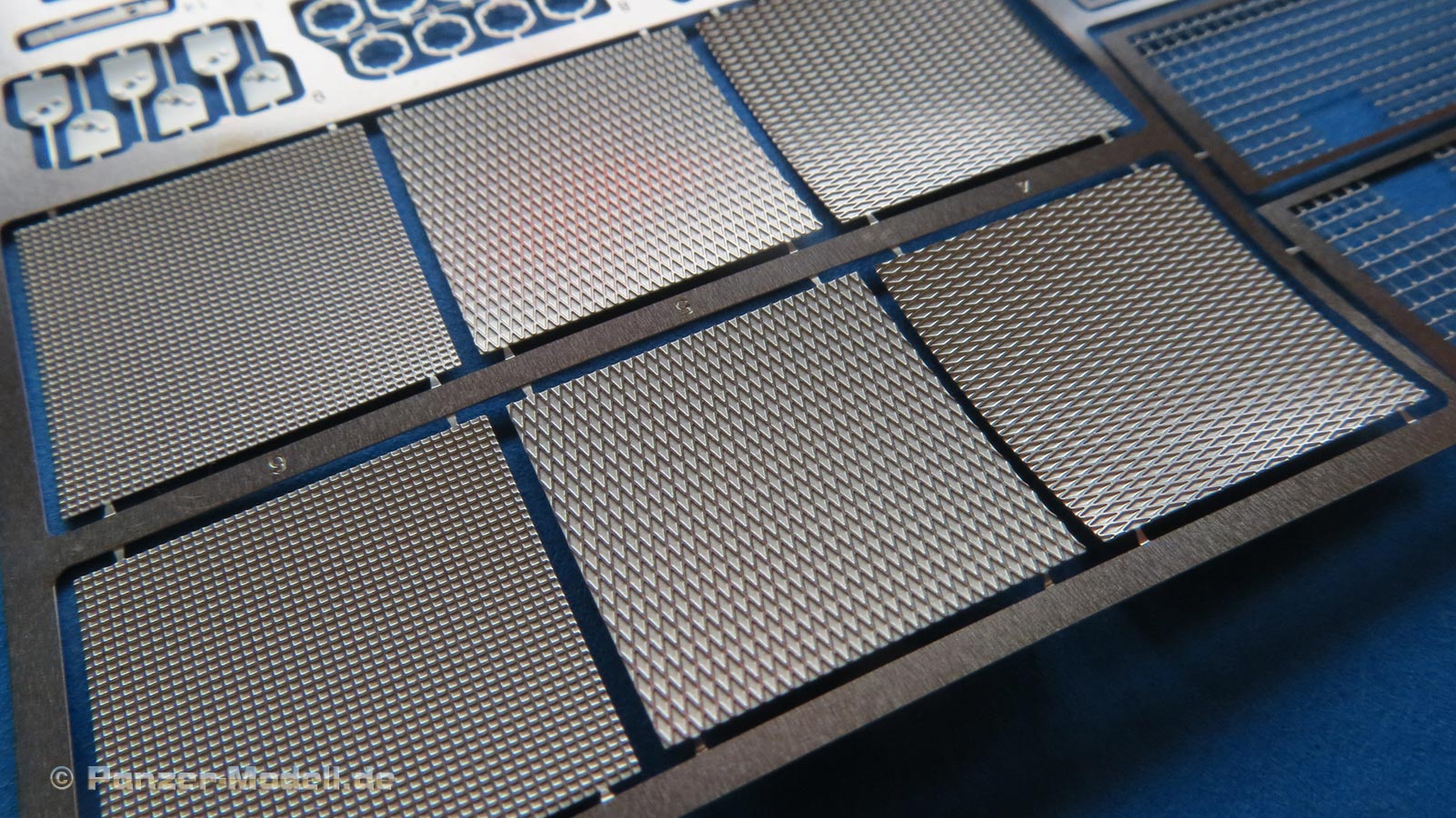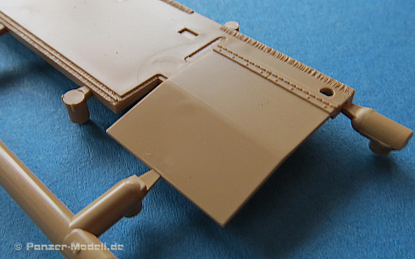 Für die vorderen Kettenabdeckungen, die mit der Glacispaltte in einem Stück angebracht werden, liegen 3 verschiedene Muster an Riffelblech PE Teilen bei.