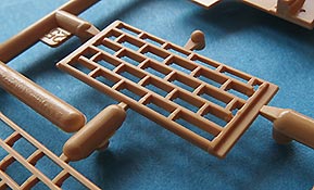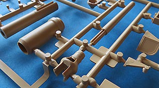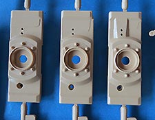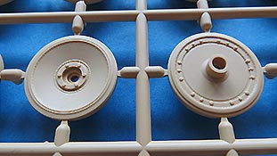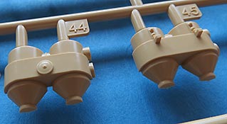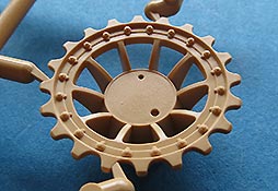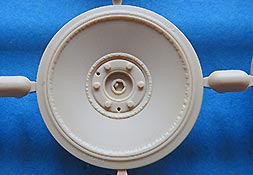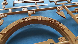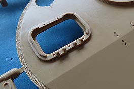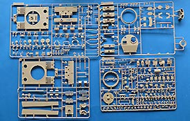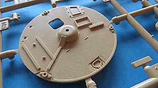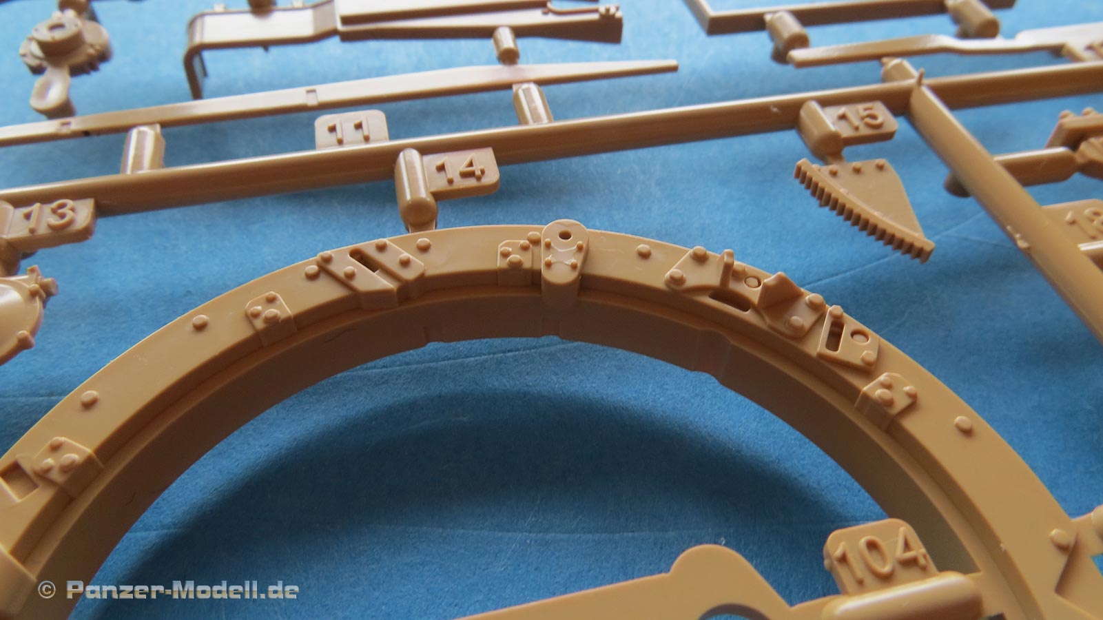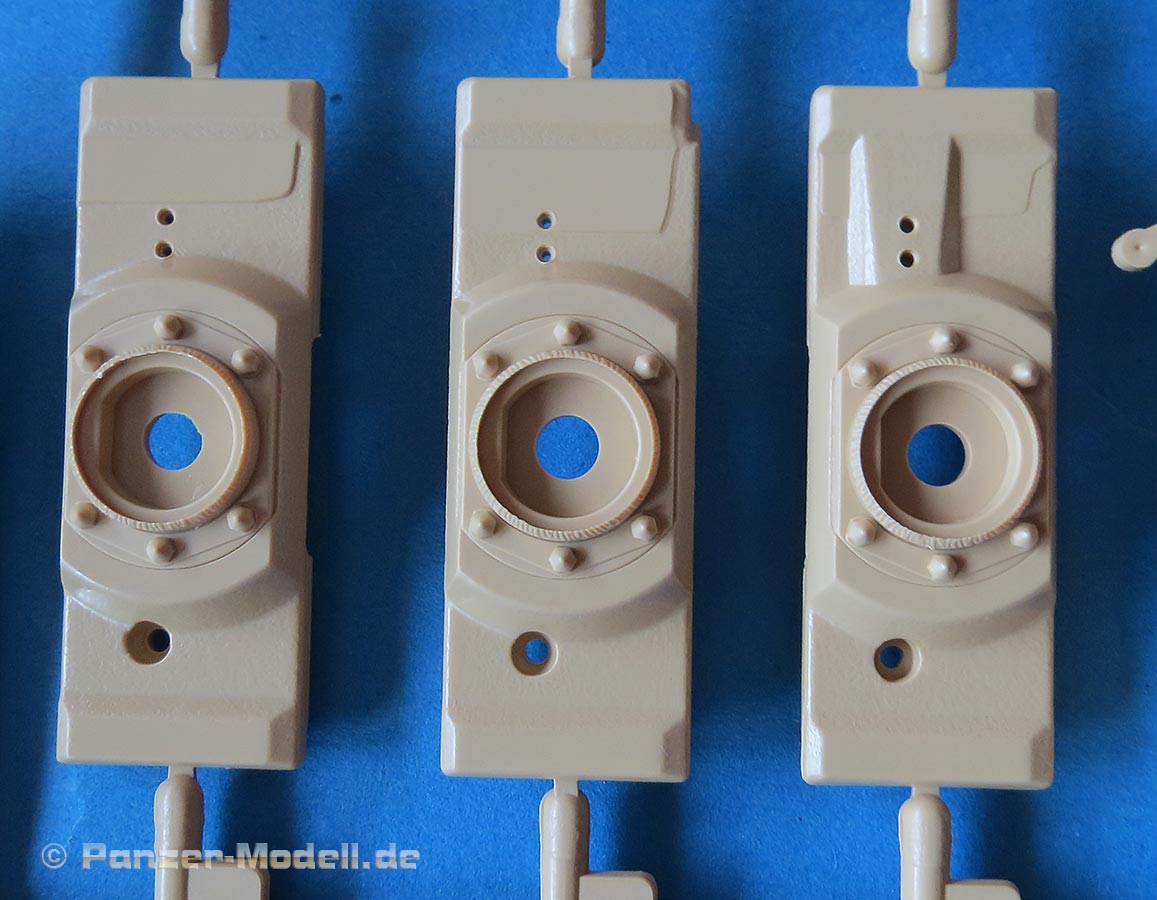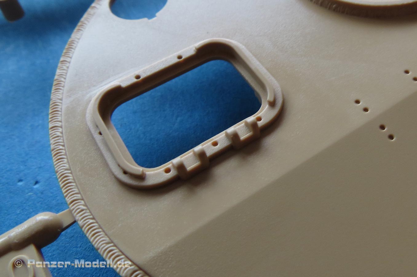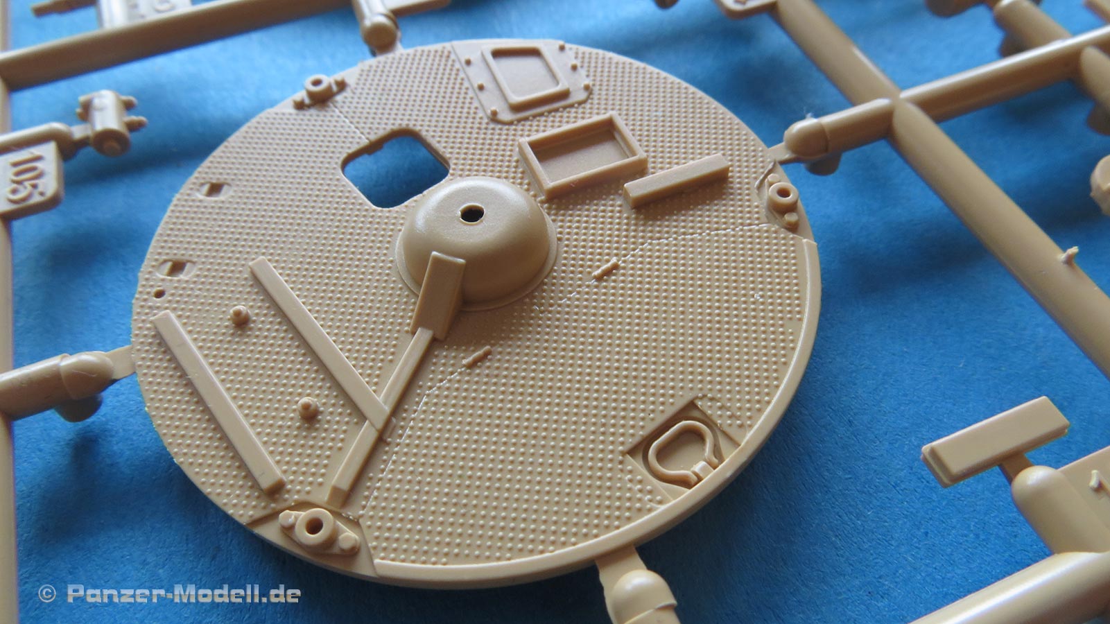 Der Turm ist im Prinzip einteilig gespritzt und wird vorn durch die Kanonenblende und nach oben durch die Deckplatte abgeschlossen. Im Inneren findet sich nur die Dasretkkung der Kanone und der Turmbühne mit tollen Struktur.