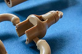 Hier ist es nun recht raffiniert gelöst, denn der Bereich auf dem die Führungszähne sitzen, wird als Einzelteil auf die Kettenkörper geklebt und umfasst die eingegossenen Bolzen des nächsten Glieds und verbindet diese damit beweglich.