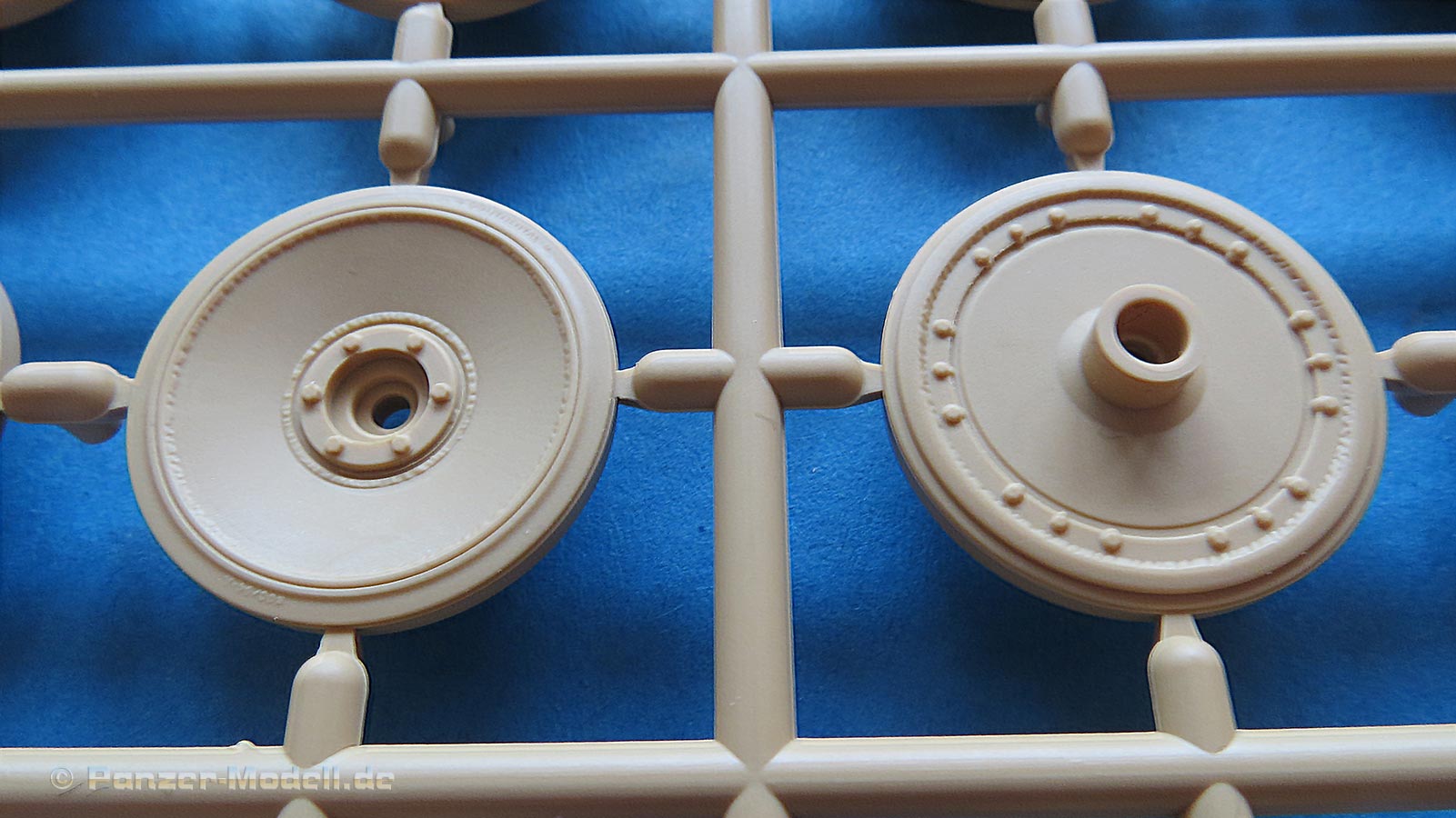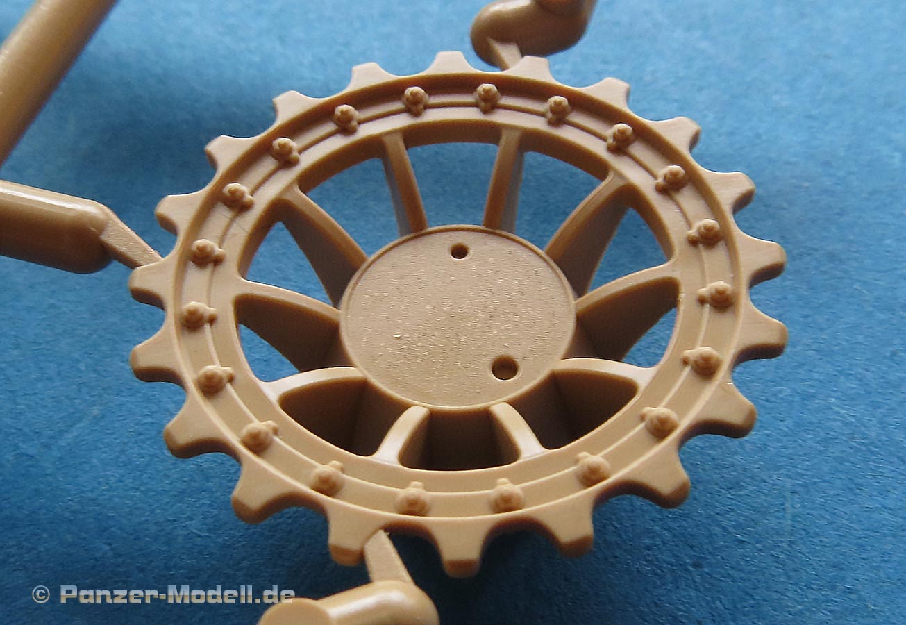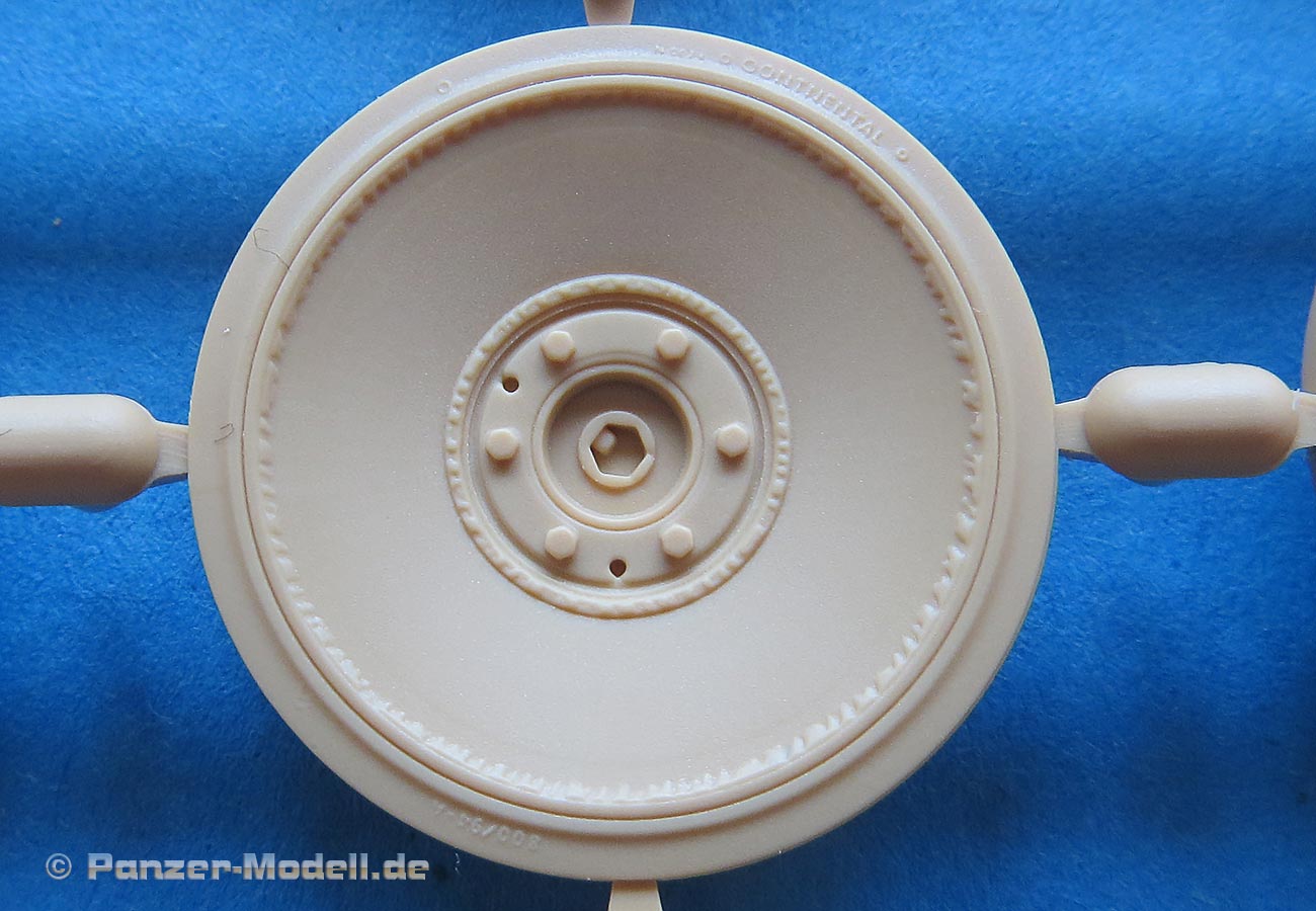 Die Laufräder sind ebenfalls ganz hervorragend. Die Schweißnähte, die Radmuttern und auch der Herstelleraufdruck auf den Gummibandagen sind fein und gut dargestellt. Besonders gut gefällt mir, dass die äusseren Laufrollen offenbar auch abgenommen dargestellt werden können, denn es liegen separate Abschlussringe bei. Das finde ich ganz hervorragend und durchdacht, sodass man den Tiger variabel gestalten kann.