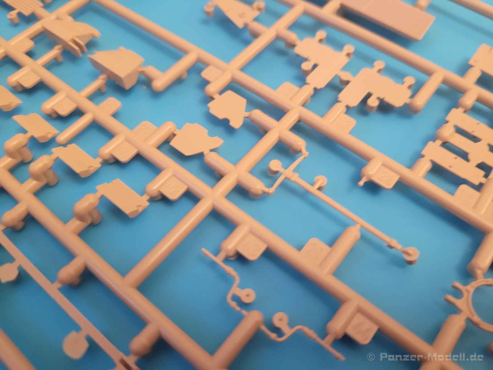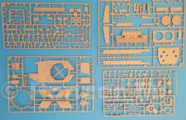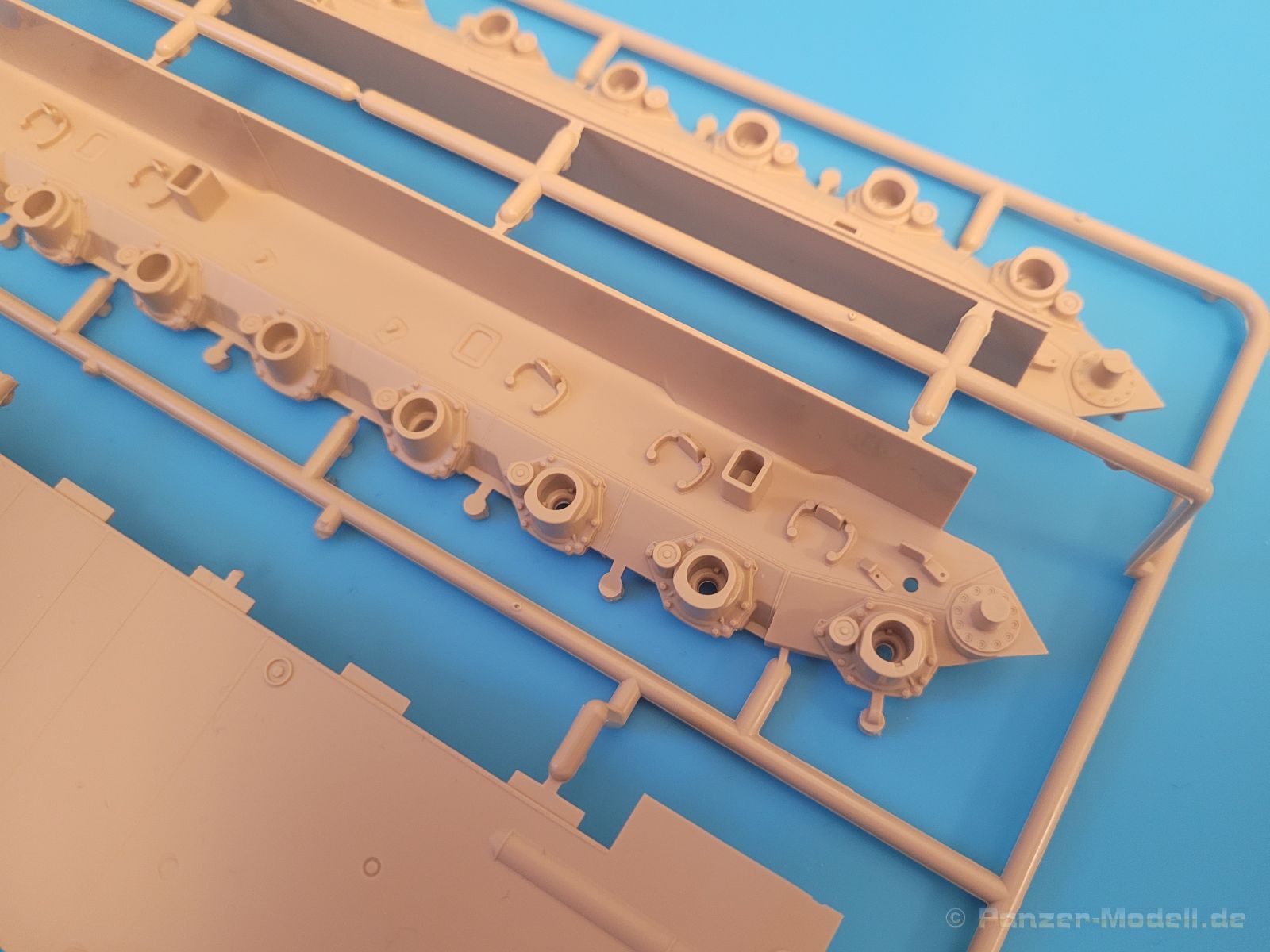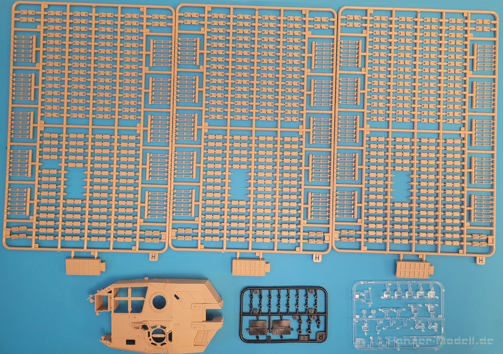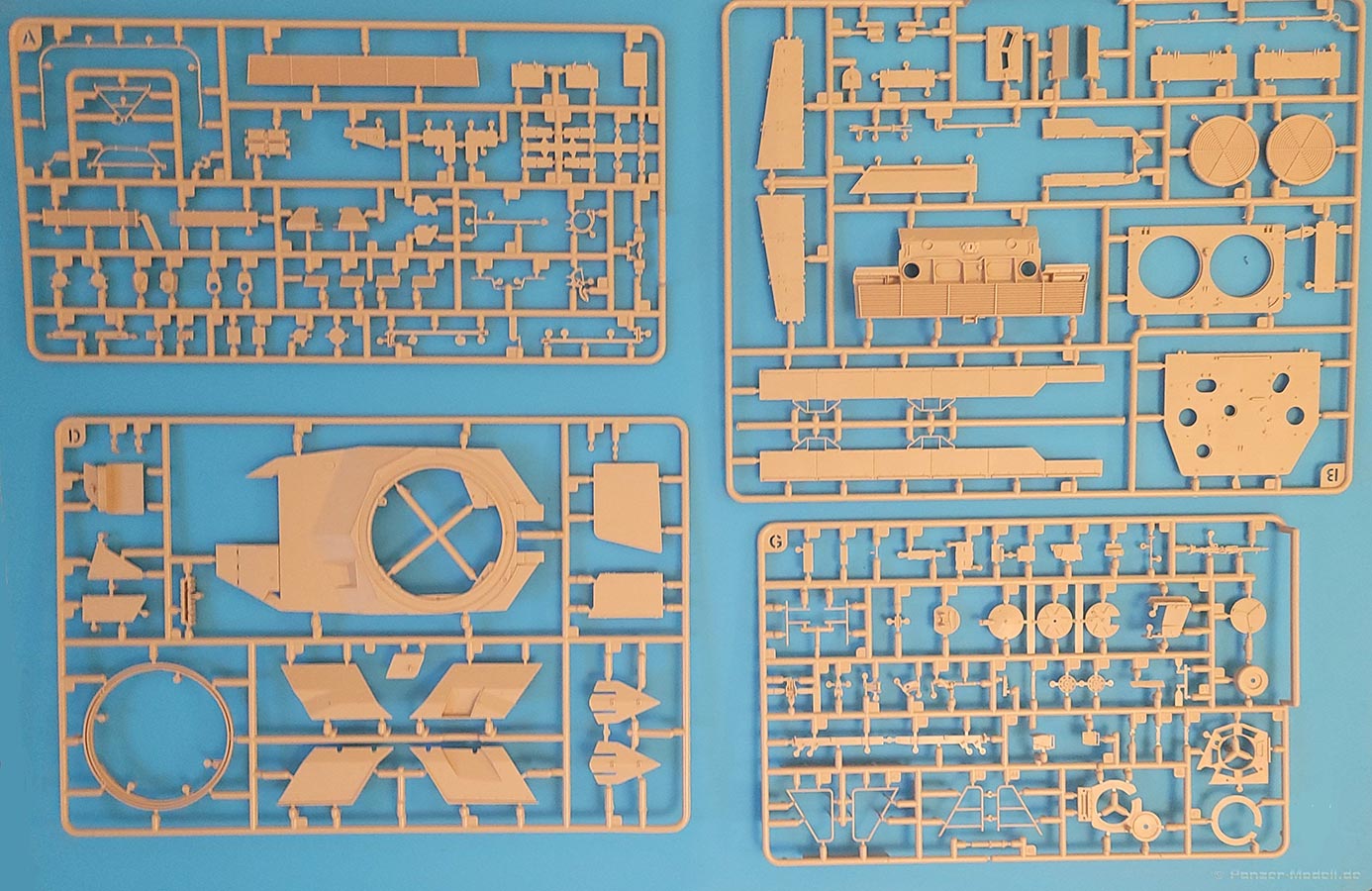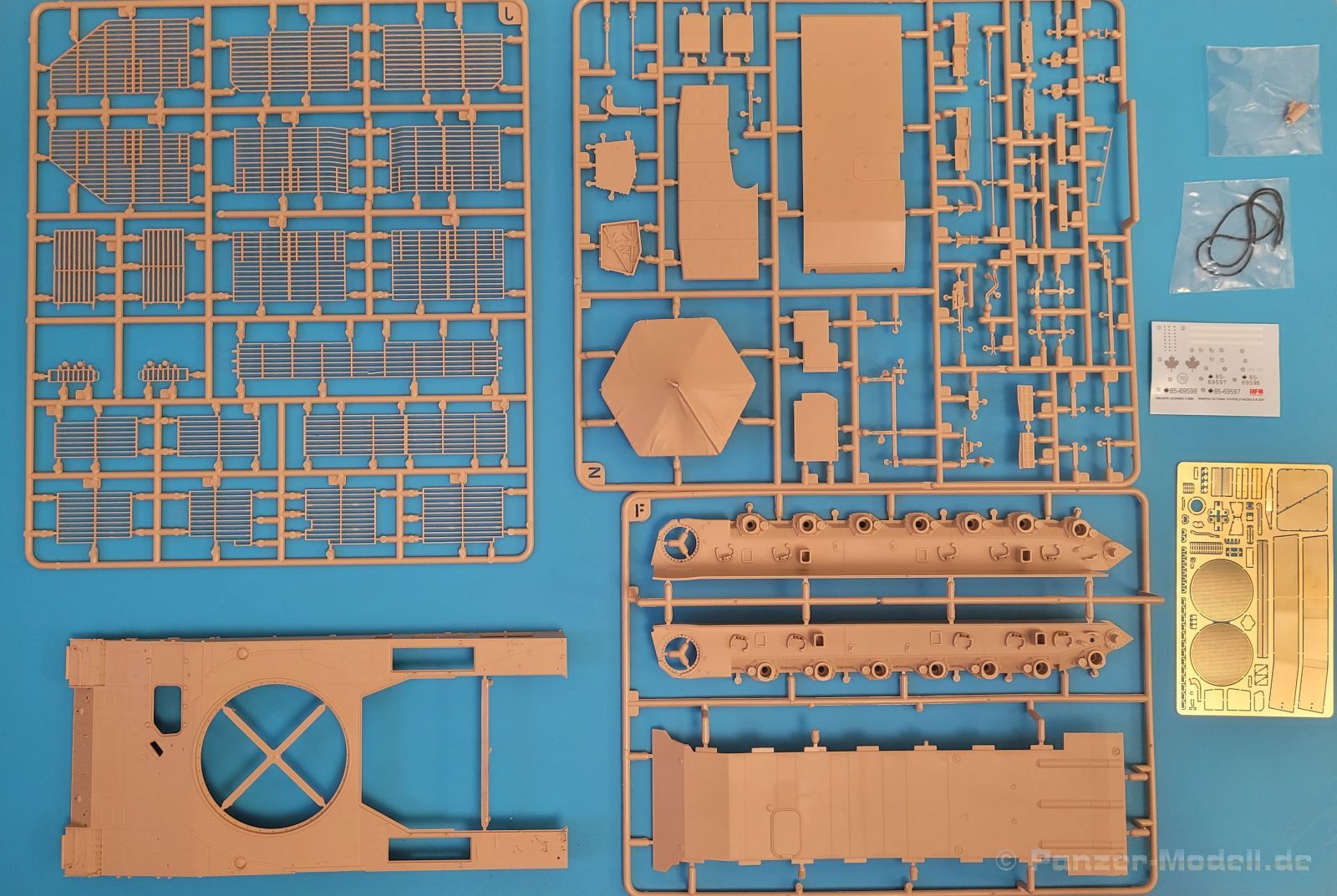 Der Leopard 2A6M CAN ist die kanadische Variante des Kampfpanzers mit Minenschutz Leopard 2A6M. Die ersten 20 Panzer dieser Variante wurden 20 von der deutschen Bundeswehr geliehen, um die Feuerkraft und den Schutz der im Süden Afghanistans operierenden kanadischen Truppen zu erhöhen. Die geliehenen Panzer trugen deutsche MG3 Maschinengewehre und erhielten eine SLAT Abstandspanzerung. Zum Modell: Beim Öffnen des stabilen Stülpkartons finden wir: - Sechzehn Spritzlinge in einem schönen beigen Plastik An den Spritzlingen sind augenscheinlich weder Fischhaut, Grat oder Sinkstellen zu finden, noch sind auffällige Auswerfermarken an später sichtbaren Stellen zu erkennen. Die Unterwanne setzt sich aus mehreren Teilen zusammen, was zum sauberen Arbeiten zwingt. Hier sollte man IMMER trockenanpassen, damit eine optimale Passung gewährleistet ist. An Ober- und Unterwanne sind sehr schöne gestaltete Schweißnähte nachgebildet, wie auch schon bei anderen Bausätzen dieser Marke mit die besten und filigransten welche es bisher in Spritzguss gab. Sämtliche Griffe an der Oberwanne, und davon gibt es viele, sind als Fotoätztele vorhanden. Wer mich kennt, weiß dass ich da sehr kritisch bin, hier frage ich mich nur: WARUM? Die einzelnen Schwingarme des Laufwerks befinden sich auf Drehstäben, diese werden in die Unterwanne eingesteckt und verklebt. Die Erfahrung zeigt, dass sich sich hier eine gute Federung ergibt. Die Laufrollen setzten sich aus den zwei Einzellaufrollen zusammen, welche in der Mitte ein Polycap erhalten. So bleiben auch die Laufrollen beweglich und können zur Bemalung abgenommen werden. Die Ketten befinden sich an drei eigenen Gussästen. Diese bestehen aus je zwei Bolzen mit angegossenen Endverbindern, welche in die Unterseite der einzelnen Kettenglieder gelegt werden, welche sich in einer Montagehilfe befinden. Dann wird das Oberteil des Kettengliedes mit wenig Klebstoff auf das Unterteil geklebt und die Kette bleibt beweglich. Ein recht einfaches, aber effektives System, jedoch ist sauberes Arbeiten hier Pflicht. Für jede Seite werden Dreiundachtzig Kettenglieder benötigt, somit macht der Kettenbau einen Großteil der Arbeit an diesem Bausatz aus. Die SLAT Panzerung macht für Plastikspritzguss einen hervorragenden Eindruck. Der Vergleich mit den vorliegenden Fotos zeigt, das diese fast auf dem Punkt ist. Hier geht es nur noch mit Fotoätzteilen feiner. Der Turm wird mit vielen fein detaillierten Anbauteilen verfeinert, und viele spezielle kanadische Anbauteile werten das Modell auf (Dazu mehr in den Bemerkungen). Die Kanone ist für mich ein Highlight, diese bleibt dank der Polycaps in der Höhe beweglich. Das Rohr wird aus Plastikteilen, einem kleinen Fotoätzteil zusammengebaut und einer fein in 3D gedruckten Mündung zusammengesetzt. Das Ergebnis sieht absolut überzeugend aus, zumal der Rauchabsauger eine realistische Oberflächenstruktur aufweist. Die klar strukturierte Bauanleitung führt in nur fünfunddreißig Schritten zum fertigen Modell und ist nicht überladen. Als Markierungsvarianten steht ein Fahrzeug zur Auswahl. 2007/ 2010 Kandahar Provinz/ Afghanistan, 3rd Canadian Division, 1st Canadian Mechanized Brigade Group, Lord Strathcona's Horse (Royal Canadians)