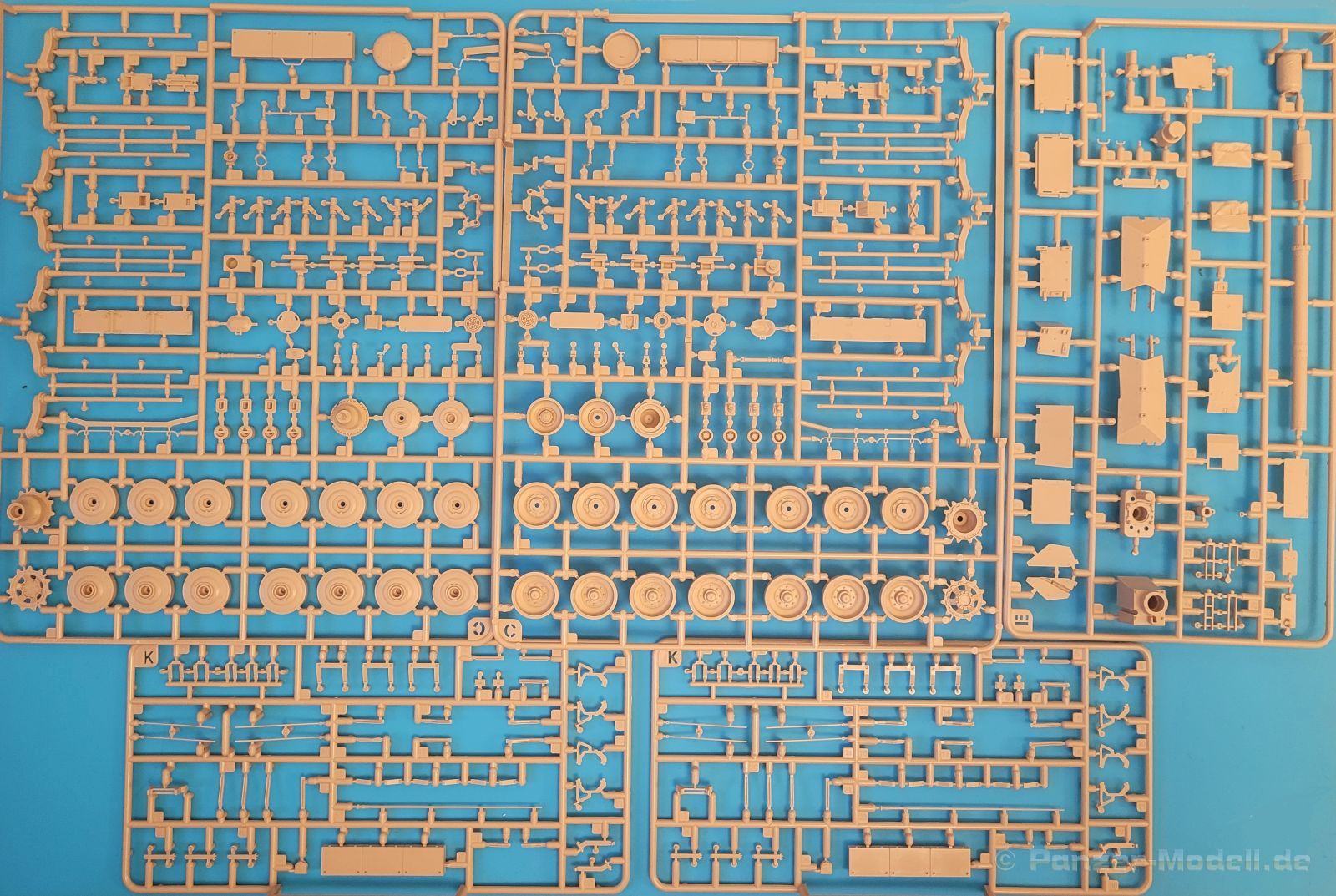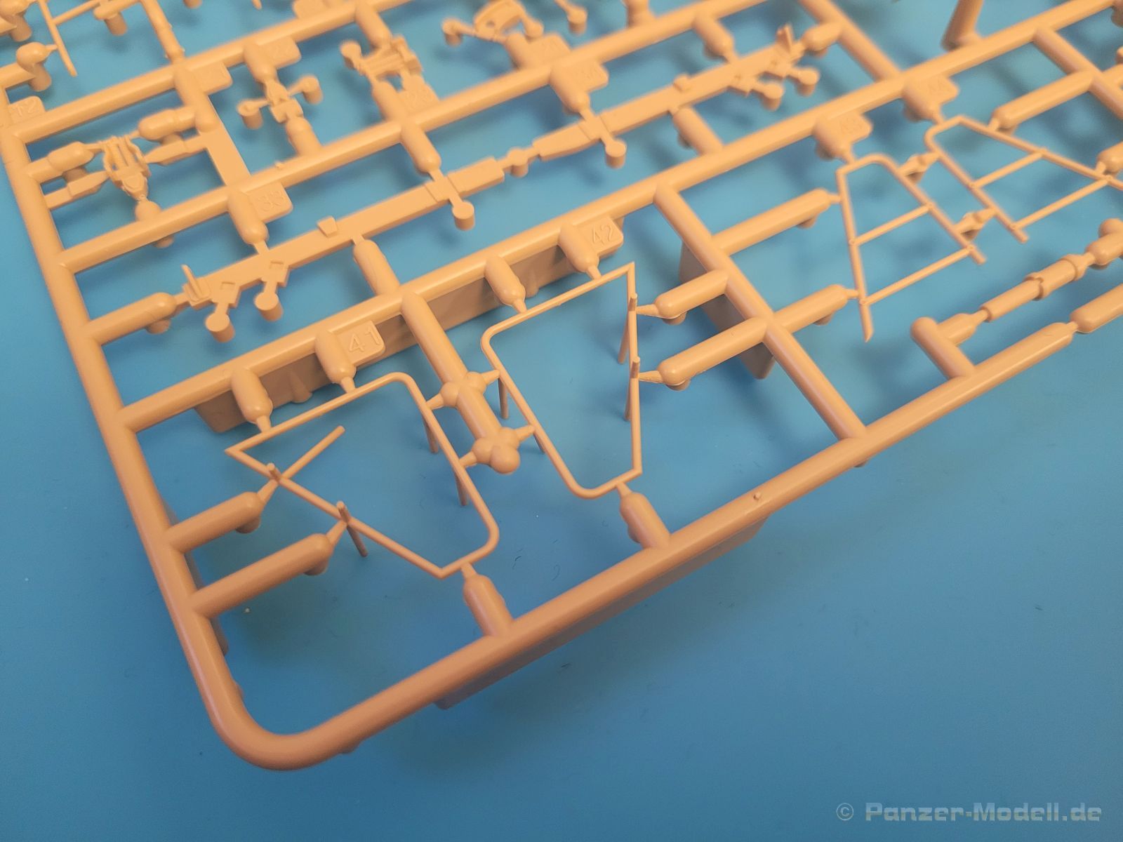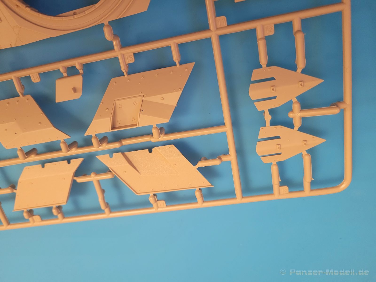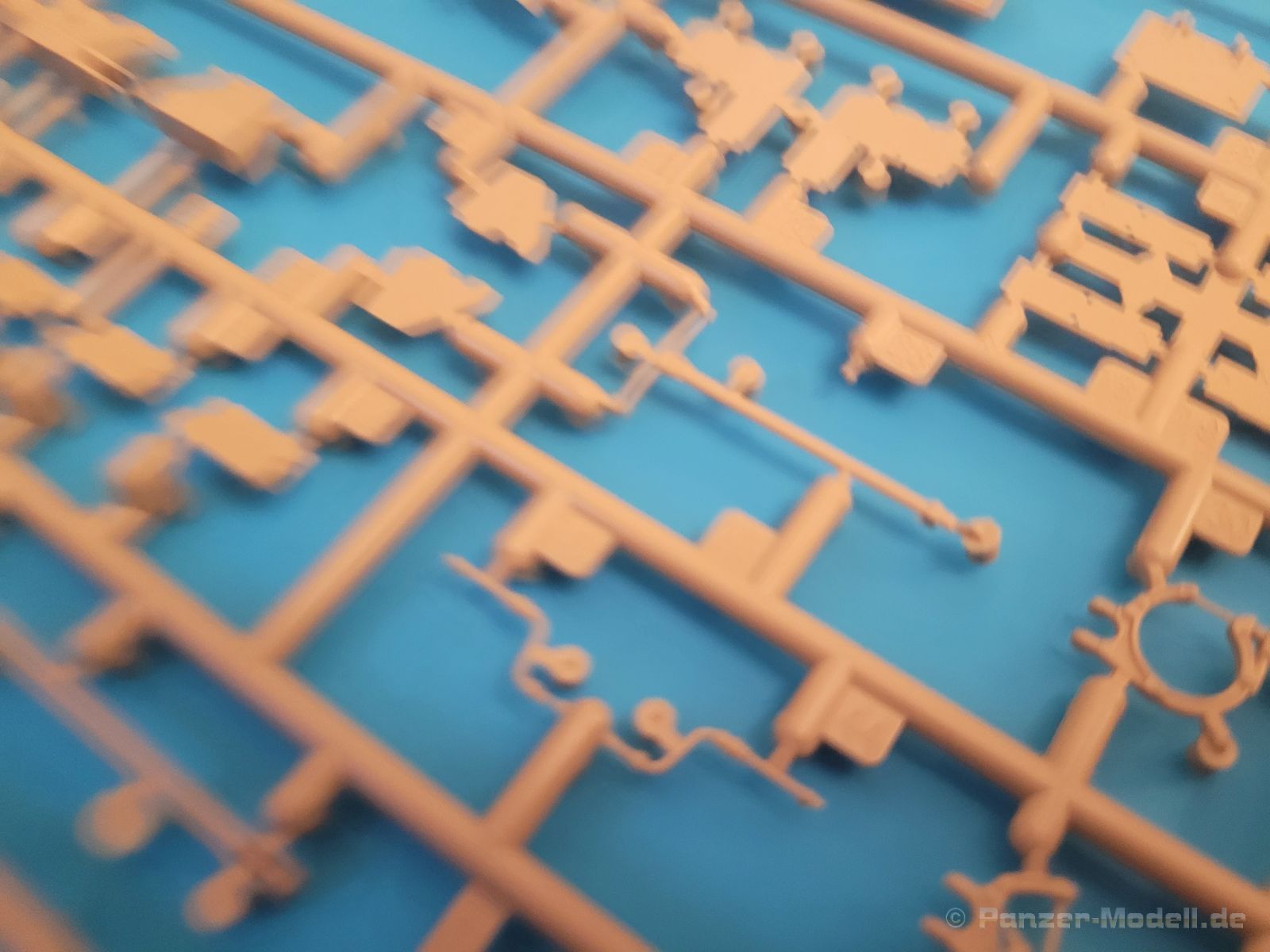 Der Leopard 2A6M CAN ist die kanadische Variante des Kampfpanzers mit Minenschutz Leopard 2A6M. Die ersten 20 Panzer dieser Variante wurden 20 von der deutschen Bundeswehr geliehen, um die Feuerkraft und den Schutz der im Süden Afghanistans operierenden kanadischen Truppen zu erhöhen. Die geliehenen Panzer trugen deutsche MG3 Maschinengewehre und erhielten eine SLAT Abstandspanzerung. Zum Modell: Beim Öffnen des stabilen Stülpkartons finden wir: - Sechzehn Spritzlinge in einem schönen beigen Plastik An den Spritzlingen sind augenscheinlich weder Fischhaut, Grat oder Sinkstellen zu finden, noch sind auffällige Auswerfermarken an später sichtbaren Stellen zu erkennen. Die Unterwanne setzt sich aus mehreren Teilen zusammen, was zum sauberen Arbeiten zwingt. Hier sollte man IMMER trockenanpassen, damit eine optimale Passung gewährleistet ist. An Ober- und Unterwanne sind sehr schöne gestaltete Schweißnähte nachgebildet, wie auch schon bei anderen Bausätzen dieser Marke mit die besten und filigransten welche es bisher in Spritzguss gab. Sämtliche Griffe an der Oberwanne, und davon gibt es viele, sind als Fotoätztele vorhanden. Wer mich kennt, weiß dass ich da sehr kritisch bin, hier frage ich mich nur: WARUM? Die einzelnen Schwingarme des Laufwerks befinden sich auf Drehstäben, diese werden in die Unterwanne eingesteckt und verklebt. Die Erfahrung zeigt, dass sich sich hier eine gute Federung ergibt. Die Laufrollen setzten sich aus den zwei Einzellaufrollen zusammen, welche in der Mitte ein Polycap erhalten. So bleiben auch die Laufrollen beweglich und können zur Bemalung abgenommen werden. Die Ketten befinden sich an drei eigenen Gussästen. Diese bestehen aus je zwei Bolzen mit angegossenen Endverbindern, welche in die Unterseite der einzelnen Kettenglieder gelegt werden, welche sich in einer Montagehilfe befinden. Dann wird das Oberteil des Kettengliedes mit wenig Klebstoff auf das Unterteil geklebt und die Kette bleibt beweglich. Ein recht einfaches, aber effektives System, jedoch ist sauberes Arbeiten hier Pflicht. Für jede Seite werden Dreiundachtzig Kettenglieder benötigt, somit macht der Kettenbau einen Großteil der Arbeit an diesem Bausatz aus. Die SLAT Panzerung macht für Plastikspritzguss einen hervorragenden Eindruck. Der Vergleich mit den vorliegenden Fotos zeigt, das diese fast auf dem Punkt ist. Hier geht es nur noch mit Fotoätzteilen feiner. Der Turm wird mit vielen fein detaillierten Anbauteilen verfeinert, und viele spezielle kanadische Anbauteile werten das Modell auf (Dazu mehr in den Bemerkungen). Die Kanone ist für mich ein Highlight, diese bleibt dank der Polycaps in der Höhe beweglich. Das Rohr wird aus Plastikteilen, einem kleinen Fotoätzteil zusammengebaut und einer fein in 3D gedruckten Mündung zusammengesetzt. Das Ergebnis sieht absolut überzeugend aus, zumal der Rauchabsauger eine realistische Oberflächenstruktur aufweist. Die klar strukturierte Bauanleitung führt in nur fünfunddreißig Schritten zum fertigen Modell und ist nicht überladen. Als Markierungsvarianten steht ein Fahrzeug zur Auswahl. 2007/ 2010 Kandahar Provinz/ Afghanistan, 3rd Canadian Division, 1st Canadian Mechanized Brigade Group, Lord Strathcona's Horse (Royal Canadians)