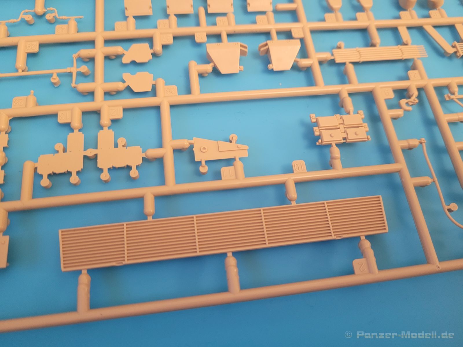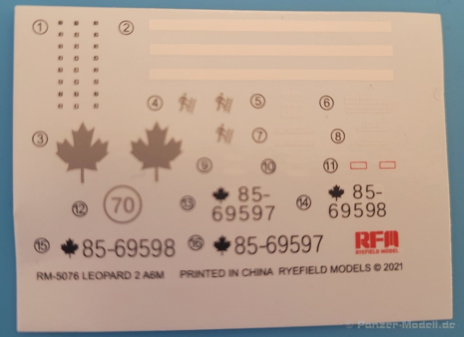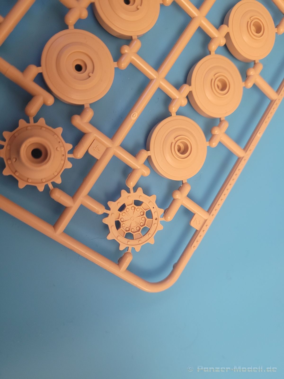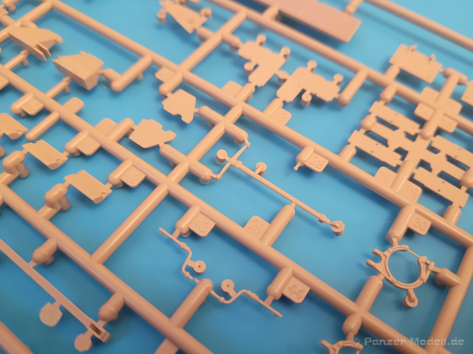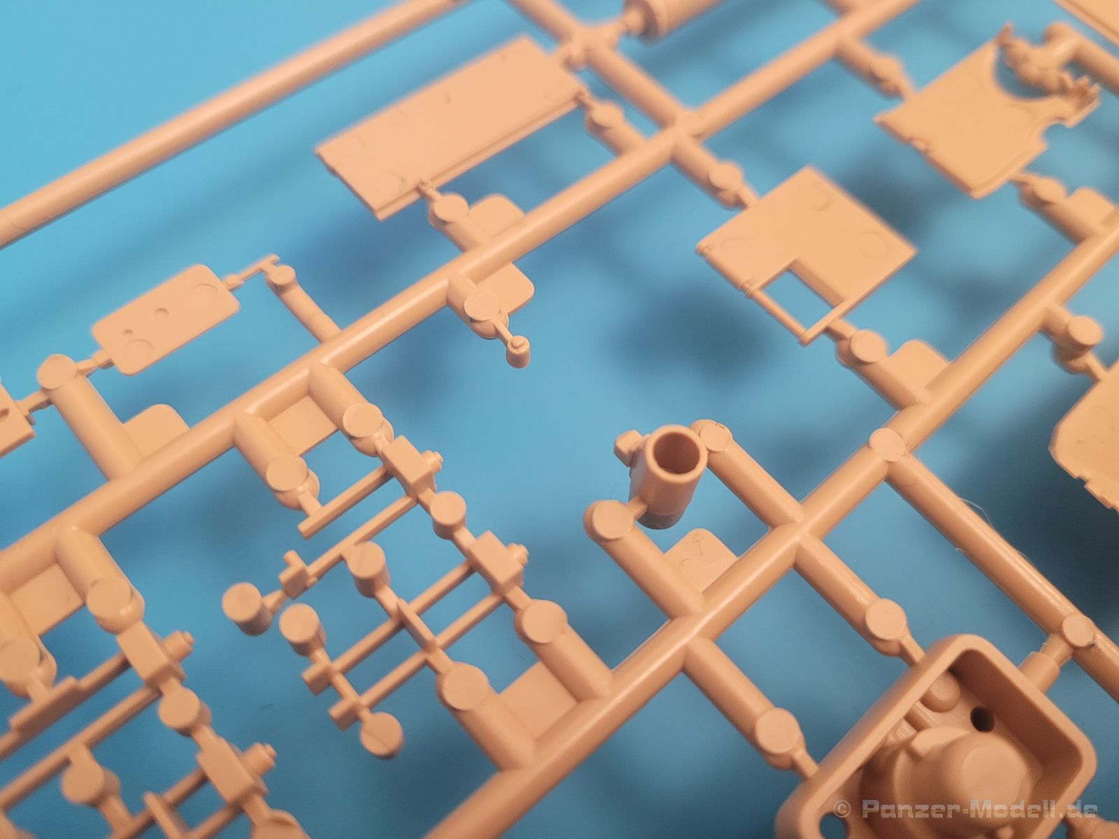 Der Leopard 2A6M CAN ist die kanadische Variante des Kampfpanzers mit Minenschutz Leopard 2A6M. Die ersten 20 Panzer dieser Variante wurden 20 von der deutschen Bundeswehr geliehen, um die Feuerkraft und den Schutz der im Süden Afghanistans operierenden kanadischen Truppen zu erhöhen. Die geliehenen Panzer trugen deutsche MG3 Maschinengewehre und erhielten eine SLAT Abstandspanzerung. Zum Modell: Beim Öffnen des stabilen Stülpkartons finden wir: - Sechzehn Spritzlinge in einem schönen beigen Plastik An den Spritzlingen sind augenscheinlich weder Fischhaut, Grat oder Sinkstellen zu finden, noch sind auffällige Auswerfermarken an später sichtbaren Stellen zu erkennen. Die Unterwanne setzt sich aus mehreren Teilen zusammen, was zum sauberen Arbeiten zwingt. Hier sollte man IMMER trockenanpassen, damit eine optimale Passung gewährleistet ist. An Ober- und Unterwanne sind sehr schöne gestaltete Schweißnähte nachgebildet, wie auch schon bei anderen Bausätzen dieser Marke mit die besten und filigransten welche es bisher in Spritzguss gab. Sämtliche Griffe an der Oberwanne, und davon gibt es viele, sind als Fotoätztele vorhanden. Wer mich kennt, weiß dass ich da sehr kritisch bin, hier frage ich mich nur: WARUM? Die einzelnen Schwingarme des Laufwerks befinden sich auf Drehstäben, diese werden in die Unterwanne eingesteckt und verklebt. Die Erfahrung zeigt, dass sich sich hier eine gute Federung ergibt. Die Laufrollen setzten sich aus den zwei Einzellaufrollen zusammen, welche in der Mitte ein Polycap erhalten. So bleiben auch die Laufrollen beweglich und können zur Bemalung abgenommen werden. Die Ketten befinden sich an drei eigenen Gussästen. Diese bestehen aus je zwei Bolzen mit angegossenen Endverbindern, welche in die Unterseite der einzelnen Kettenglieder gelegt werden, welche sich in einer Montagehilfe befinden. Dann wird das Oberteil des Kettengliedes mit wenig Klebstoff auf das Unterteil geklebt und die Kette bleibt beweglich. Ein recht einfaches, aber effektives System, jedoch ist sauberes Arbeiten hier Pflicht. Für jede Seite werden Dreiundachtzig Kettenglieder benötigt, somit macht der Kettenbau einen Großteil der Arbeit an diesem Bausatz aus. Die SLAT Panzerung macht für Plastikspritzguss einen hervorragenden Eindruck. Der Vergleich mit den vorliegenden Fotos zeigt, das diese fast auf dem Punkt ist. Hier geht es nur noch mit Fotoätzteilen feiner. Der Turm wird mit vielen fein detaillierten Anbauteilen verfeinert, und viele spezielle kanadische Anbauteile werten das Modell auf (Dazu mehr in den Bemerkungen). Die Kanone ist für mich ein Highlight, diese bleibt dank der Polycaps in der Höhe beweglich. Das Rohr wird aus Plastikteilen, einem kleinen Fotoätzteil zusammengebaut und einer fein in 3D gedruckten Mündung zusammengesetzt. Das Ergebnis sieht absolut überzeugend aus, zumal der Rauchabsauger eine realistische Oberflächenstruktur aufweist. Die klar strukturierte Bauanleitung führt in nur fünfunddreißig Schritten zum fertigen Modell und ist nicht überladen. Als Markierungsvarianten steht ein Fahrzeug zur Auswahl. 2007/ 2010 Kandahar Provinz/ Afghanistan, 3rd Canadian Division, 1st Canadian Mechanized Brigade Group, Lord Strathcona's Horse (Royal Canadians)