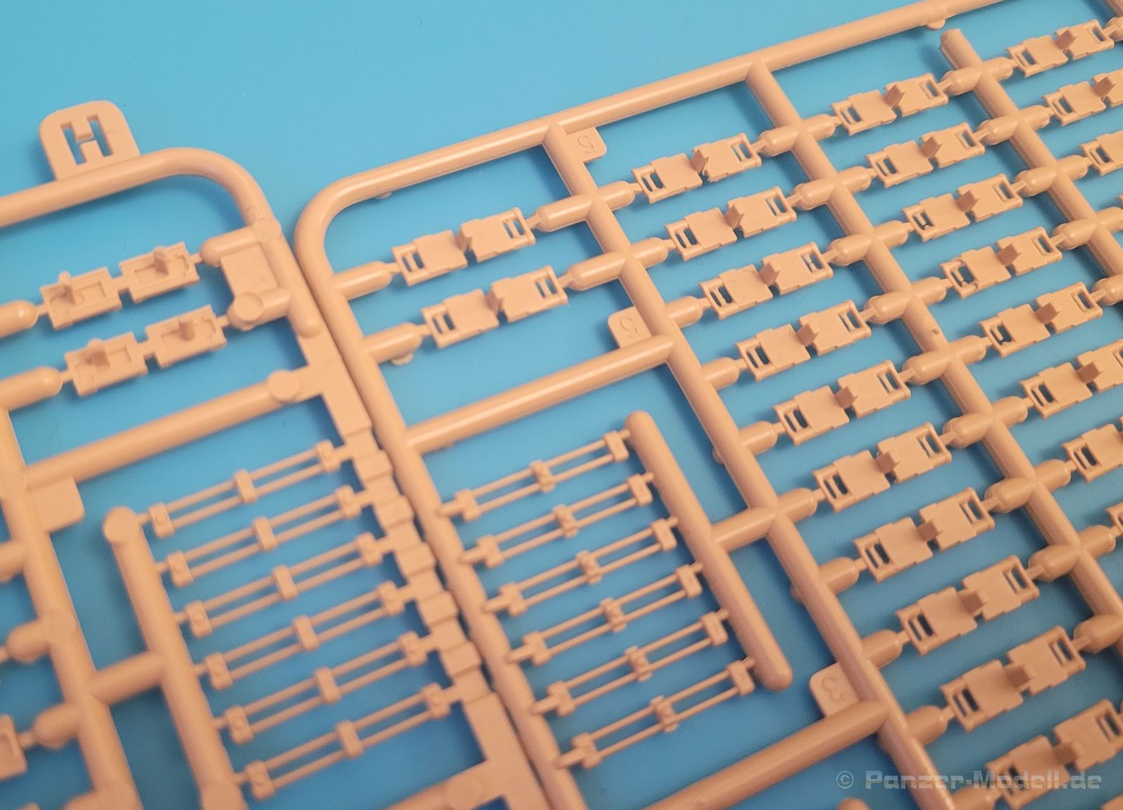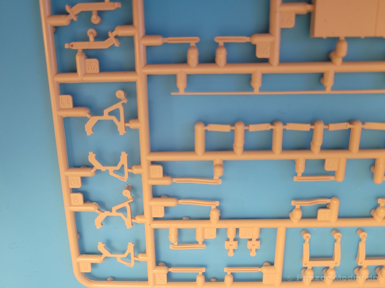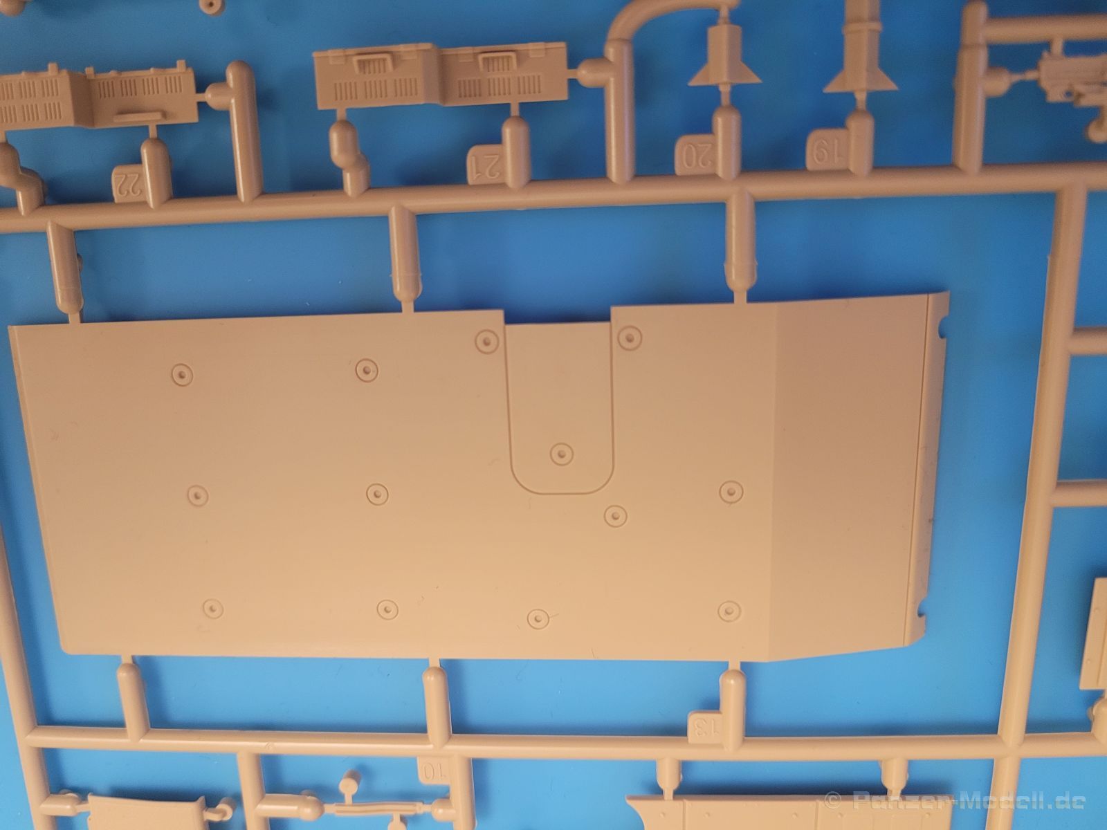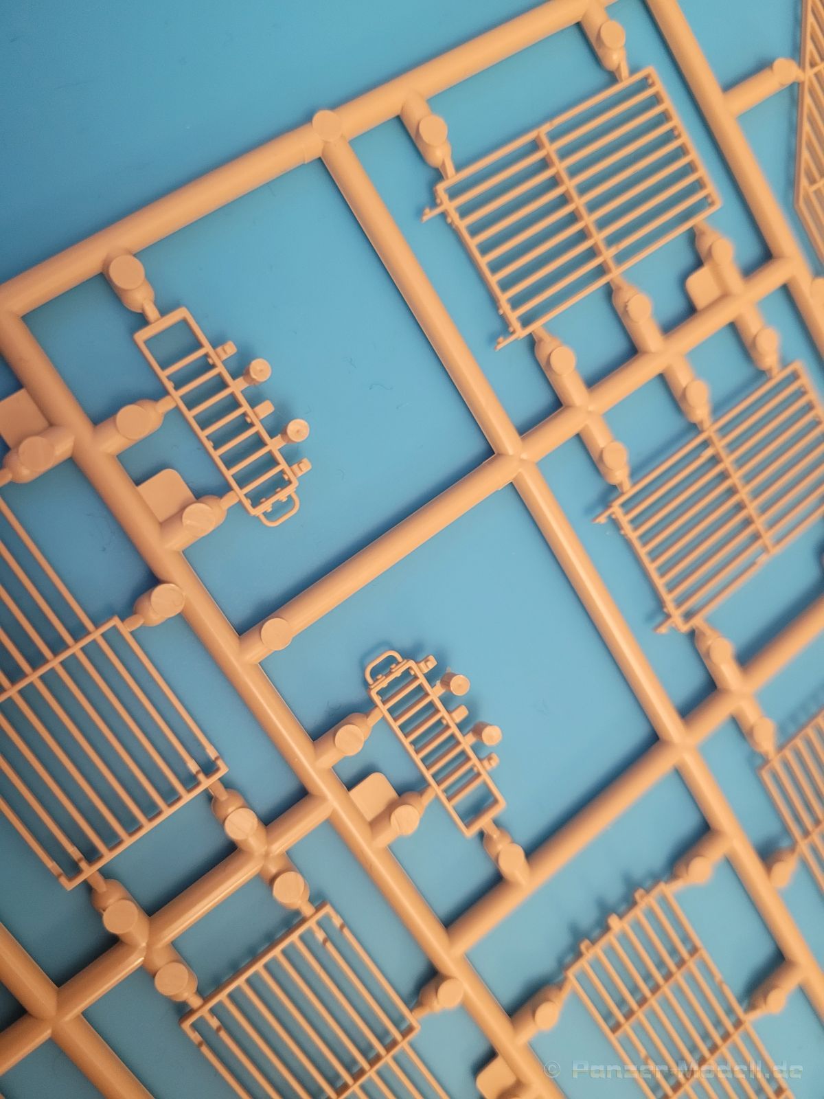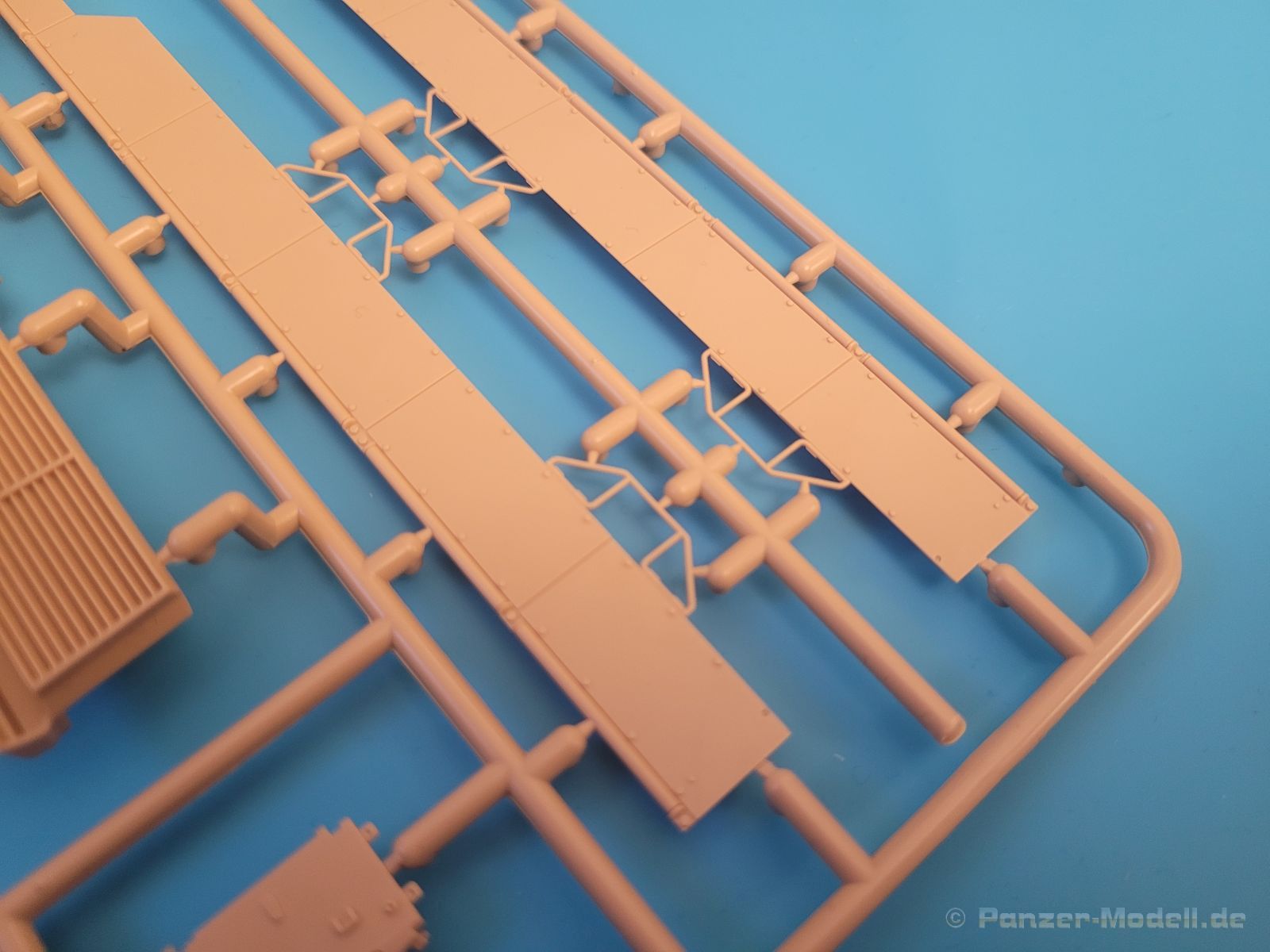 Der Leopard 2A6M CAN ist die kanadische Variante des Kampfpanzers mit Minenschutz Leopard 2A6M. Die ersten 20 Panzer dieser Variante wurden 20 von der deutschen Bundeswehr geliehen, um die Feuerkraft und den Schutz der im Süden Afghanistans operierenden kanadischen Truppen zu erhöhen. Die geliehenen Panzer trugen deutsche MG3 Maschinengewehre und erhielten eine SLAT Abstandspanzerung. Zum Modell: Beim Öffnen des stabilen Stülpkartons finden wir: - Sechzehn Spritzlinge in einem schönen beigen Plastik An den Spritzlingen sind augenscheinlich weder Fischhaut, Grat oder Sinkstellen zu finden, noch sind auffällige Auswerfermarken an später sichtbaren Stellen zu erkennen. Die Unterwanne setzt sich aus mehreren Teilen zusammen, was zum sauberen Arbeiten zwingt. Hier sollte man IMMER trockenanpassen, damit eine optimale Passung gewährleistet ist. An Ober- und Unterwanne sind sehr schöne gestaltete Schweißnähte nachgebildet, wie auch schon bei anderen Bausätzen dieser Marke mit die besten und filigransten welche es bisher in Spritzguss gab. Sämtliche Griffe an der Oberwanne, und davon gibt es viele, sind als Fotoätztele vorhanden. Wer mich kennt, weiß dass ich da sehr kritisch bin, hier frage ich mich nur: WARUM? Die einzelnen Schwingarme des Laufwerks befinden sich auf Drehstäben, diese werden in die Unterwanne eingesteckt und verklebt. Die Erfahrung zeigt, dass sich sich hier eine gute Federung ergibt. Die Laufrollen setzten sich aus den zwei Einzellaufrollen zusammen, welche in der Mitte ein Polycap erhalten. So bleiben auch die Laufrollen beweglich und können zur Bemalung abgenommen werden. Die Ketten befinden sich an drei eigenen Gussästen. Diese bestehen aus je zwei Bolzen mit angegossenen Endverbindern, welche in die Unterseite der einzelnen Kettenglieder gelegt werden, welche sich in einer Montagehilfe befinden. Dann wird das Oberteil des Kettengliedes mit wenig Klebstoff auf das Unterteil geklebt und die Kette bleibt beweglich. Ein recht einfaches, aber effektives System, jedoch ist sauberes Arbeiten hier Pflicht. Für jede Seite werden Dreiundachtzig Kettenglieder benötigt, somit macht der Kettenbau einen Großteil der Arbeit an diesem Bausatz aus. Die SLAT Panzerung macht für Plastikspritzguss einen hervorragenden Eindruck. Der Vergleich mit den vorliegenden Fotos zeigt, das diese fast auf dem Punkt ist. Hier geht es nur noch mit Fotoätzteilen feiner. Der Turm wird mit vielen fein detaillierten Anbauteilen verfeinert, und viele spezielle kanadische Anbauteile werten das Modell auf (Dazu mehr in den Bemerkungen). Die Kanone ist für mich ein Highlight, diese bleibt dank der Polycaps in der Höhe beweglich. Das Rohr wird aus Plastikteilen, einem kleinen Fotoätzteil zusammengebaut und einer fein in 3D gedruckten Mündung zusammengesetzt. Das Ergebnis sieht absolut überzeugend aus, zumal der Rauchabsauger eine realistische Oberflächenstruktur aufweist. Die klar strukturierte Bauanleitung führt in nur fünfunddreißig Schritten zum fertigen Modell und ist nicht überladen. Als Markierungsvarianten steht ein Fahrzeug zur Auswahl. 2007/ 2010 Kandahar Provinz/ Afghanistan, 3rd Canadian Division, 1st Canadian Mechanized Brigade Group, Lord Strathcona's Horse (Royal Canadians)