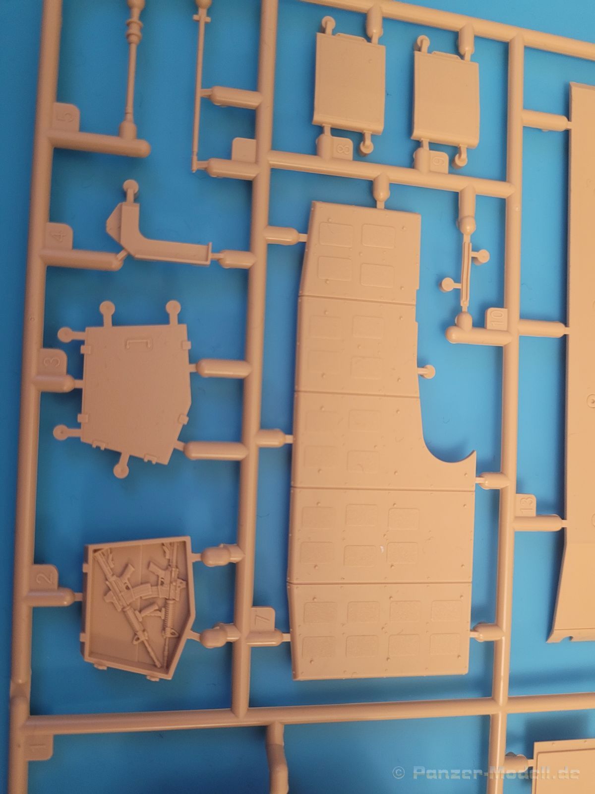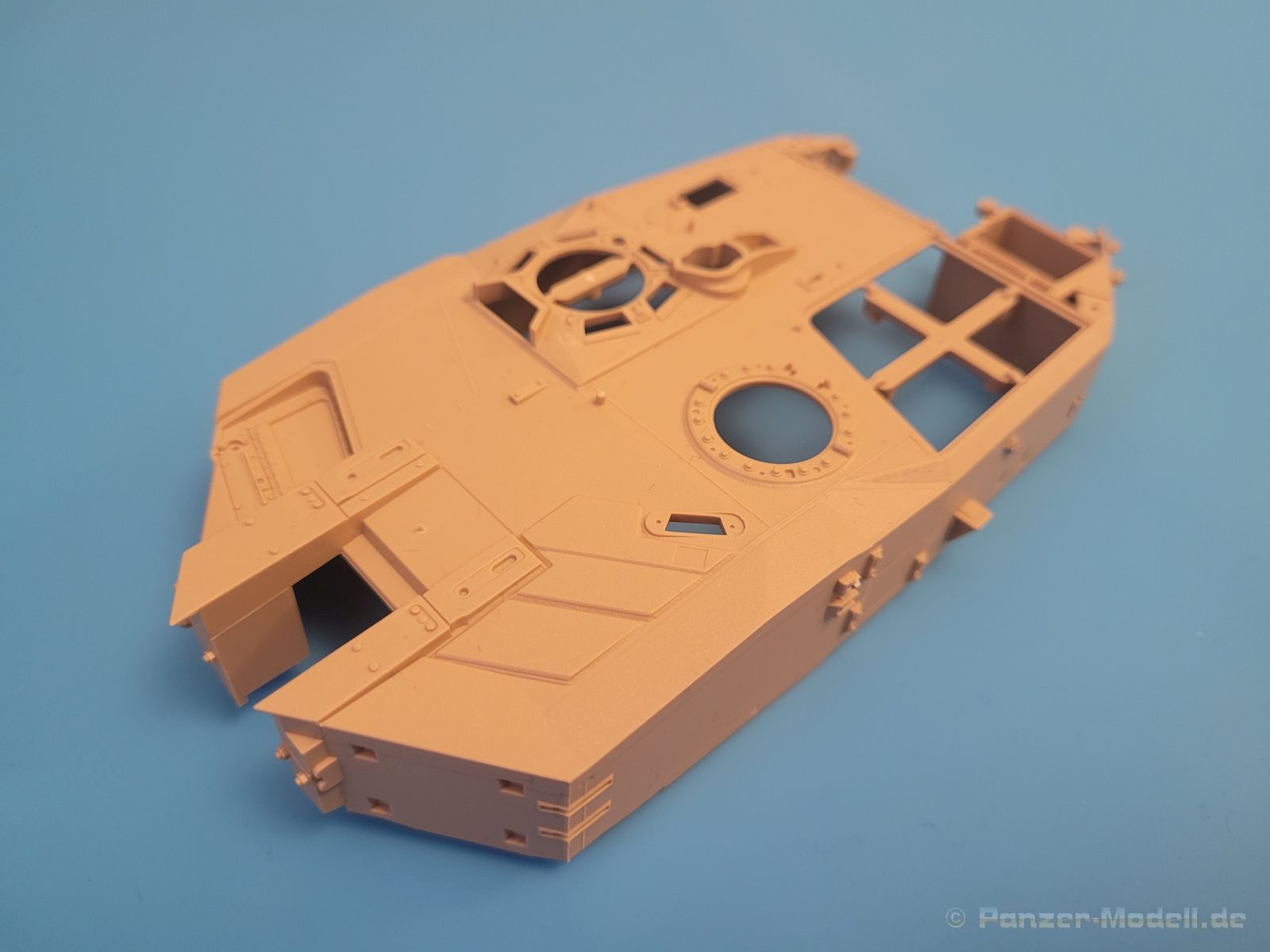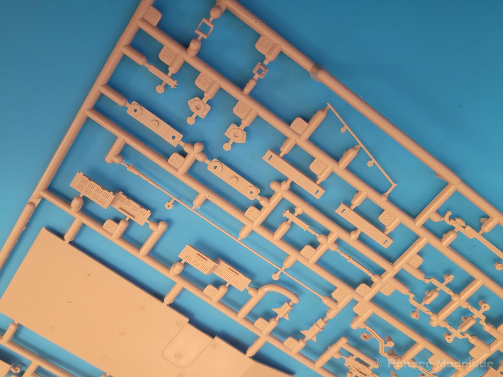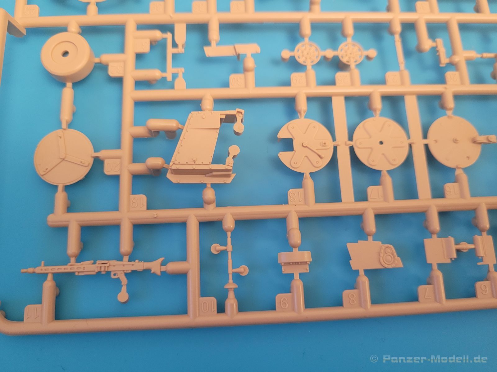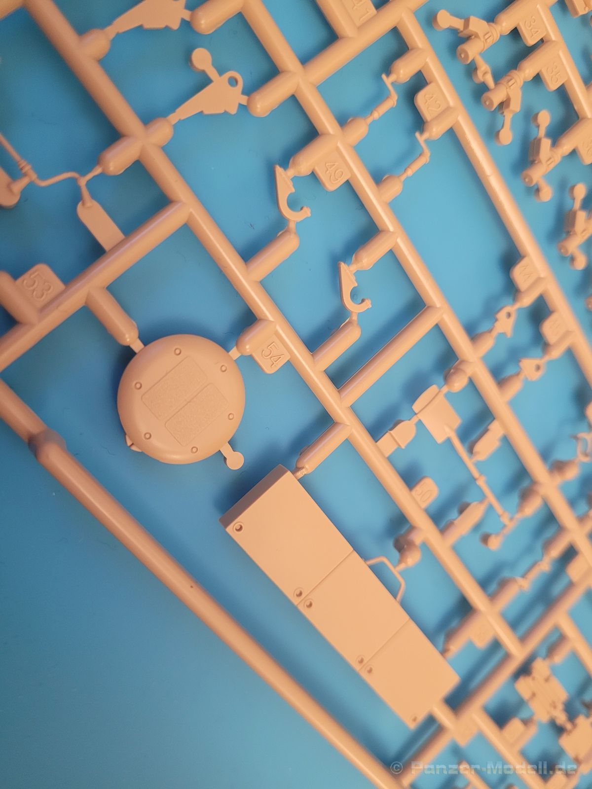 Der Leopard 2A6M CAN ist die kanadische Variante des Kampfpanzers mit Minenschutz Leopard 2A6M. Die ersten 20 Panzer dieser Variante wurden 20 von der deutschen Bundeswehr geliehen, um die Feuerkraft und den Schutz der im Süden Afghanistans operierenden kanadischen Truppen zu erhöhen. Die geliehenen Panzer trugen deutsche MG3 Maschinengewehre und erhielten eine SLAT Abstandspanzerung. Zum Modell: Beim Öffnen des stabilen Stülpkartons finden wir: - Sechzehn Spritzlinge in einem schönen beigen Plastik An den Spritzlingen sind augenscheinlich weder Fischhaut, Grat oder Sinkstellen zu finden, noch sind auffällige Auswerfermarken an später sichtbaren Stellen zu erkennen. Die Unterwanne setzt sich aus mehreren Teilen zusammen, was zum sauberen Arbeiten zwingt. Hier sollte man IMMER trockenanpassen, damit eine optimale Passung gewährleistet ist. An Ober- und Unterwanne sind sehr schöne gestaltete Schweißnähte nachgebildet, wie auch schon bei anderen Bausätzen dieser Marke mit die besten und filigransten welche es bisher in Spritzguss gab. Sämtliche Griffe an der Oberwanne, und davon gibt es viele, sind als Fotoätztele vorhanden. Wer mich kennt, weiß dass ich da sehr kritisch bin, hier frage ich mich nur: WARUM? Die einzelnen Schwingarme des Laufwerks befinden sich auf Drehstäben, diese werden in die Unterwanne eingesteckt und verklebt. Die Erfahrung zeigt, dass sich sich hier eine gute Federung ergibt. Die Laufrollen setzten sich aus den zwei Einzellaufrollen zusammen, welche in der Mitte ein Polycap erhalten. So bleiben auch die Laufrollen beweglich und können zur Bemalung abgenommen werden. Die Ketten befinden sich an drei eigenen Gussästen. Diese bestehen aus je zwei Bolzen mit angegossenen Endverbindern, welche in die Unterseite der einzelnen Kettenglieder gelegt werden, welche sich in einer Montagehilfe befinden. Dann wird das Oberteil des Kettengliedes mit wenig Klebstoff auf das Unterteil geklebt und die Kette bleibt beweglich. Ein recht einfaches, aber effektives System, jedoch ist sauberes Arbeiten hier Pflicht. Für jede Seite werden Dreiundachtzig Kettenglieder benötigt, somit macht der Kettenbau einen Großteil der Arbeit an diesem Bausatz aus. Die SLAT Panzerung macht für Plastikspritzguss einen hervorragenden Eindruck. Der Vergleich mit den vorliegenden Fotos zeigt, das diese fast auf dem Punkt ist. Hier geht es nur noch mit Fotoätzteilen feiner. Der Turm wird mit vielen fein detaillierten Anbauteilen verfeinert, und viele spezielle kanadische Anbauteile werten das Modell auf (Dazu mehr in den Bemerkungen). Die Kanone ist für mich ein Highlight, diese bleibt dank der Polycaps in der Höhe beweglich. Das Rohr wird aus Plastikteilen, einem kleinen Fotoätzteil zusammengebaut und einer fein in 3D gedruckten Mündung zusammengesetzt. Das Ergebnis sieht absolut überzeugend aus, zumal der Rauchabsauger eine realistische Oberflächenstruktur aufweist. Die klar strukturierte Bauanleitung führt in nur fünfunddreißig Schritten zum fertigen Modell und ist nicht überladen. Als Markierungsvarianten steht ein Fahrzeug zur Auswahl. 2007/ 2010 Kandahar Provinz/ Afghanistan, 3rd Canadian Division, 1st Canadian Mechanized Brigade Group, Lord Strathcona's Horse (Royal Canadians)