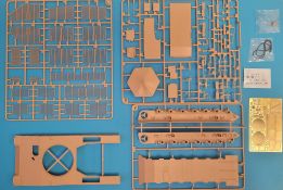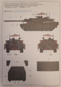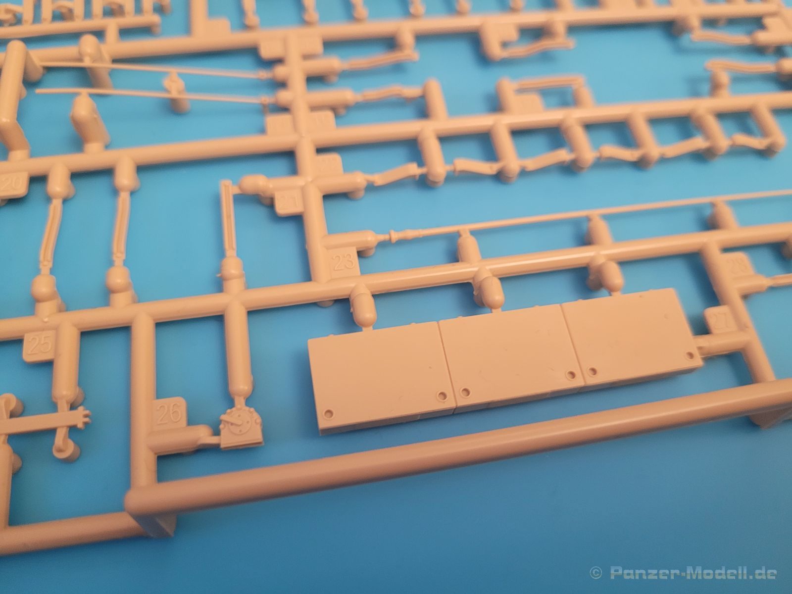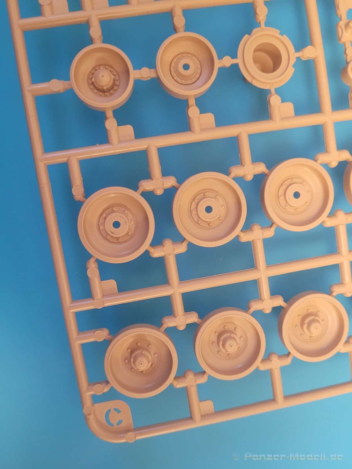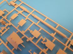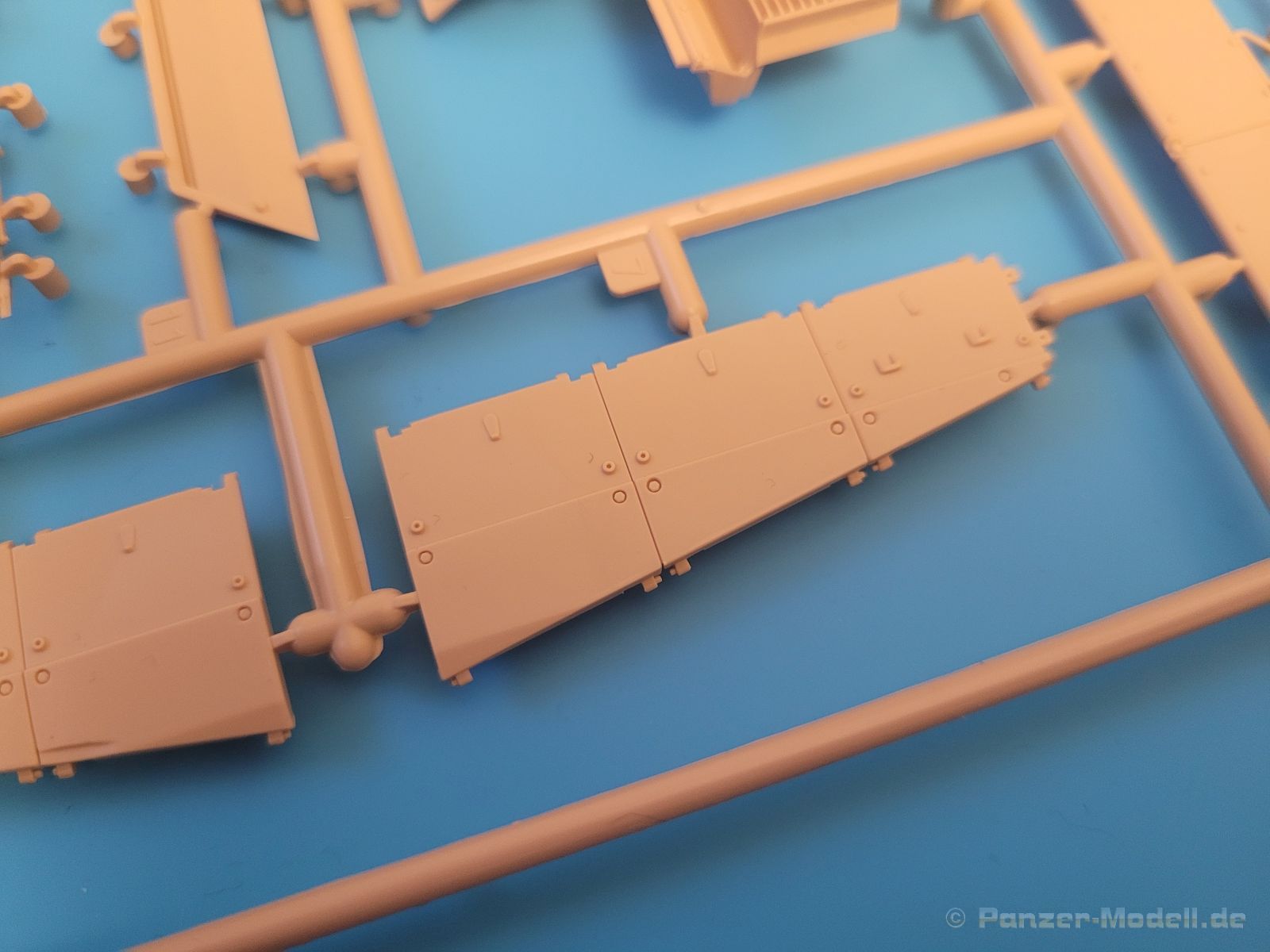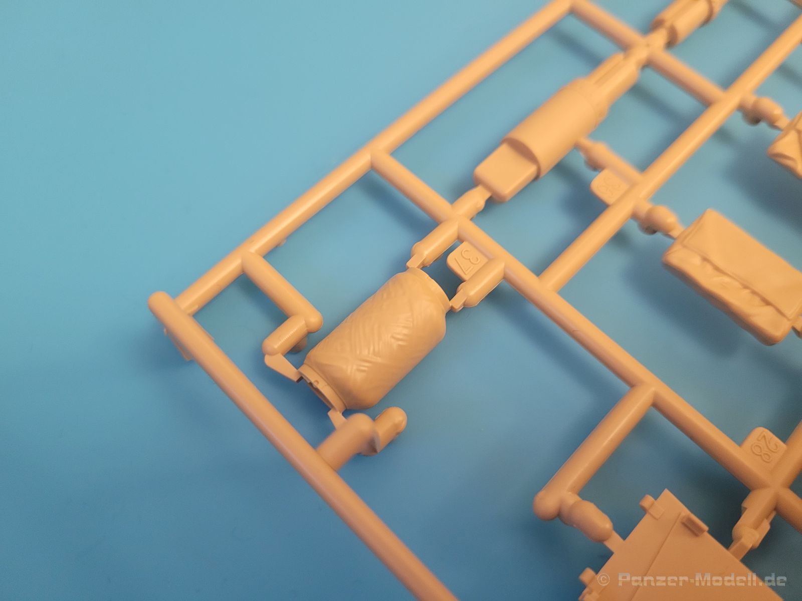 Der Leopard 2A6M CAN ist die kanadische Variante des Kampfpanzers mit Minenschutz Leopard 2A6M. Die ersten 20 Panzer dieser Variante wurden 20 von der deutschen Bundeswehr geliehen, um die Feuerkraft und den Schutz der im Süden Afghanistans operierenden kanadischen Truppen zu erhöhen. Die geliehenen Panzer trugen deutsche MG3 Maschinengewehre und erhielten eine SLAT Abstandspanzerung. Zum Modell: Beim Öffnen des stabilen Stülpkartons finden wir: - Sechzehn Spritzlinge in einem schönen beigen Plastik An den Spritzlingen sind augenscheinlich weder Fischhaut, Grat oder Sinkstellen zu finden, noch sind auffällige Auswerfermarken an später sichtbaren Stellen zu erkennen. Die Unterwanne setzt sich aus mehreren Teilen zusammen, was zum sauberen Arbeiten zwingt. Hier sollte man IMMER trockenanpassen, damit eine optimale Passung gewährleistet ist. An Ober- und Unterwanne sind sehr schöne gestaltete Schweißnähte nachgebildet, wie auch schon bei anderen Bausätzen dieser Marke mit die besten und filigransten welche es bisher in Spritzguss gab. Sämtliche Griffe an der Oberwanne, und davon gibt es viele, sind als Fotoätztele vorhanden. Wer mich kennt, weiß dass ich da sehr kritisch bin, hier frage ich mich nur: WARUM? Die einzelnen Schwingarme des Laufwerks befinden sich auf Drehstäben, diese werden in die Unterwanne eingesteckt und verklebt. Die Erfahrung zeigt, dass sich sich hier eine gute Federung ergibt. Die Laufrollen setzten sich aus den zwei Einzellaufrollen zusammen, welche in der Mitte ein Polycap erhalten. So bleiben auch die Laufrollen beweglich und können zur Bemalung abgenommen werden. Die Ketten befinden sich an drei eigenen Gussästen. Diese bestehen aus je zwei Bolzen mit angegossenen Endverbindern, welche in die Unterseite der einzelnen Kettenglieder gelegt werden, welche sich in einer Montagehilfe befinden. Dann wird das Oberteil des Kettengliedes mit wenig Klebstoff auf das Unterteil geklebt und die Kette bleibt beweglich. Ein recht einfaches, aber effektives System, jedoch ist sauberes Arbeiten hier Pflicht. Für jede Seite werden Dreiundachtzig Kettenglieder benötigt, somit macht der Kettenbau einen Großteil der Arbeit an diesem Bausatz aus. Die SLAT Panzerung macht für Plastikspritzguss einen hervorragenden Eindruck. Der Vergleich mit den vorliegenden Fotos zeigt, das diese fast auf dem Punkt ist. Hier geht es nur noch mit Fotoätzteilen feiner. Der Turm wird mit vielen fein detaillierten Anbauteilen verfeinert, und viele spezielle kanadische Anbauteile werten das Modell auf (Dazu mehr in den Bemerkungen). Die Kanone ist für mich ein Highlight, diese bleibt dank der Polycaps in der Höhe beweglich. Das Rohr wird aus Plastikteilen, einem kleinen Fotoätzteil zusammengebaut und einer fein in 3D gedruckten Mündung zusammengesetzt. Das Ergebnis sieht absolut überzeugend aus, zumal der Rauchabsauger eine realistische Oberflächenstruktur aufweist. Die klar strukturierte Bauanleitung führt in nur fünfunddreißig Schritten zum fertigen Modell und ist nicht überladen. Als Markierungsvarianten steht ein Fahrzeug zur Auswahl. 2007/ 2010 Kandahar Provinz/ Afghanistan, 3rd Canadian Division, 1st Canadian Mechanized Brigade Group, Lord Strathcona's Horse (Royal Canadians)