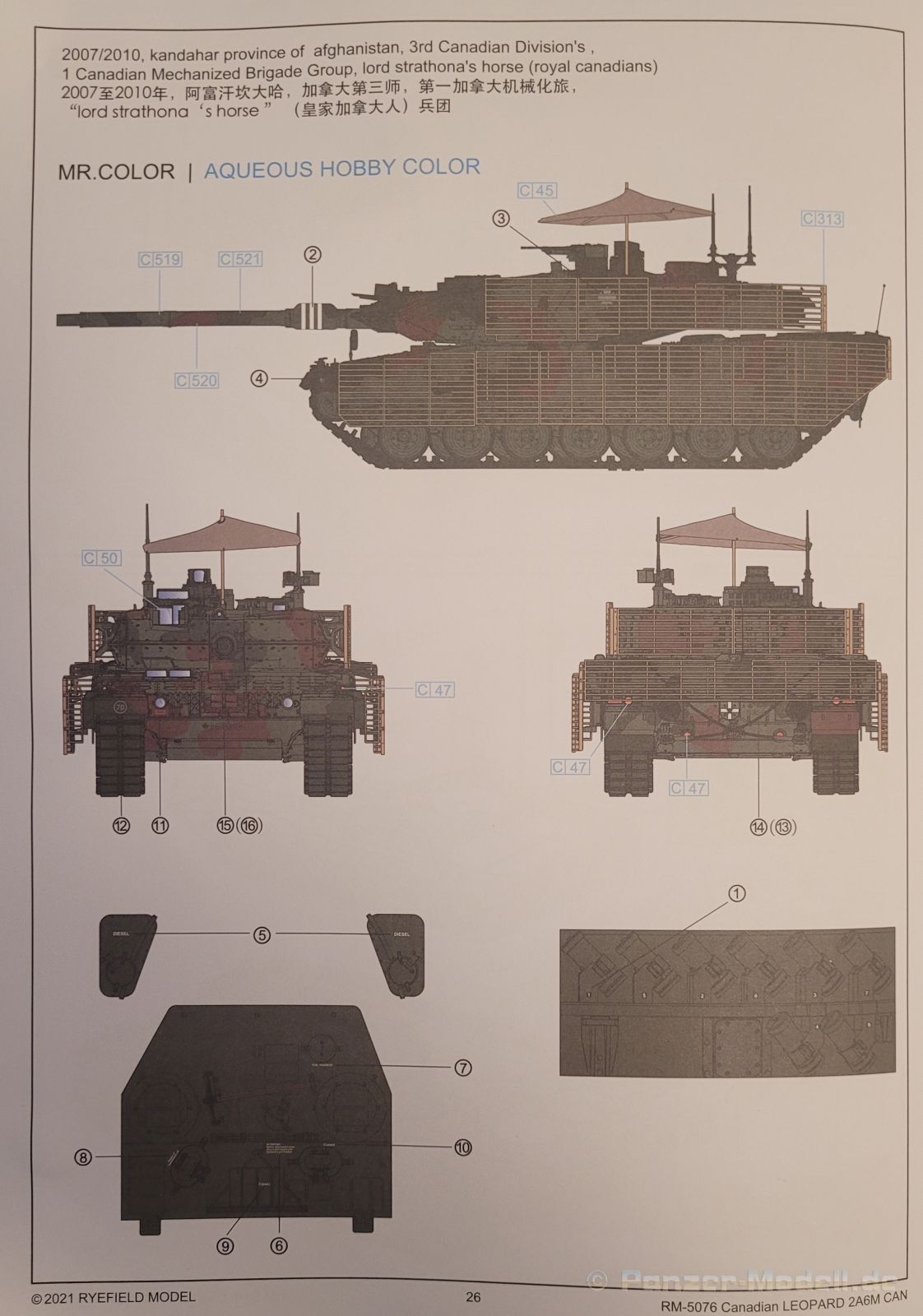 Die Farbangaben beziehen sich nur auf die Farben und Alterungsmittel von Mr. Color. Der versierte Modellbauer wird allerdings auch hier auf die Produkte des Farbherstellers seiner Wahl zurückgreifen. Noch ein paar Bemerkungen: Eine schöne Bilderstrecke befindet sich hier: https://www.panzer-modell.de/referenz/in_detail/leo2a6m_can/leo2a6m.htm Sollte man ein spätes Fahrzeug mit all den (bei der frühen Version) weggelassenen Bauteilen bauen wollen, muss man die Barracuda Tarnung entweder selbst gestalten, oder man greift auf ein Zurüstset zurück. Mein Fazit: Ein hervorragender Bausatz, bei dem auf die genutzten Anbauteile geachtet werden sollte