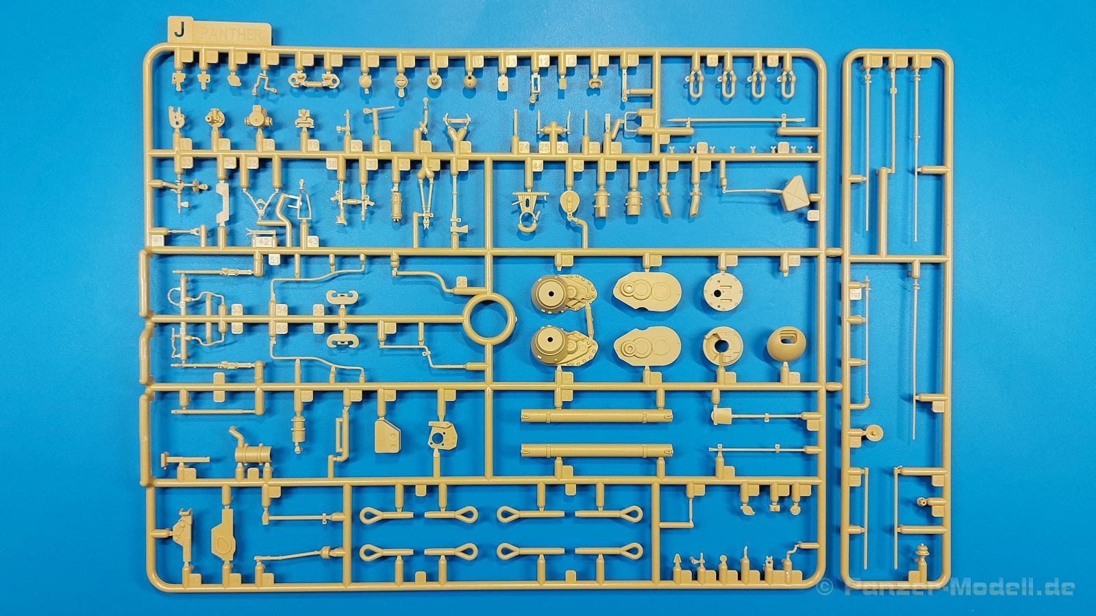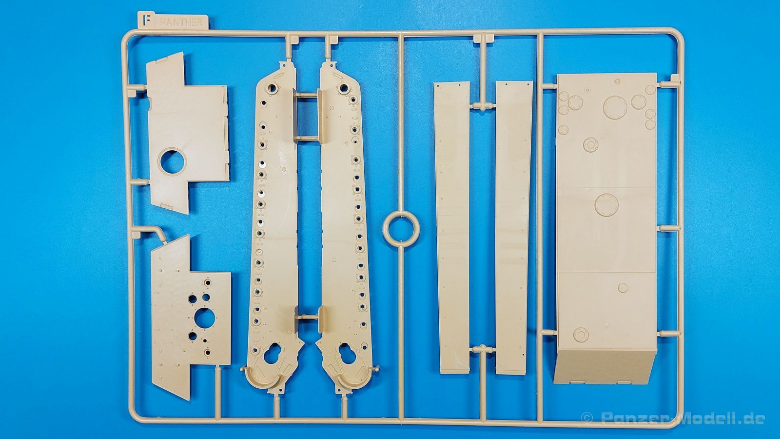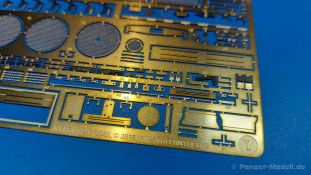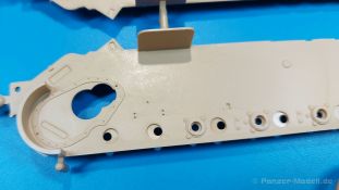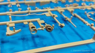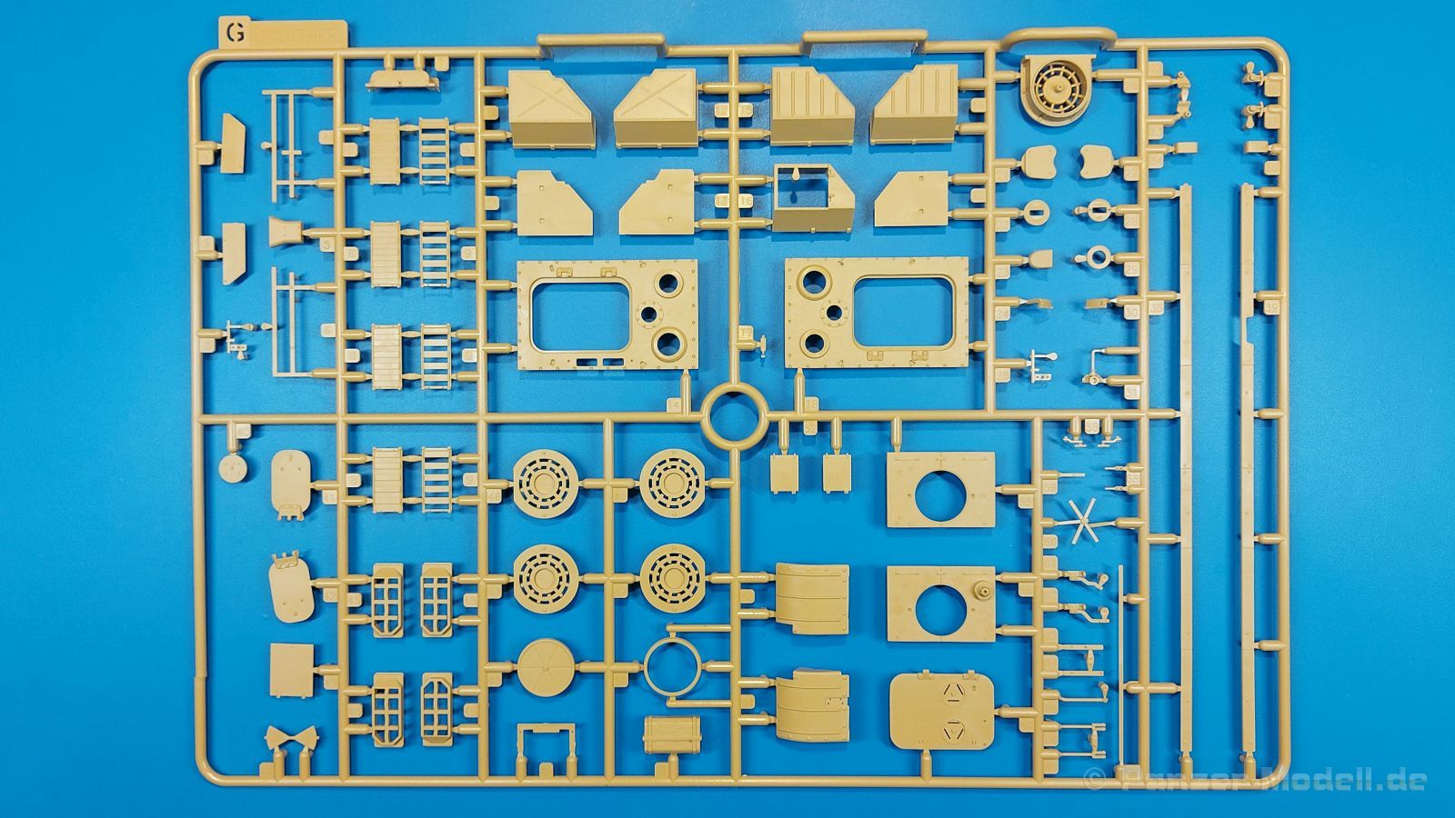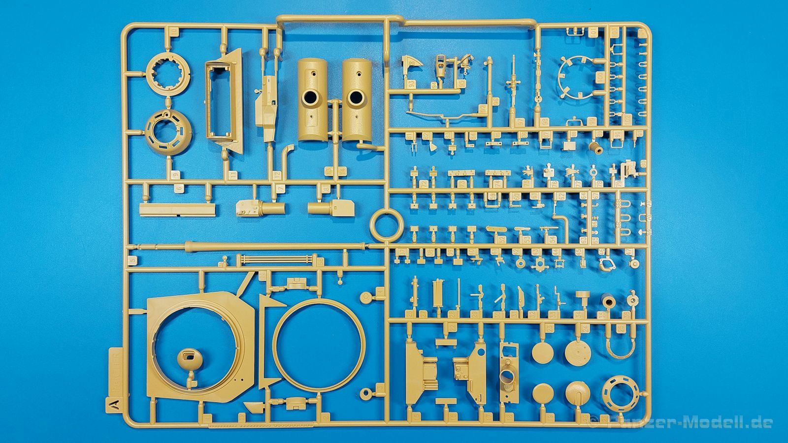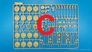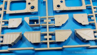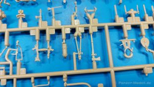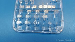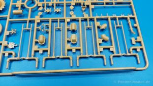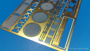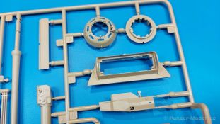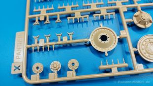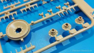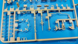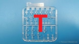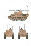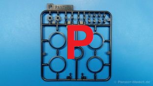 Der deutsche Panzerkampfwagen V Panther war im zweiten Weltkrieg die Antwort auf den T-34 der Sowjets. Erste Designs sahen sogar fast wie ein T-34 mit Schachtellaufwerk aus. Anders als die üblichen deutschen Panzer hatte er eine abgeschrägte Panzerung. Seine Kaliber 7,5 cm Kampfwagenkanone 42 mit 70 Kaliberlängen konnte je nach verwendeter Munition selbst auf 2.000 Meter Entfernung noch Panzerungen von 89-106 mm durchschlagen. Als Sekundärbewaffnung standen 7,92mm MG34 zur Verfügung. Trotz seines, für einen mittleren Panzer hohen Gewichts von fast 45 Tonnen konnte er mit dem 700 PS Maybach Motor eine Höchstgeschwindigkeit bis zu 55 km/h erreichen. Seine Besatzung bestand aus dem Kommandanten, Richt-, Ladeschütze, Funker und Fahrer. Varianten des Panthers waren Befehlspanther, Bergepanther und Jagdpanther, aber es wurden noch weitere entwickelt, die teils bis ins Prototypen Stadium vorrankamen. Der Panther war an allen europäischen Fronten eingesetzt. Etliche Exemplare überlebten den Krieg und sind, teils sogar fahrbereit, in Museen zu sehen. Der Bausatz: Gleichzeitig mit einem anderen Hersteller setzte Rye Field Models 2018, unter anderem durch eine vollständige Inneneinrichtung, neue Maßstäbe im âPantherbauâ. Auf Basis dieses fantastischen Modells entstanden weitere, auch ohne Inneneinrichtung. Auch der heutige Befehlspanther enthält Teile des Interior Modells, wie man an den Innenseiten mancher Teile erkennen kann. Der weiße Stülpdeckelkarton zeigt einen farbigen Seitenriss eines Befehlspanthers mit drei aufgestellten Antennen. An einer Seite sind Bauvarianten (mit und ohne Kampfraumheizung, Antennenvariationen, offene oder geschlossene Luken) zu sehen, auf der anderen Markierungsvarianten. Der Karton ist 380 x 240 x 90 mm groß und enthält neun sandgelbe Spritzlinge, einen Klarsichtspritzling, einen schwarzen Vinylspritzling, ein Tütchen mit silbergrauen Spritzlingen, jeder mit zwei Kettengliedern, zwei Fotoätzteil-Platinen, ein kleines Decalblatt und die Bauanleitung. Die Spritzlinge sind einwandfrei, die Teile ohne Versatz oder Sinkstellen. Details sind scharf und gut herausgearbeitet. Es gibt einige sichtbare Auswerferspuren, aber sie befinden sich auf Innen- und Unterseiten von Teilen und können größtenteils ignoriert werden. Auch der Vinylspritzling ist sehr sauber ausgespritzt, ohne Fischhäute und mit sehr scharfen Details, die man bei dem weichen Material vielleicht nicht so erwartet. Die Unterwanne setzt sich aus Bodenplatte, den Seitenwänden, sowie Heckwand und Bugplatten zusammen und weisen bereits angegossene, beeindruckende Details auf. Die Schwingarmhülsen werden einzeln und nach rechts und links getrennt in die Wanne eingeklebt. Auch diese zeigen sehr schöne Details, auch wenn sie nicht zur Präsentation gedacht sind ob des fehlenden Interieurs. Die Schwingarme werden einzeln eingesteckt und können entweder mit der angegossenen Passnase fest eingebaut werden oder, durch entfernen der Passnase, schwingend eingebaut werden, um die Federung zu simulieren, bzw. bei Einbau des Modells in ein unebenes Diorama die eingefederten Laufrollen darzustellen. Die Laufrollen machen einen hervorragenden Eindruck mit sehr feinen Details der Radmuttern und Gummierung mit ultrarealistischen Herstelleraufdrucken. Zusätzlich gibt es Laufrollen ohne Gummierung, um z.B. beschädigte Laufrollen ohne Gummierung darzustellen, bzw. mit aufsteckbarer Gummierung aus schwarzem Weichplastik und zwei Stahllaufrollen für die letzten Radstation, die aber für die Befehlsversion gemäß Anleitung nicht benötigt werden. Die Ketten sind klasse, denn die Einzelglieder haben jeweils nur zwei Angüsse und haben die Führungszähne bereits mit angegossen - und trotzdem ist die Detailqualität der Glieder mit Durchbrüchen und feinen Gussnummern sehr gut, wenn auch pro Glied eine flache Auswerfermarke mittig auf der Innenseite vorhanden ist. Die Kettenglieder werden mittels einer Montagehilfe beweglich zusammengesteckt und durch Kettenbolzen gesichert. Die Kettenbolzen sind jeweils zu Fünferblöcken gegossen, werden eingesteckt und dann erst von Gussast getrennt. Innen- und Außenbolzen sind unterschiedlich, also aufmerksam arbeiten. Eisgreifer für die Kette liegen ebenso bei wie ein Kettenwerkzeug aus PE, mit dem man eine Kettenmontage simulieren kann, wenn man die Brechstange von seinen Halterungen befreit. Ich sehe schon einen MiniArt Soldaten bei den Kettenarbeiten! Die Decals sind sauber gedruckt und seidenmatt glänzend, mit wenig Trägerrand. Der Trägerfilm ist angenehm dünn. Es gibt zwei Decaloptionen: