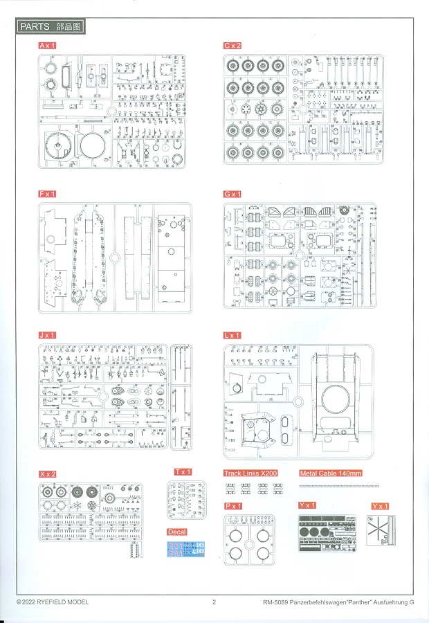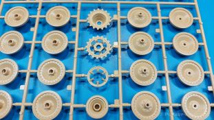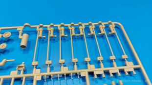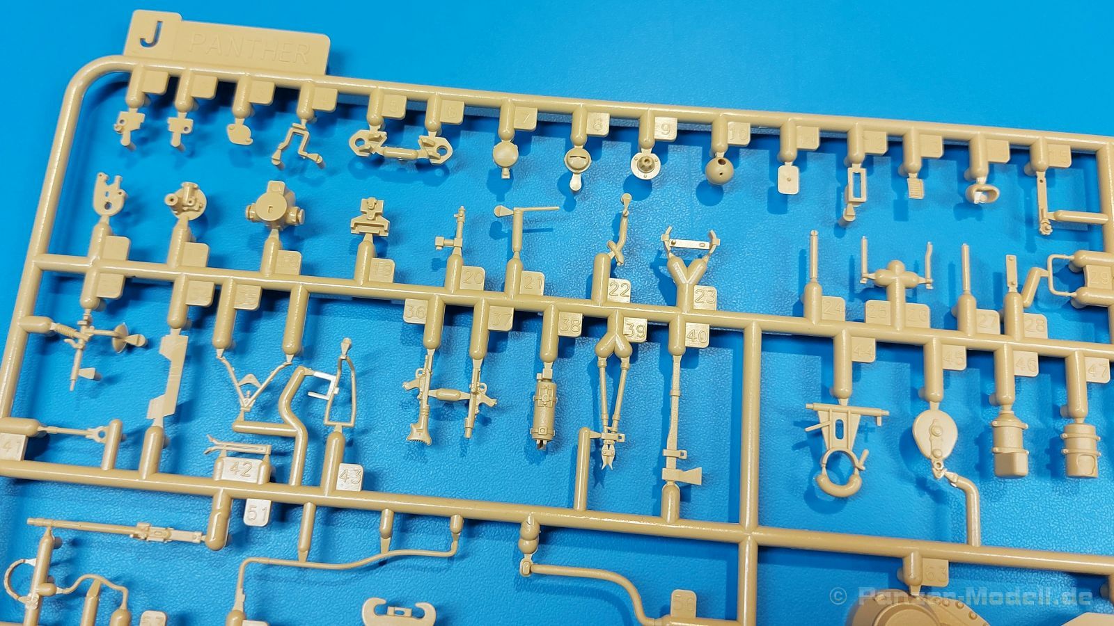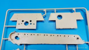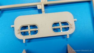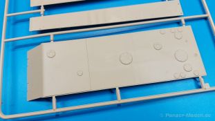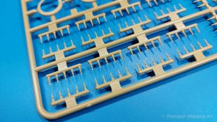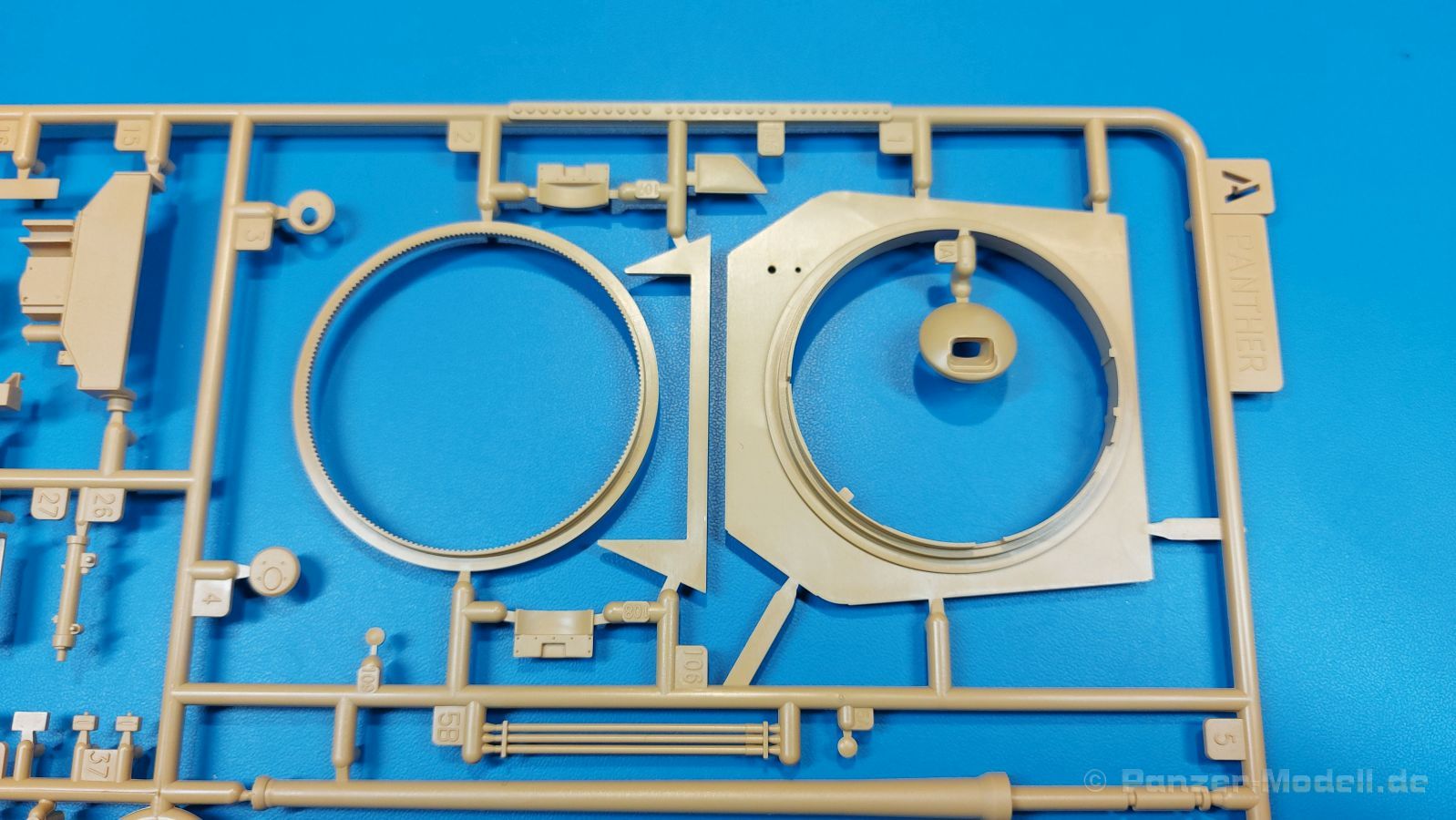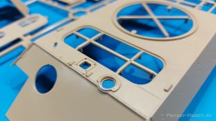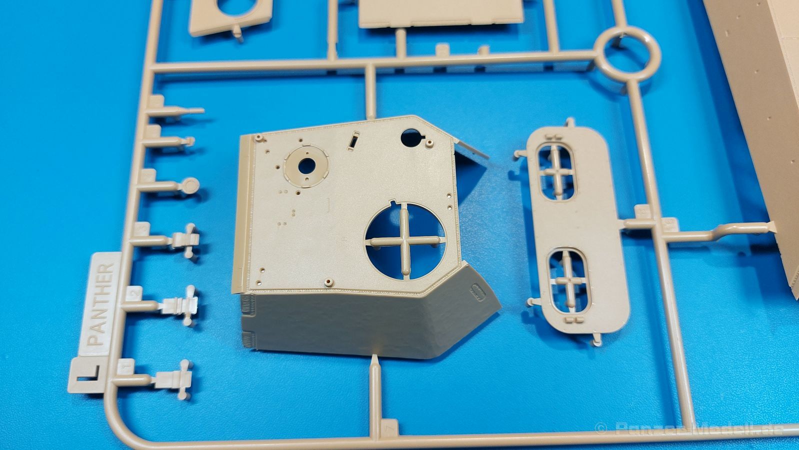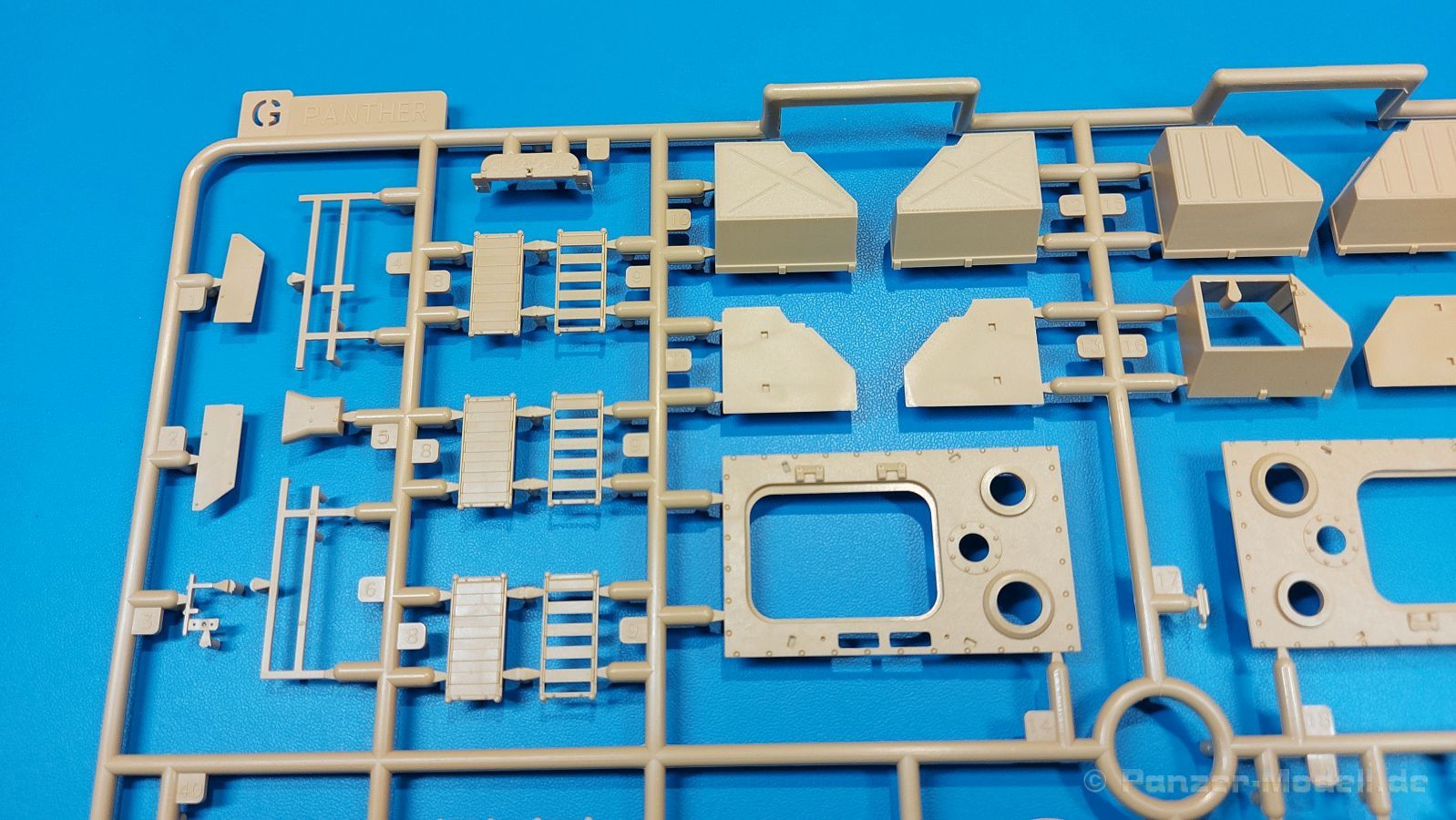 Der deutsche Panzerkampfwagen V Panther war im zweiten Weltkrieg die Antwort auf den T-34 der Sowjets. Erste Designs sahen sogar fast wie ein T-34 mit Schachtellaufwerk aus. Anders als die üblichen deutschen Panzer hatte er eine abgeschrägte Panzerung. Seine Kaliber 7,5 cm Kampfwagenkanone 42 mit 70 Kaliberlängen konnte je nach verwendeter Munition selbst auf 2.000 Meter Entfernung noch Panzerungen von 89-106 mm durchschlagen. Als Sekundärbewaffnung standen 7,92mm MG34 zur Verfügung. Trotz seines, für einen mittleren Panzer hohen Gewichts von fast 45 Tonnen konnte er mit dem 700 PS Maybach Motor eine Höchstgeschwindigkeit bis zu 55 km/h erreichen. Seine Besatzung bestand aus dem Kommandanten, Richt-, Ladeschütze, Funker und Fahrer. Varianten des Panthers waren Befehlspanther, Bergepanther und Jagdpanther, aber es wurden noch weitere entwickelt, die teils bis ins Prototypen Stadium vorrankamen. Der Panther war an allen europäischen Fronten eingesetzt. Etliche Exemplare überlebten den Krieg und sind, teils sogar fahrbereit, in Museen zu sehen. Der Bausatz: Gleichzeitig mit einem anderen Hersteller setzte Rye Field Models 2018, unter anderem durch eine vollständige Inneneinrichtung, neue Maßstäbe im âPantherbauâ. Auf Basis dieses fantastischen Modells entstanden weitere, auch ohne Inneneinrichtung. Auch der heutige Befehlspanther enthält Teile des Interior Modells, wie man an den Innenseiten mancher Teile erkennen kann. Der weiße Stülpdeckelkarton zeigt einen farbigen Seitenriss eines Befehlspanthers mit drei aufgestellten Antennen. An einer Seite sind Bauvarianten (mit und ohne Kampfraumheizung, Antennenvariationen, offene oder geschlossene Luken) zu sehen, auf der anderen Markierungsvarianten. Der Karton ist 380 x 240 x 90 mm groß und enthält neun sandgelbe Spritzlinge, einen Klarsichtspritzling, einen schwarzen Vinylspritzling, ein Tütchen mit silbergrauen Spritzlingen, jeder mit zwei Kettengliedern, zwei Fotoätzteil-Platinen, ein kleines Decalblatt und die Bauanleitung. Die Spritzlinge sind einwandfrei, die Teile ohne Versatz oder Sinkstellen. Details sind scharf und gut herausgearbeitet. Es gibt einige sichtbare Auswerferspuren, aber sie befinden sich auf Innen- und Unterseiten von Teilen und können größtenteils ignoriert werden. Auch der Vinylspritzling ist sehr sauber ausgespritzt, ohne Fischhäute und mit sehr scharfen Details, die man bei dem weichen Material vielleicht nicht so erwartet. Die Unterwanne setzt sich aus Bodenplatte, den Seitenwänden, sowie Heckwand und Bugplatten zusammen und weisen bereits angegossene, beeindruckende Details auf. Die Schwingarmhülsen werden einzeln und nach rechts und links getrennt in die Wanne eingeklebt. Auch diese zeigen sehr schöne Details, auch wenn sie nicht zur Präsentation gedacht sind ob des fehlenden Interieurs. Die Schwingarme werden einzeln eingesteckt und können entweder mit der angegossenen Passnase fest eingebaut werden oder, durch entfernen der Passnase, schwingend eingebaut werden, um die Federung zu simulieren, bzw. bei Einbau des Modells in ein unebenes Diorama die eingefederten Laufrollen darzustellen. Die Laufrollen machen einen hervorragenden Eindruck mit sehr feinen Details der Radmuttern und Gummierung mit ultrarealistischen Herstelleraufdrucken. Zusätzlich gibt es Laufrollen ohne Gummierung, um z.B. beschädigte Laufrollen ohne Gummierung darzustellen, bzw. mit aufsteckbarer Gummierung aus schwarzem Weichplastik und zwei Stahllaufrollen für die letzten Radstation, die aber für die Befehlsversion gemäß Anleitung nicht benötigt werden. Die Ketten sind klasse, denn die Einzelglieder haben jeweils nur zwei Angüsse und haben die Führungszähne bereits mit angegossen - und trotzdem ist die Detailqualität der Glieder mit Durchbrüchen und feinen Gussnummern sehr gut, wenn auch pro Glied eine flache Auswerfermarke mittig auf der Innenseite vorhanden ist. Die Kettenglieder werden mittels einer Montagehilfe beweglich zusammengesteckt und durch Kettenbolzen gesichert. Die Kettenbolzen sind jeweils zu Fünferblöcken gegossen, werden eingesteckt und dann erst von Gussast getrennt. Innen- und Außenbolzen sind unterschiedlich, also aufmerksam arbeiten. Eisgreifer für die Kette liegen ebenso bei wie ein Kettenwerkzeug aus PE, mit dem man eine Kettenmontage simulieren kann, wenn man die Brechstange von seinen Halterungen befreit. Ich sehe schon einen MiniArt Soldaten bei den Kettenarbeiten! Die Decals sind sauber gedruckt und seidenmatt glänzend, mit wenig Trägerrand. Der Trägerfilm ist angenehm dünn. Es gibt zwei Decaloptionen: