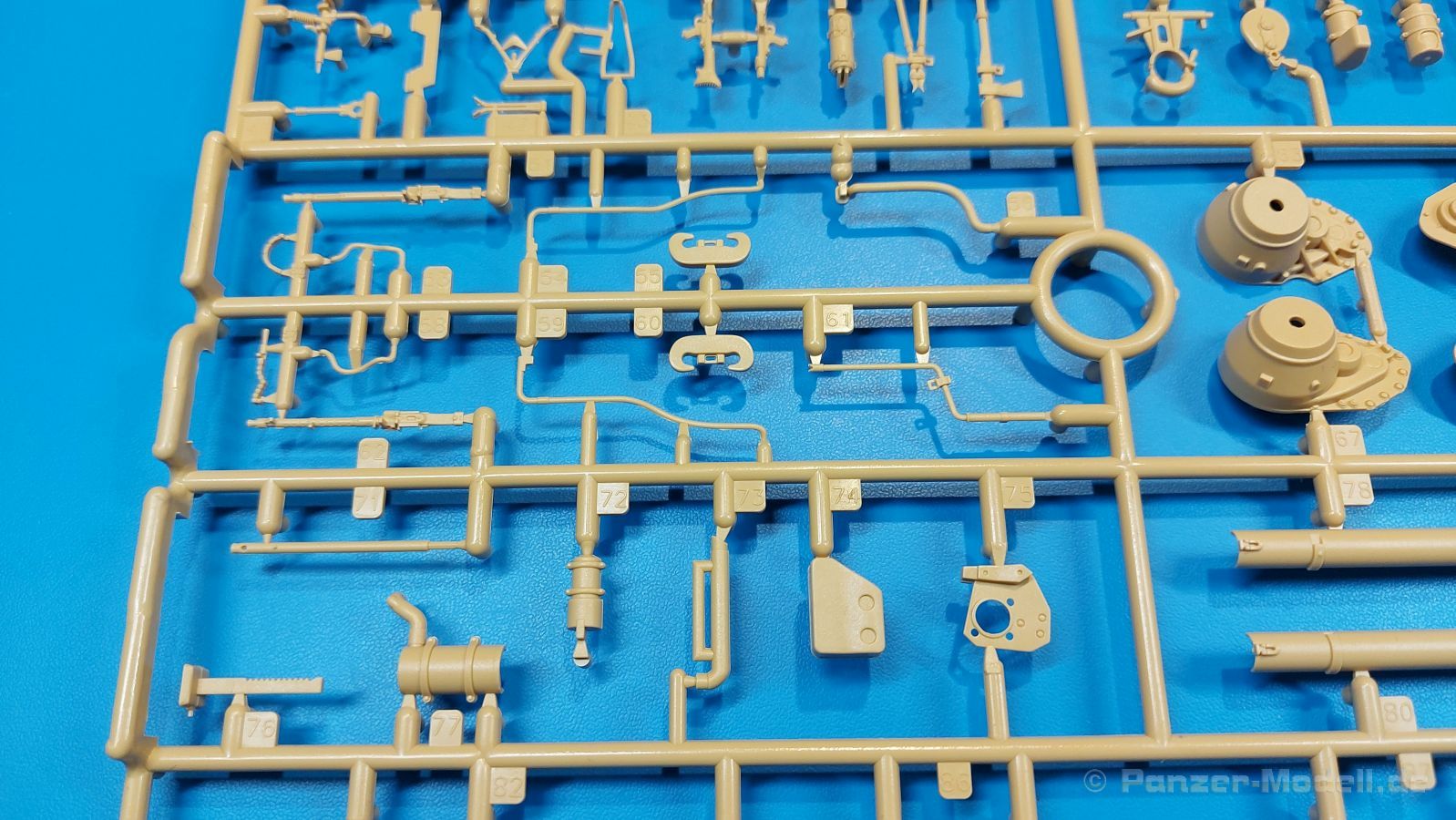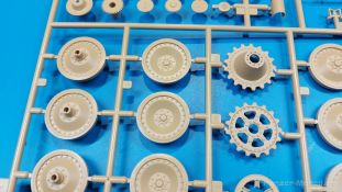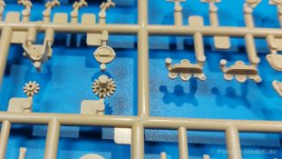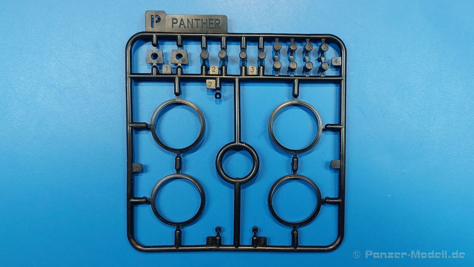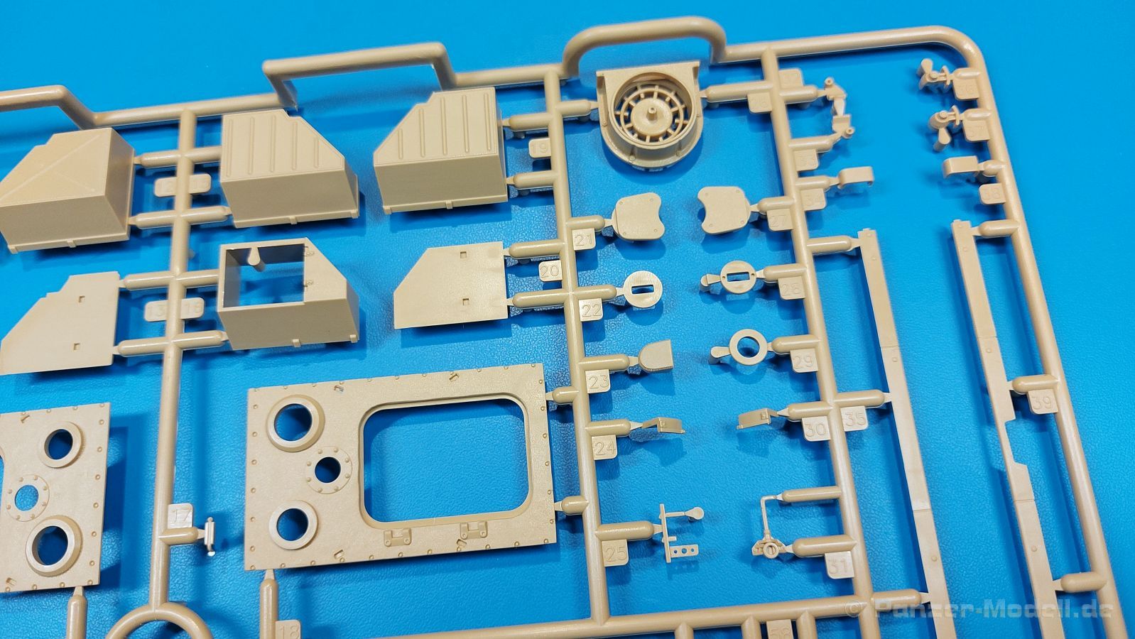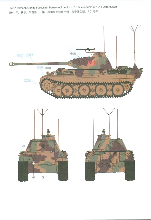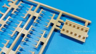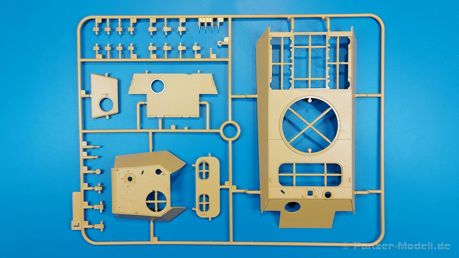 Der deutsche Panzerkampfwagen V Panther war im zweiten Weltkrieg die Antwort auf den T-34 der Sowjets. Erste Designs sahen sogar fast wie ein T-34 mit Schachtellaufwerk aus. Anders als die üblichen deutschen Panzer hatte er eine abgeschrägte Panzerung. Seine Kaliber 7,5 cm Kampfwagenkanone 42 mit 70 Kaliberlängen konnte je nach verwendeter Munition selbst auf 2.000 Meter Entfernung noch Panzerungen von 89-106 mm durchschlagen. Als Sekundärbewaffnung standen 7,92mm MG34 zur Verfügung. Trotz seines, für einen mittleren Panzer hohen Gewichts von fast 45 Tonnen konnte er mit dem 700 PS Maybach Motor eine Höchstgeschwindigkeit bis zu 55 km/h erreichen. Seine Besatzung bestand aus dem Kommandanten, Richt-, Ladeschütze, Funker und Fahrer. Varianten des Panthers waren Befehlspanther, Bergepanther und Jagdpanther, aber es wurden noch weitere entwickelt, die teils bis ins Prototypen Stadium vorrankamen. Der Panther war an allen europäischen Fronten eingesetzt. Etliche Exemplare überlebten den Krieg und sind, teils sogar fahrbereit, in Museen zu sehen. Der Bausatz: Gleichzeitig mit einem anderen Hersteller setzte Rye Field Models 2018, unter anderem durch eine vollständige Inneneinrichtung, neue Maßstäbe im âPantherbauâ. Auf Basis dieses fantastischen Modells entstanden weitere, auch ohne Inneneinrichtung. Auch der heutige Befehlspanther enthält Teile des Interior Modells, wie man an den Innenseiten mancher Teile erkennen kann. Der weiße Stülpdeckelkarton zeigt einen farbigen Seitenriss eines Befehlspanthers mit drei aufgestellten Antennen. An einer Seite sind Bauvarianten (mit und ohne Kampfraumheizung, Antennenvariationen, offene oder geschlossene Luken) zu sehen, auf der anderen Markierungsvarianten. Der Karton ist 380 x 240 x 90 mm groß und enthält neun sandgelbe Spritzlinge, einen Klarsichtspritzling, einen schwarzen Vinylspritzling, ein Tütchen mit silbergrauen Spritzlingen, jeder mit zwei Kettengliedern, zwei Fotoätzteil-Platinen, ein kleines Decalblatt und die Bauanleitung. Die Spritzlinge sind einwandfrei, die Teile ohne Versatz oder Sinkstellen. Details sind scharf und gut herausgearbeitet. Es gibt einige sichtbare Auswerferspuren, aber sie befinden sich auf Innen- und Unterseiten von Teilen und können größtenteils ignoriert werden. Auch der Vinylspritzling ist sehr sauber ausgespritzt, ohne Fischhäute und mit sehr scharfen Details, die man bei dem weichen Material vielleicht nicht so erwartet. Die Unterwanne setzt sich aus Bodenplatte, den Seitenwänden, sowie Heckwand und Bugplatten zusammen und weisen bereits angegossene, beeindruckende Details auf. Die Schwingarmhülsen werden einzeln und nach rechts und links getrennt in die Wanne eingeklebt. Auch diese zeigen sehr schöne Details, auch wenn sie nicht zur Präsentation gedacht sind ob des fehlenden Interieurs. Die Schwingarme werden einzeln eingesteckt und können entweder mit der angegossenen Passnase fest eingebaut werden oder, durch entfernen der Passnase, schwingend eingebaut werden, um die Federung zu simulieren, bzw. bei Einbau des Modells in ein unebenes Diorama die eingefederten Laufrollen darzustellen. Die Laufrollen machen einen hervorragenden Eindruck mit sehr feinen Details der Radmuttern und Gummierung mit ultrarealistischen Herstelleraufdrucken. Zusätzlich gibt es Laufrollen ohne Gummierung, um z.B. beschädigte Laufrollen ohne Gummierung darzustellen, bzw. mit aufsteckbarer Gummierung aus schwarzem Weichplastik und zwei Stahllaufrollen für die letzten Radstation, die aber für die Befehlsversion gemäß Anleitung nicht benötigt werden. Die Ketten sind klasse, denn die Einzelglieder haben jeweils nur zwei Angüsse und haben die Führungszähne bereits mit angegossen - und trotzdem ist die Detailqualität der Glieder mit Durchbrüchen und feinen Gussnummern sehr gut, wenn auch pro Glied eine flache Auswerfermarke mittig auf der Innenseite vorhanden ist. Die Kettenglieder werden mittels einer Montagehilfe beweglich zusammengesteckt und durch Kettenbolzen gesichert. Die Kettenbolzen sind jeweils zu Fünferblöcken gegossen, werden eingesteckt und dann erst von Gussast getrennt. Innen- und Außenbolzen sind unterschiedlich, also aufmerksam arbeiten. Eisgreifer für die Kette liegen ebenso bei wie ein Kettenwerkzeug aus PE, mit dem man eine Kettenmontage simulieren kann, wenn man die Brechstange von seinen Halterungen befreit. Ich sehe schon einen MiniArt Soldaten bei den Kettenarbeiten! Die Decals sind sauber gedruckt und seidenmatt glänzend, mit wenig Trägerrand. Der Trägerfilm ist angenehm dünn. Es gibt zwei Decaloptionen: