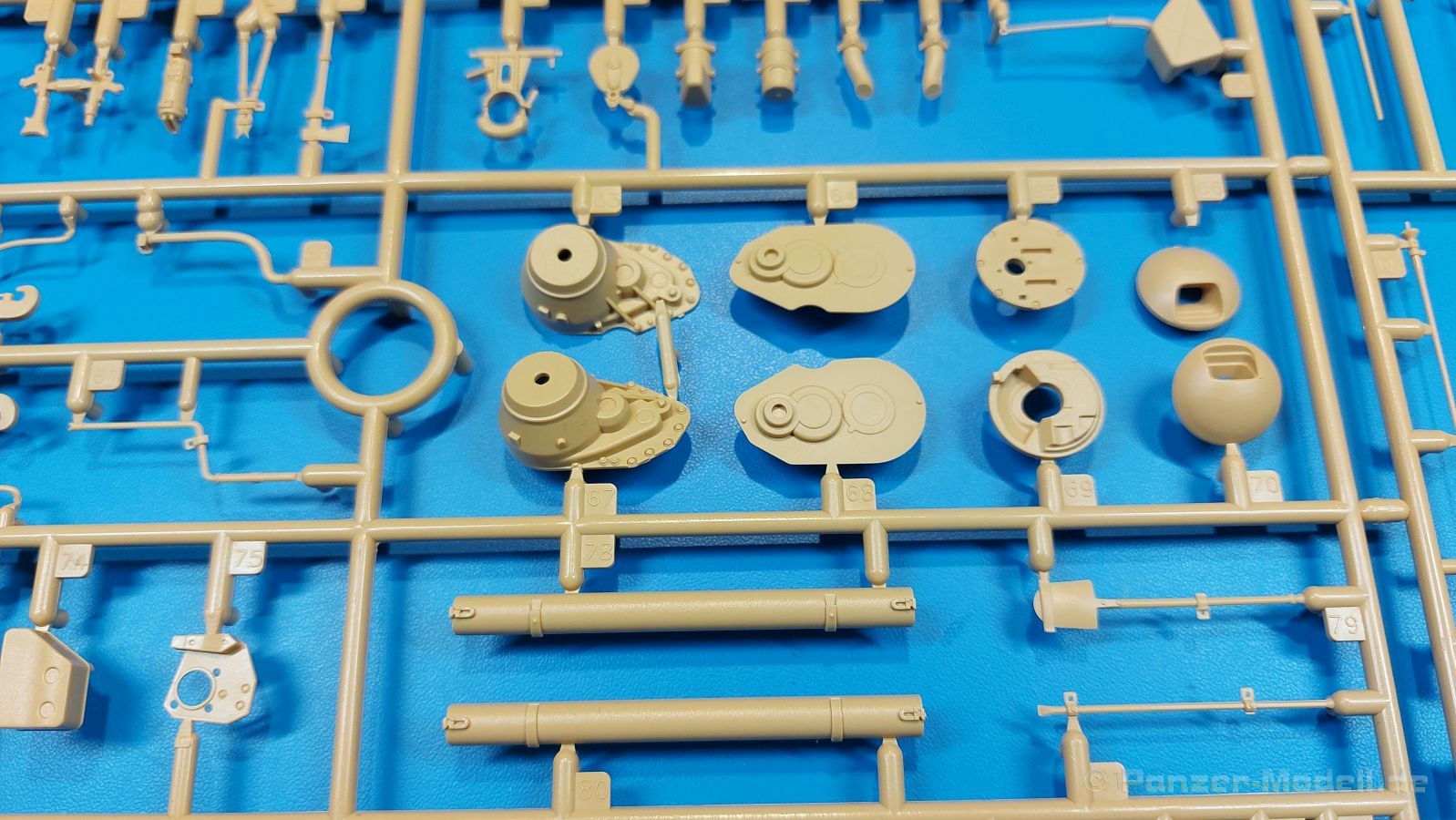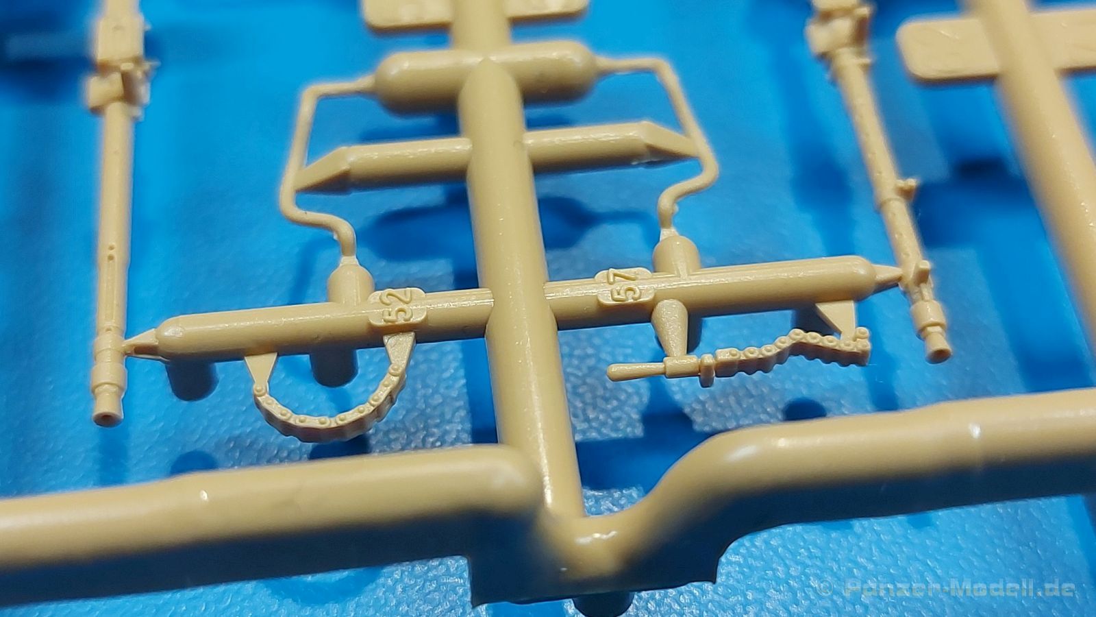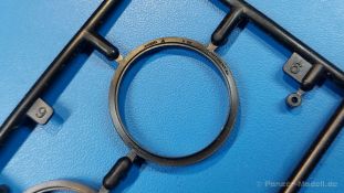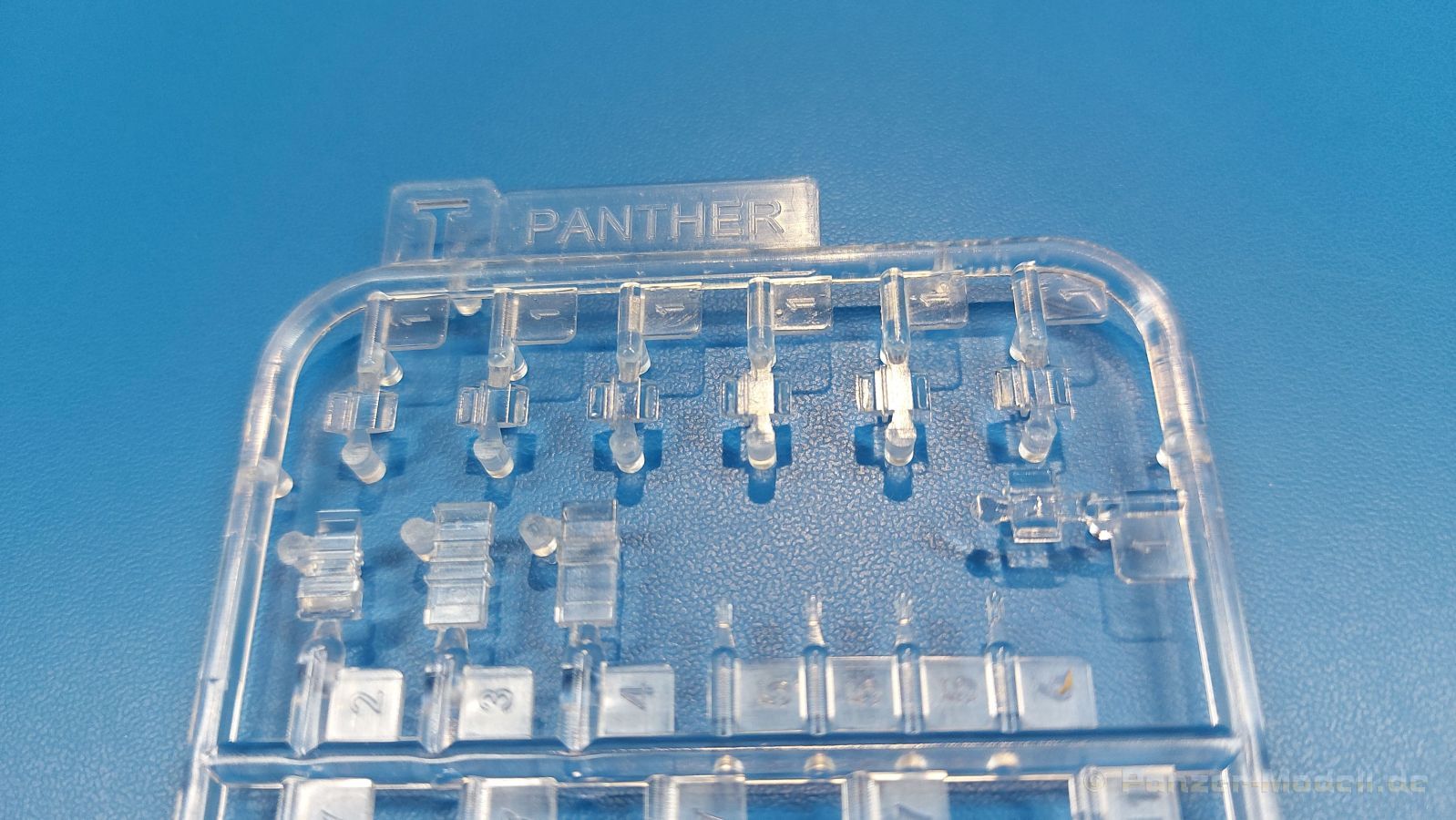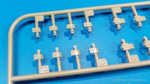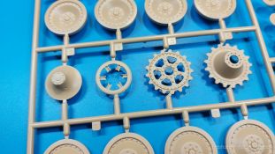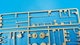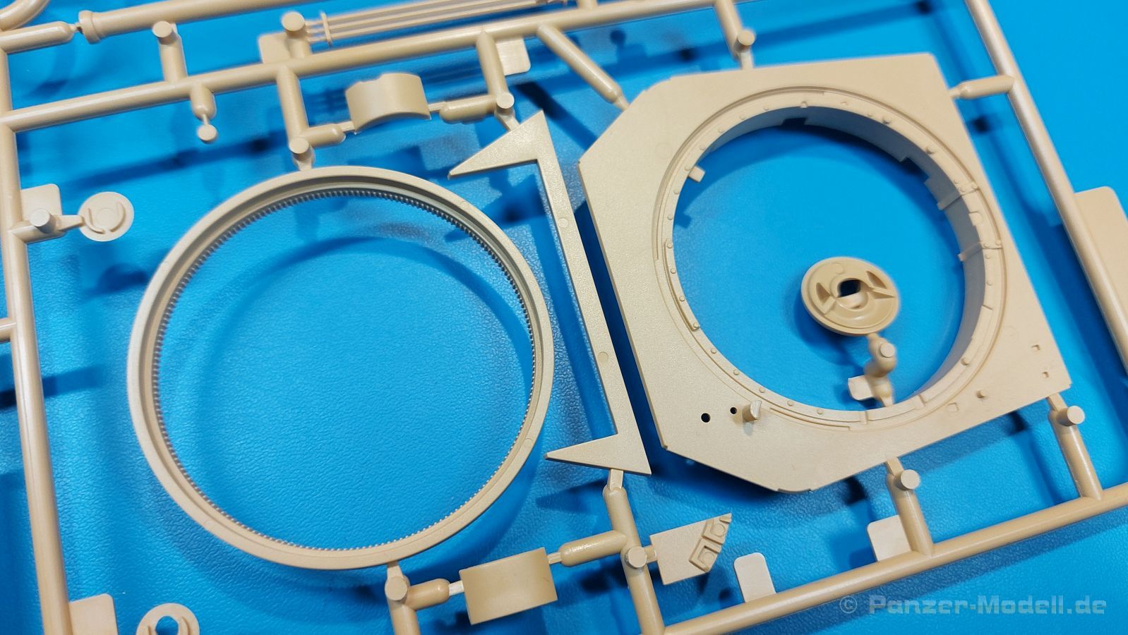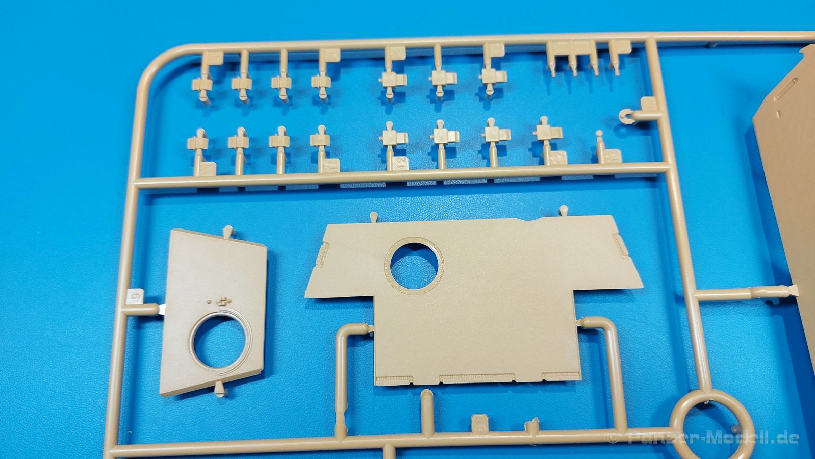 Der deutsche Panzerkampfwagen V Panther war im zweiten Weltkrieg die Antwort auf den T-34 der Sowjets. Erste Designs sahen sogar fast wie ein T-34 mit Schachtellaufwerk aus. Anders als die üblichen deutschen Panzer hatte er eine abgeschrägte Panzerung. Seine Kaliber 7,5 cm Kampfwagenkanone 42 mit 70 Kaliberlängen konnte je nach verwendeter Munition selbst auf 2.000 Meter Entfernung noch Panzerungen von 89-106 mm durchschlagen. Als Sekundärbewaffnung standen 7,92mm MG34 zur Verfügung. Trotz seines, für einen mittleren Panzer hohen Gewichts von fast 45 Tonnen konnte er mit dem 700 PS Maybach Motor eine Höchstgeschwindigkeit bis zu 55 km/h erreichen. Seine Besatzung bestand aus dem Kommandanten, Richt-, Ladeschütze, Funker und Fahrer. Varianten des Panthers waren Befehlspanther, Bergepanther und Jagdpanther, aber es wurden noch weitere entwickelt, die teils bis ins Prototypen Stadium vorrankamen. Der Panther war an allen europäischen Fronten eingesetzt. Etliche Exemplare überlebten den Krieg und sind, teils sogar fahrbereit, in Museen zu sehen. Der Bausatz: Gleichzeitig mit einem anderen Hersteller setzte Rye Field Models 2018, unter anderem durch eine vollständige Inneneinrichtung, neue Maßstäbe im âPantherbauâ. Auf Basis dieses fantastischen Modells entstanden weitere, auch ohne Inneneinrichtung. Auch der heutige Befehlspanther enthält Teile des Interior Modells, wie man an den Innenseiten mancher Teile erkennen kann. Der weiße Stülpdeckelkarton zeigt einen farbigen Seitenriss eines Befehlspanthers mit drei aufgestellten Antennen. An einer Seite sind Bauvarianten (mit und ohne Kampfraumheizung, Antennenvariationen, offene oder geschlossene Luken) zu sehen, auf der anderen Markierungsvarianten. Der Karton ist 380 x 240 x 90 mm groß und enthält neun sandgelbe Spritzlinge, einen Klarsichtspritzling, einen schwarzen Vinylspritzling, ein Tütchen mit silbergrauen Spritzlingen, jeder mit zwei Kettengliedern, zwei Fotoätzteil-Platinen, ein kleines Decalblatt und die Bauanleitung. Die Spritzlinge sind einwandfrei, die Teile ohne Versatz oder Sinkstellen. Details sind scharf und gut herausgearbeitet. Es gibt einige sichtbare Auswerferspuren, aber sie befinden sich auf Innen- und Unterseiten von Teilen und können größtenteils ignoriert werden. Auch der Vinylspritzling ist sehr sauber ausgespritzt, ohne Fischhäute und mit sehr scharfen Details, die man bei dem weichen Material vielleicht nicht so erwartet. Die Unterwanne setzt sich aus Bodenplatte, den Seitenwänden, sowie Heckwand und Bugplatten zusammen und weisen bereits angegossene, beeindruckende Details auf. Die Schwingarmhülsen werden einzeln und nach rechts und links getrennt in die Wanne eingeklebt. Auch diese zeigen sehr schöne Details, auch wenn sie nicht zur Präsentation gedacht sind ob des fehlenden Interieurs. Die Schwingarme werden einzeln eingesteckt und können entweder mit der angegossenen Passnase fest eingebaut werden oder, durch entfernen der Passnase, schwingend eingebaut werden, um die Federung zu simulieren, bzw. bei Einbau des Modells in ein unebenes Diorama die eingefederten Laufrollen darzustellen. Die Laufrollen machen einen hervorragenden Eindruck mit sehr feinen Details der Radmuttern und Gummierung mit ultrarealistischen Herstelleraufdrucken. Zusätzlich gibt es Laufrollen ohne Gummierung, um z.B. beschädigte Laufrollen ohne Gummierung darzustellen, bzw. mit aufsteckbarer Gummierung aus schwarzem Weichplastik und zwei Stahllaufrollen für die letzten Radstation, die aber für die Befehlsversion gemäß Anleitung nicht benötigt werden. Die Ketten sind klasse, denn die Einzelglieder haben jeweils nur zwei Angüsse und haben die Führungszähne bereits mit angegossen - und trotzdem ist die Detailqualität der Glieder mit Durchbrüchen und feinen Gussnummern sehr gut, wenn auch pro Glied eine flache Auswerfermarke mittig auf der Innenseite vorhanden ist. Die Kettenglieder werden mittels einer Montagehilfe beweglich zusammengesteckt und durch Kettenbolzen gesichert. Die Kettenbolzen sind jeweils zu Fünferblöcken gegossen, werden eingesteckt und dann erst von Gussast getrennt. Innen- und Außenbolzen sind unterschiedlich, also aufmerksam arbeiten. Eisgreifer für die Kette liegen ebenso bei wie ein Kettenwerkzeug aus PE, mit dem man eine Kettenmontage simulieren kann, wenn man die Brechstange von seinen Halterungen befreit. Ich sehe schon einen MiniArt Soldaten bei den Kettenarbeiten! Die Decals sind sauber gedruckt und seidenmatt glänzend, mit wenig Trägerrand. Der Trägerfilm ist angenehm dünn. Es gibt zwei Decaloptionen: