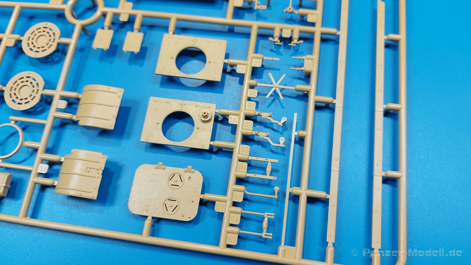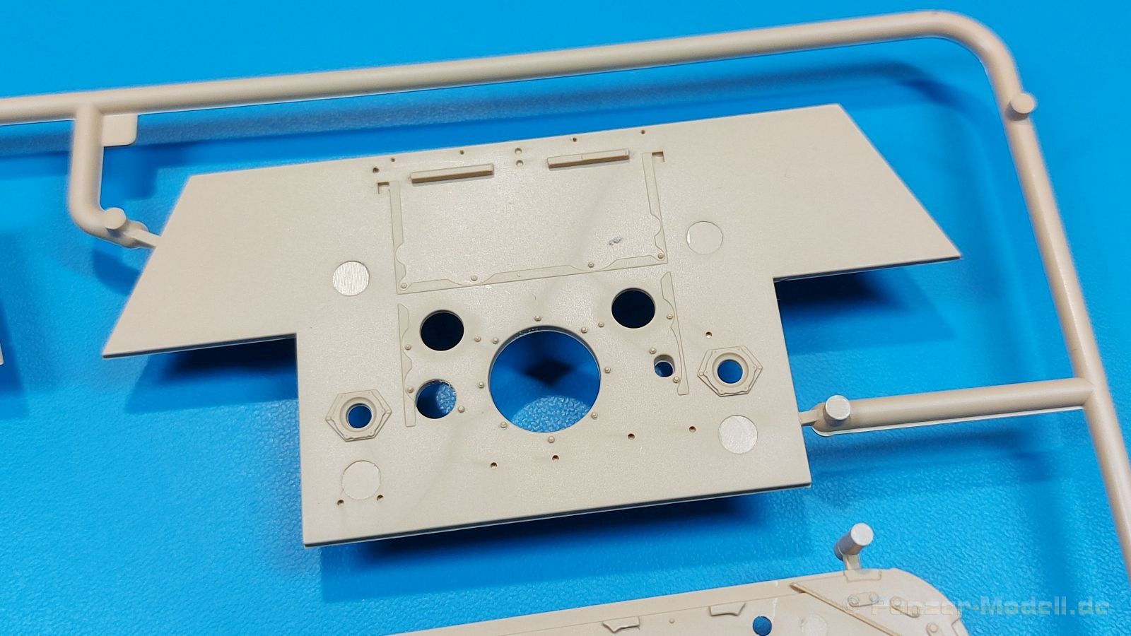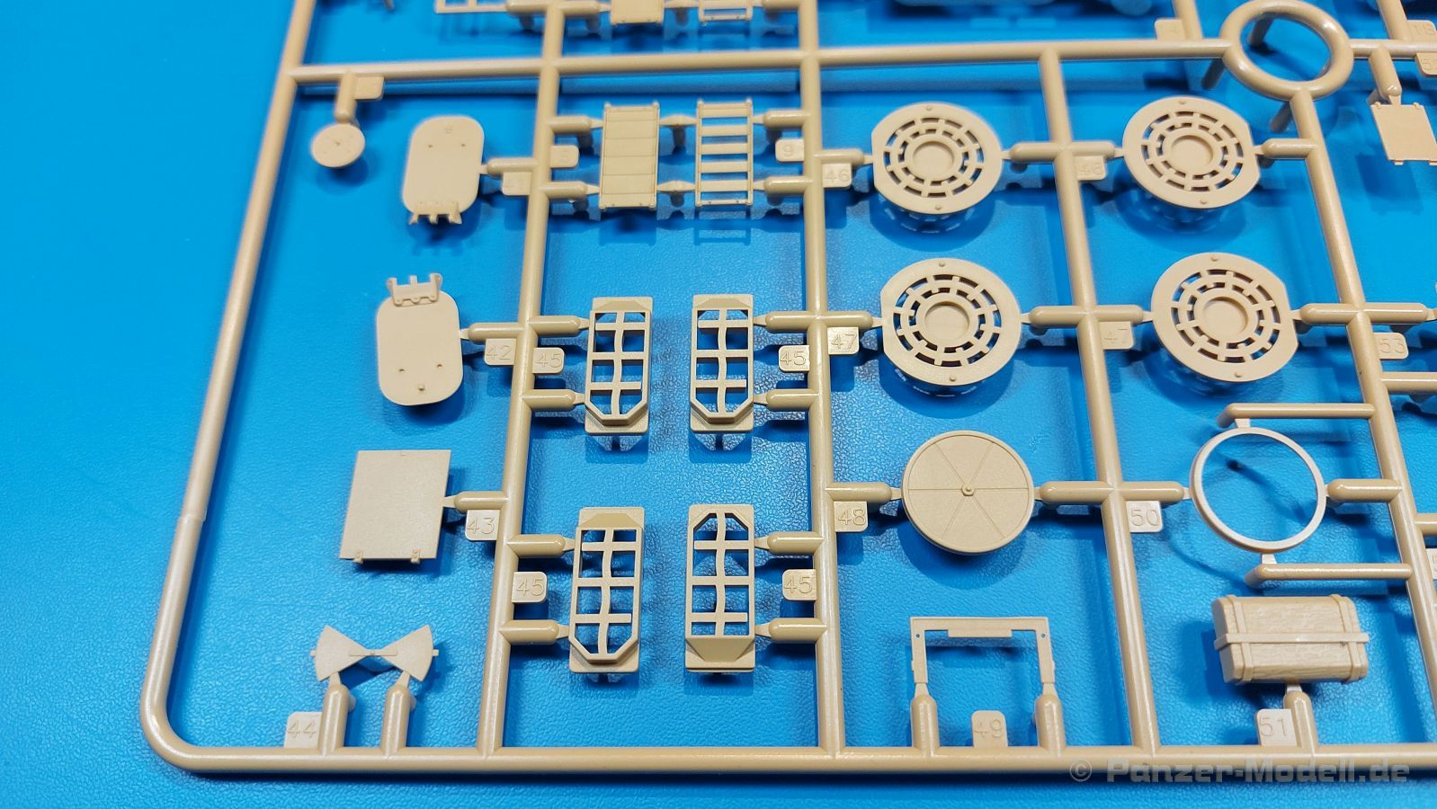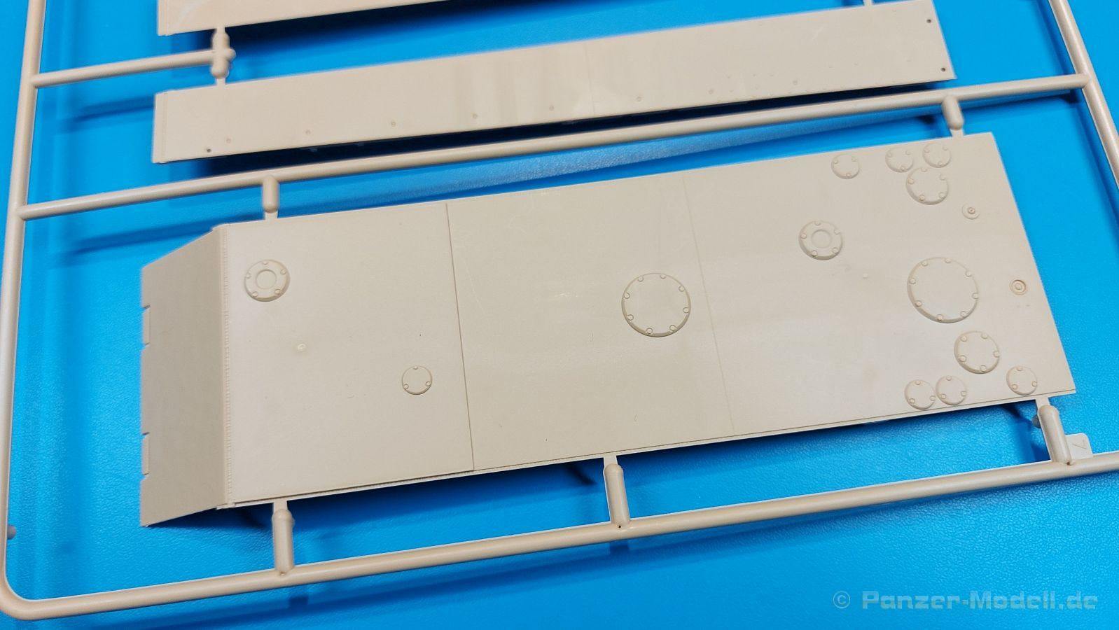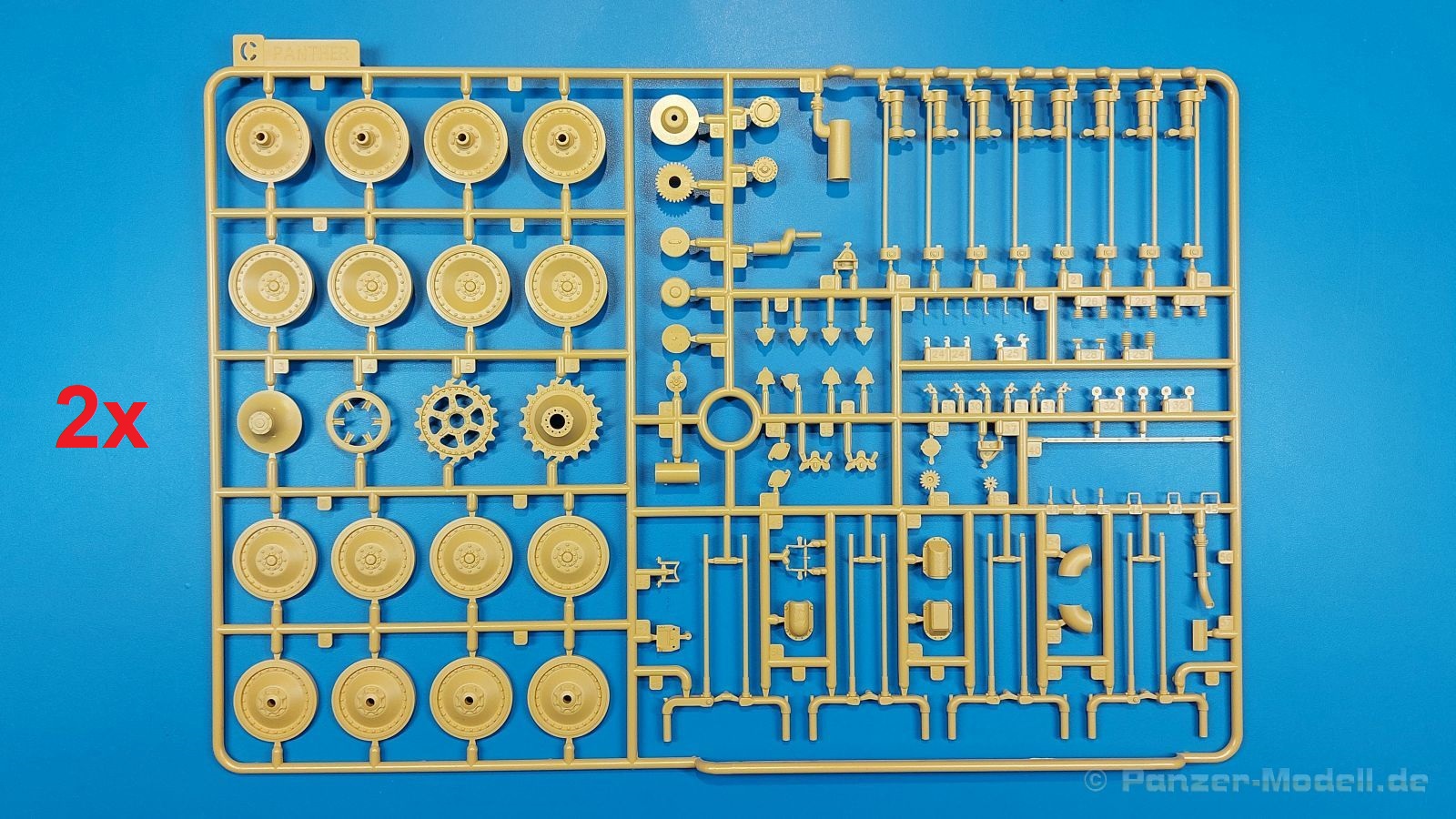 Der deutsche Panzerkampfwagen V Panther war im zweiten Weltkrieg die Antwort auf den T-34 der Sowjets. Erste Designs sahen sogar fast wie ein T-34 mit Schachtellaufwerk aus. Anders als die üblichen deutschen Panzer hatte er eine abgeschrägte Panzerung. Seine Kaliber 7,5 cm Kampfwagenkanone 42 mit 70 Kaliberlängen konnte je nach verwendeter Munition selbst auf 2.000 Meter Entfernung noch Panzerungen von 89-106 mm durchschlagen. Als Sekundärbewaffnung standen 7,92mm MG34 zur Verfügung. Trotz seines, für einen mittleren Panzer hohen Gewichts von fast 45 Tonnen konnte er mit dem 700 PS Maybach Motor eine Höchstgeschwindigkeit bis zu 55 km/h erreichen. Seine Besatzung bestand aus dem Kommandanten, Richt-, Ladeschütze, Funker und Fahrer. Varianten des Panthers waren Befehlspanther, Bergepanther und Jagdpanther, aber es wurden noch weitere entwickelt, die teils bis ins Prototypen Stadium vorrankamen. Der Panther war an allen europäischen Fronten eingesetzt. Etliche Exemplare überlebten den Krieg und sind, teils sogar fahrbereit, in Museen zu sehen. Der Bausatz: Gleichzeitig mit einem anderen Hersteller setzte Rye Field Models 2018, unter anderem durch eine vollständige Inneneinrichtung, neue Maßstäbe im âPantherbauâ. Auf Basis dieses fantastischen Modells entstanden weitere, auch ohne Inneneinrichtung. Auch der heutige Befehlspanther enthält Teile des Interior Modells, wie man an den Innenseiten mancher Teile erkennen kann. Der weiße Stülpdeckelkarton zeigt einen farbigen Seitenriss eines Befehlspanthers mit drei aufgestellten Antennen. An einer Seite sind Bauvarianten (mit und ohne Kampfraumheizung, Antennenvariationen, offene oder geschlossene Luken) zu sehen, auf der anderen Markierungsvarianten. Der Karton ist 380 x 240 x 90 mm groß und enthält neun sandgelbe Spritzlinge, einen Klarsichtspritzling, einen schwarzen Vinylspritzling, ein Tütchen mit silbergrauen Spritzlingen, jeder mit zwei Kettengliedern, zwei Fotoätzteil-Platinen, ein kleines Decalblatt und die Bauanleitung. Die Spritzlinge sind einwandfrei, die Teile ohne Versatz oder Sinkstellen. Details sind scharf und gut herausgearbeitet. Es gibt einige sichtbare Auswerferspuren, aber sie befinden sich auf Innen- und Unterseiten von Teilen und können größtenteils ignoriert werden. Auch der Vinylspritzling ist sehr sauber ausgespritzt, ohne Fischhäute und mit sehr scharfen Details, die man bei dem weichen Material vielleicht nicht so erwartet. Die Unterwanne setzt sich aus Bodenplatte, den Seitenwänden, sowie Heckwand und Bugplatten zusammen und weisen bereits angegossene, beeindruckende Details auf. Die Schwingarmhülsen werden einzeln und nach rechts und links getrennt in die Wanne eingeklebt. Auch diese zeigen sehr schöne Details, auch wenn sie nicht zur Präsentation gedacht sind ob des fehlenden Interieurs. Die Schwingarme werden einzeln eingesteckt und können entweder mit der angegossenen Passnase fest eingebaut werden oder, durch entfernen der Passnase, schwingend eingebaut werden, um die Federung zu simulieren, bzw. bei Einbau des Modells in ein unebenes Diorama die eingefederten Laufrollen darzustellen. Die Laufrollen machen einen hervorragenden Eindruck mit sehr feinen Details der Radmuttern und Gummierung mit ultrarealistischen Herstelleraufdrucken. Zusätzlich gibt es Laufrollen ohne Gummierung, um z.B. beschädigte Laufrollen ohne Gummierung darzustellen, bzw. mit aufsteckbarer Gummierung aus schwarzem Weichplastik und zwei Stahllaufrollen für die letzten Radstation, die aber für die Befehlsversion gemäß Anleitung nicht benötigt werden. Die Ketten sind klasse, denn die Einzelglieder haben jeweils nur zwei Angüsse und haben die Führungszähne bereits mit angegossen - und trotzdem ist die Detailqualität der Glieder mit Durchbrüchen und feinen Gussnummern sehr gut, wenn auch pro Glied eine flache Auswerfermarke mittig auf der Innenseite vorhanden ist. Die Kettenglieder werden mittels einer Montagehilfe beweglich zusammengesteckt und durch Kettenbolzen gesichert. Die Kettenbolzen sind jeweils zu Fünferblöcken gegossen, werden eingesteckt und dann erst von Gussast getrennt. Innen- und Außenbolzen sind unterschiedlich, also aufmerksam arbeiten. Eisgreifer für die Kette liegen ebenso bei wie ein Kettenwerkzeug aus PE, mit dem man eine Kettenmontage simulieren kann, wenn man die Brechstange von seinen Halterungen befreit. Ich sehe schon einen MiniArt Soldaten bei den Kettenarbeiten! Die Decals sind sauber gedruckt und seidenmatt glänzend, mit wenig Trägerrand. Der Trägerfilm ist angenehm dünn. Es gibt zwei Decaloptionen: