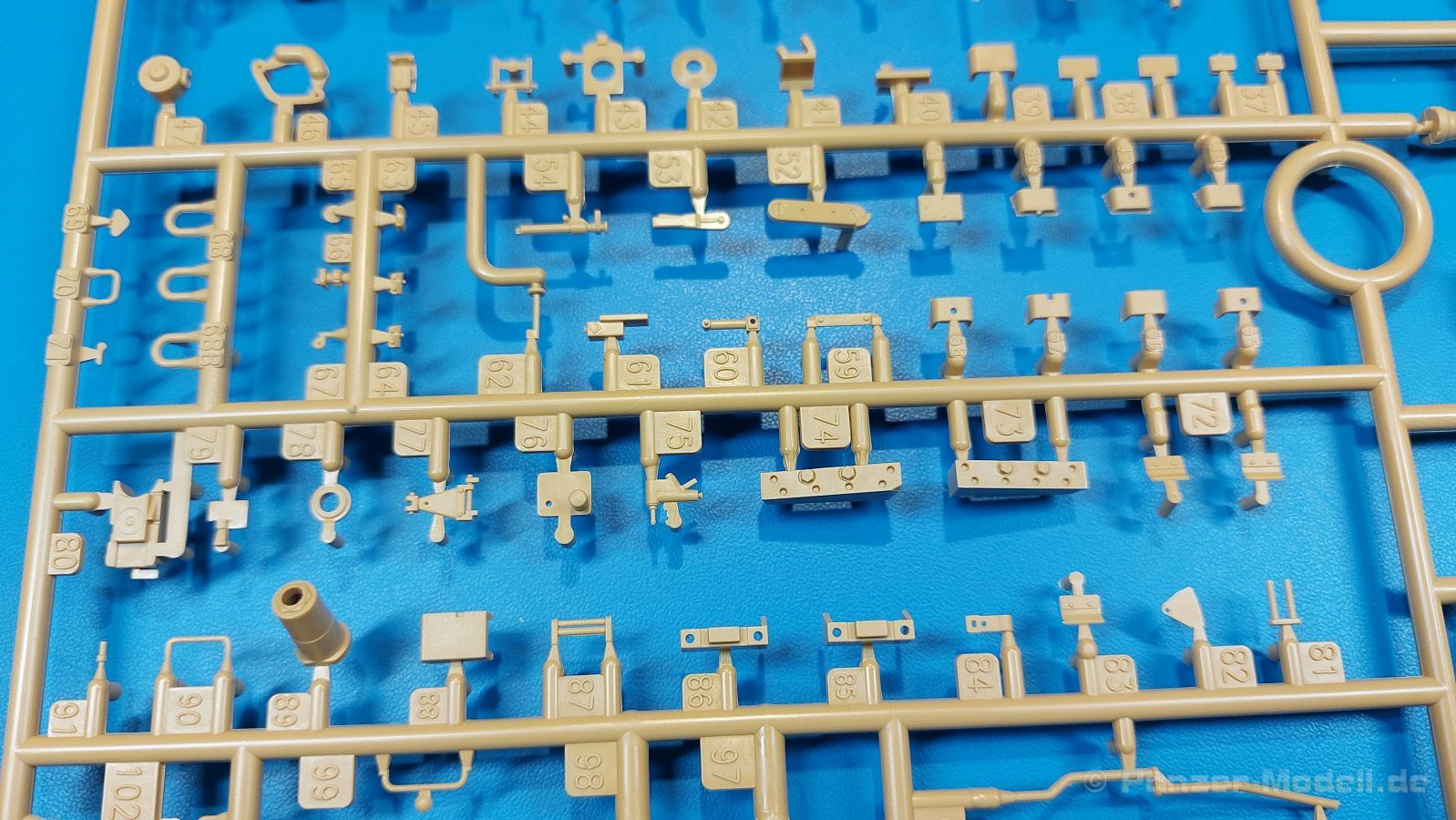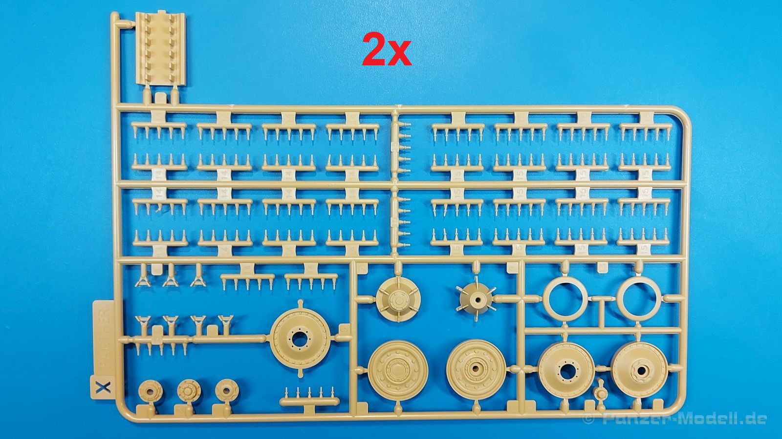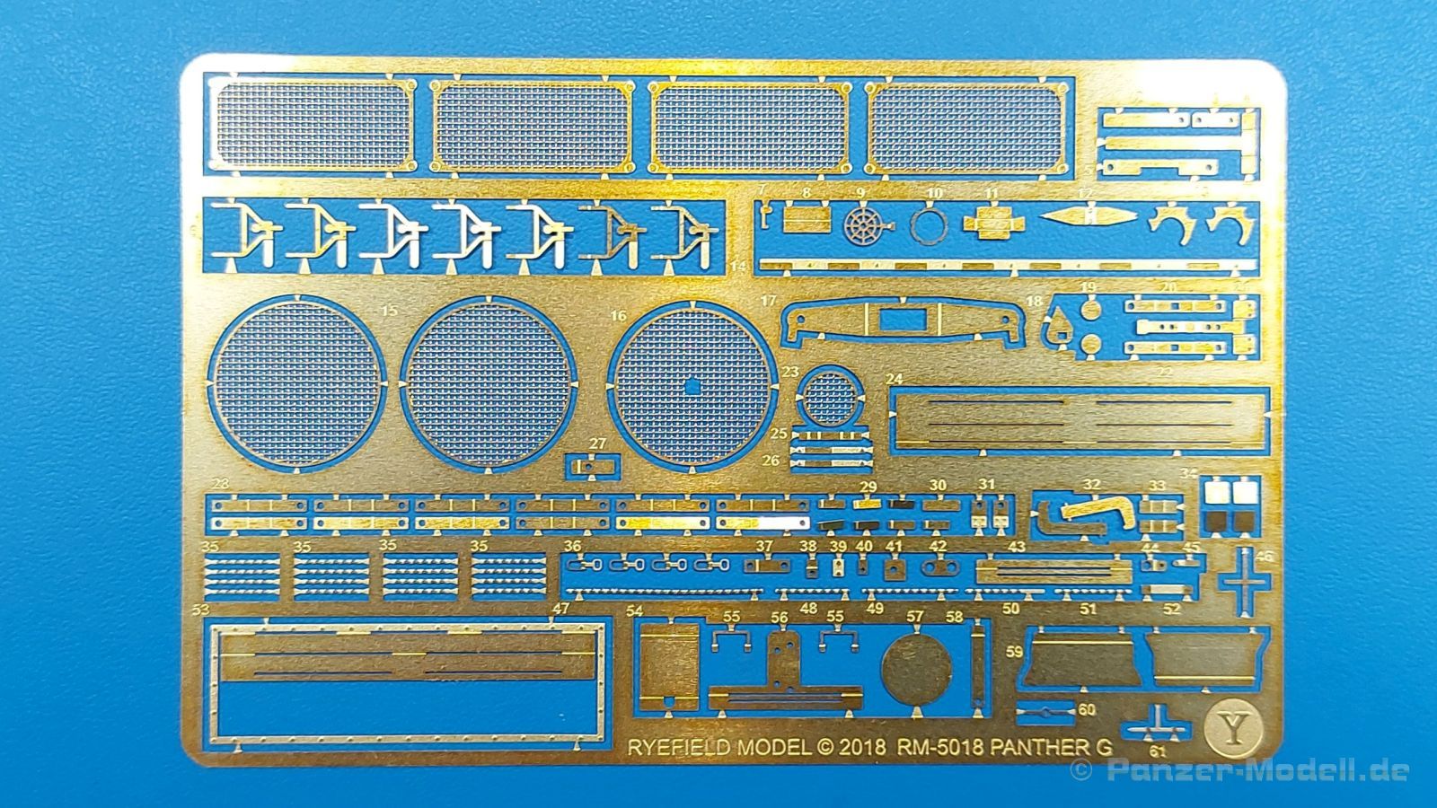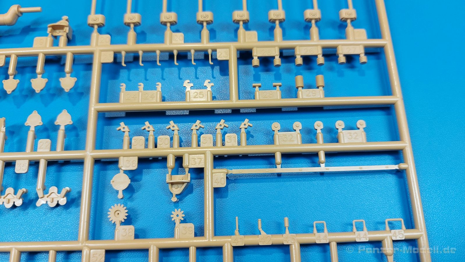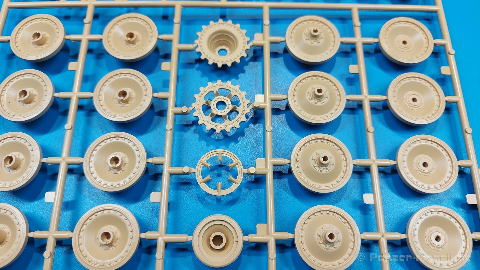 Der deutsche Panzerkampfwagen V Panther war im zweiten Weltkrieg die Antwort auf den T-34 der Sowjets. Erste Designs sahen sogar fast wie ein T-34 mit Schachtellaufwerk aus. Anders als die üblichen deutschen Panzer hatte er eine abgeschrägte Panzerung. Seine Kaliber 7,5 cm Kampfwagenkanone 42 mit 70 Kaliberlängen konnte je nach verwendeter Munition selbst auf 2.000 Meter Entfernung noch Panzerungen von 89-106 mm durchschlagen. Als Sekundärbewaffnung standen 7,92mm MG34 zur Verfügung. Trotz seines, für einen mittleren Panzer hohen Gewichts von fast 45 Tonnen konnte er mit dem 700 PS Maybach Motor eine Höchstgeschwindigkeit bis zu 55 km/h erreichen. Seine Besatzung bestand aus dem Kommandanten, Richt-, Ladeschütze, Funker und Fahrer. Varianten des Panthers waren Befehlspanther, Bergepanther und Jagdpanther, aber es wurden noch weitere entwickelt, die teils bis ins Prototypen Stadium vorrankamen. Der Panther war an allen europäischen Fronten eingesetzt. Etliche Exemplare überlebten den Krieg und sind, teils sogar fahrbereit, in Museen zu sehen. Der Bausatz: Gleichzeitig mit einem anderen Hersteller setzte Rye Field Models 2018, unter anderem durch eine vollständige Inneneinrichtung, neue Maßstäbe im âPantherbauâ. Auf Basis dieses fantastischen Modells entstanden weitere, auch ohne Inneneinrichtung. Auch der heutige Befehlspanther enthält Teile des Interior Modells, wie man an den Innenseiten mancher Teile erkennen kann. Der weiße Stülpdeckelkarton zeigt einen farbigen Seitenriss eines Befehlspanthers mit drei aufgestellten Antennen. An einer Seite sind Bauvarianten (mit und ohne Kampfraumheizung, Antennenvariationen, offene oder geschlossene Luken) zu sehen, auf der anderen Markierungsvarianten. Der Karton ist 380 x 240 x 90 mm groß und enthält neun sandgelbe Spritzlinge, einen Klarsichtspritzling, einen schwarzen Vinylspritzling, ein Tütchen mit silbergrauen Spritzlingen, jeder mit zwei Kettengliedern, zwei Fotoätzteil-Platinen, ein kleines Decalblatt und die Bauanleitung. Die Spritzlinge sind einwandfrei, die Teile ohne Versatz oder Sinkstellen. Details sind scharf und gut herausgearbeitet. Es gibt einige sichtbare Auswerferspuren, aber sie befinden sich auf Innen- und Unterseiten von Teilen und können größtenteils ignoriert werden. Auch der Vinylspritzling ist sehr sauber ausgespritzt, ohne Fischhäute und mit sehr scharfen Details, die man bei dem weichen Material vielleicht nicht so erwartet. Die Unterwanne setzt sich aus Bodenplatte, den Seitenwänden, sowie Heckwand und Bugplatten zusammen und weisen bereits angegossene, beeindruckende Details auf. Die Schwingarmhülsen werden einzeln und nach rechts und links getrennt in die Wanne eingeklebt. Auch diese zeigen sehr schöne Details, auch wenn sie nicht zur Präsentation gedacht sind ob des fehlenden Interieurs. Die Schwingarme werden einzeln eingesteckt und können entweder mit der angegossenen Passnase fest eingebaut werden oder, durch entfernen der Passnase, schwingend eingebaut werden, um die Federung zu simulieren, bzw. bei Einbau des Modells in ein unebenes Diorama die eingefederten Laufrollen darzustellen. Die Laufrollen machen einen hervorragenden Eindruck mit sehr feinen Details der Radmuttern und Gummierung mit ultrarealistischen Herstelleraufdrucken. Zusätzlich gibt es Laufrollen ohne Gummierung, um z.B. beschädigte Laufrollen ohne Gummierung darzustellen, bzw. mit aufsteckbarer Gummierung aus schwarzem Weichplastik und zwei Stahllaufrollen für die letzten Radstation, die aber für die Befehlsversion gemäß Anleitung nicht benötigt werden. Die Ketten sind klasse, denn die Einzelglieder haben jeweils nur zwei Angüsse und haben die Führungszähne bereits mit angegossen - und trotzdem ist die Detailqualität der Glieder mit Durchbrüchen und feinen Gussnummern sehr gut, wenn auch pro Glied eine flache Auswerfermarke mittig auf der Innenseite vorhanden ist. Die Kettenglieder werden mittels einer Montagehilfe beweglich zusammengesteckt und durch Kettenbolzen gesichert. Die Kettenbolzen sind jeweils zu Fünferblöcken gegossen, werden eingesteckt und dann erst von Gussast getrennt. Innen- und Außenbolzen sind unterschiedlich, also aufmerksam arbeiten. Eisgreifer für die Kette liegen ebenso bei wie ein Kettenwerkzeug aus PE, mit dem man eine Kettenmontage simulieren kann, wenn man die Brechstange von seinen Halterungen befreit. Ich sehe schon einen MiniArt Soldaten bei den Kettenarbeiten! Die Decals sind sauber gedruckt und seidenmatt glänzend, mit wenig Trägerrand. Der Trägerfilm ist angenehm dünn. Es gibt zwei Decaloptionen: