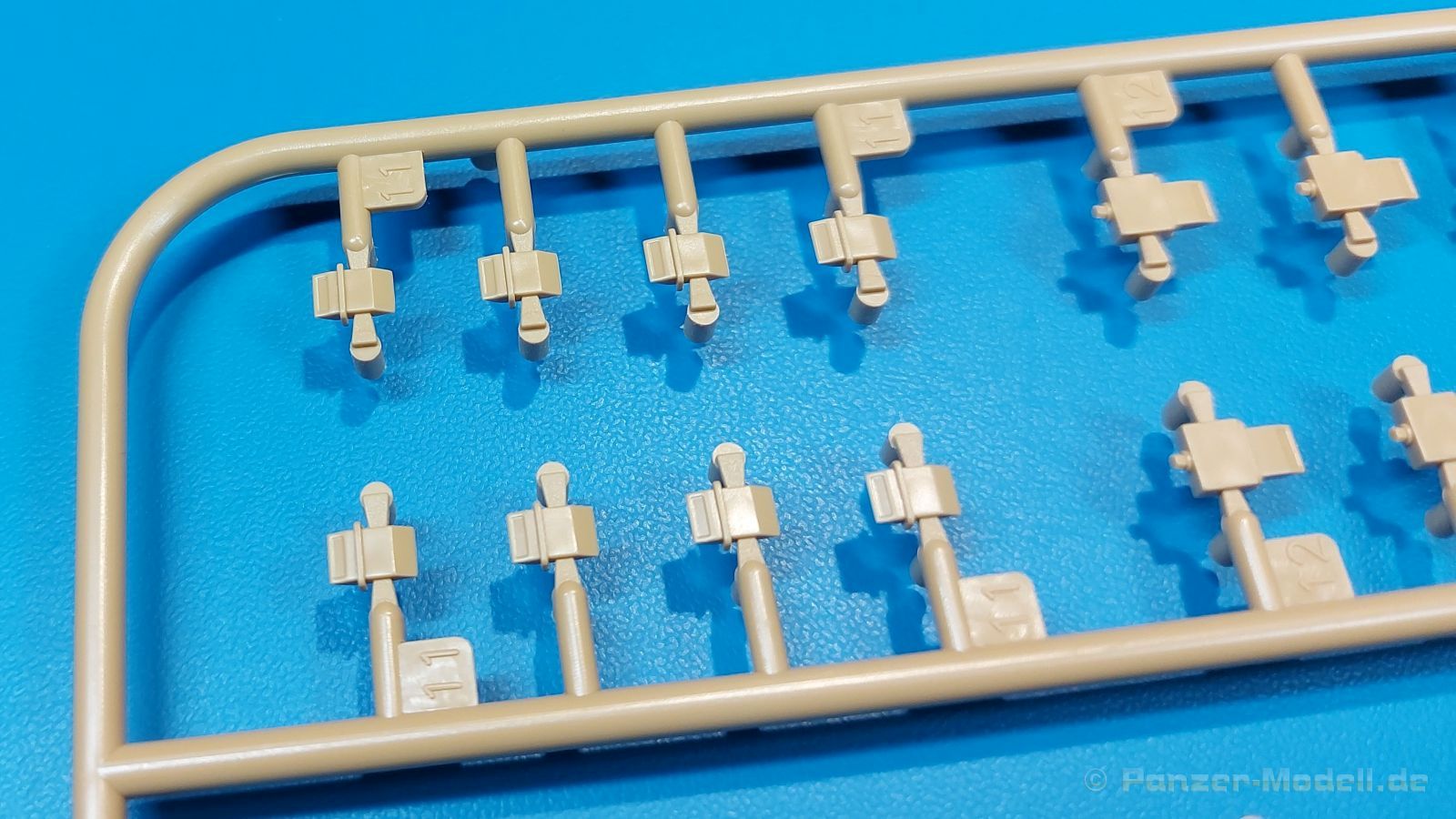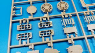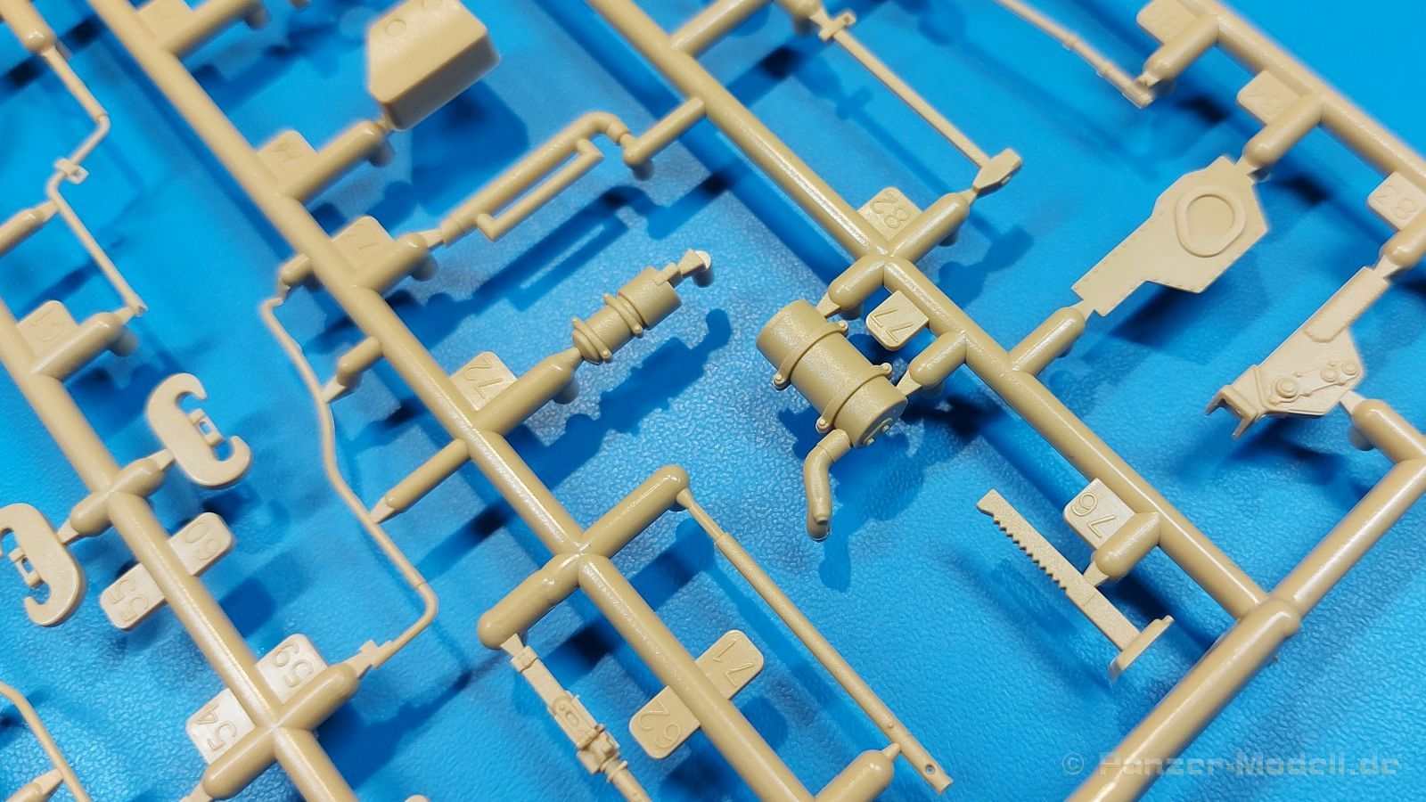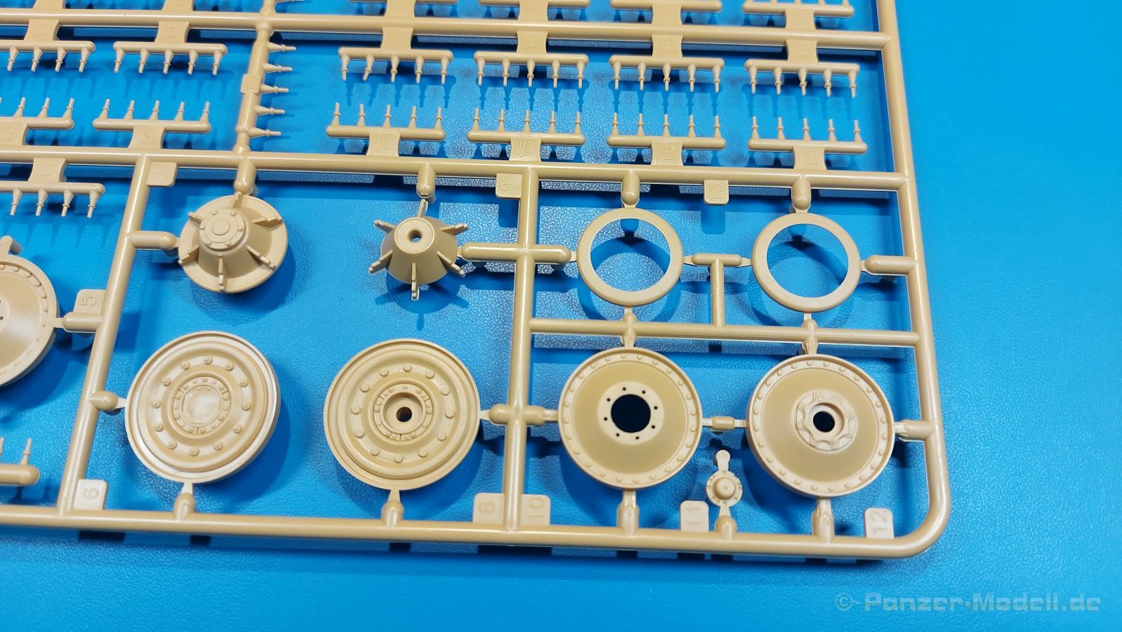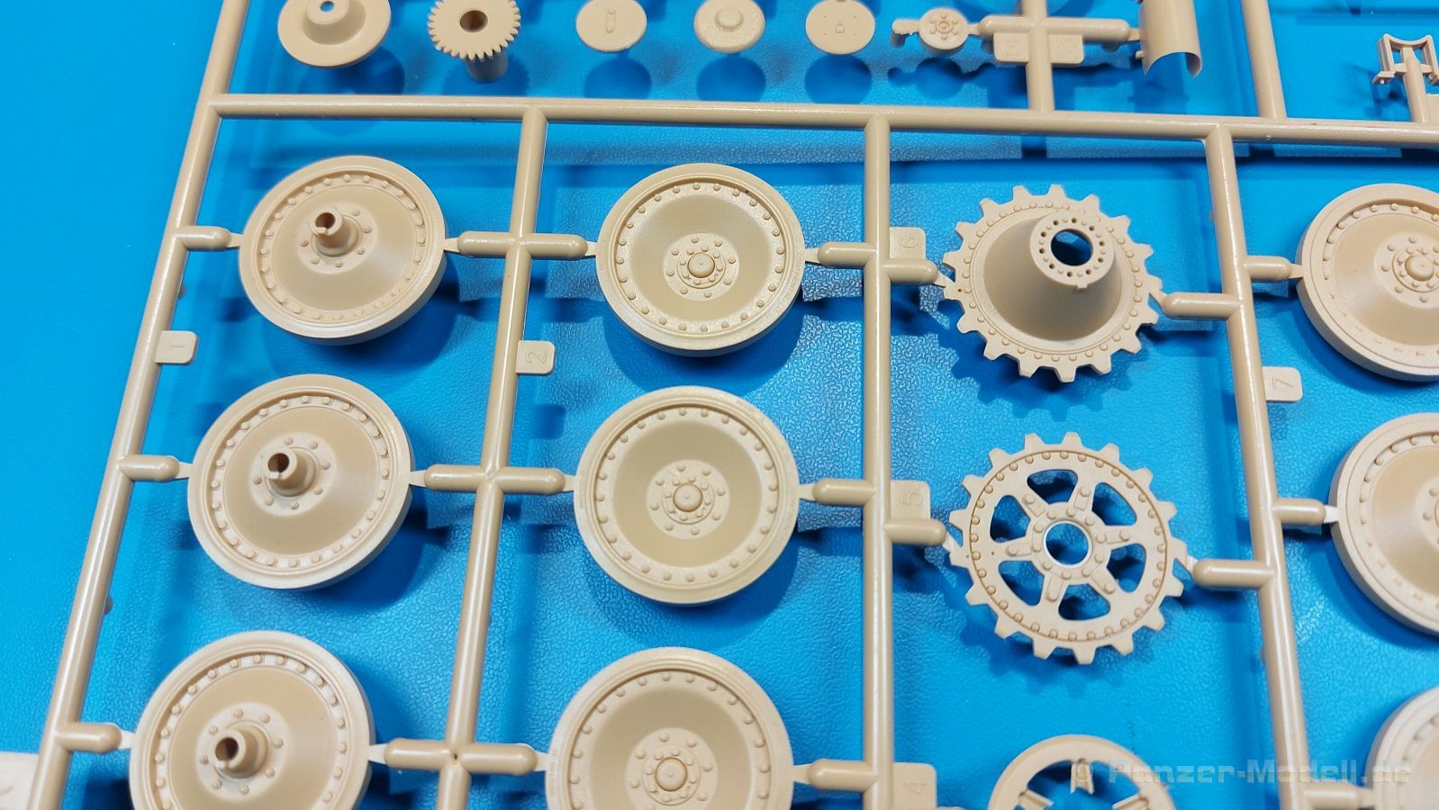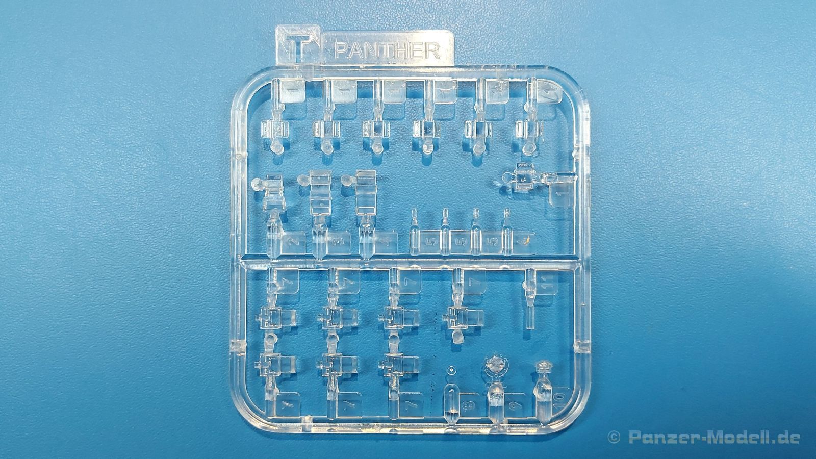 Der deutsche Panzerkampfwagen V Panther war im zweiten Weltkrieg die Antwort auf den T-34 der Sowjets. Erste Designs sahen sogar fast wie ein T-34 mit Schachtellaufwerk aus. Anders als die üblichen deutschen Panzer hatte er eine abgeschrägte Panzerung. Seine Kaliber 7,5 cm Kampfwagenkanone 42 mit 70 Kaliberlängen konnte je nach verwendeter Munition selbst auf 2.000 Meter Entfernung noch Panzerungen von 89-106 mm durchschlagen. Als Sekundärbewaffnung standen 7,92mm MG34 zur Verfügung. Trotz seines, für einen mittleren Panzer hohen Gewichts von fast 45 Tonnen konnte er mit dem 700 PS Maybach Motor eine Höchstgeschwindigkeit bis zu 55 km/h erreichen. Seine Besatzung bestand aus dem Kommandanten, Richt-, Ladeschütze, Funker und Fahrer. Varianten des Panthers waren Befehlspanther, Bergepanther und Jagdpanther, aber es wurden noch weitere entwickelt, die teils bis ins Prototypen Stadium vorrankamen. Der Panther war an allen europäischen Fronten eingesetzt. Etliche Exemplare überlebten den Krieg und sind, teils sogar fahrbereit, in Museen zu sehen. Der Bausatz: Gleichzeitig mit einem anderen Hersteller setzte Rye Field Models 2018, unter anderem durch eine vollständige Inneneinrichtung, neue Maßstäbe im âPantherbauâ. Auf Basis dieses fantastischen Modells entstanden weitere, auch ohne Inneneinrichtung. Auch der heutige Befehlspanther enthält Teile des Interior Modells, wie man an den Innenseiten mancher Teile erkennen kann. Der weiße Stülpdeckelkarton zeigt einen farbigen Seitenriss eines Befehlspanthers mit drei aufgestellten Antennen. An einer Seite sind Bauvarianten (mit und ohne Kampfraumheizung, Antennenvariationen, offene oder geschlossene Luken) zu sehen, auf der anderen Markierungsvarianten. Der Karton ist 380 x 240 x 90 mm groß und enthält neun sandgelbe Spritzlinge, einen Klarsichtspritzling, einen schwarzen Vinylspritzling, ein Tütchen mit silbergrauen Spritzlingen, jeder mit zwei Kettengliedern, zwei Fotoätzteil-Platinen, ein kleines Decalblatt und die Bauanleitung. Die Spritzlinge sind einwandfrei, die Teile ohne Versatz oder Sinkstellen. Details sind scharf und gut herausgearbeitet. Es gibt einige sichtbare Auswerferspuren, aber sie befinden sich auf Innen- und Unterseiten von Teilen und können größtenteils ignoriert werden. Auch der Vinylspritzling ist sehr sauber ausgespritzt, ohne Fischhäute und mit sehr scharfen Details, die man bei dem weichen Material vielleicht nicht so erwartet. Die Unterwanne setzt sich aus Bodenplatte, den Seitenwänden, sowie Heckwand und Bugplatten zusammen und weisen bereits angegossene, beeindruckende Details auf. Die Schwingarmhülsen werden einzeln und nach rechts und links getrennt in die Wanne eingeklebt. Auch diese zeigen sehr schöne Details, auch wenn sie nicht zur Präsentation gedacht sind ob des fehlenden Interieurs. Die Schwingarme werden einzeln eingesteckt und können entweder mit der angegossenen Passnase fest eingebaut werden oder, durch entfernen der Passnase, schwingend eingebaut werden, um die Federung zu simulieren, bzw. bei Einbau des Modells in ein unebenes Diorama die eingefederten Laufrollen darzustellen. Die Laufrollen machen einen hervorragenden Eindruck mit sehr feinen Details der Radmuttern und Gummierung mit ultrarealistischen Herstelleraufdrucken. Zusätzlich gibt es Laufrollen ohne Gummierung, um z.B. beschädigte Laufrollen ohne Gummierung darzustellen, bzw. mit aufsteckbarer Gummierung aus schwarzem Weichplastik und zwei Stahllaufrollen für die letzten Radstation, die aber für die Befehlsversion gemäß Anleitung nicht benötigt werden. Die Ketten sind klasse, denn die Einzelglieder haben jeweils nur zwei Angüsse und haben die Führungszähne bereits mit angegossen - und trotzdem ist die Detailqualität der Glieder mit Durchbrüchen und feinen Gussnummern sehr gut, wenn auch pro Glied eine flache Auswerfermarke mittig auf der Innenseite vorhanden ist. Die Kettenglieder werden mittels einer Montagehilfe beweglich zusammengesteckt und durch Kettenbolzen gesichert. Die Kettenbolzen sind jeweils zu Fünferblöcken gegossen, werden eingesteckt und dann erst von Gussast getrennt. Innen- und Außenbolzen sind unterschiedlich, also aufmerksam arbeiten. Eisgreifer für die Kette liegen ebenso bei wie ein Kettenwerkzeug aus PE, mit dem man eine Kettenmontage simulieren kann, wenn man die Brechstange von seinen Halterungen befreit. Ich sehe schon einen MiniArt Soldaten bei den Kettenarbeiten! Die Decals sind sauber gedruckt und seidenmatt glänzend, mit wenig Trägerrand. Der Trägerfilm ist angenehm dünn. Es gibt zwei Decaloptionen: