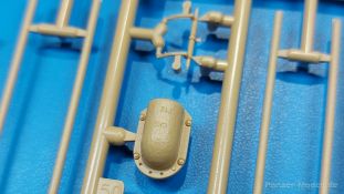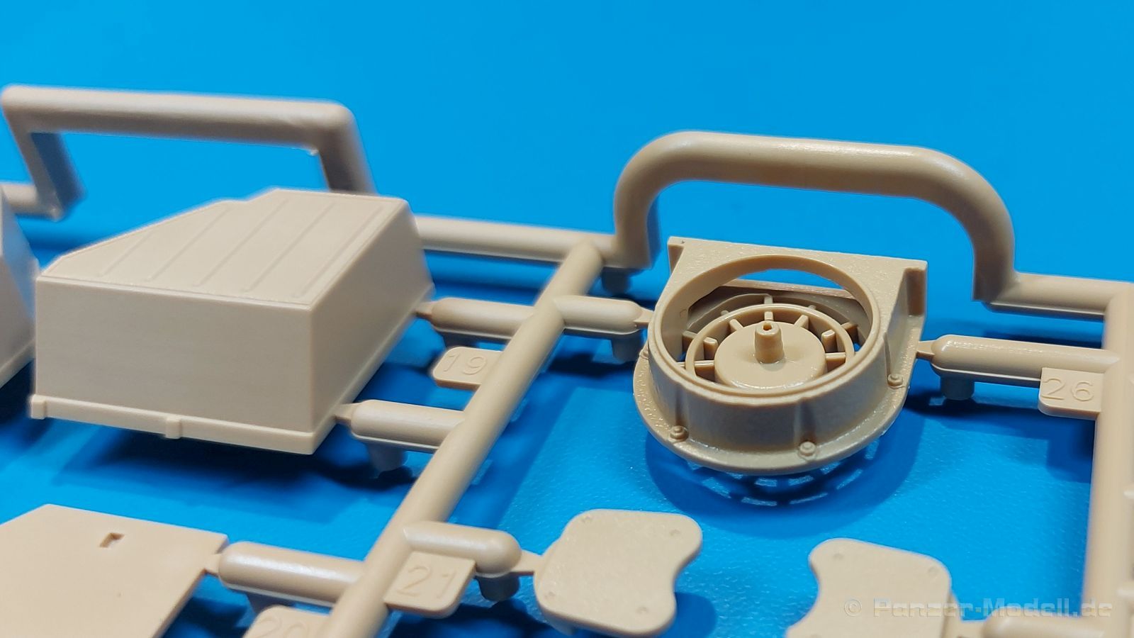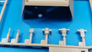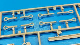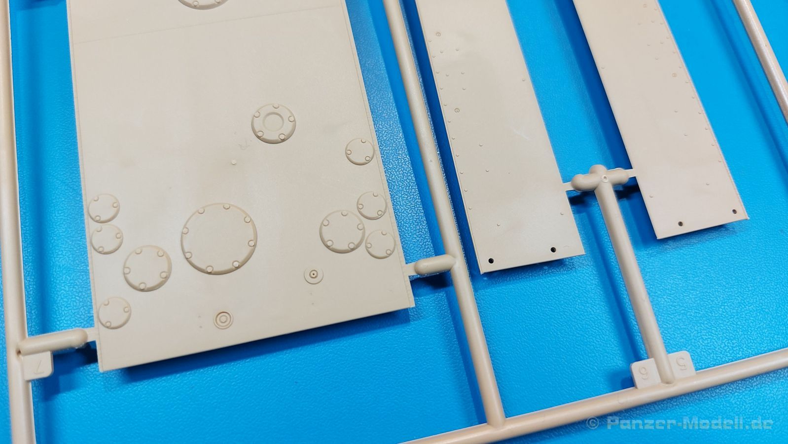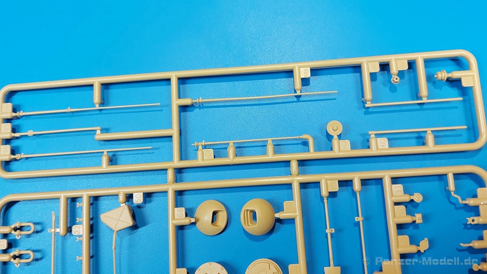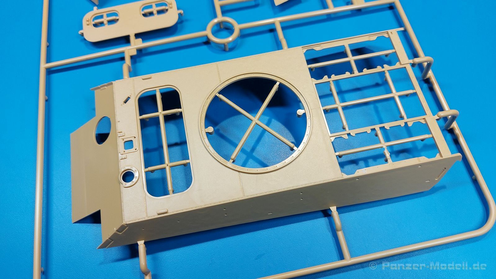 Der deutsche Panzerkampfwagen V Panther war im zweiten Weltkrieg die Antwort auf den T-34 der Sowjets. Erste Designs sahen sogar fast wie ein T-34 mit Schachtellaufwerk aus. Anders als die üblichen deutschen Panzer hatte er eine abgeschrägte Panzerung. Seine Kaliber 7,5 cm Kampfwagenkanone 42 mit 70 Kaliberlängen konnte je nach verwendeter Munition selbst auf 2.000 Meter Entfernung noch Panzerungen von 89-106 mm durchschlagen. Als Sekundärbewaffnung standen 7,92mm MG34 zur Verfügung. Trotz seines, für einen mittleren Panzer hohen Gewichts von fast 45 Tonnen konnte er mit dem 700 PS Maybach Motor eine Höchstgeschwindigkeit bis zu 55 km/h erreichen. Seine Besatzung bestand aus dem Kommandanten, Richt-, Ladeschütze, Funker und Fahrer. Varianten des Panthers waren Befehlspanther, Bergepanther und Jagdpanther, aber es wurden noch weitere entwickelt, die teils bis ins Prototypen Stadium vorrankamen. Der Panther war an allen europäischen Fronten eingesetzt. Etliche Exemplare überlebten den Krieg und sind, teils sogar fahrbereit, in Museen zu sehen. Der Bausatz: Gleichzeitig mit einem anderen Hersteller setzte Rye Field Models 2018, unter anderem durch eine vollständige Inneneinrichtung, neue Maßstäbe im âPantherbauâ. Auf Basis dieses fantastischen Modells entstanden weitere, auch ohne Inneneinrichtung. Auch der heutige Befehlspanther enthält Teile des Interior Modells, wie man an den Innenseiten mancher Teile erkennen kann. Der weiße Stülpdeckelkarton zeigt einen farbigen Seitenriss eines Befehlspanthers mit drei aufgestellten Antennen. An einer Seite sind Bauvarianten (mit und ohne Kampfraumheizung, Antennenvariationen, offene oder geschlossene Luken) zu sehen, auf der anderen Markierungsvarianten. Der Karton ist 380 x 240 x 90 mm groß und enthält neun sandgelbe Spritzlinge, einen Klarsichtspritzling, einen schwarzen Vinylspritzling, ein Tütchen mit silbergrauen Spritzlingen, jeder mit zwei Kettengliedern, zwei Fotoätzteil-Platinen, ein kleines Decalblatt und die Bauanleitung. Die Spritzlinge sind einwandfrei, die Teile ohne Versatz oder Sinkstellen. Details sind scharf und gut herausgearbeitet. Es gibt einige sichtbare Auswerferspuren, aber sie befinden sich auf Innen- und Unterseiten von Teilen und können größtenteils ignoriert werden. Auch der Vinylspritzling ist sehr sauber ausgespritzt, ohne Fischhäute und mit sehr scharfen Details, die man bei dem weichen Material vielleicht nicht so erwartet. Die Unterwanne setzt sich aus Bodenplatte, den Seitenwänden, sowie Heckwand und Bugplatten zusammen und weisen bereits angegossene, beeindruckende Details auf. Die Schwingarmhülsen werden einzeln und nach rechts und links getrennt in die Wanne eingeklebt. Auch diese zeigen sehr schöne Details, auch wenn sie nicht zur Präsentation gedacht sind ob des fehlenden Interieurs. Die Schwingarme werden einzeln eingesteckt und können entweder mit der angegossenen Passnase fest eingebaut werden oder, durch entfernen der Passnase, schwingend eingebaut werden, um die Federung zu simulieren, bzw. bei Einbau des Modells in ein unebenes Diorama die eingefederten Laufrollen darzustellen. Die Laufrollen machen einen hervorragenden Eindruck mit sehr feinen Details der Radmuttern und Gummierung mit ultrarealistischen Herstelleraufdrucken. Zusätzlich gibt es Laufrollen ohne Gummierung, um z.B. beschädigte Laufrollen ohne Gummierung darzustellen, bzw. mit aufsteckbarer Gummierung aus schwarzem Weichplastik und zwei Stahllaufrollen für die letzten Radstation, die aber für die Befehlsversion gemäß Anleitung nicht benötigt werden. Die Ketten sind klasse, denn die Einzelglieder haben jeweils nur zwei Angüsse und haben die Führungszähne bereits mit angegossen - und trotzdem ist die Detailqualität der Glieder mit Durchbrüchen und feinen Gussnummern sehr gut, wenn auch pro Glied eine flache Auswerfermarke mittig auf der Innenseite vorhanden ist. Die Kettenglieder werden mittels einer Montagehilfe beweglich zusammengesteckt und durch Kettenbolzen gesichert. Die Kettenbolzen sind jeweils zu Fünferblöcken gegossen, werden eingesteckt und dann erst von Gussast getrennt. Innen- und Außenbolzen sind unterschiedlich, also aufmerksam arbeiten. Eisgreifer für die Kette liegen ebenso bei wie ein Kettenwerkzeug aus PE, mit dem man eine Kettenmontage simulieren kann, wenn man die Brechstange von seinen Halterungen befreit. Ich sehe schon einen MiniArt Soldaten bei den Kettenarbeiten! Die Decals sind sauber gedruckt und seidenmatt glänzend, mit wenig Trägerrand. Der Trägerfilm ist angenehm dünn. Es gibt zwei Decaloptionen: