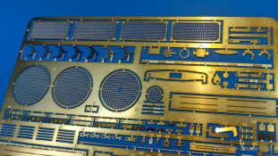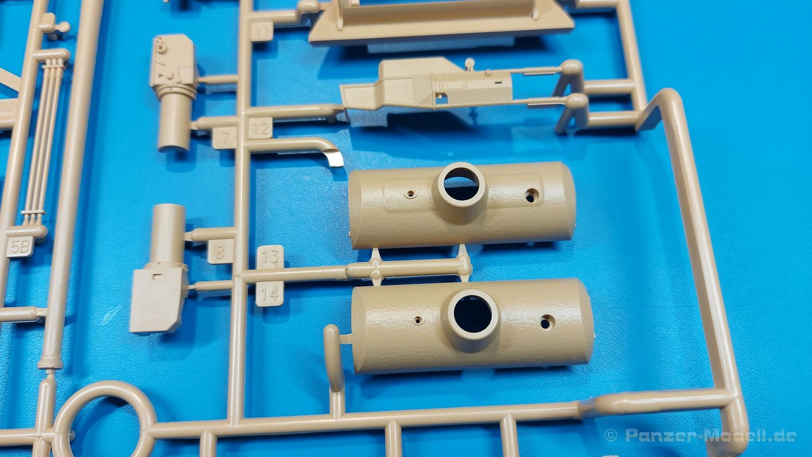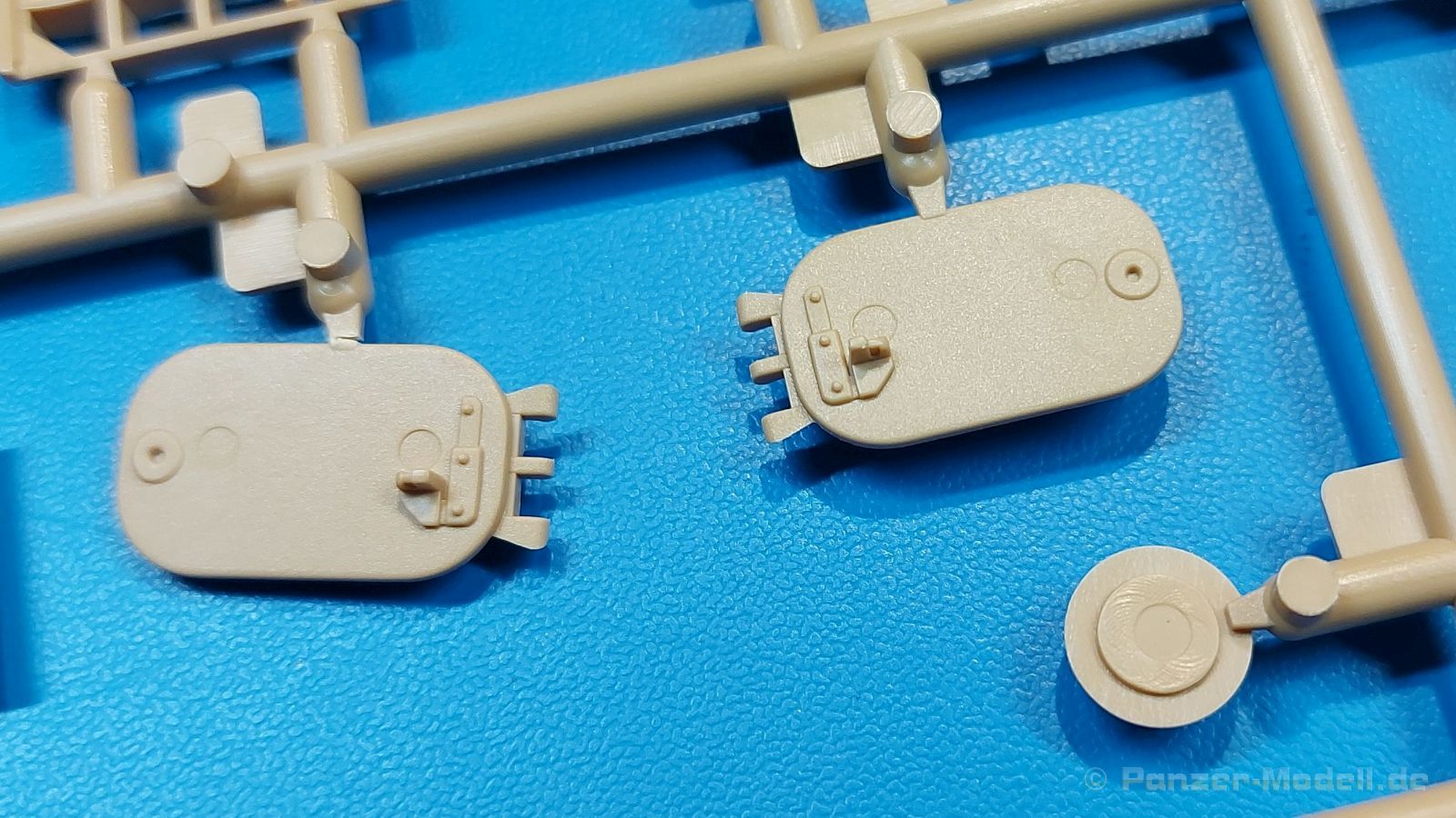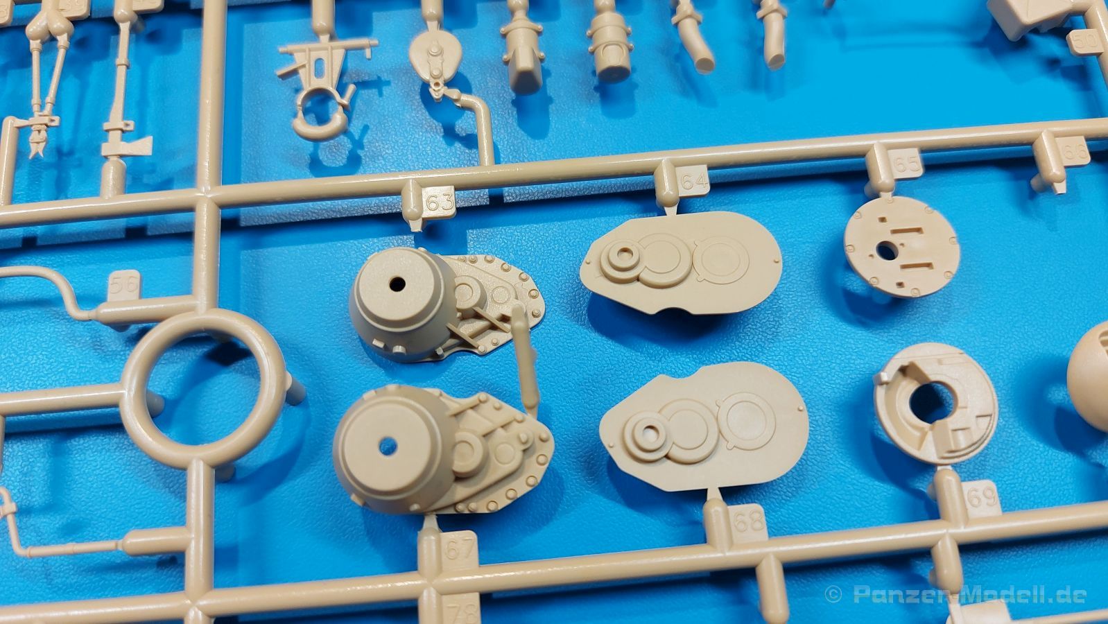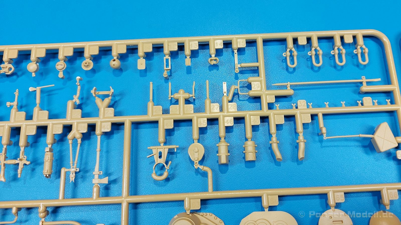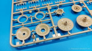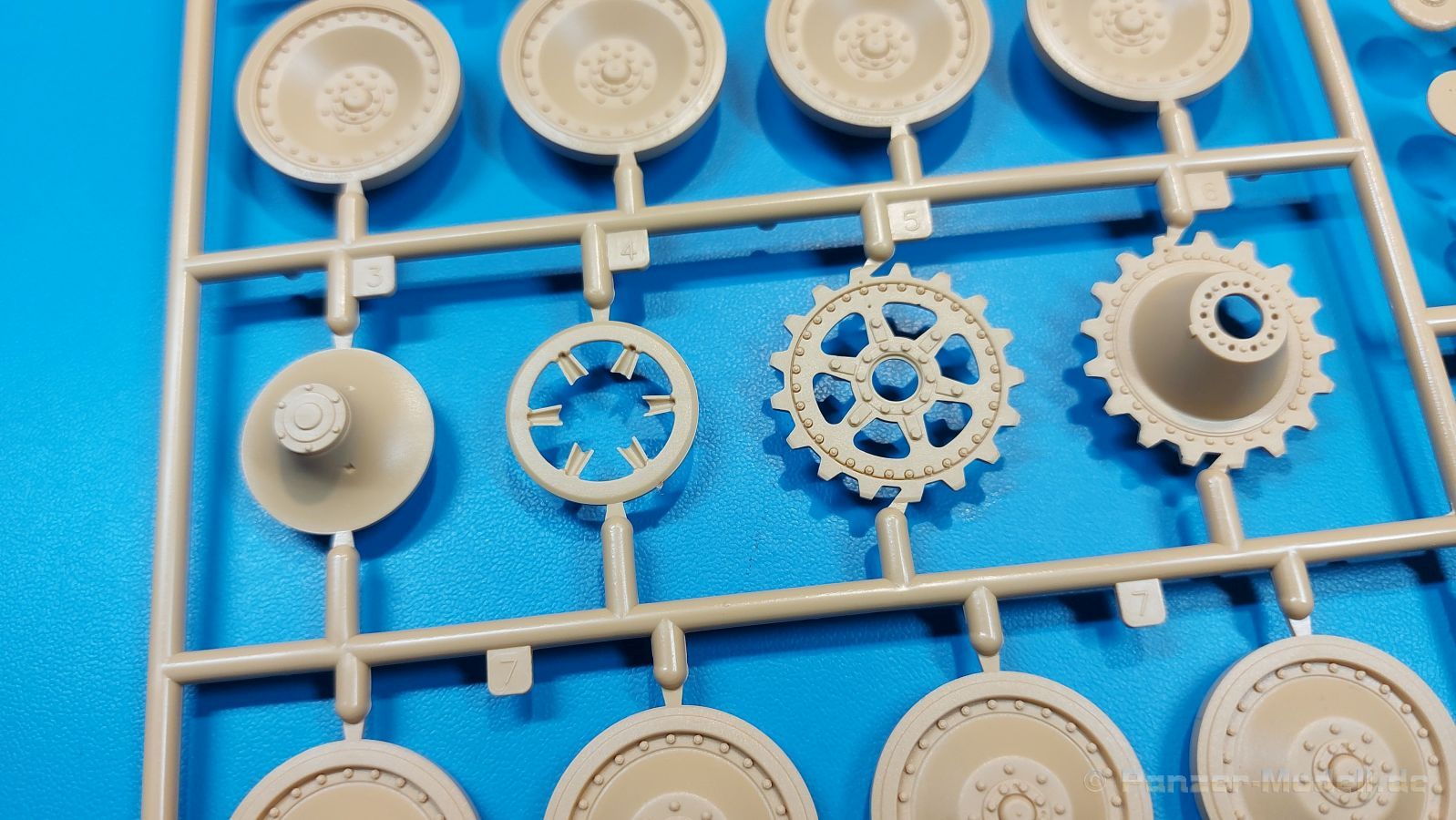 Der deutsche Panzerkampfwagen V Panther war im zweiten Weltkrieg die Antwort auf den T-34 der Sowjets. Erste Designs sahen sogar fast wie ein T-34 mit Schachtellaufwerk aus. Anders als die üblichen deutschen Panzer hatte er eine abgeschrägte Panzerung. Seine Kaliber 7,5 cm Kampfwagenkanone 42 mit 70 Kaliberlängen konnte je nach verwendeter Munition selbst auf 2.000 Meter Entfernung noch Panzerungen von 89-106 mm durchschlagen. Als Sekundärbewaffnung standen 7,92mm MG34 zur Verfügung. Trotz seines, für einen mittleren Panzer hohen Gewichts von fast 45 Tonnen konnte er mit dem 700 PS Maybach Motor eine Höchstgeschwindigkeit bis zu 55 km/h erreichen. Seine Besatzung bestand aus dem Kommandanten, Richt-, Ladeschütze, Funker und Fahrer. Varianten des Panthers waren Befehlspanther, Bergepanther und Jagdpanther, aber es wurden noch weitere entwickelt, die teils bis ins Prototypen Stadium vorrankamen. Der Panther war an allen europäischen Fronten eingesetzt. Etliche Exemplare überlebten den Krieg und sind, teils sogar fahrbereit, in Museen zu sehen. Der Bausatz: Gleichzeitig mit einem anderen Hersteller setzte Rye Field Models 2018, unter anderem durch eine vollständige Inneneinrichtung, neue Maßstäbe im âPantherbauâ. Auf Basis dieses fantastischen Modells entstanden weitere, auch ohne Inneneinrichtung. Auch der heutige Befehlspanther enthält Teile des Interior Modells, wie man an den Innenseiten mancher Teile erkennen kann. Der weiße Stülpdeckelkarton zeigt einen farbigen Seitenriss eines Befehlspanthers mit drei aufgestellten Antennen. An einer Seite sind Bauvarianten (mit und ohne Kampfraumheizung, Antennenvariationen, offene oder geschlossene Luken) zu sehen, auf der anderen Markierungsvarianten. Der Karton ist 380 x 240 x 90 mm groß und enthält neun sandgelbe Spritzlinge, einen Klarsichtspritzling, einen schwarzen Vinylspritzling, ein Tütchen mit silbergrauen Spritzlingen, jeder mit zwei Kettengliedern, zwei Fotoätzteil-Platinen, ein kleines Decalblatt und die Bauanleitung. Die Spritzlinge sind einwandfrei, die Teile ohne Versatz oder Sinkstellen. Details sind scharf und gut herausgearbeitet. Es gibt einige sichtbare Auswerferspuren, aber sie befinden sich auf Innen- und Unterseiten von Teilen und können größtenteils ignoriert werden. Auch der Vinylspritzling ist sehr sauber ausgespritzt, ohne Fischhäute und mit sehr scharfen Details, die man bei dem weichen Material vielleicht nicht so erwartet. Die Unterwanne setzt sich aus Bodenplatte, den Seitenwänden, sowie Heckwand und Bugplatten zusammen und weisen bereits angegossene, beeindruckende Details auf. Die Schwingarmhülsen werden einzeln und nach rechts und links getrennt in die Wanne eingeklebt. Auch diese zeigen sehr schöne Details, auch wenn sie nicht zur Präsentation gedacht sind ob des fehlenden Interieurs. Die Schwingarme werden einzeln eingesteckt und können entweder mit der angegossenen Passnase fest eingebaut werden oder, durch entfernen der Passnase, schwingend eingebaut werden, um die Federung zu simulieren, bzw. bei Einbau des Modells in ein unebenes Diorama die eingefederten Laufrollen darzustellen. Die Laufrollen machen einen hervorragenden Eindruck mit sehr feinen Details der Radmuttern und Gummierung mit ultrarealistischen Herstelleraufdrucken. Zusätzlich gibt es Laufrollen ohne Gummierung, um z.B. beschädigte Laufrollen ohne Gummierung darzustellen, bzw. mit aufsteckbarer Gummierung aus schwarzem Weichplastik und zwei Stahllaufrollen für die letzten Radstation, die aber für die Befehlsversion gemäß Anleitung nicht benötigt werden. Die Ketten sind klasse, denn die Einzelglieder haben jeweils nur zwei Angüsse und haben die Führungszähne bereits mit angegossen - und trotzdem ist die Detailqualität der Glieder mit Durchbrüchen und feinen Gussnummern sehr gut, wenn auch pro Glied eine flache Auswerfermarke mittig auf der Innenseite vorhanden ist. Die Kettenglieder werden mittels einer Montagehilfe beweglich zusammengesteckt und durch Kettenbolzen gesichert. Die Kettenbolzen sind jeweils zu Fünferblöcken gegossen, werden eingesteckt und dann erst von Gussast getrennt. Innen- und Außenbolzen sind unterschiedlich, also aufmerksam arbeiten. Eisgreifer für die Kette liegen ebenso bei wie ein Kettenwerkzeug aus PE, mit dem man eine Kettenmontage simulieren kann, wenn man die Brechstange von seinen Halterungen befreit. Ich sehe schon einen MiniArt Soldaten bei den Kettenarbeiten! Die Decals sind sauber gedruckt und seidenmatt glänzend, mit wenig Trägerrand. Der Trägerfilm ist angenehm dünn. Es gibt zwei Decaloptionen: