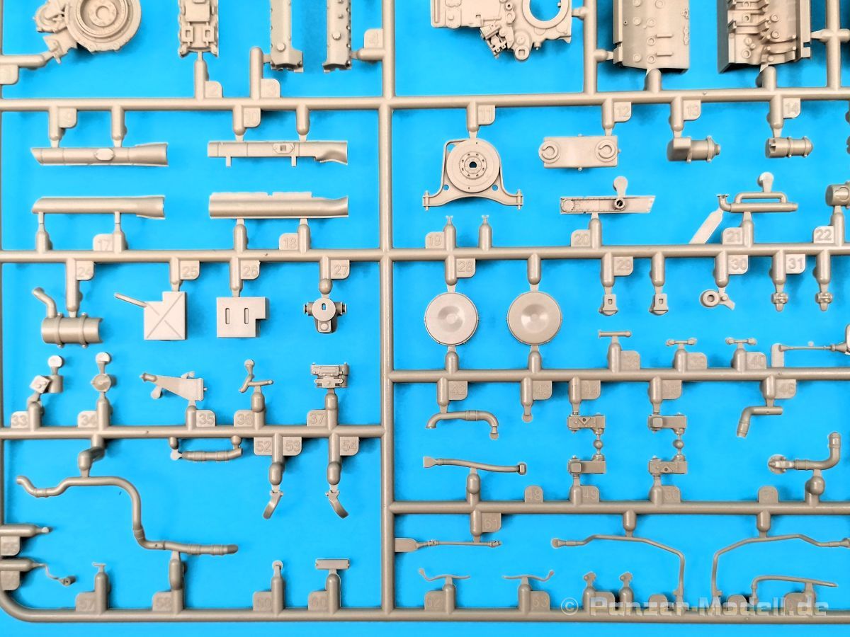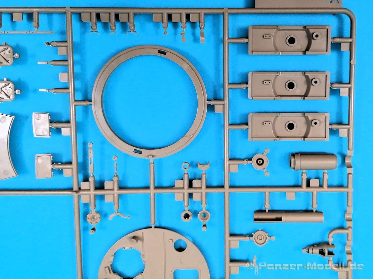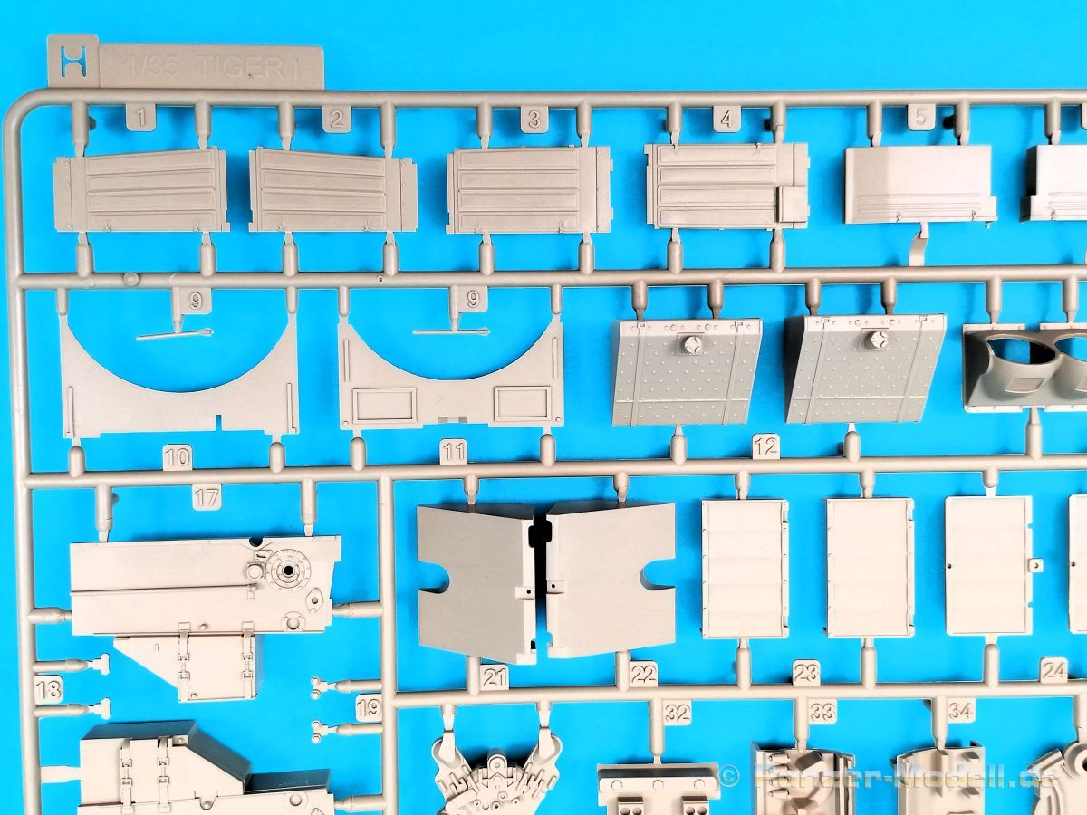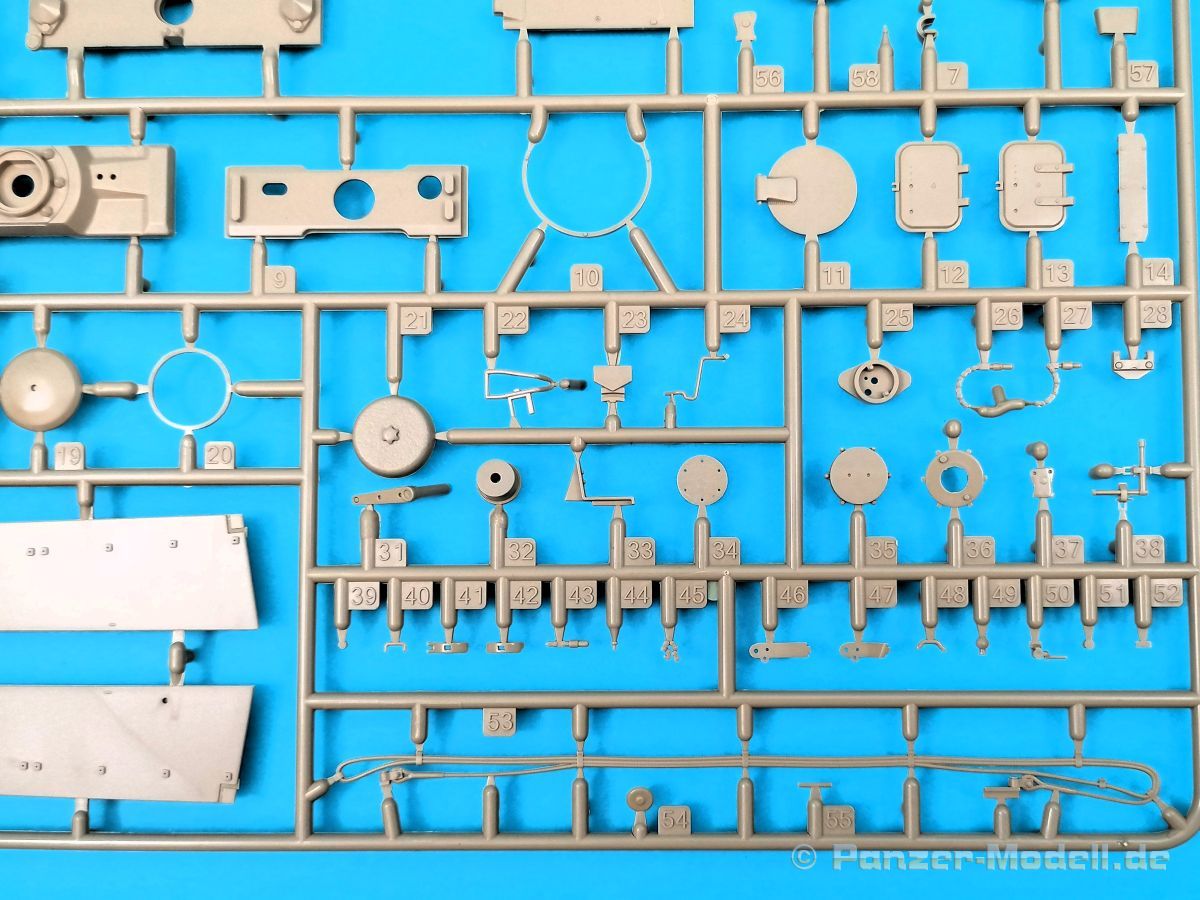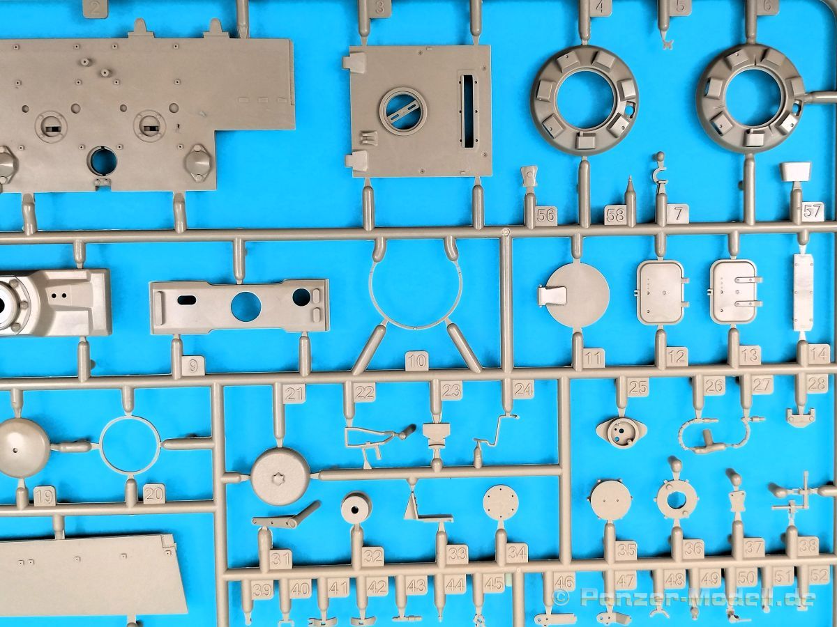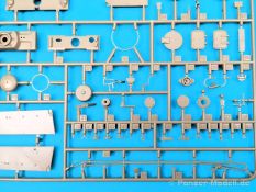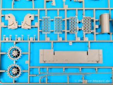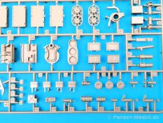 Mit dem 100sten Kit hat uns RFM mit einem weiteren Tiger I beglückt. Noch ein Tiger? Richtig, aber dieser Bausatz hat es in sich. In dem voluminösen Karton (38 x 24 x 15 cm) finden sich Bauteile für den Bau eines “normalen” Tigers oder den Bau eines Schnittmodells das in dieser Art in einigen Museen anzutreffen ist. Alles garniert mit einer Inneneinrichtung. Inwieweit der geneigte Modellbauer die Inneneinrichtung bei der “normalen” Bauweise verbaut, muß jeder für sich selbst entscheiden. Macht für mich keinen Sinn, da davon hinterher so gut wie nichts zu sehen ist, außer Teile durch evtl. geöffnete Luken. Zwingend notwendig aber beim Schnittmodell. 23 Rahmen, Klarsichtteile, Einzelgliederketten, drei Ätzteilbögen, ein Metallkabel und ein Decalbogen kommen nach dem Öffnen des Kartons zum Vorschein. Dazu die Bauanleitung, die sich mit 40 Seiten im Format DIN A4 schon als kleines Heftchen zeigt. Bereits der erste prüfende Blick zeigt Spritzguß auf der Höhe der Zeit. Auf den angenehm in einem sandgelben Ton eingefärbten Teilen zeigen sich keine Auswerfer in den sichtbaren Bereichen, geschweige von vorhandenem Flash oder Formenversatz. Auch Sinkstellen waren keine auszumachen. Die Schärfe und die Details der Bauteile lassen richtig Freude aufkommen. Bolzen, Schweißnähte etc. können überzeugen. Gleiches gilt auch für allerfeinste Teile wie z.B. Leitungen. Diese Kriterien gelten im allgemeinen für den Außenbereich ebenso wie für die Inneneinrichtung. Selbstverständlich liegen für den Bau des Schnittmodells alle Bauteile alternativ vor. Das Deckblatt der Bauanleitung beinhaltet neben der Wiedergabe des Deckelbilds die üblichen Piktogramme und Warnhinweise. Die folgenden drei Seiten sind für die Darstellung der Spritzlinge mit den Bauteilen in der gewohnten Manier ausgelegt. Ebenfalls vorhanden und aufgeführt sind alle Optionsteile. Erst auf Seite fünf startet der eigentliche Bau des Panzers bei dem sich der geneigte Modellbauer entscheiden muß welche Variante er bauen will. Hier kommt auch der erste Hinweis zum Bau des Schnittmodells bei dem viele Zeichnungen in Grün gehalten sind. Blau hinterlegt sind häufig bereits eingebaute Teile und auch Klebestellen in Rot gekennzeichnet. Im Prinzip fängt der Bau klassisch mit ausgewählten Unterwanne an der die Komponenten des Laufwerks montiert werden. Um die Schwingarme beweglich zu machen ist lediglich ein kleines Nupsi zu entfernen. Zum Einbau kommen anschließend Stoßdämpfer, Fahrer- und Beifahrersitz und viele weitere Kleinteile. Den größten Brocken machen die Konsole mit den Instrumenten und die ansprechend gestaltete Getriebeeinheit aus. Etwas aufwändig dürften sich die Granathalterungen anlassen die mit einzelnen unterschiedlichen Granaten gefüllt werden. Die Granaten werden mit jeweils drei Decals bestückt. Schränke und weiter Kleinteile wie z.B. die Munitionssäcke für die MGs finden ebenfalls ihren Platz. Der Einbau des Brandschotts zum Motor schließt die Montage des vorderen Bereichs ab. Über sieben Abschnitte zieht sich anschließend der Bau des Motors mit allen Anbauteilen und Aggregaten hin. Auch hier Bauteile, die mit einer tollen Detailtreue aufwarten. Abschluß findet sich mit der Montage des Heckblechs mit seinen Anbauteilen. Ab Baustufe 26 ist erhöhte Aufmersamkeit geboten da hier die Optionen für das Schnittmodell mit aufgeführt werden. In erster Linie beschäftigen sich die Abschnitte mit den “Schuhen” und deren Montage. Etwas aufwändig ist der Bau der Kettentrümmer da die Führungszähne einzeln aufgeklebt werden. Mit den zugehörigen Pins kann die Beweglichkeit der Kette erhalten bleiben. Im Anschluß erfolgt die Montage des Decks mit weiteren Ausrüstungsgegenständen. Wenn hier alles “verbraten” ist folgt letztendlich der Bau des Turmes. Auch in diesem Fall werden detailreiche Teile verbaut. Alles scheinbar vollständig. Angefangen von der 8,8cm mit Laffetierung bis hin zu Handrädern, Sitzen, Kanistern und weiteren Bauteilen… Um auf alles einzugehen ist nicht möglich da das Gesamtpaket einfach zu umfangreich ist. Die Anleitung ist recht gut aufgebaut. In den einzelnen Abschnitten sind Hinweise zu finden wenn z.B. Löcher gebohrt werden müssen. Ebenfalls finden sich kleine Graphiken wenn z.B. Baugruppen zusammengeführt werden, die dann in das Gesamtkonstrukt eingebaut werden. Daneben sind auch weitere Graphiken, teilweise farbig vorhanden, die den jeweiligen Bauabschnitt in einer Gesamtansicht darstellen. Dazu ein Hinweis in eigener Sache: Alle Bauteile sollten im Vorfeld vor Einbau bemalt und gealtert werden. Eine nachträgliche Kolorierung ist etwas schwieriger und zudem nervig. Wo viel Licht ist aber auch Schatten… Negativ macht sich das fehlen eines Zimmerits bemerkbar – sehr schade. Eigenregie ist eventuell angesagt, außer man wird im After-Market-Bereich fündig, z.B. bei ATAK. Nicht zielführend ist auch die Tatsache das in der Anleitung keinerlei Farbangaben zu den einzelnen Teilen zu finden sind. Allerdings sollte das für die “alten Hasen” unter uns kein Problem darstellen. Verwiesen wird u.a. auf Publikationen von AMIG und weiteren Büchern sowie dem Internet. Leider werden keine Farbhersteller mit einer Legende gelistet. Lediglich in den Bemalungsvorschlägen tauchen Farbnummern auf die auf das Sortiment von Mr. Hobby hinweisen. Zumindest in diesem Fall kann der Modellbauer auf Farben von anderen Herstellern einen Rückschluß ziehen. Auf insgesamt vier Seiten stellt uns RFM acht Bemalungsvorschläge zur Verfügung. Interessanterweise nur in einer Drei-Seiten Ansicht. Schade! Hinweise in welchen Abteilungen der Panzer fuhr sind vorhanden. Ort und Zeitpunkt sind ebenfalls deklariert. Diese Angaben fehlen lediglich bei dem vorletzten Bemalungsvorschlag. Die dem Kit beiliegenden Decals sind ohne Tadel gedruckt und können überzeugen. Ohne die Schattenseiten überzubewerten haben wir einen schönen und überzeugenden Bausatz vor uns liegen.