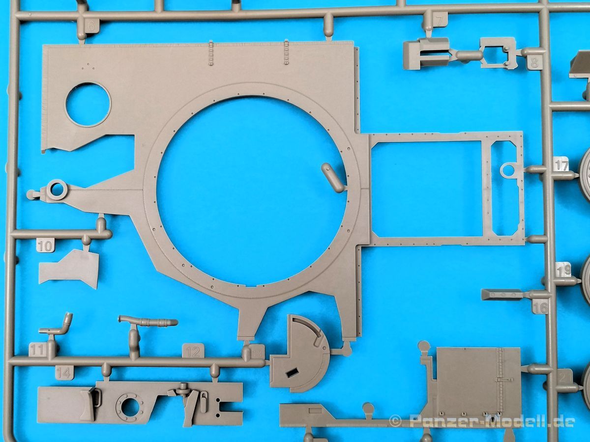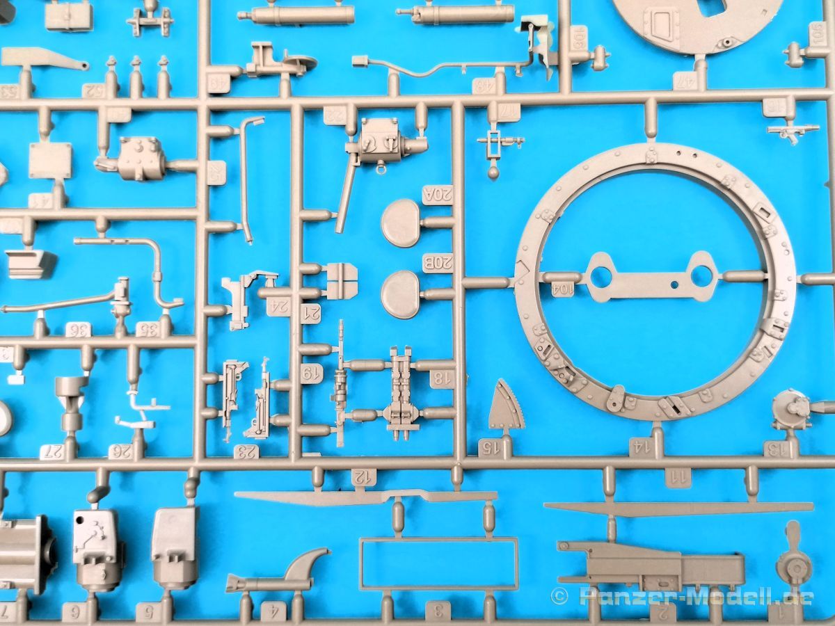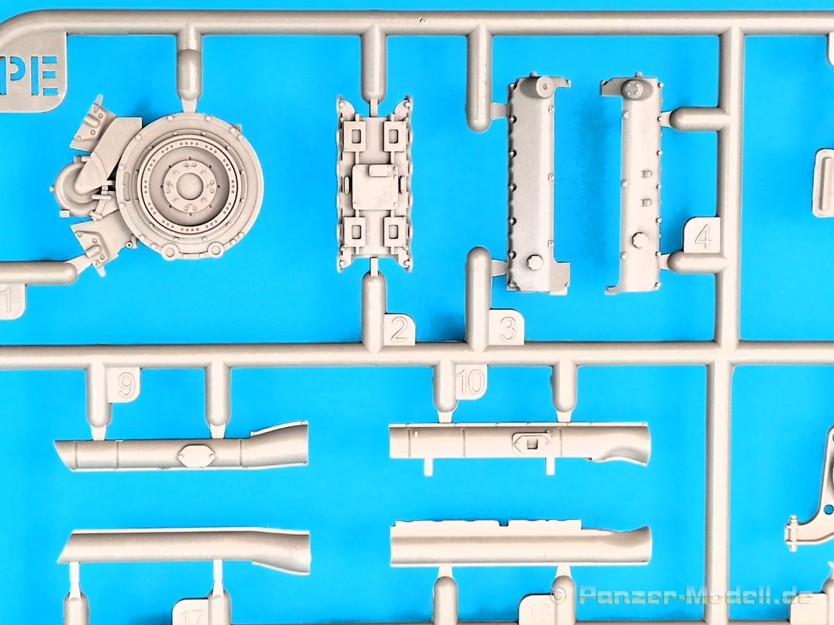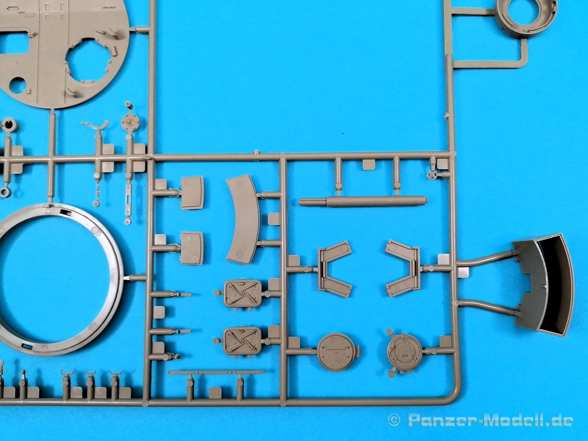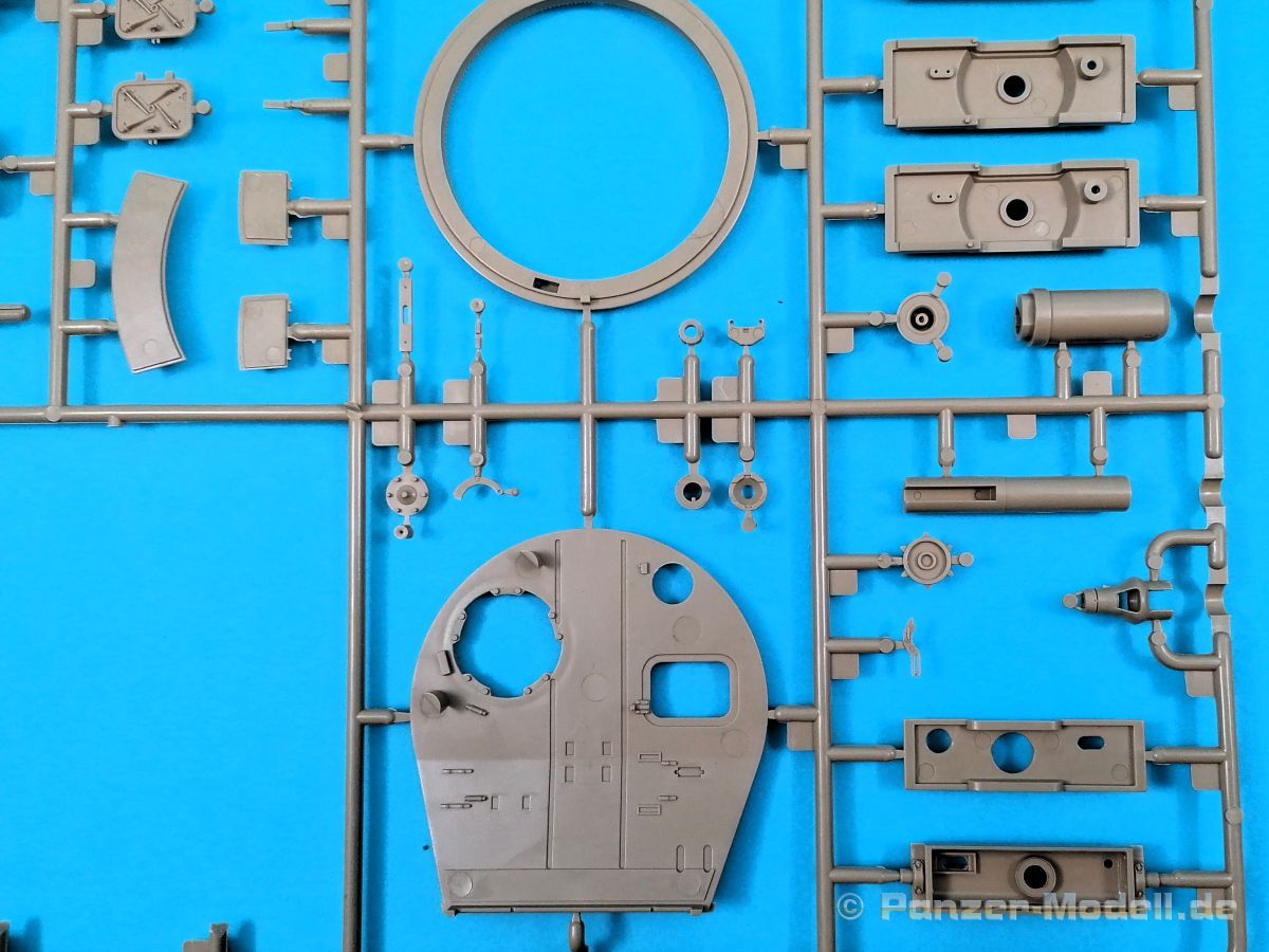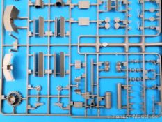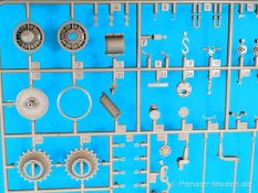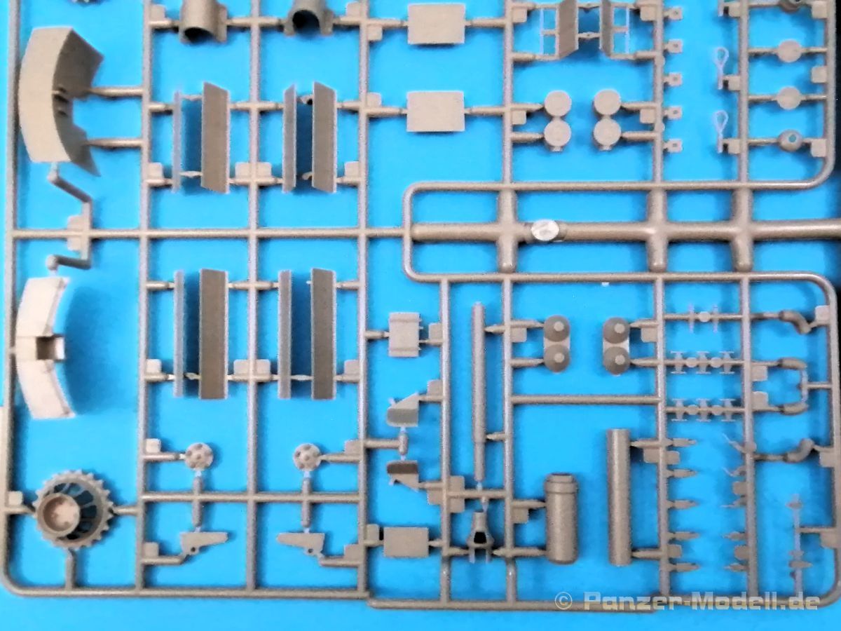 Mit dem 100sten Kit hat uns RFM mit einem weiteren Tiger I beglückt. Noch ein Tiger? Richtig, aber dieser Bausatz hat es in sich. In dem voluminösen Karton (38 x 24 x 15 cm) finden sich Bauteile für den Bau eines “normalen” Tigers oder den Bau eines Schnittmodells das in dieser Art in einigen Museen anzutreffen ist. Alles garniert mit einer Inneneinrichtung. Inwieweit der geneigte Modellbauer die Inneneinrichtung bei der “normalen” Bauweise verbaut, muß jeder für sich selbst entscheiden. Macht für mich keinen Sinn, da davon hinterher so gut wie nichts zu sehen ist, außer Teile durch evtl. geöffnete Luken. Zwingend notwendig aber beim Schnittmodell. 23 Rahmen, Klarsichtteile, Einzelgliederketten, drei Ätzteilbögen, ein Metallkabel und ein Decalbogen kommen nach dem Öffnen des Kartons zum Vorschein. Dazu die Bauanleitung, die sich mit 40 Seiten im Format DIN A4 schon als kleines Heftchen zeigt. Bereits der erste prüfende Blick zeigt Spritzguß auf der Höhe der Zeit. Auf den angenehm in einem sandgelben Ton eingefärbten Teilen zeigen sich keine Auswerfer in den sichtbaren Bereichen, geschweige von vorhandenem Flash oder Formenversatz. Auch Sinkstellen waren keine auszumachen. Die Schärfe und die Details der Bauteile lassen richtig Freude aufkommen. Bolzen, Schweißnähte etc. können überzeugen. Gleiches gilt auch für allerfeinste Teile wie z.B. Leitungen. Diese Kriterien gelten im allgemeinen für den Außenbereich ebenso wie für die Inneneinrichtung. Selbstverständlich liegen für den Bau des Schnittmodells alle Bauteile alternativ vor. Das Deckblatt der Bauanleitung beinhaltet neben der Wiedergabe des Deckelbilds die üblichen Piktogramme und Warnhinweise. Die folgenden drei Seiten sind für die Darstellung der Spritzlinge mit den Bauteilen in der gewohnten Manier ausgelegt. Ebenfalls vorhanden und aufgeführt sind alle Optionsteile. Erst auf Seite fünf startet der eigentliche Bau des Panzers bei dem sich der geneigte Modellbauer entscheiden muß welche Variante er bauen will. Hier kommt auch der erste Hinweis zum Bau des Schnittmodells bei dem viele Zeichnungen in Grün gehalten sind. Blau hinterlegt sind häufig bereits eingebaute Teile und auch Klebestellen in Rot gekennzeichnet. Im Prinzip fängt der Bau klassisch mit ausgewählten Unterwanne an der die Komponenten des Laufwerks montiert werden. Um die Schwingarme beweglich zu machen ist lediglich ein kleines Nupsi zu entfernen. Zum Einbau kommen anschließend Stoßdämpfer, Fahrer- und Beifahrersitz und viele weitere Kleinteile. Den größten Brocken machen die Konsole mit den Instrumenten und die ansprechend gestaltete Getriebeeinheit aus. Etwas aufwändig dürften sich die Granathalterungen anlassen die mit einzelnen unterschiedlichen Granaten gefüllt werden. Die Granaten werden mit jeweils drei Decals bestückt. Schränke und weiter Kleinteile wie z.B. die Munitionssäcke für die MGs finden ebenfalls ihren Platz. Der Einbau des Brandschotts zum Motor schließt die Montage des vorderen Bereichs ab. Über sieben Abschnitte zieht sich anschließend der Bau des Motors mit allen Anbauteilen und Aggregaten hin. Auch hier Bauteile, die mit einer tollen Detailtreue aufwarten. Abschluß findet sich mit der Montage des Heckblechs mit seinen Anbauteilen. Ab Baustufe 26 ist erhöhte Aufmersamkeit geboten da hier die Optionen für das Schnittmodell mit aufgeführt werden. In erster Linie beschäftigen sich die Abschnitte mit den “Schuhen” und deren Montage. Etwas aufwändig ist der Bau der Kettentrümmer da die Führungszähne einzeln aufgeklebt werden. Mit den zugehörigen Pins kann die Beweglichkeit der Kette erhalten bleiben. Im Anschluß erfolgt die Montage des Decks mit weiteren Ausrüstungsgegenständen. Wenn hier alles “verbraten” ist folgt letztendlich der Bau des Turmes. Auch in diesem Fall werden detailreiche Teile verbaut. Alles scheinbar vollständig. Angefangen von der 8,8cm mit Laffetierung bis hin zu Handrädern, Sitzen, Kanistern und weiteren Bauteilen… Um auf alles einzugehen ist nicht möglich da das Gesamtpaket einfach zu umfangreich ist. Die Anleitung ist recht gut aufgebaut. In den einzelnen Abschnitten sind Hinweise zu finden wenn z.B. Löcher gebohrt werden müssen. Ebenfalls finden sich kleine Graphiken wenn z.B. Baugruppen zusammengeführt werden, die dann in das Gesamtkonstrukt eingebaut werden. Daneben sind auch weitere Graphiken, teilweise farbig vorhanden, die den jeweiligen Bauabschnitt in einer Gesamtansicht darstellen. Dazu ein Hinweis in eigener Sache: Alle Bauteile sollten im Vorfeld vor Einbau bemalt und gealtert werden. Eine nachträgliche Kolorierung ist etwas schwieriger und zudem nervig. Wo viel Licht ist aber auch Schatten… Negativ macht sich das fehlen eines Zimmerits bemerkbar – sehr schade. Eigenregie ist eventuell angesagt, außer man wird im After-Market-Bereich fündig, z.B. bei ATAK. Nicht zielführend ist auch die Tatsache das in der Anleitung keinerlei Farbangaben zu den einzelnen Teilen zu finden sind. Allerdings sollte das für die “alten Hasen” unter uns kein Problem darstellen. Verwiesen wird u.a. auf Publikationen von AMIG und weiteren Büchern sowie dem Internet. Leider werden keine Farbhersteller mit einer Legende gelistet. Lediglich in den Bemalungsvorschlägen tauchen Farbnummern auf die auf das Sortiment von Mr. Hobby hinweisen. Zumindest in diesem Fall kann der Modellbauer auf Farben von anderen Herstellern einen Rückschluß ziehen. Auf insgesamt vier Seiten stellt uns RFM acht Bemalungsvorschläge zur Verfügung. Interessanterweise nur in einer Drei-Seiten Ansicht. Schade! Hinweise in welchen Abteilungen der Panzer fuhr sind vorhanden. Ort und Zeitpunkt sind ebenfalls deklariert. Diese Angaben fehlen lediglich bei dem vorletzten Bemalungsvorschlag. Die dem Kit beiliegenden Decals sind ohne Tadel gedruckt und können überzeugen. Ohne die Schattenseiten überzubewerten haben wir einen schönen und überzeugenden Bausatz vor uns liegen.
