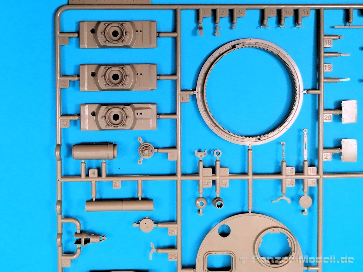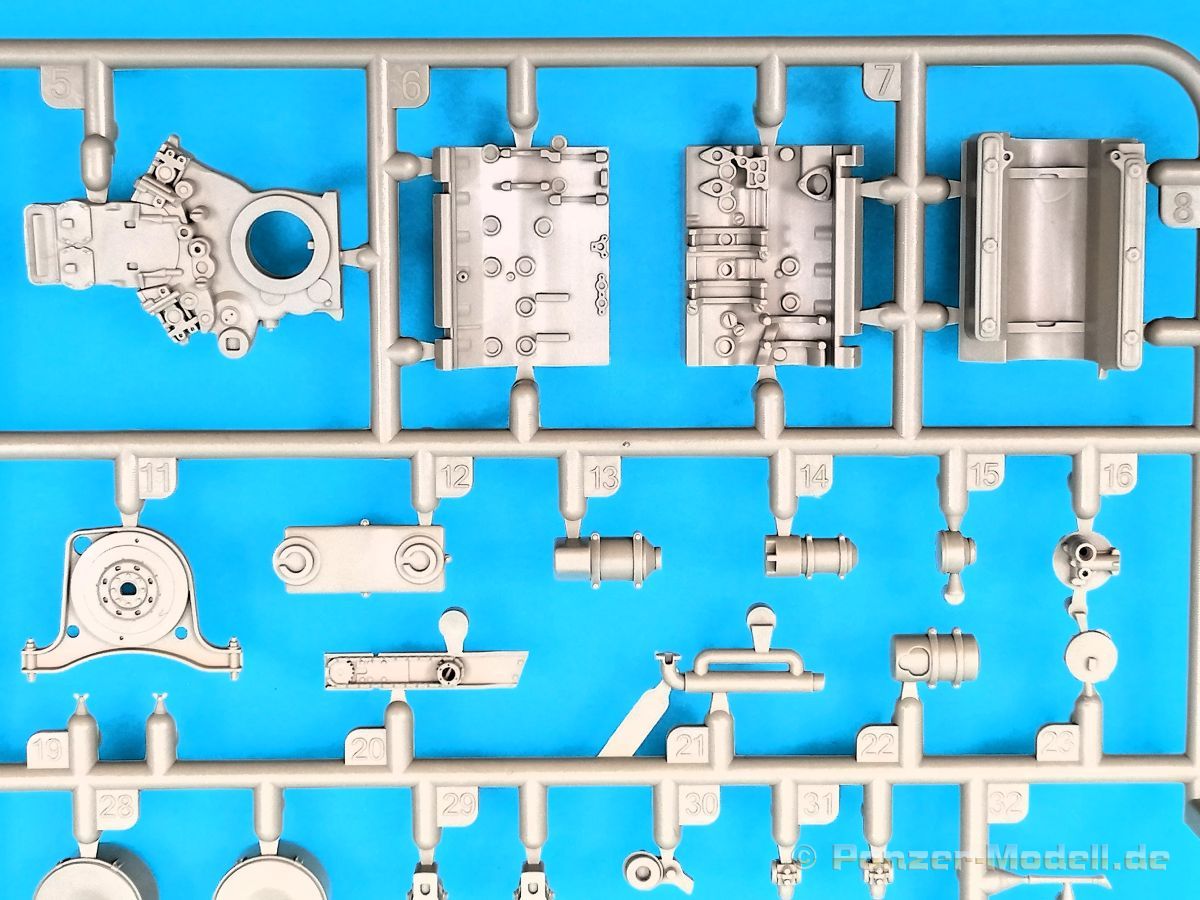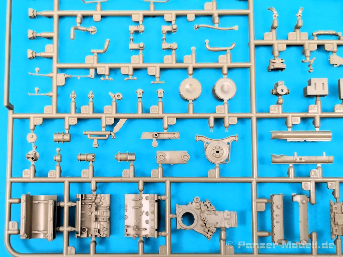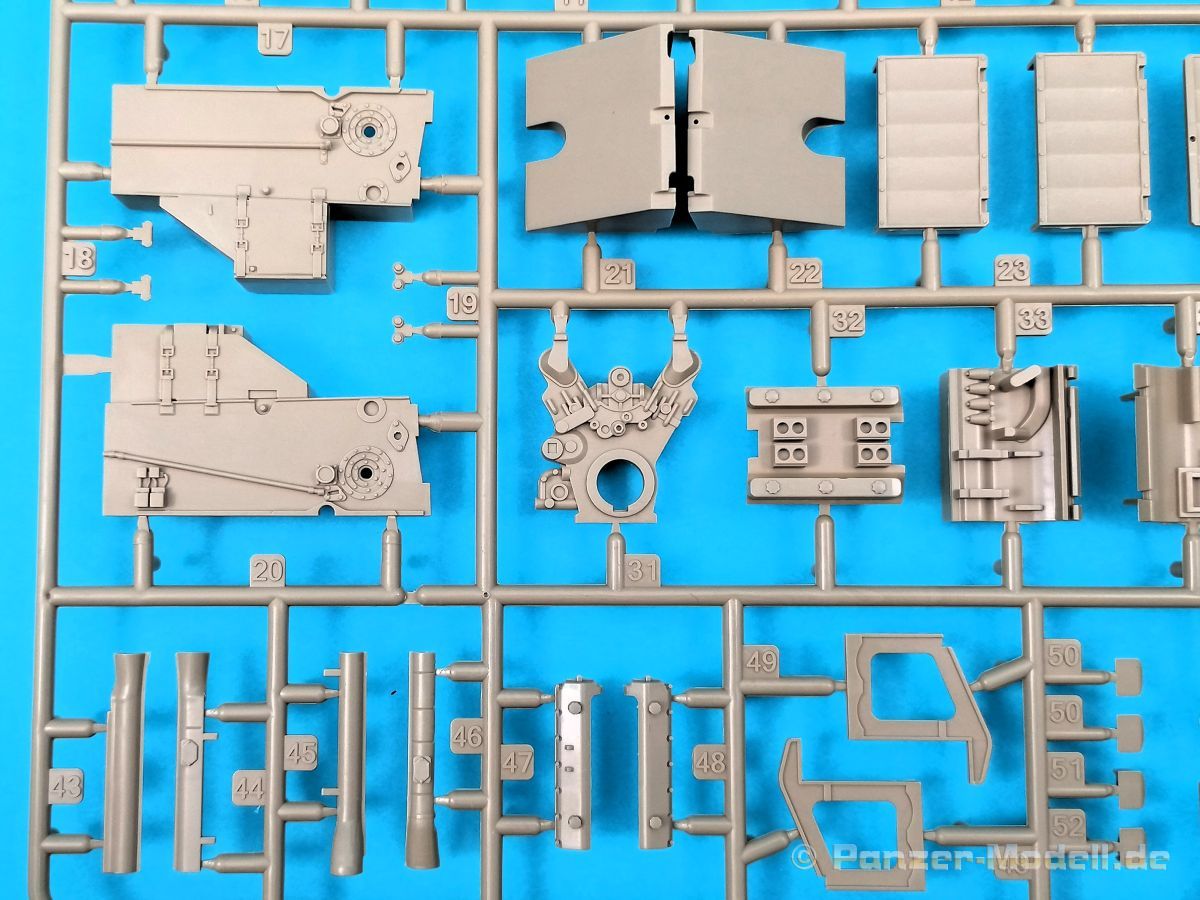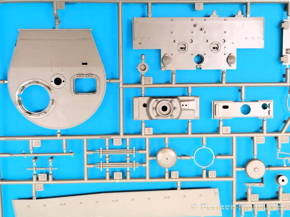 Mit dem 100sten Kit hat uns RFM mit einem weiteren Tiger I beglückt. Noch ein Tiger? Richtig, aber dieser Bausatz hat es in sich. In dem voluminösen Karton (38 x 24 x 15 cm) finden sich Bauteile für den Bau eines “normalen” Tigers oder den Bau eines Schnittmodells das in dieser Art in einigen Museen anzutreffen ist. Alles garniert mit einer Inneneinrichtung. Inwieweit der geneigte Modellbauer die Inneneinrichtung bei der “normalen” Bauweise verbaut, muß jeder für sich selbst entscheiden. Macht für mich keinen Sinn, da davon hinterher so gut wie nichts zu sehen ist, außer Teile durch evtl. geöffnete Luken. Zwingend notwendig aber beim Schnittmodell. 23 Rahmen, Klarsichtteile, Einzelgliederketten, drei Ätzteilbögen, ein Metallkabel und ein Decalbogen kommen nach dem Öffnen des Kartons zum Vorschein. Dazu die Bauanleitung, die sich mit 40 Seiten im Format DIN A4 schon als kleines Heftchen zeigt. Bereits der erste prüfende Blick zeigt Spritzguß auf der Höhe der Zeit. Auf den angenehm in einem sandgelben Ton eingefärbten Teilen zeigen sich keine Auswerfer in den sichtbaren Bereichen, geschweige von vorhandenem Flash oder Formenversatz. Auch Sinkstellen waren keine auszumachen. Die Schärfe und die Details der Bauteile lassen richtig Freude aufkommen. Bolzen, Schweißnähte etc. können überzeugen. Gleiches gilt auch für allerfeinste Teile wie z.B. Leitungen. Diese Kriterien gelten im allgemeinen für den Außenbereich ebenso wie für die Inneneinrichtung. Selbstverständlich liegen für den Bau des Schnittmodells alle Bauteile alternativ vor. Das Deckblatt der Bauanleitung beinhaltet neben der Wiedergabe des Deckelbilds die üblichen Piktogramme und Warnhinweise. Die folgenden drei Seiten sind für die Darstellung der Spritzlinge mit den Bauteilen in der gewohnten Manier ausgelegt. Ebenfalls vorhanden und aufgeführt sind alle Optionsteile. Erst auf Seite fünf startet der eigentliche Bau des Panzers bei dem sich der geneigte Modellbauer entscheiden muß welche Variante er bauen will. Hier kommt auch der erste Hinweis zum Bau des Schnittmodells bei dem viele Zeichnungen in Grün gehalten sind. Blau hinterlegt sind häufig bereits eingebaute Teile und auch Klebestellen in Rot gekennzeichnet. Im Prinzip fängt der Bau klassisch mit ausgewählten Unterwanne an der die Komponenten des Laufwerks montiert werden. Um die Schwingarme beweglich zu machen ist lediglich ein kleines Nupsi zu entfernen. Zum Einbau kommen anschließend Stoßdämpfer, Fahrer- und Beifahrersitz und viele weitere Kleinteile. Den größten Brocken machen die Konsole mit den Instrumenten und die ansprechend gestaltete Getriebeeinheit aus. Etwas aufwändig dürften sich die Granathalterungen anlassen die mit einzelnen unterschiedlichen Granaten gefüllt werden. Die Granaten werden mit jeweils drei Decals bestückt. Schränke und weiter Kleinteile wie z.B. die Munitionssäcke für die MGs finden ebenfalls ihren Platz. Der Einbau des Brandschotts zum Motor schließt die Montage des vorderen Bereichs ab. Über sieben Abschnitte zieht sich anschließend der Bau des Motors mit allen Anbauteilen und Aggregaten hin. Auch hier Bauteile, die mit einer tollen Detailtreue aufwarten. Abschluß findet sich mit der Montage des Heckblechs mit seinen Anbauteilen. Ab Baustufe 26 ist erhöhte Aufmersamkeit geboten da hier die Optionen für das Schnittmodell mit aufgeführt werden. In erster Linie beschäftigen sich die Abschnitte mit den “Schuhen” und deren Montage. Etwas aufwändig ist der Bau der Kettentrümmer da die Führungszähne einzeln aufgeklebt werden. Mit den zugehörigen Pins kann die Beweglichkeit der Kette erhalten bleiben. Im Anschluß erfolgt die Montage des Decks mit weiteren Ausrüstungsgegenständen. Wenn hier alles “verbraten” ist folgt letztendlich der Bau des Turmes. Auch in diesem Fall werden detailreiche Teile verbaut. Alles scheinbar vollständig. Angefangen von der 8,8cm mit Laffetierung bis hin zu Handrädern, Sitzen, Kanistern und weiteren Bauteilen… Um auf alles einzugehen ist nicht möglich da das Gesamtpaket einfach zu umfangreich ist. Die Anleitung ist recht gut aufgebaut. In den einzelnen Abschnitten sind Hinweise zu finden wenn z.B. Löcher gebohrt werden müssen. Ebenfalls finden sich kleine Graphiken wenn z.B. Baugruppen zusammengeführt werden, die dann in das Gesamtkonstrukt eingebaut werden. Daneben sind auch weitere Graphiken, teilweise farbig vorhanden, die den jeweiligen Bauabschnitt in einer Gesamtansicht darstellen. Dazu ein Hinweis in eigener Sache: Alle Bauteile sollten im Vorfeld vor Einbau bemalt und gealtert werden. Eine nachträgliche Kolorierung ist etwas schwieriger und zudem nervig. Wo viel Licht ist aber auch Schatten… Negativ macht sich das fehlen eines Zimmerits bemerkbar – sehr schade. Eigenregie ist eventuell angesagt, außer man wird im After-Market-Bereich fündig, z.B. bei ATAK. Nicht zielführend ist auch die Tatsache das in der Anleitung keinerlei Farbangaben zu den einzelnen Teilen zu finden sind. Allerdings sollte das für die “alten Hasen” unter uns kein Problem darstellen. Verwiesen wird u.a. auf Publikationen von AMIG und weiteren Büchern sowie dem Internet. Leider werden keine Farbhersteller mit einer Legende gelistet. Lediglich in den Bemalungsvorschlägen tauchen Farbnummern auf die auf das Sortiment von Mr. Hobby hinweisen. Zumindest in diesem Fall kann der Modellbauer auf Farben von anderen Herstellern einen Rückschluß ziehen. Auf insgesamt vier Seiten stellt uns RFM acht Bemalungsvorschläge zur Verfügung. Interessanterweise nur in einer Drei-Seiten Ansicht. Schade! Hinweise in welchen Abteilungen der Panzer fuhr sind vorhanden. Ort und Zeitpunkt sind ebenfalls deklariert. Diese Angaben fehlen lediglich bei dem vorletzten Bemalungsvorschlag. Die dem Kit beiliegenden Decals sind ohne Tadel gedruckt und können überzeugen. Ohne die Schattenseiten überzubewerten haben wir einen schönen und überzeugenden Bausatz vor uns liegen.