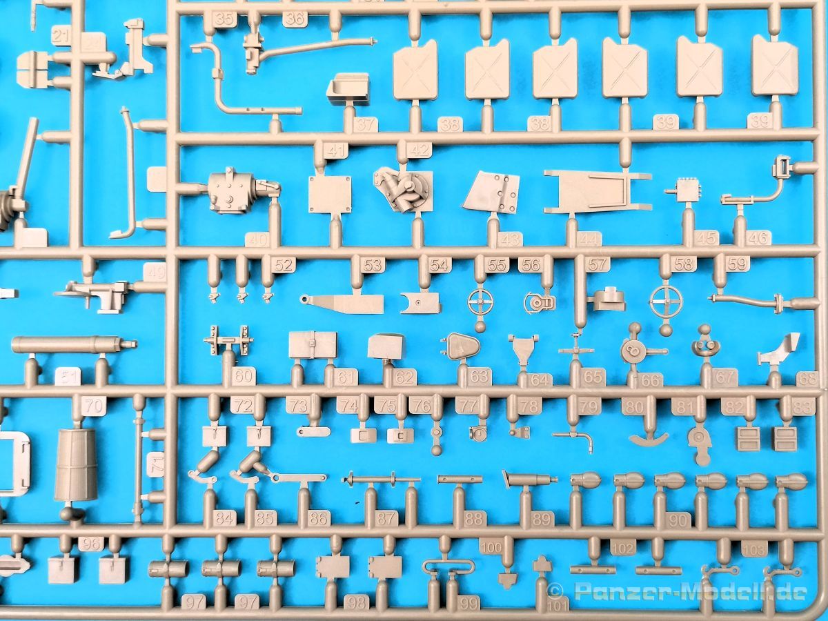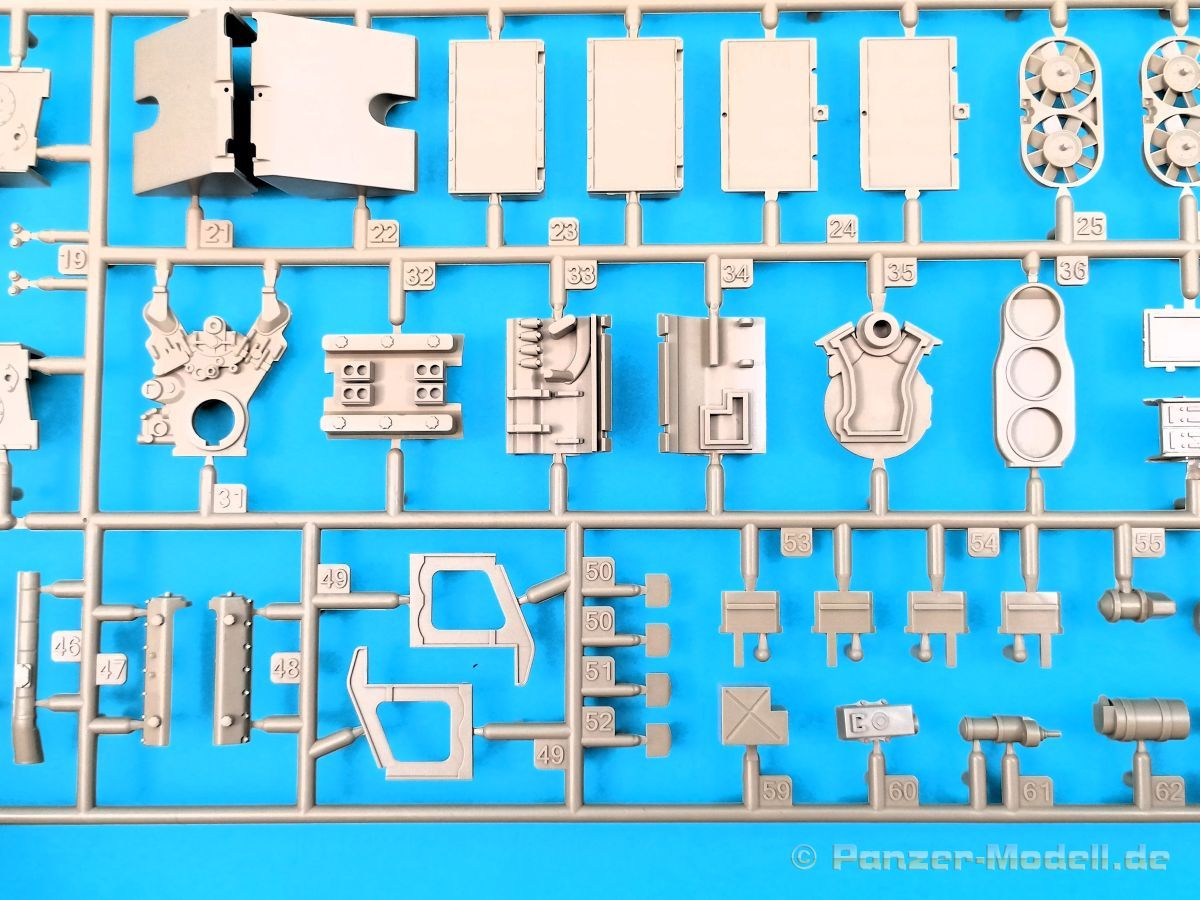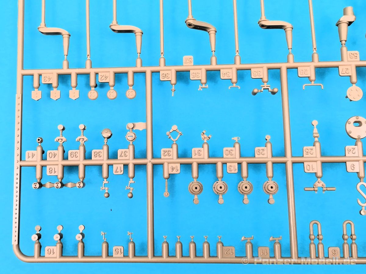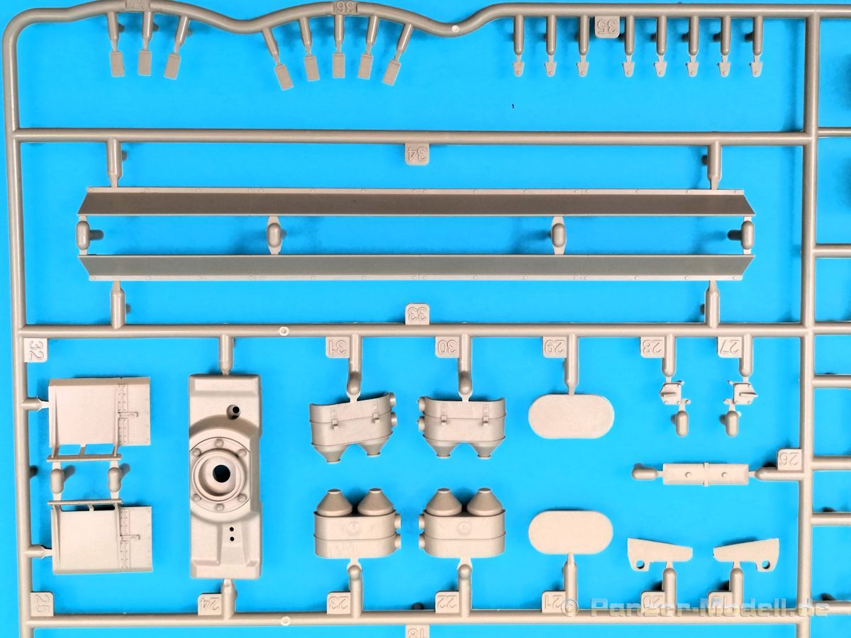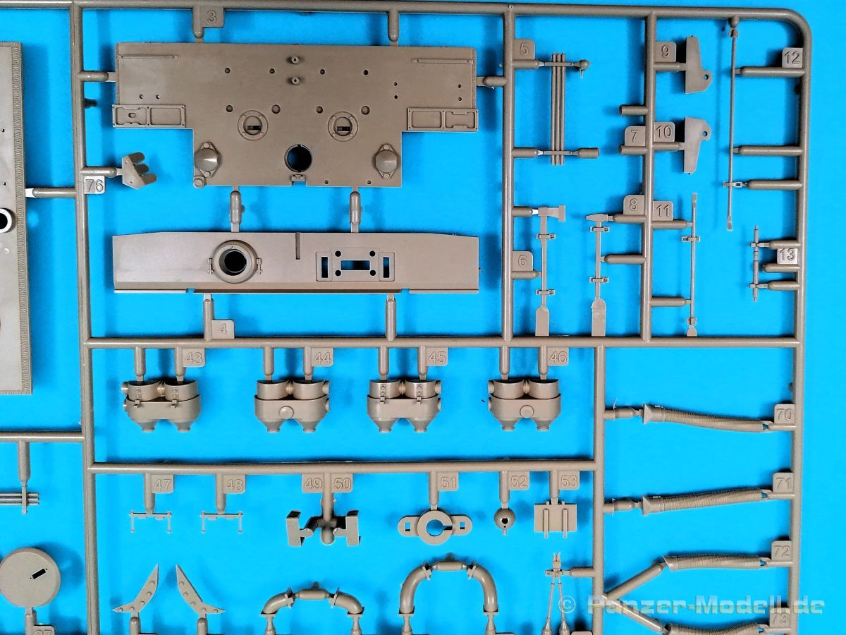 Mit dem 100sten Kit hat uns RFM mit einem weiteren Tiger I beglückt. Noch ein Tiger? Richtig, aber dieser Bausatz hat es in sich. In dem voluminösen Karton (38 x 24 x 15 cm) finden sich Bauteile für den Bau eines “normalen” Tigers oder den Bau eines Schnittmodells das in dieser Art in einigen Museen anzutreffen ist. Alles garniert mit einer Inneneinrichtung. Inwieweit der geneigte Modellbauer die Inneneinrichtung bei der “normalen” Bauweise verbaut, muß jeder für sich selbst entscheiden. Macht für mich keinen Sinn, da davon hinterher so gut wie nichts zu sehen ist, außer Teile durch evtl. geöffnete Luken. Zwingend notwendig aber beim Schnittmodell. 23 Rahmen, Klarsichtteile, Einzelgliederketten, drei Ätzteilbögen, ein Metallkabel und ein Decalbogen kommen nach dem Öffnen des Kartons zum Vorschein. Dazu die Bauanleitung, die sich mit 40 Seiten im Format DIN A4 schon als kleines Heftchen zeigt. Bereits der erste prüfende Blick zeigt Spritzguß auf der Höhe der Zeit. Auf den angenehm in einem sandgelben Ton eingefärbten Teilen zeigen sich keine Auswerfer in den sichtbaren Bereichen, geschweige von vorhandenem Flash oder Formenversatz. Auch Sinkstellen waren keine auszumachen. Die Schärfe und die Details der Bauteile lassen richtig Freude aufkommen. Bolzen, Schweißnähte etc. können überzeugen. Gleiches gilt auch für allerfeinste Teile wie z.B. Leitungen. Diese Kriterien gelten im allgemeinen für den Außenbereich ebenso wie für die Inneneinrichtung. Selbstverständlich liegen für den Bau des Schnittmodells alle Bauteile alternativ vor. Das Deckblatt der Bauanleitung beinhaltet neben der Wiedergabe des Deckelbilds die üblichen Piktogramme und Warnhinweise. Die folgenden drei Seiten sind für die Darstellung der Spritzlinge mit den Bauteilen in der gewohnten Manier ausgelegt. Ebenfalls vorhanden und aufgeführt sind alle Optionsteile. Erst auf Seite fünf startet der eigentliche Bau des Panzers bei dem sich der geneigte Modellbauer entscheiden muß welche Variante er bauen will. Hier kommt auch der erste Hinweis zum Bau des Schnittmodells bei dem viele Zeichnungen in Grün gehalten sind. Blau hinterlegt sind häufig bereits eingebaute Teile und auch Klebestellen in Rot gekennzeichnet. Im Prinzip fängt der Bau klassisch mit ausgewählten Unterwanne an der die Komponenten des Laufwerks montiert werden. Um die Schwingarme beweglich zu machen ist lediglich ein kleines Nupsi zu entfernen. Zum Einbau kommen anschließend Stoßdämpfer, Fahrer- und Beifahrersitz und viele weitere Kleinteile. Den größten Brocken machen die Konsole mit den Instrumenten und die ansprechend gestaltete Getriebeeinheit aus. Etwas aufwändig dürften sich die Granathalterungen anlassen die mit einzelnen unterschiedlichen Granaten gefüllt werden. Die Granaten werden mit jeweils drei Decals bestückt. Schränke und weiter Kleinteile wie z.B. die Munitionssäcke für die MGs finden ebenfalls ihren Platz. Der Einbau des Brandschotts zum Motor schließt die Montage des vorderen Bereichs ab. Über sieben Abschnitte zieht sich anschließend der Bau des Motors mit allen Anbauteilen und Aggregaten hin. Auch hier Bauteile, die mit einer tollen Detailtreue aufwarten. Abschluß findet sich mit der Montage des Heckblechs mit seinen Anbauteilen. Ab Baustufe 26 ist erhöhte Aufmersamkeit geboten da hier die Optionen für das Schnittmodell mit aufgeführt werden. In erster Linie beschäftigen sich die Abschnitte mit den “Schuhen” und deren Montage. Etwas aufwändig ist der Bau der Kettentrümmer da die Führungszähne einzeln aufgeklebt werden. Mit den zugehörigen Pins kann die Beweglichkeit der Kette erhalten bleiben. Im Anschluß erfolgt die Montage des Decks mit weiteren Ausrüstungsgegenständen. Wenn hier alles “verbraten” ist folgt letztendlich der Bau des Turmes. Auch in diesem Fall werden detailreiche Teile verbaut. Alles scheinbar vollständig. Angefangen von der 8,8cm mit Laffetierung bis hin zu Handrädern, Sitzen, Kanistern und weiteren Bauteilen… Um auf alles einzugehen ist nicht möglich da das Gesamtpaket einfach zu umfangreich ist. Die Anleitung ist recht gut aufgebaut. In den einzelnen Abschnitten sind Hinweise zu finden wenn z.B. Löcher gebohrt werden müssen. Ebenfalls finden sich kleine Graphiken wenn z.B. Baugruppen zusammengeführt werden, die dann in das Gesamtkonstrukt eingebaut werden. Daneben sind auch weitere Graphiken, teilweise farbig vorhanden, die den jeweiligen Bauabschnitt in einer Gesamtansicht darstellen. Dazu ein Hinweis in eigener Sache: Alle Bauteile sollten im Vorfeld vor Einbau bemalt und gealtert werden. Eine nachträgliche Kolorierung ist etwas schwieriger und zudem nervig. Wo viel Licht ist aber auch Schatten… Negativ macht sich das fehlen eines Zimmerits bemerkbar – sehr schade. Eigenregie ist eventuell angesagt, außer man wird im After-Market-Bereich fündig, z.B. bei ATAK. Nicht zielführend ist auch die Tatsache das in der Anleitung keinerlei Farbangaben zu den einzelnen Teilen zu finden sind. Allerdings sollte das für die “alten Hasen” unter uns kein Problem darstellen. Verwiesen wird u.a. auf Publikationen von AMIG und weiteren Büchern sowie dem Internet. Leider werden keine Farbhersteller mit einer Legende gelistet. Lediglich in den Bemalungsvorschlägen tauchen Farbnummern auf die auf das Sortiment von Mr. Hobby hinweisen. Zumindest in diesem Fall kann der Modellbauer auf Farben von anderen Herstellern einen Rückschluß ziehen. Auf insgesamt vier Seiten stellt uns RFM acht Bemalungsvorschläge zur Verfügung. Interessanterweise nur in einer Drei-Seiten Ansicht. Schade! Hinweise in welchen Abteilungen der Panzer fuhr sind vorhanden. Ort und Zeitpunkt sind ebenfalls deklariert. Diese Angaben fehlen lediglich bei dem vorletzten Bemalungsvorschlag. Die dem Kit beiliegenden Decals sind ohne Tadel gedruckt und können überzeugen. Ohne die Schattenseiten überzubewerten haben wir einen schönen und überzeugenden Bausatz vor uns liegen.